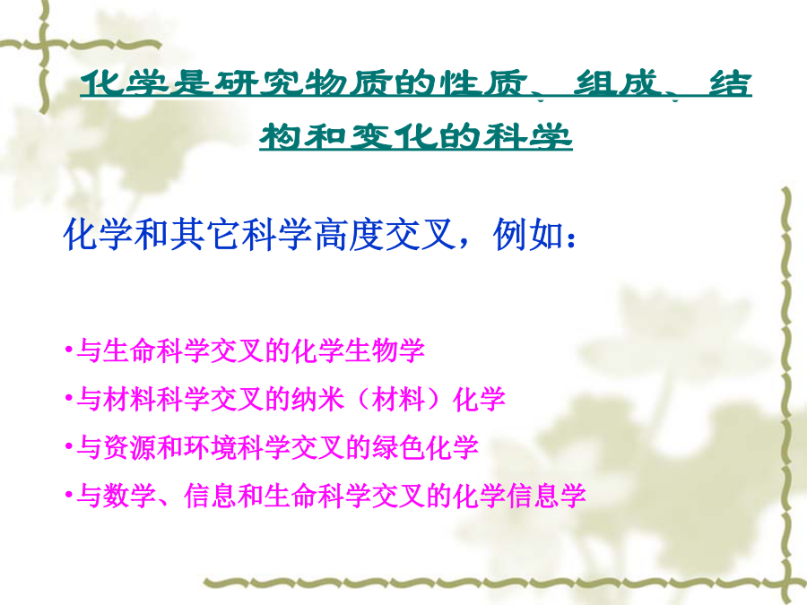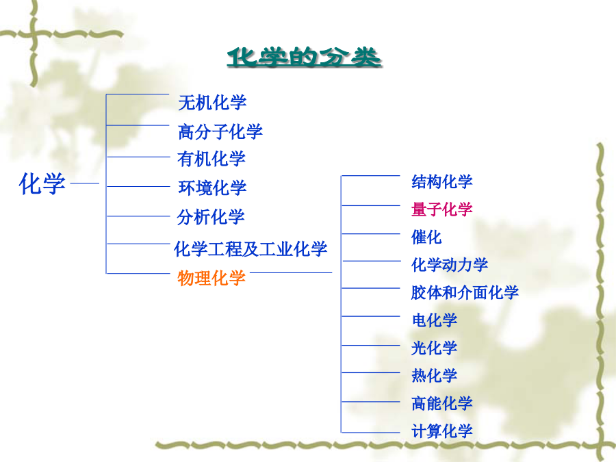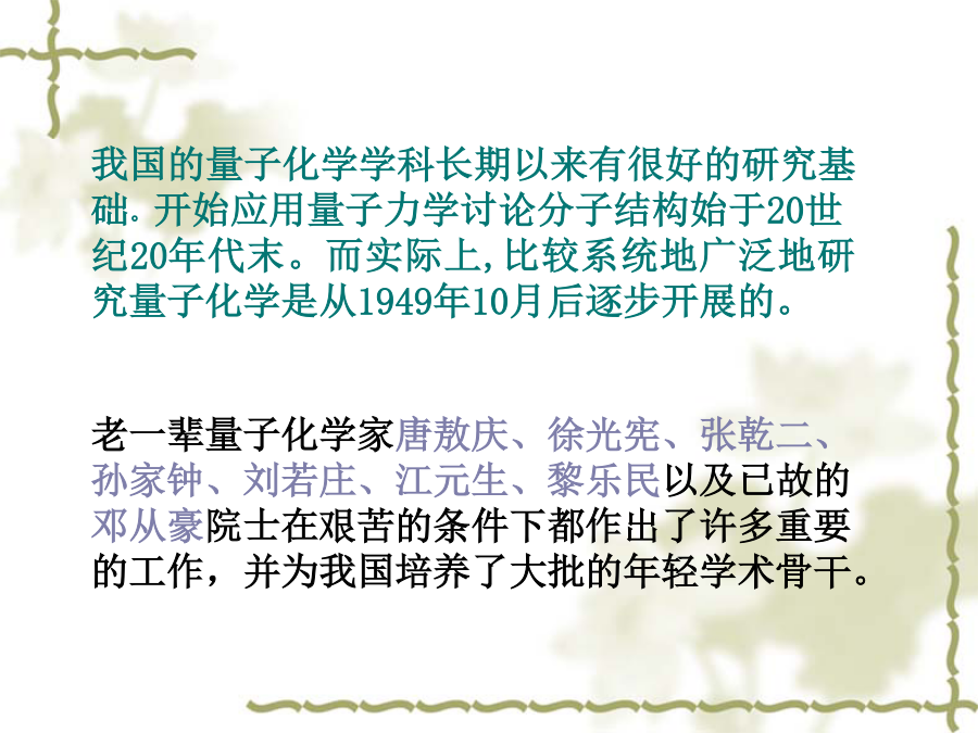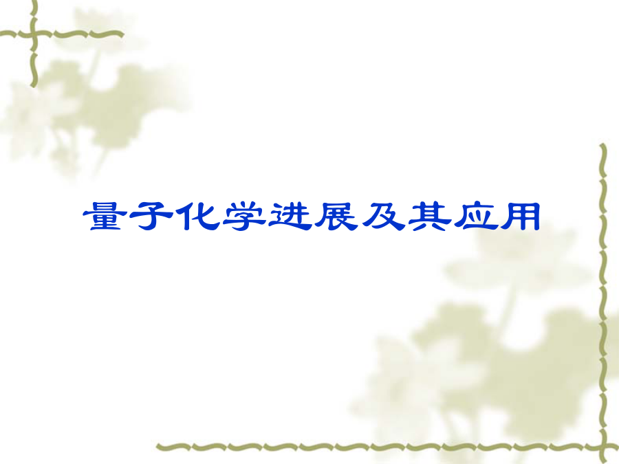 量子化学进展及其应用 化学是研究物质的性质、组成、结构和变化的科学化学化学我国的量子化学学科长期以来有很好的研究基础。开始应用量子力学讨论分子结构始于20世纪20年代末。而实际上,比较系统地广泛地研究量子化学是从1949年10月后逐步开展的。 老一辈量子化学家唐敖庆、徐光宪、张乾二、 孙家钟、刘若庄、江元生、黎乐民以及已故的 邓从豪院士在艰苦的条件下都作出了许多重要 的工作,并为我国培养了大批的年轻学术骨干。近年来,在国家自然科学基金委员会的大力支持下,我国的量子化学研究在将量子化学计算应用于解决实际的化学问题上应该说在许多方面取得了国际先进水平的成果。量子化学为大部分物理学和整个化学的数学理论奠定了基础近五年来,国际上所发表的有关2005年JACS上发表的相关文章近五年来,中国所发表的有 关理论研究的SCI文章统计中国量子化学研究领域及队伍北京理工大学(李前树组) 研究方向:非线性化学的计算机模拟,量子化学计算,纳米微粒的 制备、表征和性能中国量子化学研究领域及队伍山西师范大学(武海顺组)南京大学(黎书华组)山东大学(丁世良组)厦门大学(张乾二组)厦门大学(曹泽星组)中国科技大学(杨金龙组)中科院化学所(帅志刚组)北京师范大学(方维海组)清华大学(廖沐真组)大连化物所(韩克利组)辽宁师范大学(杨忠志组)复旦大学(范康年组)复旦大学(范康年组)北京大学(黎乐民组)北京大学(刘文建组)北京大学(吴云东组)福建物构所(吴克琛组)福建物构所(程文旦组)上海交通大学(王曙光组)上海药物所(蒋华良组)东北师范大学(苏忠民组)第九届量化会议谢谢!