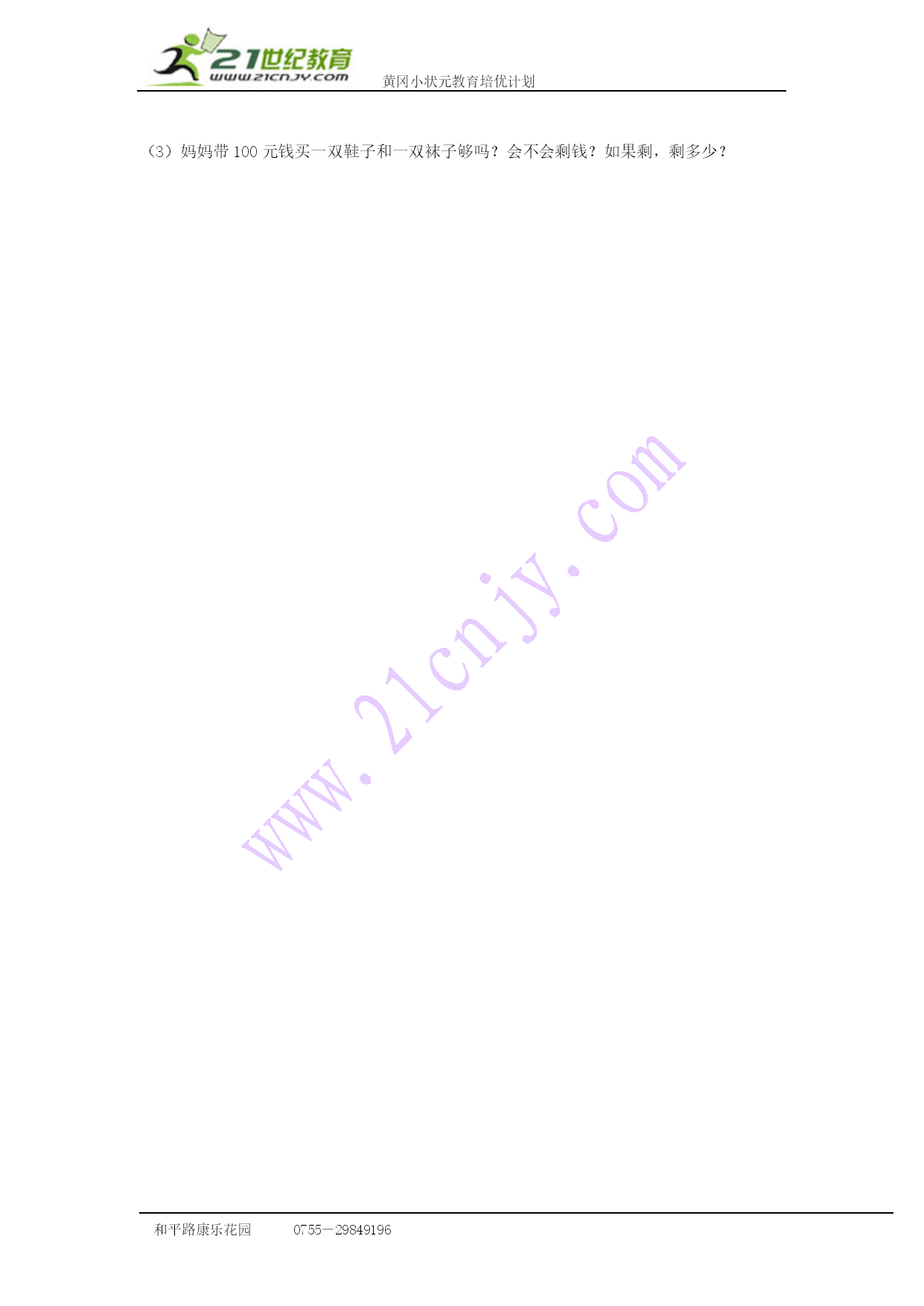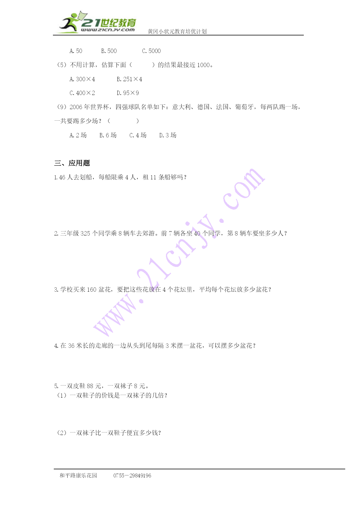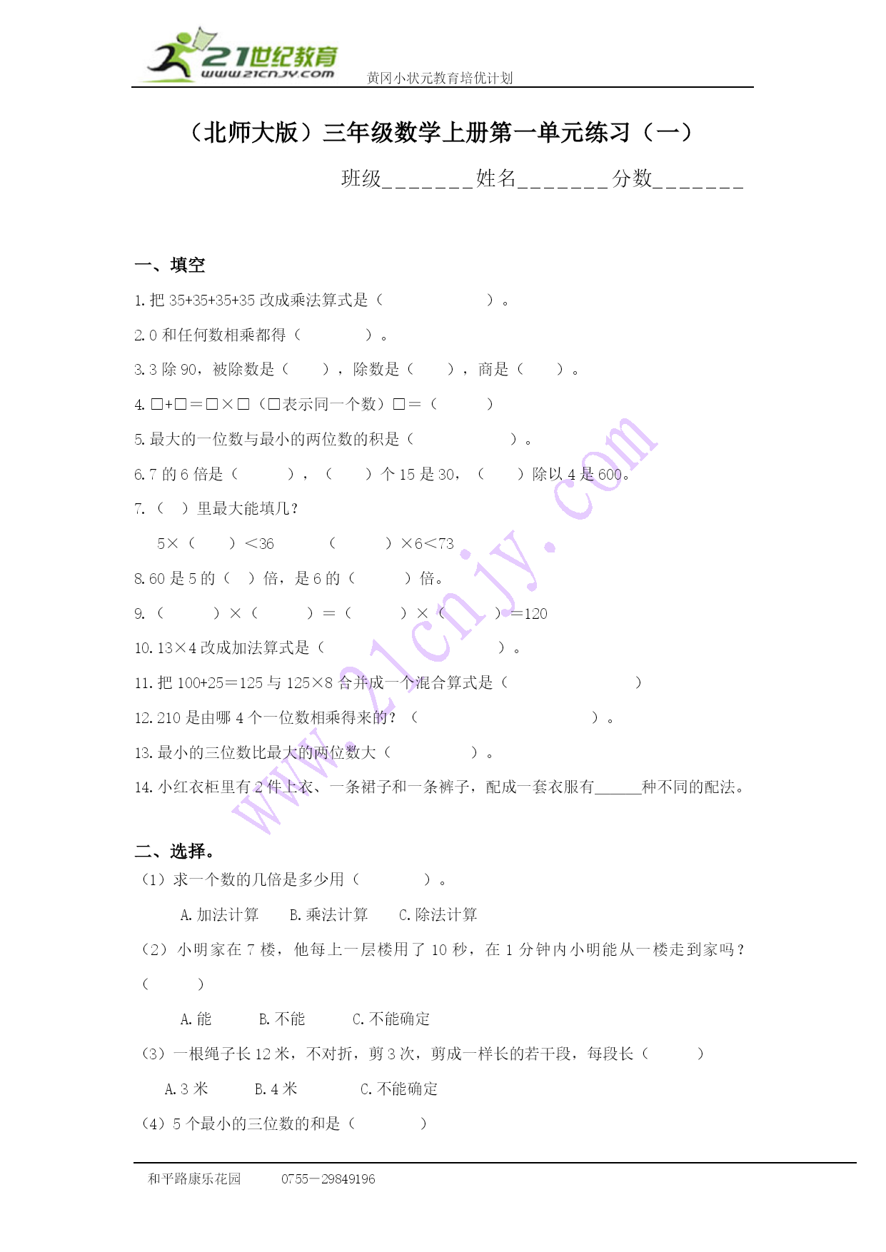 黄冈小状元教育培优计划和平路康乐花园0755-29849196(北师大版)三年级数学上册第一单元练习(一)班级_______姓名_______分数_______一、填空1.把35+35+35+35改成乘法算式是()。2.0和任何数相乘都得()。3.3除90,被除数是(),除数是(),商是()。4.□+□=□×□(□表示同一个数)□=()5.最大的一位数与最小的两位数的积是()。6.7的6倍是(),()个15是30,()除以4是600。7.()里最大能填几?5×()<36()×6<738.60是5的()倍,是6的()倍。9.()×()=()×()=12010.13×4改成加法算式是()。11.把100+25=125与125×8合并成一个混合算式是()12.210是由哪4个一位数相乘得来的?()。13.最小的三位数比最大的两位数大()。14.小红衣柜里有2件上衣、一条裙子和一条裤子,配成一套衣服有___种不同的配法。二、选择。(1)求一个数的几倍是多少用()。A.加法计算B.乘法计算C.除法计算(2)小明家在7楼,他每上一层楼用了10秒,在1分钟内小明能从一楼走到家吗?()A.能B.不能C.不能确定(3)一根绳子长12米,不对折,剪3次,剪成一样长的若干段,每段长()A.3米B.4米C.不能确定(4)5个最小的三位数的和是()A.50B.500C.5000(5)不用计算,估算下面()的结果最接近1000。A.300×4B.251×4C.400×2D.95×9(9)2006年世界杯,四强球队名单如下:意大利、德国、法国、葡萄牙,每两队踢一场,一共要踢多少场?()A.2场B.6场C.4场D.3场三、应用题1.46人去划船,每船限乘4人,租11条船够吗?2.三年级325个同学乘8辆车去郊游。前7辆各坐40个同学,第8辆车要坐多少人?3.学校买来160盆花,要把这些花放在4个花坛里,平均每个花坛放多少盆花?4.在36米长的走廊的一边从头到尾每隔3米摆一盆花,可以摆多少盆花?5.一双皮鞋88元,一双袜子8元。(1)一双鞋子的价钱是一双袜子的几倍?(2)一双袜子比一双鞋子便宜多少钱?(3)妈妈带100元钱买一双鞋子和一双袜子够吗?会不会剩钱?如果剩,剩多少?