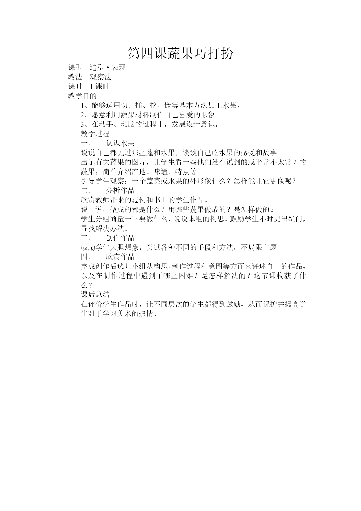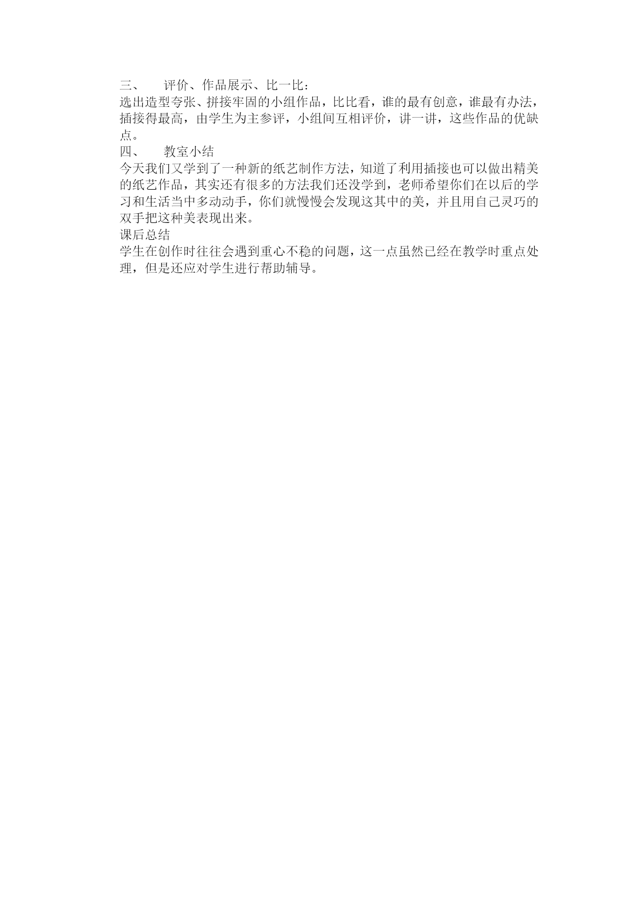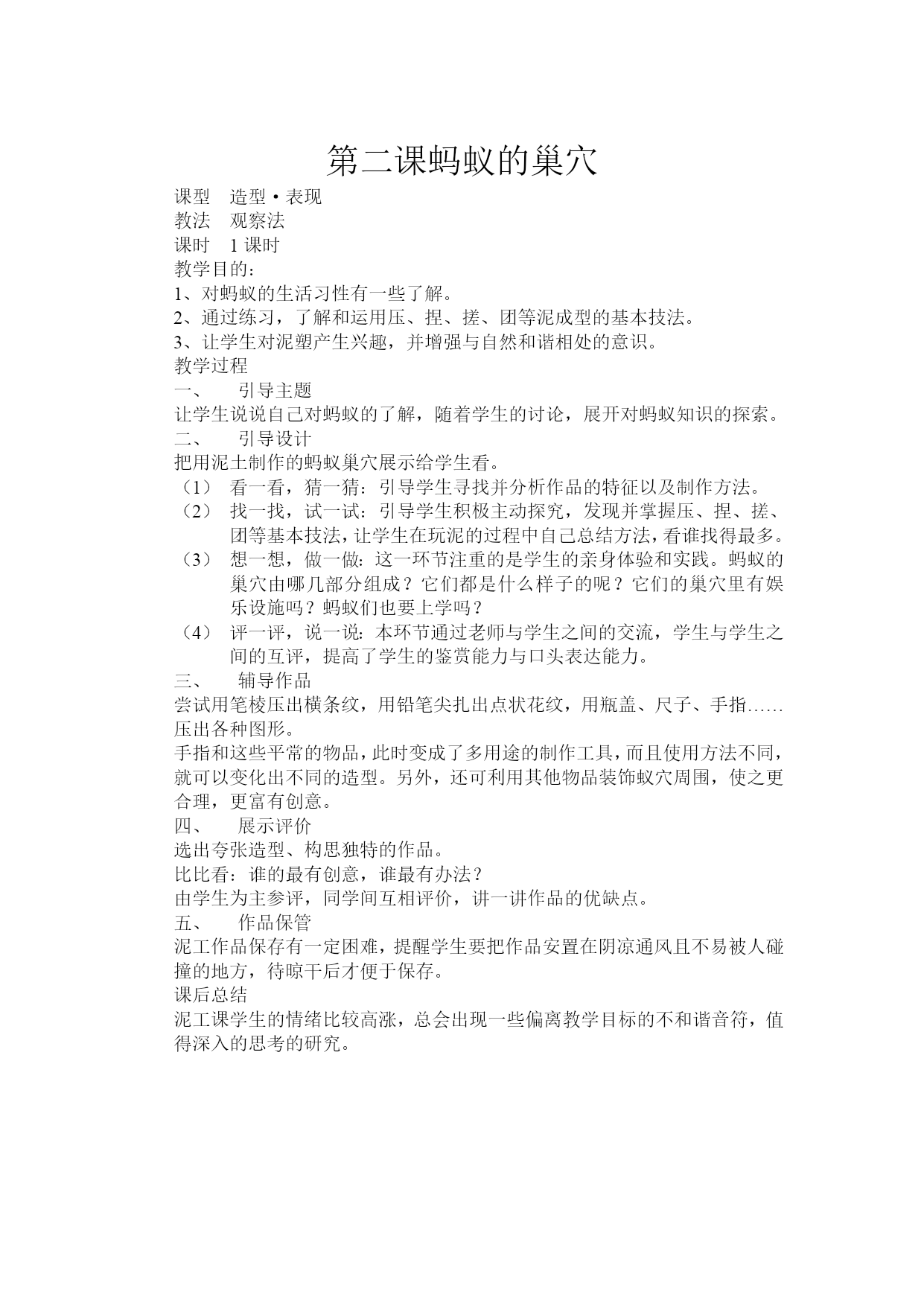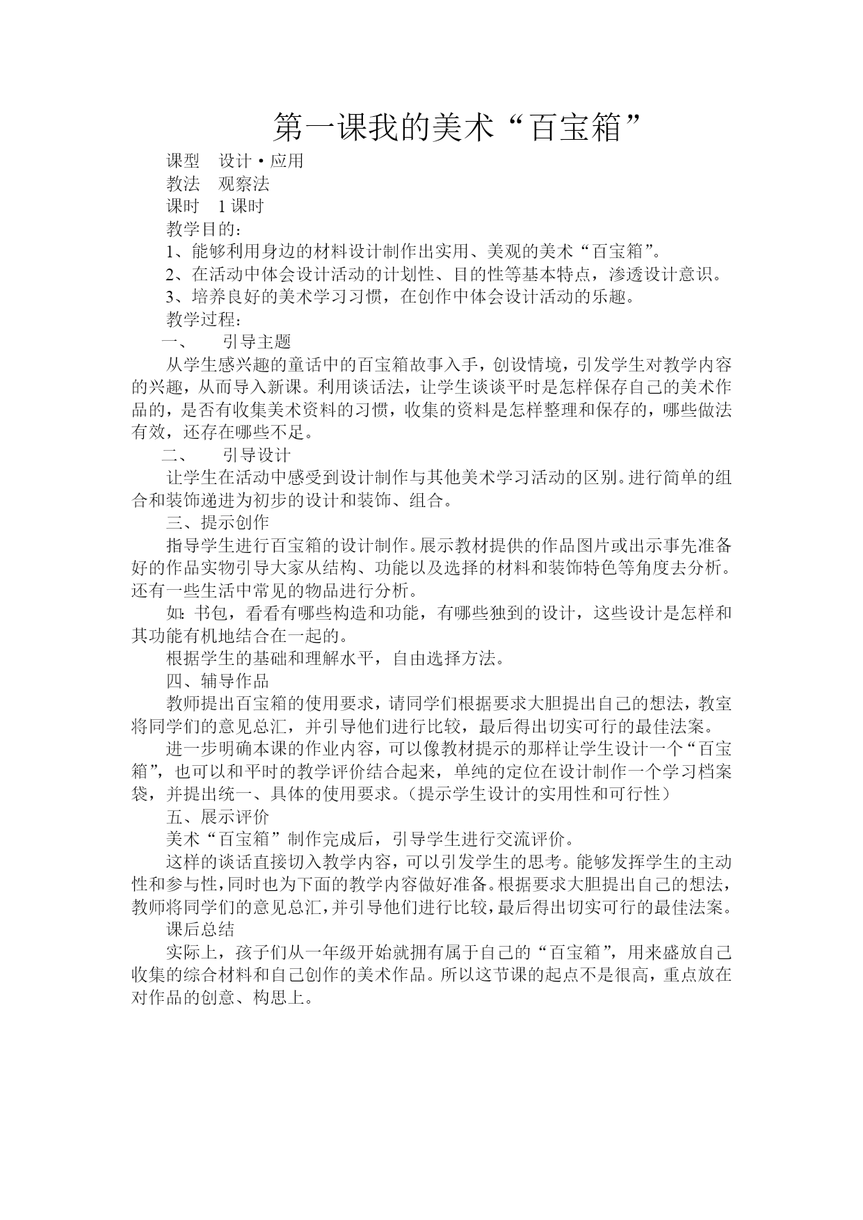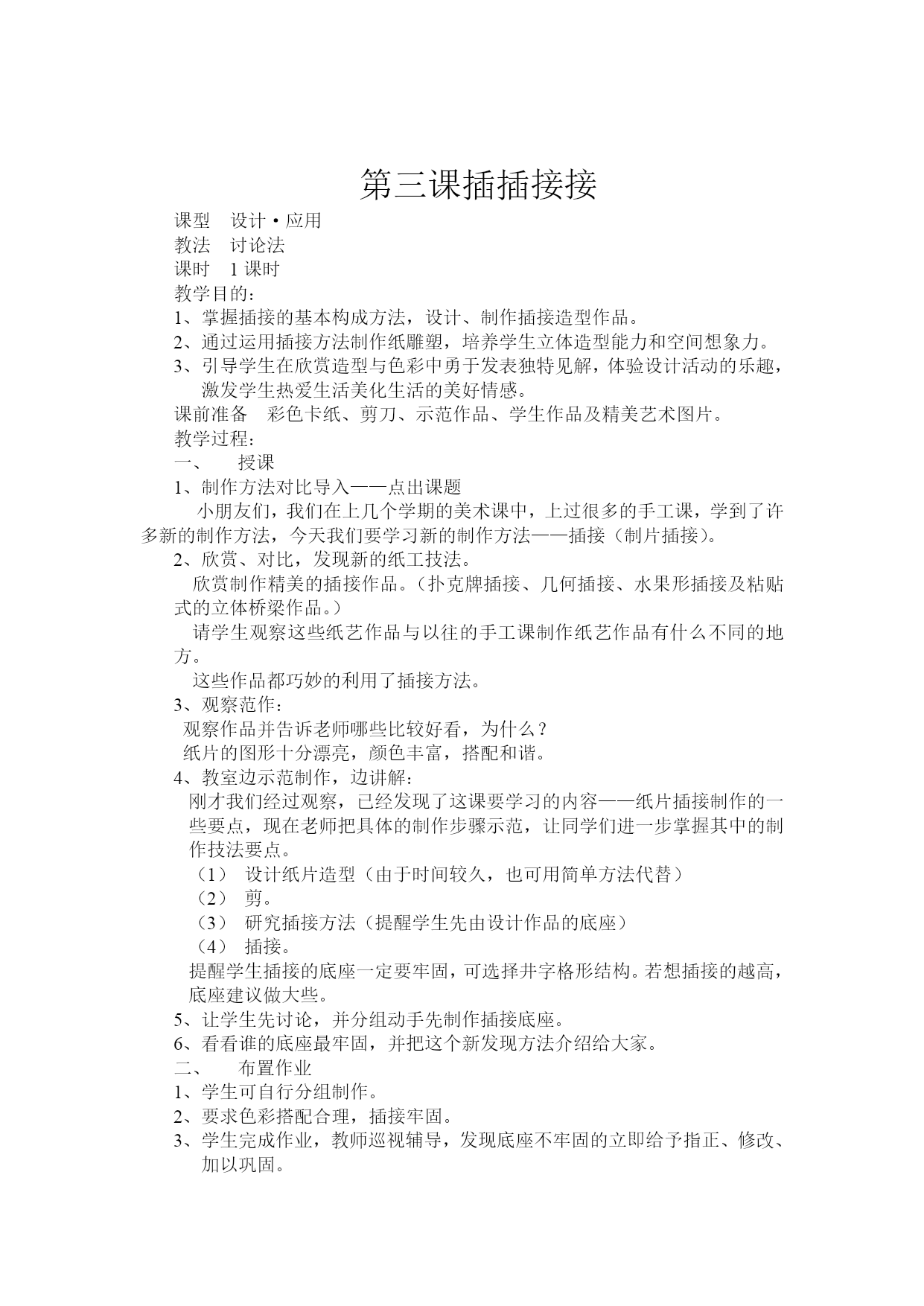 第一课我的美术“百宝箱”课型设计·应用教法观察法课时1课时教学目的:1、能够利用身边的材料设计制作出实用、美观的美术“百宝箱”。2、在活动中体会设计活动的计划性、目的性等基本特点,渗透设计意识。3、培养良好的美术学习习惯,在创作中体会设计活动的乐趣。教学过程:引导主题从学生感兴趣的童话中的百宝箱故事入手,创设情境,引发学生对教学内容的兴趣,从而导入新课。利用谈话法,让学生谈谈平时是怎样保存自己的美术作品的,是否有收集美术资料的习惯,收集的资料是怎样整理和保存的,哪些做法有效,还存在哪些不足。引导设计让学生在活动中感受到设计制作与其他美术学习活动的区别。进行简单的组合和装饰递进为初步的设计和装饰、组合。三、提示创作指导学生进行百宝箱的设计制作。展示教材提供的作品图片或出示事先准备好的作品实物引导大家从结构、功能以及选择的材料和装饰特色等角度去分析。还有一些生活中常见的物品进行分析。如:书包,看看有哪些构造和功能,有哪些独到的设计,这些设计是怎样和其功能有机地结合在一起的。根据学生的基础和理解水平,自由选择方法。四、辅导作品教师提出百宝箱的使用要求,请同学们根据要求大胆提出自己的想法,教室将同学们的意见总汇,并引导他们进行比较,最后得出切实可行的最佳法案。进一步明确本课的作业内容,可以像教材提示的那样让学生设计一个“百宝箱”,也可以和平时的教学评价结合起来,单纯的定位在设计制作一个学习档案袋,并提出统一、具体的使用要求。(提示学生设计的实用性和可行性)五、展示评价美术“百宝箱”制作完成后,引导学生进行交流评价。这样的谈话直接切入教学内容,可以引发学生的思考。能够发挥学生的主动性和参与性,同时也为下面的教学内容做好准备。根据要求大胆提出自己的想法,教师将同学们的意见总汇,并引导他们进行比较,最后得出切实可行的最佳法案。课后总结实际上,孩子们从一年级开始就拥有属于自己的“百宝箱”,用来盛放自己收集的综合材料和自己创作的美术作品。所以这节课的起点不是很高,重点放在对作品的创意、构思上。第二课蚂蚁的巢穴课型造型·表现教法观察法课时1课时教学目的:对蚂蚁的生活习性有一些了解。通过练习,了解和运用压、捏、搓、团等泥成型的基本技法。让学生对泥塑产生兴趣,并增强与自然和谐相处的意识。教学过程引导主题让学生说说自己对蚂蚁的了解,随着学生的讨论,展开对蚂蚁知识的探索。引导设计把用泥土制作的蚂蚁巢穴展示给学生看。看一看,猜一猜:引导学生寻找并分析作品的特征以及制作方法。找一找,试一试:引导学生积极主动探究,发现并掌握压、捏、搓、团等基本技法,让学生在玩泥的过程中自己总结方法,看谁找得最多。想一想,做一做:这一环节注重的是学生的亲身体验和实践。蚂蚁的巢穴由哪几部分组成?它们都是什么样子的呢?它们的巢穴里有娱乐设施吗?蚂蚁们也要上学吗?评一评,说一说:本环节通过老师与学生之间的交流,学生与学生之间的互评,提高了学生的鉴赏能力与口头表达能力。辅导作品尝试用笔棱压出横条纹,用铅笔尖扎出点状花纹,用瓶盖、尺子、手指……压出各种图形。手指和这些平常的物品,此时变成了多用途的制作工具,而且使用方法不同,就可以变化出不同的造型。另外,还可利用其他物品装饰蚁穴周围,使之更合理,更富有创意。展示评价选出夸张造型、构思独特的作品。比比看:谁的最有创意,谁最有办法?由学生为主参评,同学间互相评价,讲一讲作品的优缺点。作品保管泥工作品保存有一定困难,提醒学生要把作品安置在阴凉通风且不易被人碰撞的地方,待晾干后才便于保存。课后总结泥工课学生的情绪比较高涨,总会出现一些偏离教学目标的不和谐音符,值得深入的思考的研究。第三课插插接接课型设计·应用教法讨论法课时1课时教学目的:掌握插接的基本构成方法,设计、制作插接造型作品。通过运用插接方法制作纸雕塑,培养学生立体造型能力和空间想象力。引导学生在欣赏造型与色彩中勇于发表独特见解,体验设计活动的乐趣,激发学生热爱生活美化生活的美好情感。课前准备彩色卡纸、剪刀、示范作品、学生作品及精美艺术图片。教学过程:授课制作方法对比导入——点出课题小朋友们,我们在上几个学期的美术课中,上过很多的手工课,学到了许多新的制作方法,今天我们要学习新的制作方法——插接(制片插接)。欣赏、对比,发现新的纸工技法。欣赏制作精美的插接作品。(扑克牌插接、几何插接、水果形插接及粘贴式的立体桥梁作品。)请学生观察这些纸艺作品与以往的手工课制作纸艺作品有什么不同的地方。这些作品都巧妙的利用了插接方法。观察范作:观察作品并告诉老师哪些比较好看,为什么?纸片的图形十分漂亮,颜色丰富,搭配和谐。教室边示范制作,边讲解:刚才我们经过观察,已经发现了这课要学习的内容——纸片插接制作的一些要点,现在老师把具体的制作步骤示范,让同学们进一步掌握其中的制作技法要点。设计纸片造型(由于时间