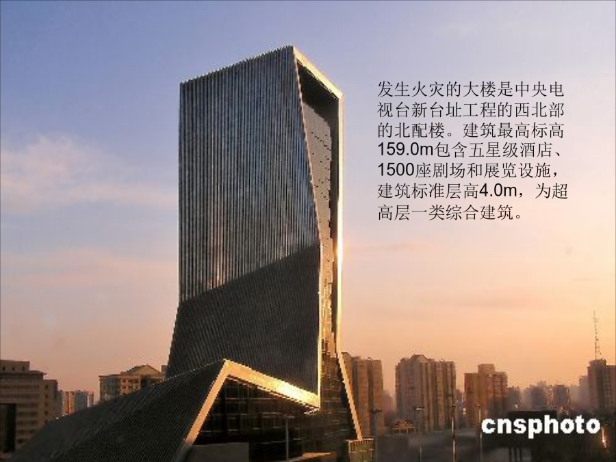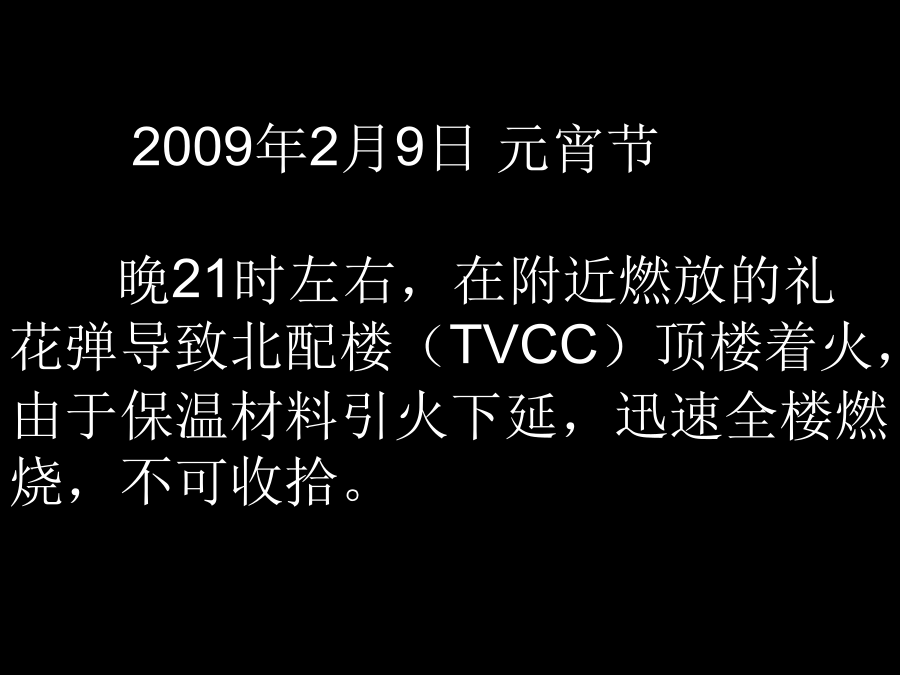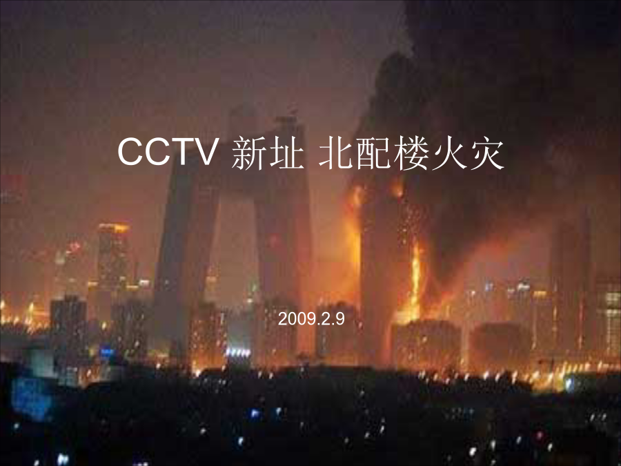 CCTV新址北配楼火灾2009.2.9CCTV新总部大楼占地面积:18.7万平方米建筑面积:55万平方米,建筑高度:230米,工程总投资:50亿人民币设计师:库哈斯(荷兰)发生火灾的大楼是中央电视台新台址工程的西北部的北配楼。建筑最高标高159.0m包含五星级酒店、1500座剧场和展览设施,建筑标准层高4.0m,为超高层一类综合建筑。2009年2月9日元宵节晚21时左右,在附近燃放的礼花弹导致北配楼(TVCC)顶楼着火,由于保温材料引火下延,迅速全楼燃烧,不可收拾。中央电视台新址北配楼,TVCC,钢筋混凝土结构。南北两面为玻璃幕墙,带铝装饰条。东西两侧连同屋顶由门形球节点钢网架做金属幕墙的支承结构,外包鈦锌板,中间为保温层,内为薄钢板包封。礼花弹燃烧的温度达1700度钛锌板的熔点仅为418度,礼花弹1700度的火焰迅速点燃、熔化钛锌面板,而且引燃了挤塑保温板,不断熔化消失的金属板暴露了保温板,使它继续引燃能获得足够的空气,因而火焰急速向下蔓延,一烧到底。南北侧的玻璃幕墙的钢化玻璃有较强的耐火能力,又没有保温材料引火烧身,因此受害程度较轻,绝大部分被保留了下来。东西两面为钛锌板金属幕墙,金属面板烧化,保温材料烧尽,骨架受高温扭曲变形,背部薄钢板尚在,但已变形。幕墙的支承钢网架在高温下性能已严重受损邻近屋面的金属封檐板,靠近主楼一侧被烧毁,明显看出保温材料已烧空,金属面板被烧化。石材面板完好。保温材料引火可能是主要原因TVCC南北采用玻璃幕,东西采用钛锌合金屋面幕墙。金属幕墙材料是由德国莱茵辛克公司(RHEINZINK)生产的钛锌金属–即原锌.该钛锌金属是一种纯天然的环保材料,它是由高纯度的锌与少量的铜和钛作为添加剂熔炼而成的合金.由于材料的主要成分是锌,该材料能表现出优秀的稳定性和防腐性能,同时因其能与空气中的水和空气反应而在表面逐渐形成一层保护膜,使该材料的寿命达至很长.该材料在氧化过程中会表现出朦胧的渐变过程,给人以奇特的感觉。火灾原因分析——建筑部幕墙门窗标准化技术专家组组长龙文志教授(1)火灾的内因是采用了防火性能差的XPS(聚苯乙烯挤塑板)复合板:该复合板材采用由德国进口的2毫米厚钛锌板作屋架幕墙。采用直立锁边结构的铝镁锰合金板(板厚小于1毫米)作层面防水层。钛锌板熔点418°C左右,燃放烟火的礼炮及礼花弹其燃烧温度高达1700°C。燃烧的礼花一旦落在钛锌合金板上面,熔融的钛合金向下流淌,引燃下层XPS保温材料,从而形成XPS大面积闷烧,使连结一起的钛锌板产生“烟囱”效应,进而火焰迅速蔓延和积累,最终引发TVCC整体轰燃而产生轰爆效应。(2)龙教授认为此次火灾燃放烟火只是外因,该建筑幕墙及屋面的XPS保温材料造就了火灾隐患存在必然性。龙文志教授特别指出:“这次不出现火灾可能在今后别的大楼使用过程中也要出现火灾,而那时的危害性要比现在严重上百倍”。TVCC火灾案例要从中深刻吸取其教训,XPS材料由于温度超过800C产生熔滴,引发燃烧后极易诱发二次燃烧,且具有极快的火焰传插速度。由此,公共建筑和超高层建筑采用此类保温材料必须慎之又慎。在美国有20多个州禁止使用聚苯乙烯泡沫用于建筑保温;在英国,18米以上建筑不允许使用EPS板薄抹灰外墙保温系统;在德国,22米以上建筑不允许使用EPS板薄材灰外墙保温体系。在欧洲许多夹心板材厂不再生产防火性能差的EPS板,许多保险公司已禁止给EPS板作保温建筑保险。同样在韩国和澳洲等地的建筑保温市场EPS和XPS泡沫也被禁止使用。(3)建立符合中国国情的建筑外墙屋面保温防火节能体系:近年来重大恶性建筑火灾和外墙屋面火灾事故频频发生,不能机械地套用国外一些方法。龙教授认为建筑火灾和外墙防火要结合我国的实际情况出发,做到安全与节能,防火与保温并重。建立符合中国国情的建筑幕墙屋面保温防火节能体系。针对中国新时期防火、消防工作规律,突破制约外墙层面防火的关键技术,形成具有强制力的、科学性的技术标准和工程规范。2009.2.9TVCC中央电视台北配楼大火燃烧持续6小时,1名消防员牺牲,6名消防员受伤。直接和间接经济损失达50亿人民币。