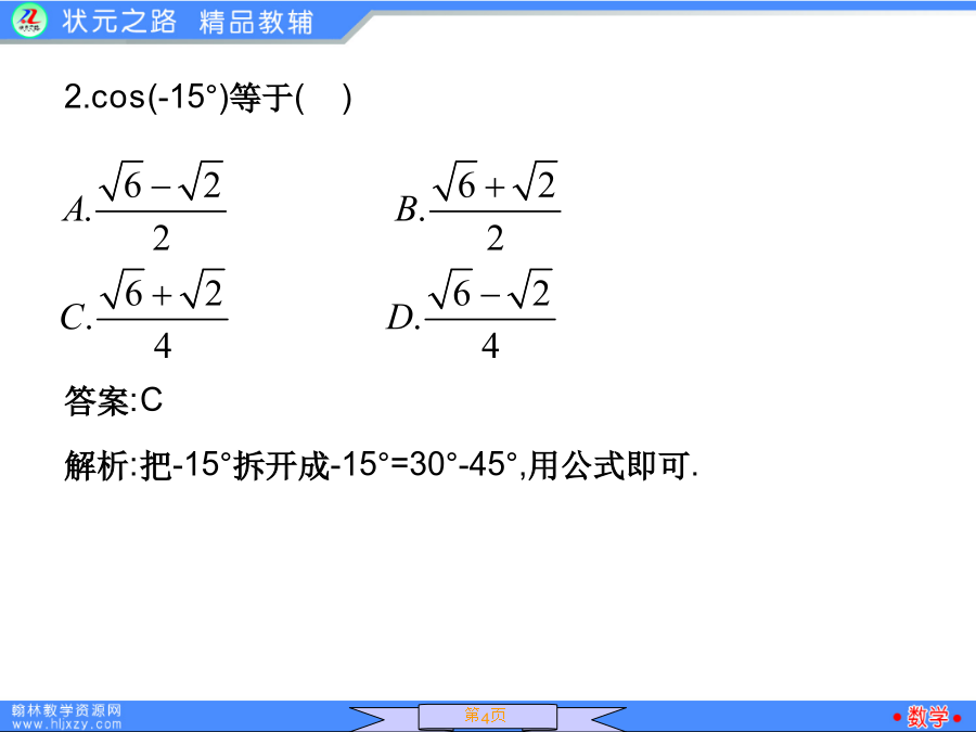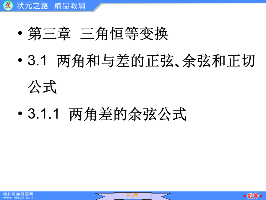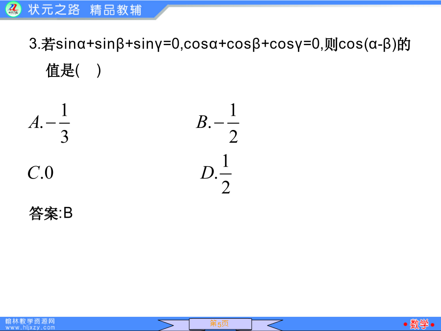 第三章三角恒等变换3.1两角和与差的正弦、余弦和正切公式3.1.1两角差的余弦公式15分钟随堂验收答案:A2.cos(-15°)等于()3.若sinα+sinβ+sinγ=0,cosα+cosβ+cosγ=0,则cos(α-β)的值是()4.cos39°cos9°+sin39°sin9°等于()5.cos(α+β)cosα+sin(α+β)sinα等于()A.sinαB.sinβC.cosαD.cosβ6.在下列给出的四个选项中能满足等式cos2xcos3x=sin2xsin3x的一个角是()7.cos105°=__________.8.cos43°cos77°+sin43°cos167°的值为__________.