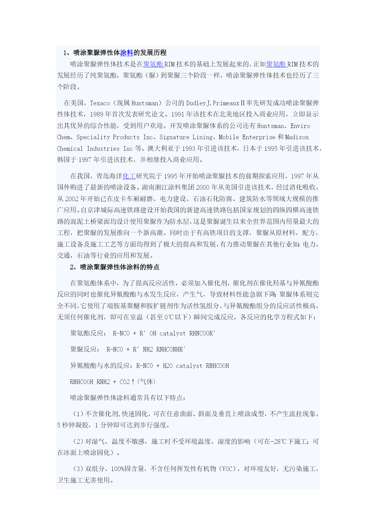 1、喷涂聚脲弹性体HYPERLINK"http://www.coatings.hc360.com/"\t"_blank"涂料的发展历程喷涂聚脲弹性体技术是在HYPERLINK"http://info.coatings.hc360.com/zt/ztjaz/index.shtml"\t"_blank"聚氨酯RIM技术的基础上发展起来的,正如HYPERLINK"http://www.search.hc360.com/cgi-bin/seinterface.cgi?word=%BE%DB%B0%B1%F5%A5"\t"_blank"聚氨酯RIM技术的发展经历了纯聚氨酯、聚氨酯(脲)到聚脲三个阶段一样,喷涂聚脲弹性体技术也经历了三个阶段。在美国,Texaco(现属Huntsman)公司的DudleyJ.PrimeauxⅡ率先研发成功喷涂聚脲弹性体技术,1989年首次发表研究论文。1991年该技术在北美地区投入商业应用,立即显示出其优异的综合性能,受到用户欢迎。开发喷涂聚脲体系的公司还有Huntsman、EnviroChem、SpecialityProductsInc、SignatureLining、MobileEnterprise和MadisonChemicalIndustriesInc等。澳大利亚于1993年引进该技术,日本于1995年引进该技术,韩国于1997年引进该技术,并相继投入商业应用。在我国,青岛海洋HYPERLINK"http://www.chem.hc360.com/"\t"_blank"化工研究院于1995年开始喷涂聚脲技术的前期探索应用,1997年从国外购进了最新的喷涂设备。湖南湘江涂料集团2000年从美国引进该技术,经过消化吸收,从2002年开始已在皮卡车厢耐磨、电力建设、石油石化防腐、建筑防水等领域大规模的推广应用。自京津城际高速铁路建设开始我国的新建高速铁路包括国家规划的四纵四横高速铁路的混泥土桥梁面均设计使用聚脲作为防水层,这是聚脲诞生以来全世界范围内用量最大的工程,把聚脲的发展推向一个新高潮。同时由于有高铁项目的支撑,聚脲从原材料,配方,施工设备及施工工艺等方面均得到了极大的提高和发展,有力推动聚脲在其他行业如:电力,交通,石油等行业的应用和发展。2、喷涂聚脲弹性体涂料的特点在聚氨酯体系中,为了提高反应活性,必须加入催化剂,催化剂在催化羟基与异氰酸酯反应的同时也催化异氰酸酯与水发生反应,产生气,导致材料性能急剧下降;聚脲体系则完全不同,它使用了端胺基聚醚和胺扩链剂作为活性氢组分,与异氰酸酯组分的反应活性极高,无须任何催化剂,即可在室温(甚至0℃以下)瞬间完成反应。各反应的化学方程式如下:聚氨酯反应:R-NCO+R′OHcatalystRHNCOOR′聚脲反应:R-NCO+R′NH2RNHCONHR′异氰酸酯与水的反应:R-NCO+H2OcatalystRNHCOOHRNHCOOHRNH2+CO2↑(气体)喷涂聚脲弹性体涂料通常具有以下特点:(1)不含催化剂,快速固化,可在任意曲面、斜面及垂直上喷涂成型,不产生流挂现象,5秒钟凝胶,1分钟即可达到步行强度。(2)对湿气、温度不敏感,施工时不受环境温度、湿度的影响(可在-28℃下施工;可在冰面上喷涂固化)。(3)双组分,100%固含量,不含任何挥发性有机物(VOC),对环境友好,无污染施工,卫生施工无害使用。(4)热喷涂,一次施工厚度范围可从数百微米到数厘米,克服了以往多次施工的弊病。(5)优异的理化性能,极高的抗张抗冲击强度、HYPERLINK"http://info.coatings.hc360.com/zt/web/index.shtml"\t"_blank"防腐蚀、耐磨性、防湿滑、耐老化等。(6)具有良好的热稳定性,可在120℃下长期使用,可承受350℃的短时热冲击。(7)原形再现性好,涂层连续、致密,无接缝,无针孔,美观实用耐久。(8)使用成套设备施工,效率极高;一次施工即可达到设计厚度要求,设备配有多种切换模式,既可喷涂,也可浇佳。并可通过施工工艺控制接达到防滑效果。(9)具有良好的粘结力,可在钢材、木材、混凝土等底材上喷涂成型。