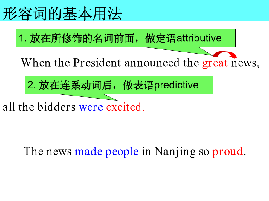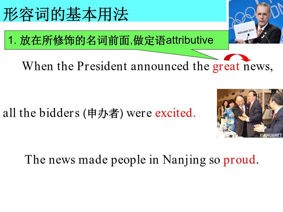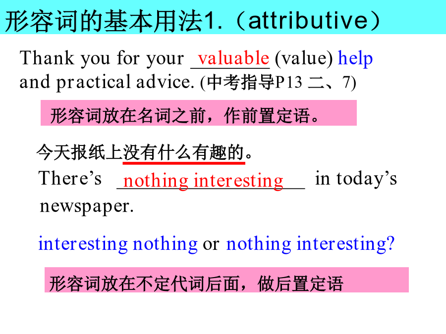 WhenthePresidentannouncedthegreatnews, allthebidders(申办者)wereexcited. ThenewsmadepeopleinNanjingsoproud.Thankyouforyour________(value)helpandpracticaladvice.(中考指导P13二、7) 1.---Isthereanything_______Icandoforyou? ---No,thankyou! 2.Doyouhaveany_______questionstoask? 3.Youhadbettertellmewho_______willgotothemeeting.WhenthePresidentannouncedthegreatnews, allthebidderswereexcited. ThenewsmadepeopleinNanjingsoproud.Themusicsounds__________(beauty).1.Theoldmanoftenfalls_______whilewatchingTV. 2.Icouldn’thelptowakingthe________boyupbecauseitwastoolate. WhenthePresidentannouncedthegreatnews, allthebidderswereexcited. ThenewsmadepeopleinNanjingsoproud.Mr.Brownalwaysmakeshisclass_______(live) andkeepshisstudents_________(interest)inhis class.(中考指导P13二、15)find(发现) think consider(认为)1.Idon’thaveanyclosefriendshere.Ifeel_________fromtimetotime.(2011宿迁市) A.aloneB.happyC.lonelyD.proud 2.Thefishtastes___.CouldIhavesomemore?(2010南通) AterribleBwonderfulC.terriblyD.wonderfully 3.–Mum,I’mreally___abouttheresultoftheexam. --Cheerup.Ibelieveyoucanbesuccessful.(2010连云港市) A.patientB.satisfiedC.unhappyD.pleased. Wecanaddsomesuffixestosomenounstoformadjectives.Wecanaddsomesuffixestosomenounstoformadjectives.Wecanaddsomesuffixestosomenounstoformadjectives.Nouns 1.Helooked________becausehedidn’tpasstheexam.(happy) 2.Itis________toshoutattheoldpeople.(polite*)Acomputerwas________tousemanyyearsago,butnowitisveryeasy. Wearenotinthesameclass.Wearein________classes. Theboxistooheavyformetocarry.CanIcarrythat______one? Thiscameraistoo________.Doyouhaveacheaperone?Wecanchangeverbsintoadjective中考链接9.---Mr.Smith,Idon’tthinkwecangetthere ontimebybike. ---Youmeanit’s___forustotakeataxi?(2011南京) A.necessaryB.important C.possibleD.different 10.AftertheearthquakeinJapan,wearetryingto helpthe___________peopletorebuildtheir homes.(2011连云港) A.harmlessB.endless C.uselessD.homelessTheywereverynervousbuttheywerewaitingpatientlybecausetheybelievedthattheypreparedquitewell.Luckily,Nanjingwontherighttohos