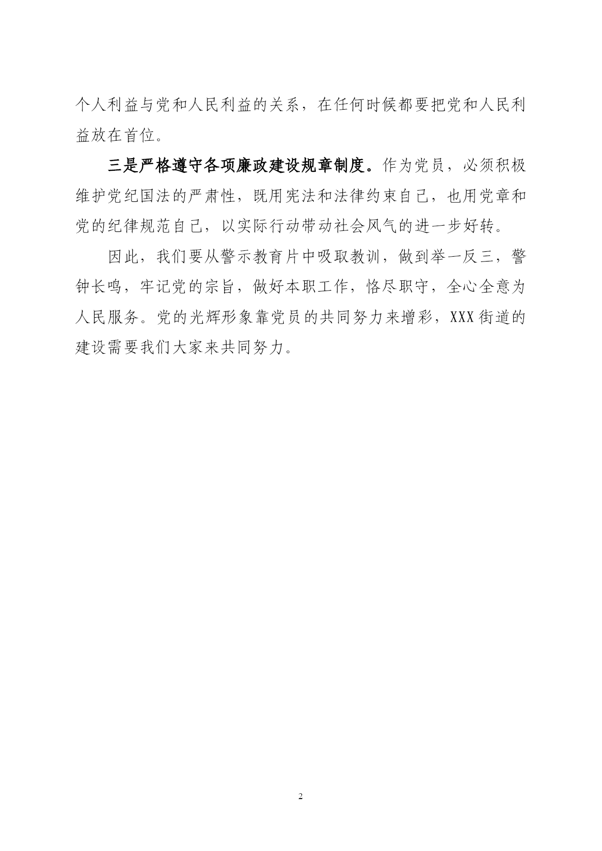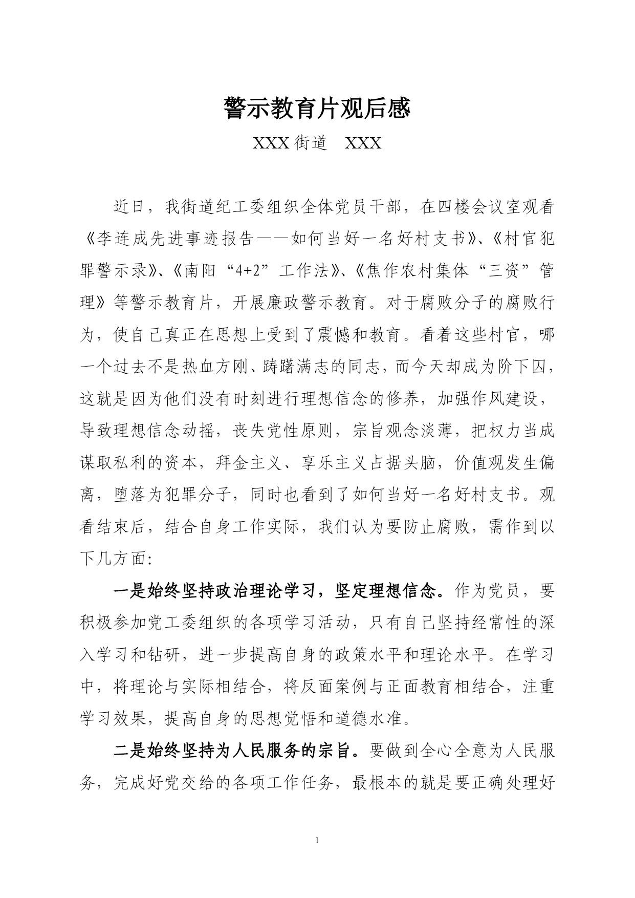 警示教育片观后感XXX街道XXX近日,我街道纪工委组织全体党员干部,在四楼会议室观看《李连成先进事迹报告——如何当好一名好村支书》、《村官犯罪警示录》、《南阳“4+2”工作法》、《焦作农村集体“三资”管理》等警示教育片,开展廉政警示教育。对于腐败分子的腐败行为,使自己真正在思想上受到了震憾和教育。看着这些村官,哪一个过去不是热血方刚、踌躇满志的同志,而今天却成为阶下囚,这就是因为他们没有时刻进行理想信念的修养,加强作风建设,导致理想信念动摇,丧失党性原则,宗旨观念淡薄,把权力当成谋取私利的资本,拜金主义、享乐主义占据头脑,价值观发生偏离,堕落为犯罪分子,同时也看到了如何当好一名好村支书。观看结束后,结合自身工作实际,我们认为要防止腐败,需作到以下几方面:一是始终坚持政治理论学习,坚定理想信念。作为党员,要积极参加党工委组织的各项学习活动,只有自己坚持经常性的深入学习和钻研,进一步提高自身的政策水平和理论水平。在学习中,将理论与实际相结合,将反面案例与正面教育相结合,注重学习效果,提高自身的思想觉悟和道德水准。二是始终坚持为人民服务的宗旨。要做到全心全意为人民服务,完成好党交给的各项工作任务,最根本的就是要正确处理好个人利益与党和人民利益的关系,在任何时候都要把党和人民利益放在首位。三是严格遵守各项廉政建设规章制度。作为党员,必须积极维护党纪国法的严肃性,既用宪法和法律约束自己,也用党章和党的纪律规范自己,以实际行动带动社会风气的进一步好转。因此,我们要从警示教育片中吸取教训,做到举一反三,警钟长鸣,牢记党的宗旨,做好本职工作,恪尽职守,全心全意为人民服务。党的光辉形象靠党员的共同努力来增彩,XXX街道的建设需要我们大家来共同努力。
