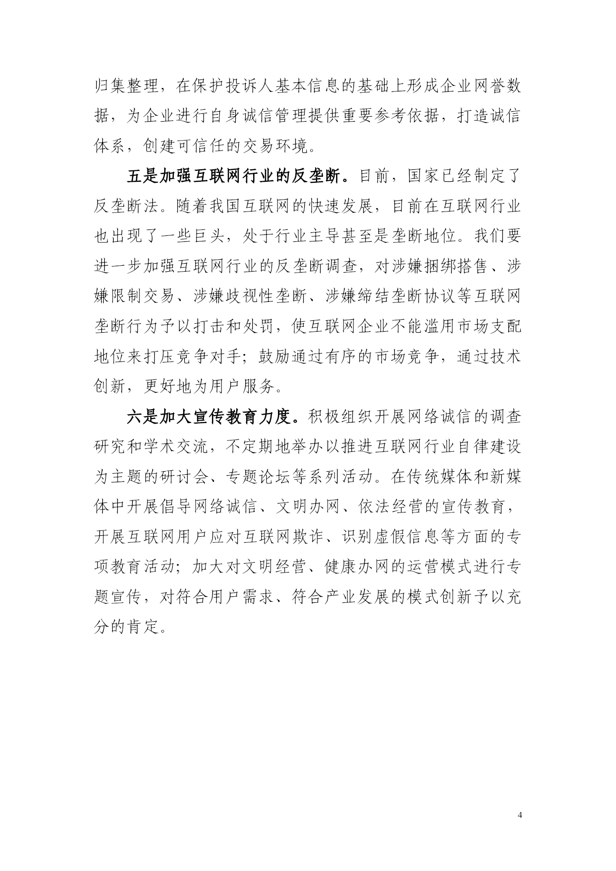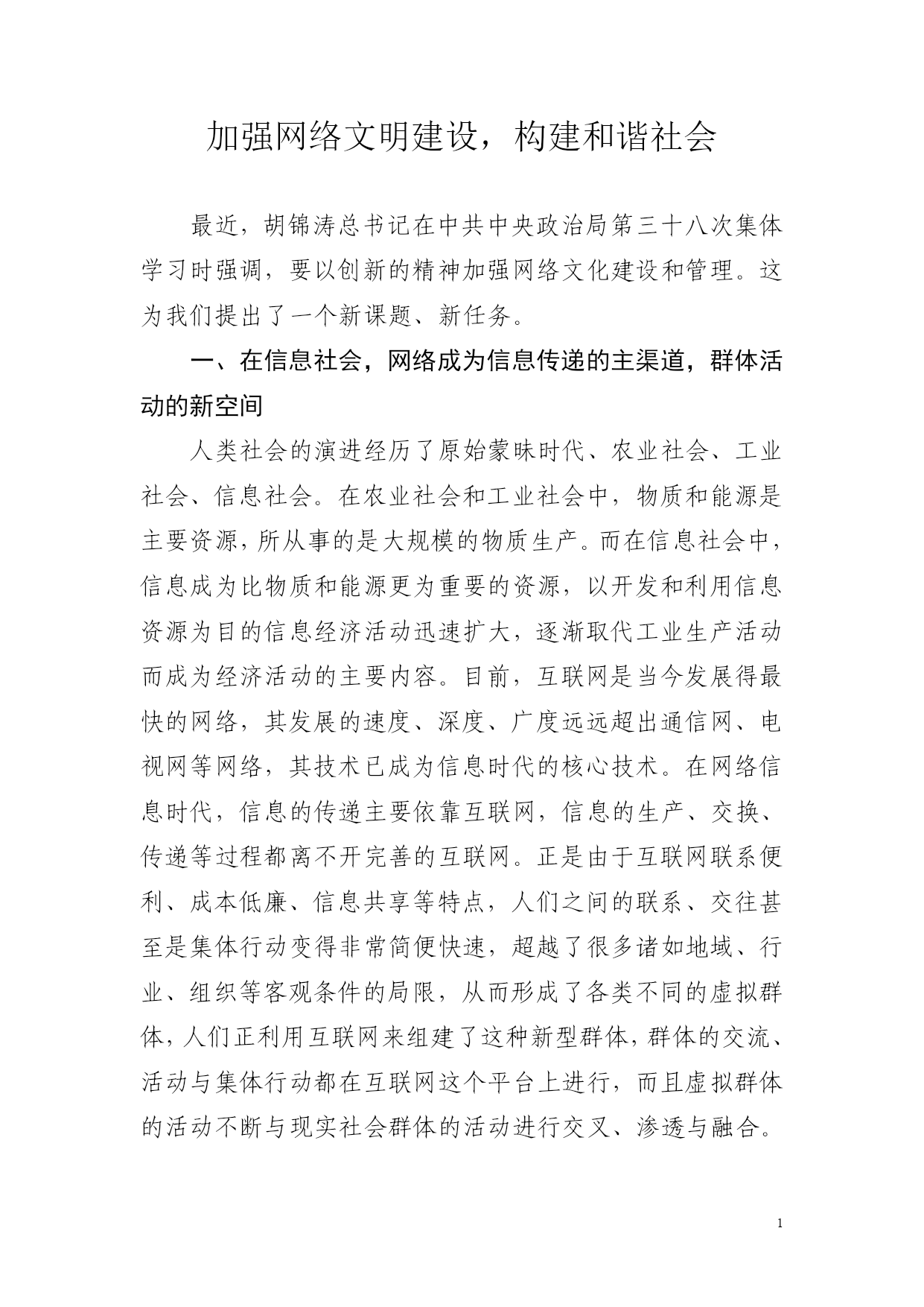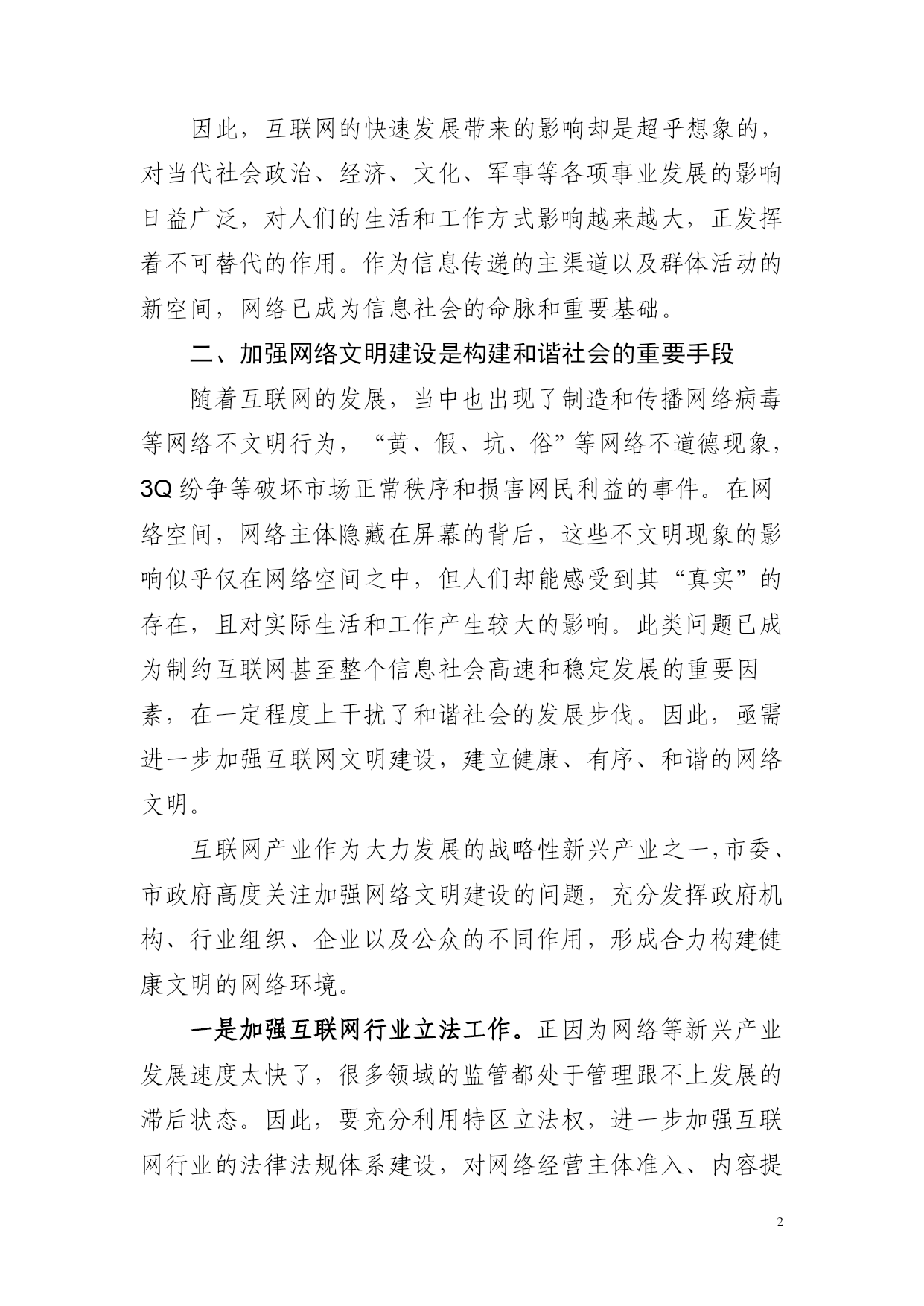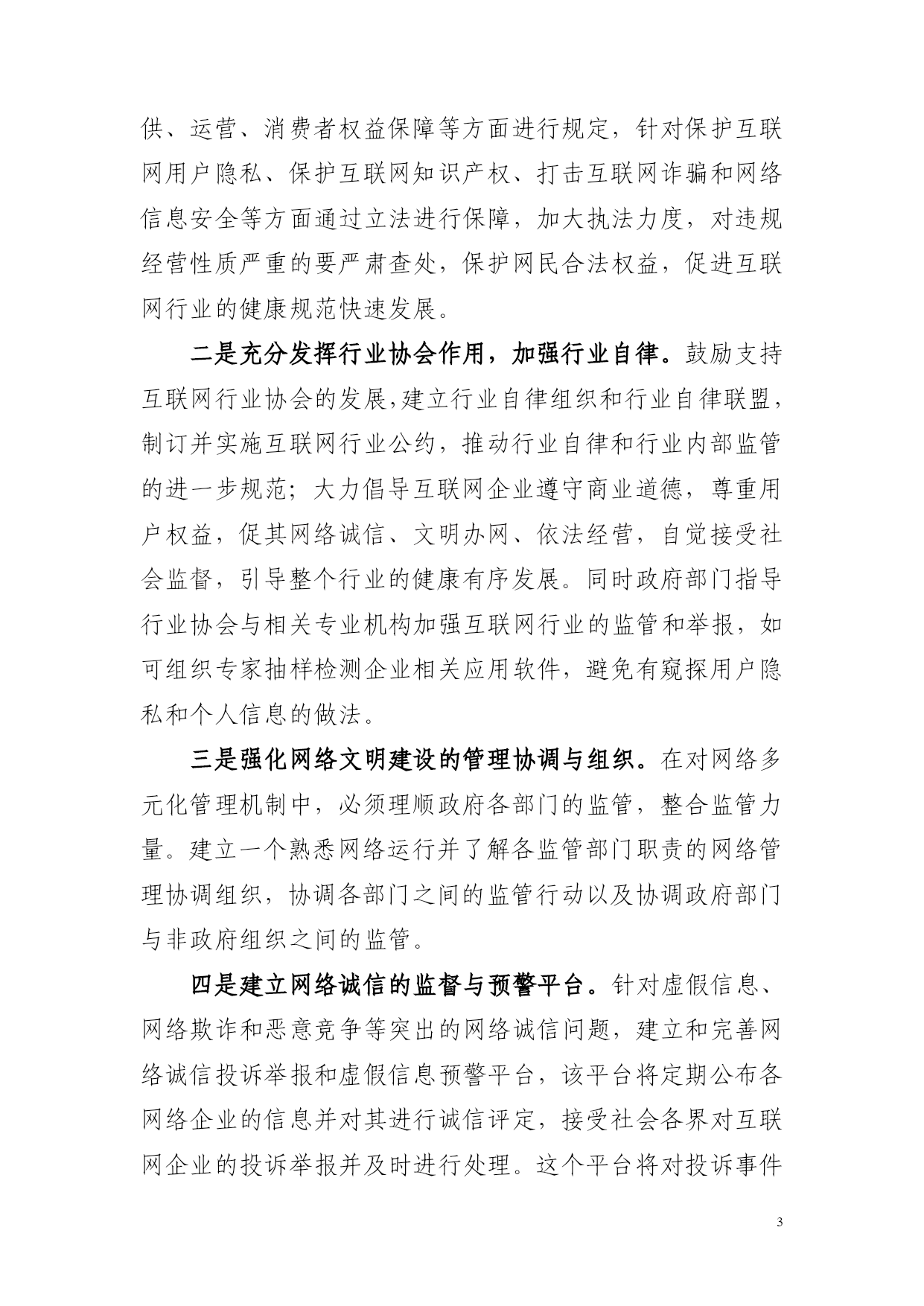 加强网络文明建设,构建和谐社会最近,胡锦涛总书记在中共中央政治局第三十八次集体学习时强调,要以创新的精神加强网络文化建设和管理。这为我们提出了一个新课题、新任务。一、在信息社会,网络成为信息传递的主渠道,群体活动的新空间人类社会的演进经历了原始蒙昧时代、农业社会、工业社会、信息社会。在农业社会和工业社会中,物质和能源是主要资源,所从事的是大规模的物质生产。而在信息社会中,信息成为比物质和能源更为重要的资源,以开发和利用信息资源为目的信息经济活动迅速扩大,逐渐取代工业生产活动而成为经济活动的主要内容。目前,互联网是当今发展得最快的网络,其发展的速度、深度、广度远远超出通信网、电视网等网络,其技术已成为信息时代的核心技术。在网络信息时代,信息的传递主要依靠互联网,信息的生产、交换、传递等过程都离不开完善的互联网。正是由于互联网联系便利、成本低廉、信息共享等特点,人们之间的联系、交往甚至是集体行动变得非常简便快速,超越了很多诸如地域、行业、组织等客观条件的局限,从而形成了各类不同的虚拟群体,人们正利用互联网来组建了这种新型群体,群体的交流、活动与集体行动都在互联网这个平台上进行,而且虚拟群体的活动不断与现实社会群体的活动进行交叉、渗透与融合。因此,互联网的快速发展带来的影响却是超乎想象的,对当代社会政治、经济、文化、军事等各项事业发展的影响日益广泛,对人们的生活和工作方式影响越来越大,正发挥着不可替代的作用。作为信息传递的主渠道以及群体活动的新空间,网络已成为信息社会的命脉和重要基础。二、加强网络文明建设是构建和谐社会的重要手段随着互联网的发展,当中也出现了制造和传播网络病毒等网络不文明行为,“黄、假、坑、俗”等网络不道德现象,3Q纷争等破坏市场正常秩序和损害网民利益的事件。在网络空间,网络主体隐藏在屏幕的背后,这些不文明现象的影响似乎仅在网络空间之中,但人们却能感受到其“真实”的存在,且对实际生活和工作产生较大的影响。此类问题已成为制约互联网甚至整个信息社会高速和稳定发展的重要因素,在一定程度上干扰了和谐社会的发展步伐。因此,亟需进一步加强互联网文明建设,建立健康、有序、和谐的网络文明。互联网产业作为大力发展的战略性新兴产业之一,市委、市政府高度关注加强网络文明建设的问题,充分发挥政府机构、行业组织、企业以及公众的不同作用,形成合力构建健康文明的网络环境。一是加强互联网行业立法工作。正因为网络等新兴产业发展速度太快了,很多领域的监管都处于管理跟不上发展的滞后状态。因此,要充分利用特区立法权,进一步加强互联网行业的法律法规体系建设,对网络经营主体准入、内容提供、运营、消费者权益保障等方面进行规定,针对保护互联网用户隐私、保护互联网知识产权、打击互联网诈骗和网络信息安全等方面通过立法进行保障,加大执法力度,对违规经营性质严重的要严肃查处,保护网民合法权益,促进互联网行业的健康规范快速发展。二是充分发挥行业协会作用,加强行业自律。鼓励支持互联网行业协会的发展,建立行业自律组织和行业自律联盟,制订并实施互联网行业公约,推动行业自律和行业内部监管的进一步规范;大力倡导互联网企业遵守商业道德,尊重用户权益,促其网络诚信、文明办网、依法经营,自觉接受社会监督,引导整个行业的健康有序发展。同时政府部门指导行业协会与相关专业机构加强互联网行业的监管和举报,如可组织专家抽样检测企业相关应用软件,避免有窥探用户隐私和个人信息的做法。三是强化网络文明建设的管理协调与组织。在对网络多元化管理机制中,必须理顺政府各部门的监管,整合监管力量。建立一个熟悉网络运行并了解各监管部门职责的网络管理协调组织,协调各部门之间的监管行动以及协调政府部门与非政府组织之间的监管。四是建立网络诚信的监督与预警平台。针对虚假信息、网络欺诈和恶意竞争等突出的网络诚信问题,建立和完善网络诚信投诉举报和虚假信息预警平台,该平台将定期公布各网络企业的信息并对其进行诚信评定,接受社会各界对互联网企业的投诉举报并及时进行处理。这个平台将对投诉事件归集整理,在保护投诉人基本信息的基础上形成企业网誉数据,为企业进行自身诚信管理提供重要参考依据,打造诚信体系,创建可信任的交易环境。五是加强互联网行业的反垄断。目前,国家已经制定了反垄断法。随着我国互联网的快速发展,目前在互联网行业也出现了一些巨头,处于行业主导甚至是垄断地位。我们要进一步加强互联网行业的反垄断调查,对涉嫌捆绑搭售、涉嫌限制交易、涉嫌歧视性垄断、涉嫌缔结垄断协议等互联网垄断行为予以打击和处罚,使互联网企业不能滥用市场支配地位来打压竞争对手;鼓励通过有序的市场竞争,通过技术创新,更好地为用户服务。六是加大宣传教育力度。积极组织开展网络诚信的调查研究和学术交流,不定期地举办以推进互联网行业自律建设为主题的研讨