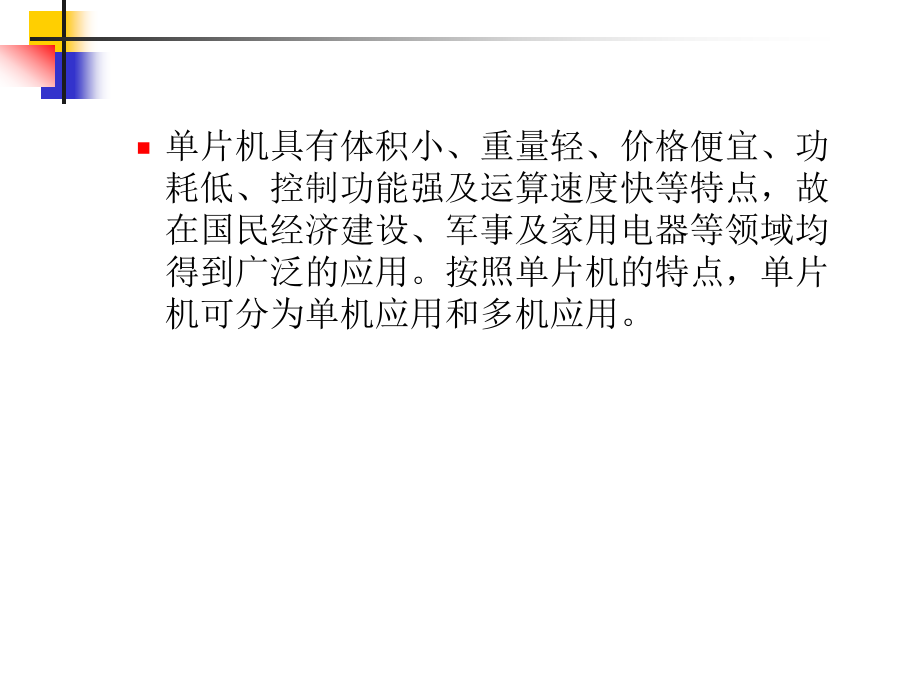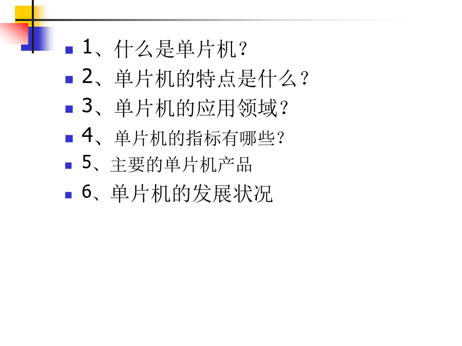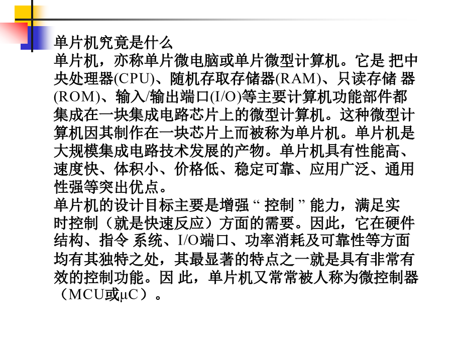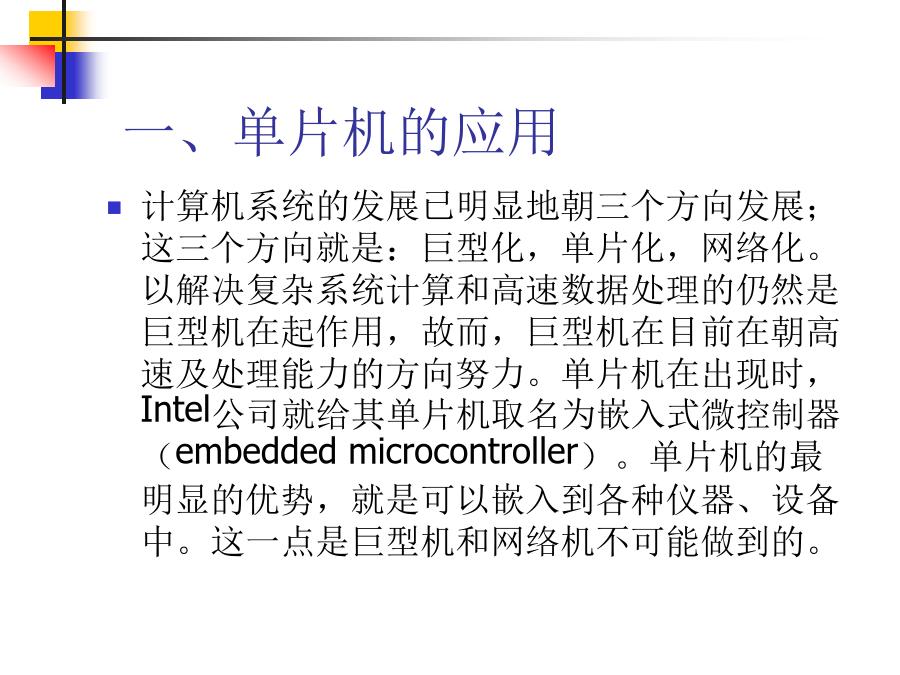 第一章概论1、什么是单片机?2、单片机的特点是什么?3、单片机的应用领域?4、单片机的指标有哪些?5、主要的单片机产品6、单片机的发展状况单片机究竟是什么单片机,亦称单片微电脑或单片微型计算机。它是把中央处理器(CPU)、随机存取存储器(RAM)、只读存储器(ROM)、输入/输出端口(I/O)等主要计算机功能部件都集成在一块集成电路芯片上的微型计算机。这种微型计算机因其制作在一块芯片上而被称为单片机。单片机是大规模集成电路技术发展的产物。单片机具有性能高、速度快、体积小、价格低、稳定可靠、应用广泛、通用性强等突出优点。单片机的设计目标主要是增强“控制”能力,满足实时控制(就是快速反应)方面的需要。因此,它在硬件结构、指令系统、I/O端口、功率消耗及可靠性等方面均有其独特之处,其最显著的特点之一就是具有非常有效的控制功能。因此,单片机又常常被人称为微控制器(MCU或μC)。一、单片机的应用单片机具有体积小、重量轻、价格便宜、功耗低、控制功能强及运算速度快等特点,故在国民经济建设、军事及家用电器等领域均得到广泛的应用。按照单片机的特点,单片机可分为单机应用和多机应用。1.单机应用在一个应用系统中,只使用1片单片机称为单机应用。单片机应用的主要领域有:1)测控系统。用单片机可构成各种工业控制系统、数据采集系统等。例如,温室人工气候控制、水闸自动控制、电镀生产线自动控制、汽轮机电液调节系统、车辆检测系统、机器人轴处理器等。(2)智能仪表。用单片机改造原有的测量、控制仪表,向着数字化、智能化、多功能化、综合化、柔性化发展。如温度、压力、流量、浓度等的测量、显示及仪表控制。通过采用单片机软件编程技术,使测量仪表中长期存在的误差修正、线性化处理等难题迎刃而解。(3)机电一体化产品。单片机与传统的机械产品结合,使传统机械产品结构简化,控制智能化。这类产品如:简易数控机床,电脑绣花机,医疗器械等。4)智能接口。在计算机控制系统(特别是较大型的工业测控系统)中,普遍采用单片机进行接口的控制与管理,因单片机与主机是并行工作,故大大提高了系统的运行速度。例如:在大型数据采集系统中,用单片机对ADC接口进行控制不仅可提高采集速度,而且还能对数据进行预处理,如数字滤波、线性化处理、误差修正等。(5)智能民用产品。在家用电器、玩具、游戏机、声像设备、电子秤、收银机、办公设备、厨房设备等产品中引入单片机,不仅使产品的功能大大增强,而且获得了良好的使用效果。多机应用;单片机的多机应用系统可分为功能集散系统、并行多机处理及局部网络系统。1)功能集散系统。多功能集散系统是为了满足工程系统多种外围功能的要求而设置的多机系统。例如:一个加工中心的计算机系统除完成机床加工运行控制外,还要控制对刀系统、坐标系统、刀库管理、状态监视、伺服驱动等结构。2)并行多控制系统。并行多控制系统主要解决工程应用系统的快速问题,以便构成大型实时工程应用系统。典型的有快速并行数据采集、处理系统、实时图像处理系统等。3)局部网络系统。单片机网络系统的出现,使单片机应用进入了一个新的水平。目前该网络系统主要是分布式测控系统,单片机主要用于系统中的通信控制,以及构成各种测控子级系统,如可编程控制器组成大型的控制系统。二、单片机的发展1、第1阶段(1971~1976):单片机发展的初级阶段。1971年11月Intel公司首先设计出集成度为2000只晶体管/片的4位微处理器Intel4004,并配有RAM、ROM和移位寄存器,构成了第一台MCS—4微处理器,而后又推出了8位微处理器Intel8008,以及其它各公司相继推出的8位微处理器。第2阶段(1976~1980):低性能单片机阶段。以1976年Intel公司推出的MCS—48系列为代表,采用将8位CPU、8位并行I/O接口、8位定时/计数器、RAM和ROM等集成于一块半导体芯片上的单片结构,虽然其寻址范围有限(不大于4KB),也没有串行I/O,RAM、ROM容量小,中断系统也较简单,但功能可满足一般工业控制和智能化仪器、仪表等的需要。第3阶段(1980~1983):高性能单片机阶段。这一阶段推出的高性能8位单片机普遍带有串行口,有多级中断处理系统,多个16位定时器/计数器。片内RAM、ROM的容量加大,且寻址范围可达64KB,个别片内还带有A/D转换接口。第4阶段(1983~80年代末):16位单片机阶段。1983年Intel公司又推出了高性能的16位单片机MCS—96系列,由于其采用了最新的制造工艺,使芯片集成度高达12万只晶体管/片。第5阶段(90年代):单片机在集成度、功能、速度、可靠性、应用领域等全方位向更高水平发展。1内部结构的进步字长,4位、8位、16位、32位。CISC结构-RISC结构。流水线结构。存储器(有ISP功能的OTP,