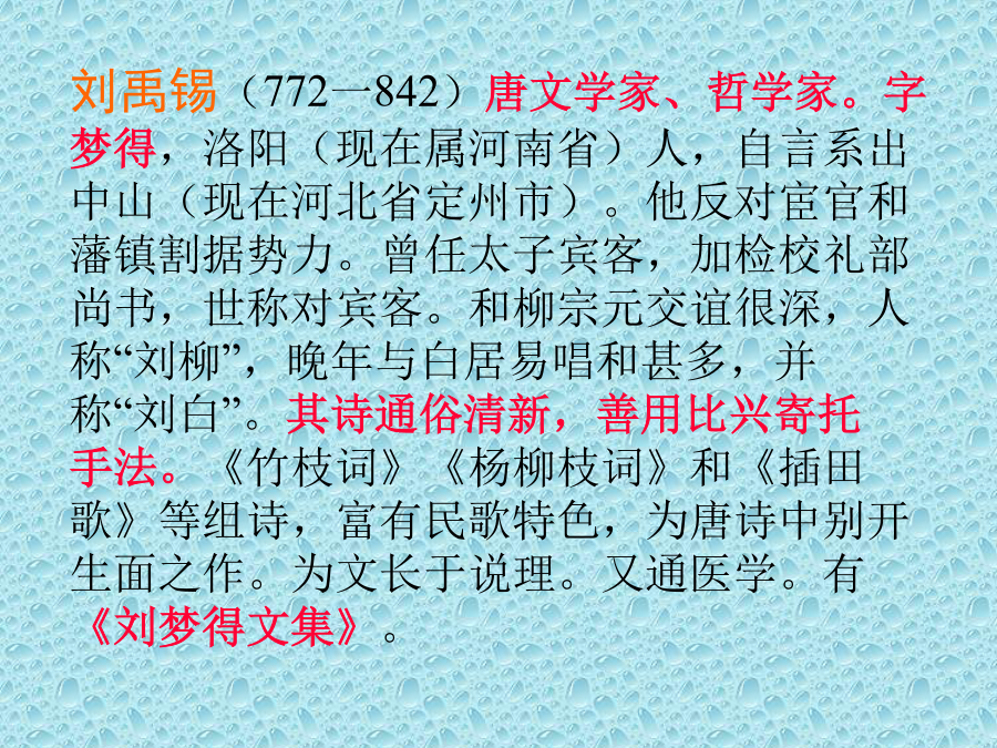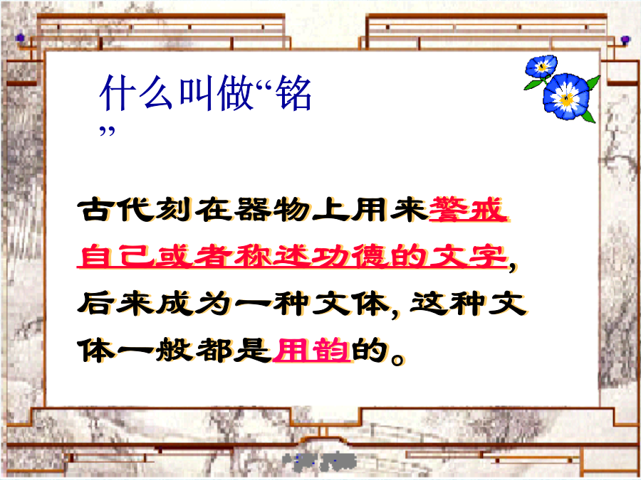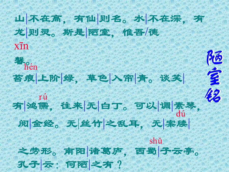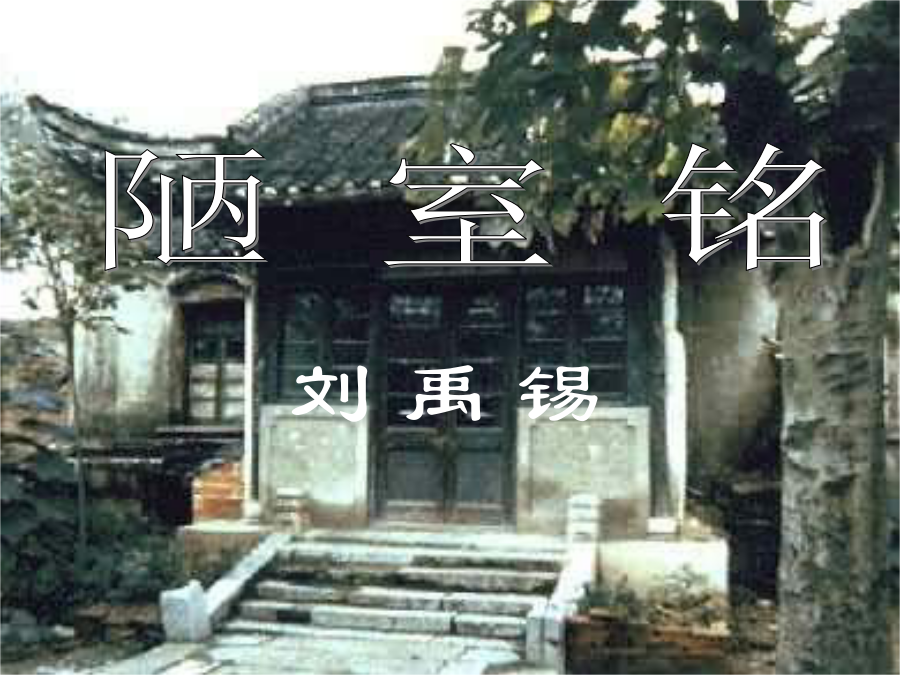 陋室铭刘禹锡(772一842)唐文学家、哲学家。字梦得,洛阳(现在属河南省)人,自言系出中山(现在河北省定州市)。他反对宦官和藩镇割据势力。曾任太子宾客,加检校礼部尚书,世称对宾客。和柳宗元交谊很深,人称“刘柳”,晚年与白居易唱和甚多,并称“刘白”。其诗通俗清新,善用比兴寄托手法。《竹枝词》《杨柳枝词》和《插田歌》等组诗,富有民歌特色,为唐诗中别开生面之作。为文长于说理。又通医学。有《刘梦得文集》。孔子|云:何陋|之有?朗读要求自然环境这就是刘禹锡先生笔下的陋室,从图片上看,它简陋吗?本文通过赞扬简陋的居室,表达了作者不慕荣利、保持高尚节操的愿望和不求闻达、安贫乐道的生活情趣。本文的主旨是要表达作者一种生活情趣,表达他的追求,但是文章没有一处直接说,全文都是在描写陋室的环境,谈对陋室的看法,这是什么写法呢?这样写有什么好处呢?文章的题目是“陋室铭”,文章的内容也反复写陋室,但文章却已“孔子云‘何陋之有?’作结,这是否前后矛盾呢?如果你是刘禹锡先生,你将以怎样的口吻来向别人介绍你的陋室呢?你一定非常热爱自己的家吧!读了刘禹锡的《陋室铭》,你能不能学一下刘禹锡,为你的家描上一笔,用来表达居住在家中的感受?斯是陋室,唯吾德馨再见