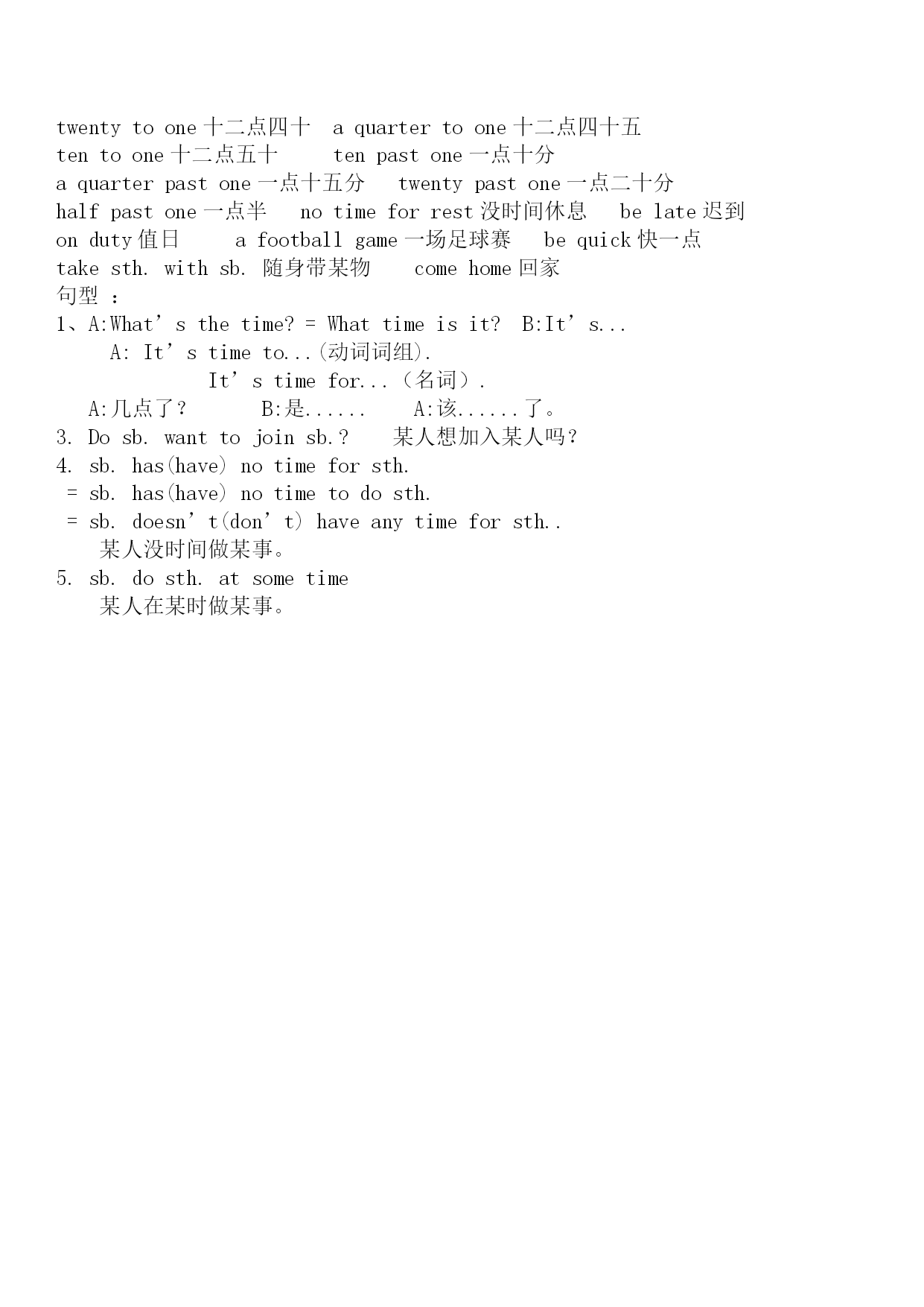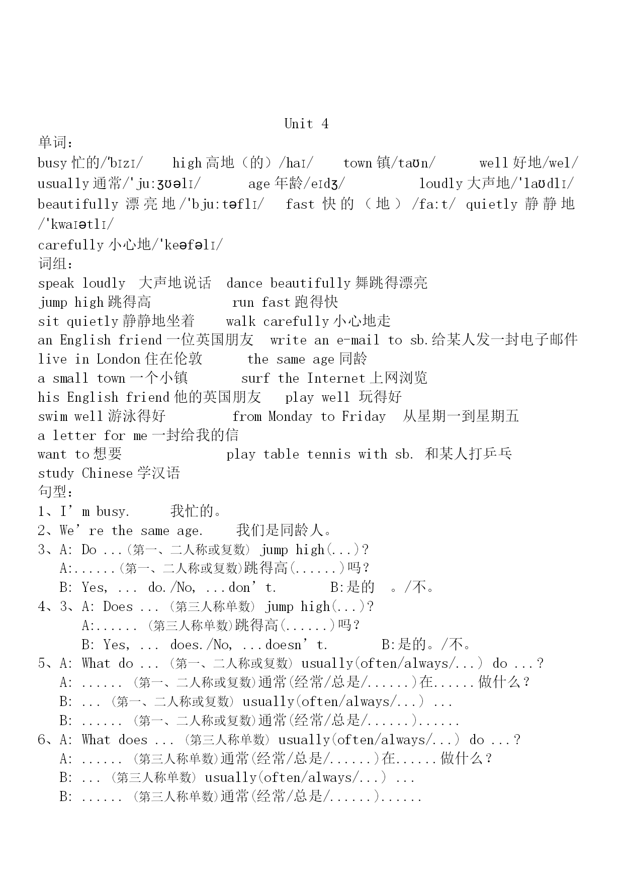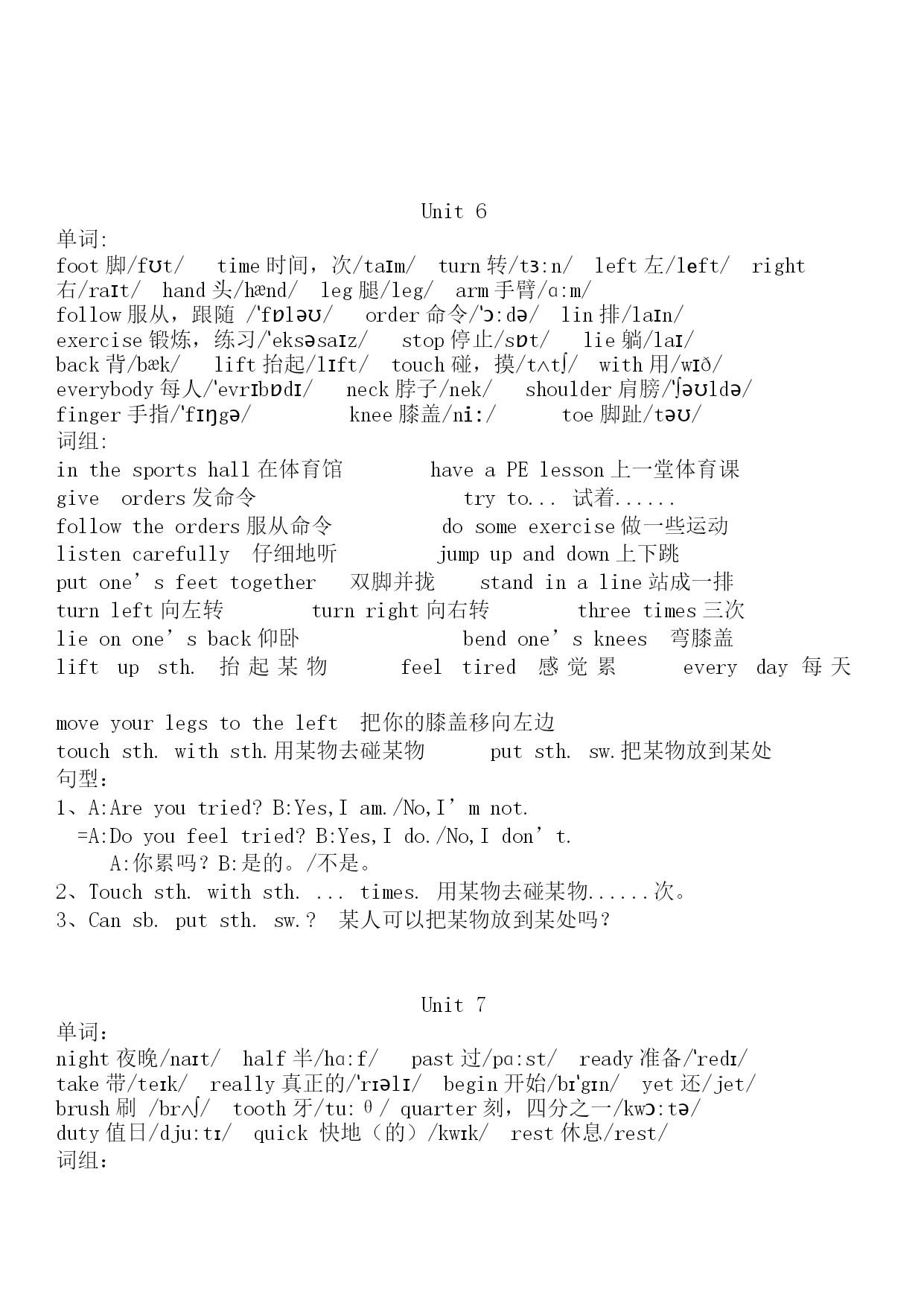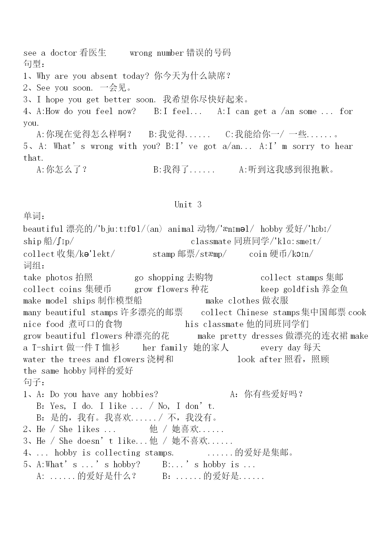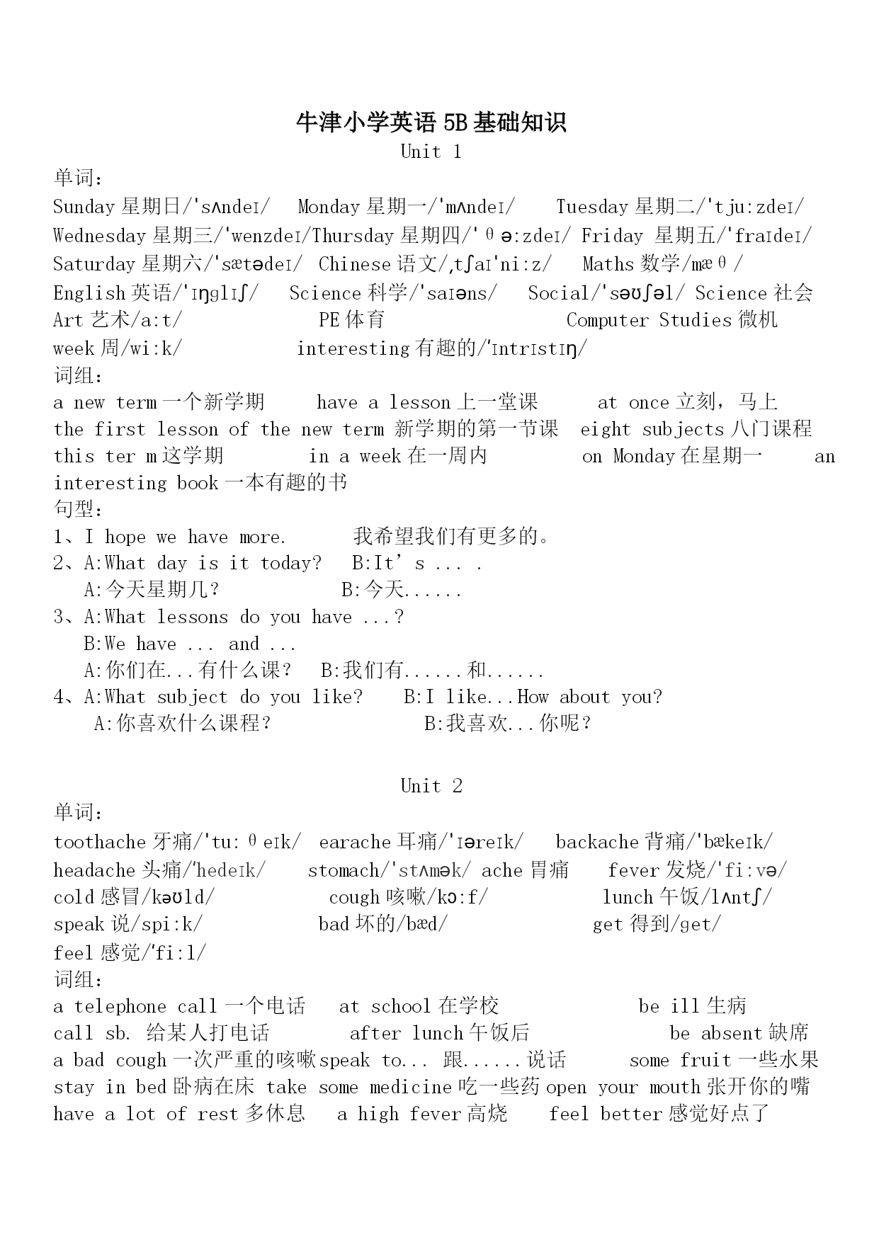 牛津小学英语5B基础知识Unit1单词:Sunday星期日/'sʌndeI/Monday星期一/'mʌndeI/Tuesday星期二/'tju:zdeI/Wednesday星期三/'wenzdeI/Thursday星期四/'θə:zdeI/Friday星期五/'fraIdeI/Saturday星期六/'sætədeI/Chinese语文/,tʃaI'ni:z/Maths数学/mæθ/English英语/'IŋɡlIʃ/Science科学/'saIəns/Social/'səʊʃəl/Science社会Art艺术/a:t/PE体育ComputerStudies微机week周/wi:k/interesting有趣的/’IntrIstIŋ/词组:anewterm一个新学期havealesson上一堂课atonce立刻,马上thefirstlessonofthenewterm新学期的第一节课eightsubjects八门课程thisterm这学期inaweek在一周内onMonday在星期一aninterestingbook一本有趣的书句型:1、Ihopewehavemore.我希望我们有更多的。2、A:Whatdayisittoday?B:It’s....A:今天星期几?B:今天......3、A:Whatlessonsdoyouhave...?B:Wehave...and...A:你们在...有什么课?B:我们有......和......4、A:Whatsubjectdoyoulike?B:Ilike...Howaboutyou?A:你喜欢什么课程?B:我喜欢...你呢?Unit2单词:toothache牙痛/'tu:θeIk/earache耳痛/'IəreIk/backache背痛/'bækeIk/headache头痛/’hedeIk/stomach/'stʌmək/ache胃痛fever发烧/'fi:və/cold感冒/kəʊld/cough咳嗽/kɔ:f/lunch午饭/lʌntʃ/speak说/spi:k/bad坏的/bæd/get得到/ɡet/feel感觉/’fi:l/词组:atelephonecall一个电话atschool在学校beill生病callsb.给某人打电话afterlunch午饭后beabsent缺席abadcough一次严重的咳嗽speakto...跟......说话somefruit一些水果stayinbed卧病在床takesomemedicine吃一些药openyourmouth张开你的嘴havealotofrest多休息ahighfever高烧feelbetter感觉好点了seeadoctor看医生wrongnumber错误的号码句型:1、Whyareyouabsenttoday?你今天为什么缺席?2、Seeyousoon.一会见。3、Ihopeyougetbettersoon.我希望你尽快好起来。4、A:Howdoyoufeelnow?B:Ifeel...A:Icangeta/ansome...foryou.A:你现在觉得怎么样啊?B:我觉得......C:我能给你一/一些......。5、A:What’swrongwithyou?B:I’vegota/an...A:I’msorrytohearthat.A:你怎么了?B:我得了......A:听到这我感到很抱歉。Unit3单词:beautiful漂亮的/'bju:tIfʊl/(an)animal动物/'ænIməl/hobby爱好/'hDbI/ship船/ʃIp/classmate同班同学/'klɑ:smeIt/collect收集/kə'lekt/stamp邮票/stæmp/coin硬币/kɔIn/词组:takephotos拍照goshopping去购物collectstamps集邮collectcoins集硬币growflowers种花keepgoldfish养金鱼makemodelships制作模型船makeclothes做衣服manybeautifulstamps许多漂亮的邮票collectChinesestamps集中国邮票cooknicefood煮可口的食物hisclassmate他的同班同学们growbeautifulflowers种漂亮的花makeprettydresses做漂亮的连衣裙makeaT-shirt做一件T恤衫herfamily她的家人everyday每天waterthetreesandflowers浇树和lookafter照看,照顾thesamehobby同样的爱好句子:1、A:Doyouhaveanyhobbies?A:你有些爱好吗?B:Yes,Ido.Ilike.../No,Idon’t.B:是的,我有。我喜欢.