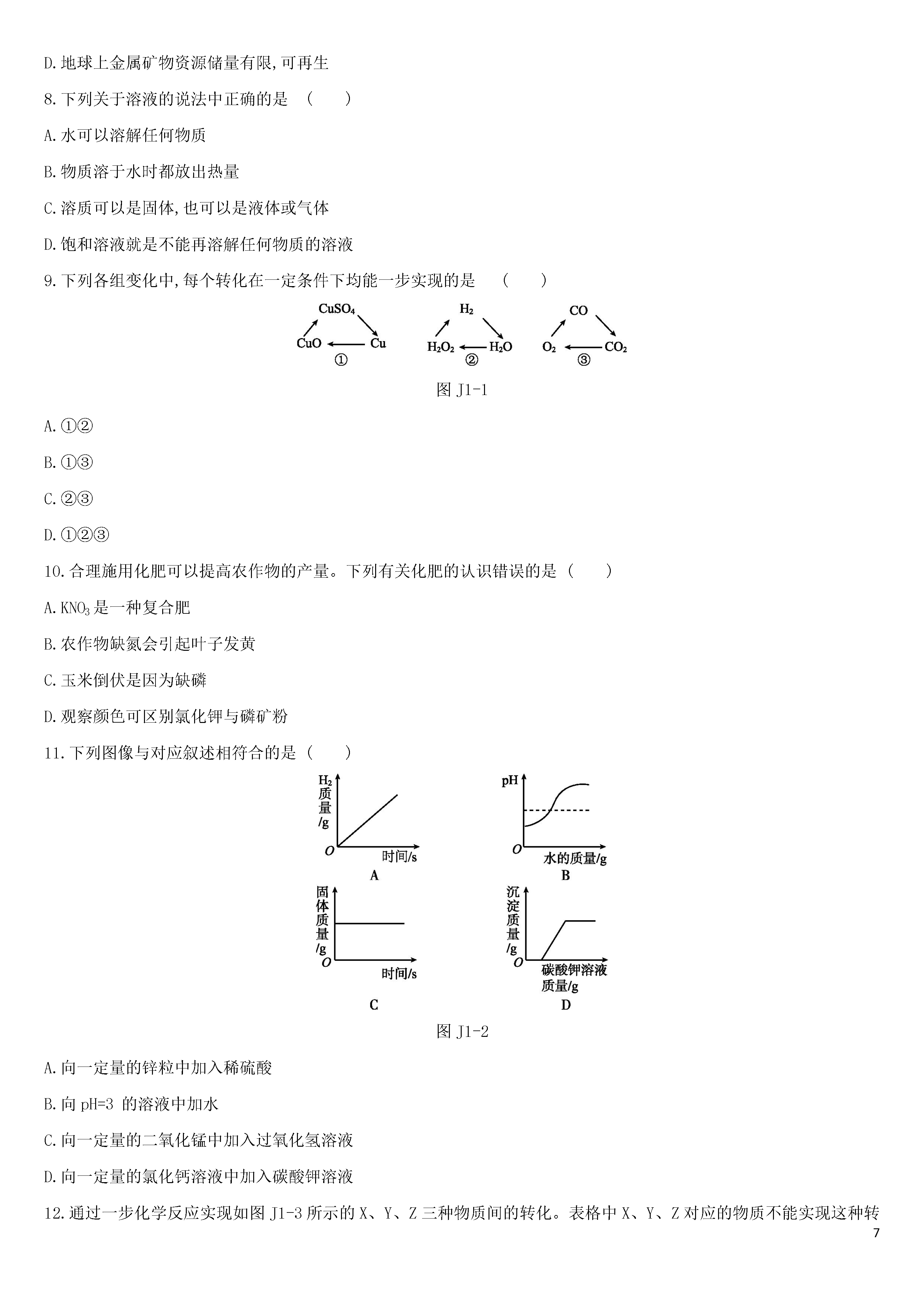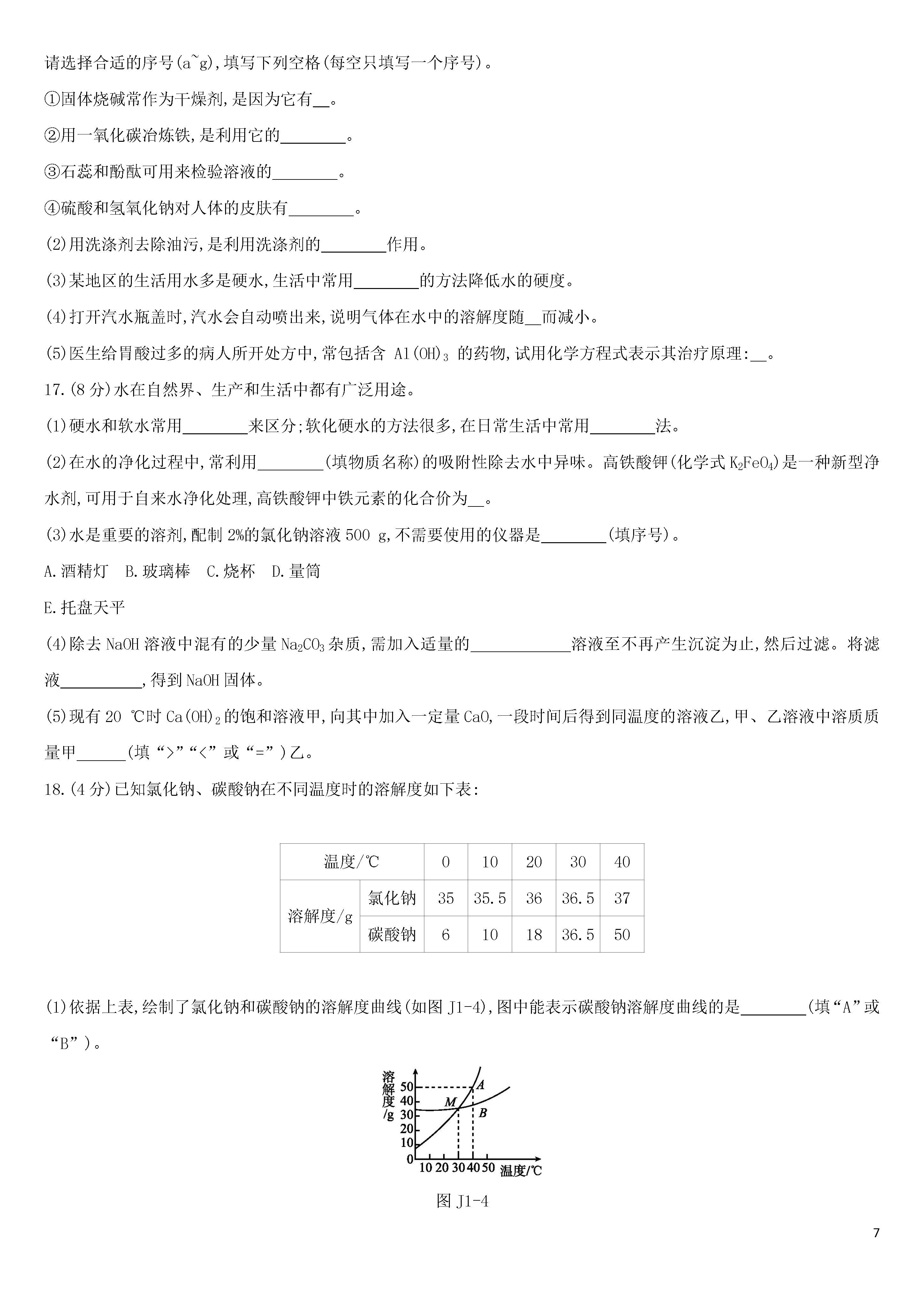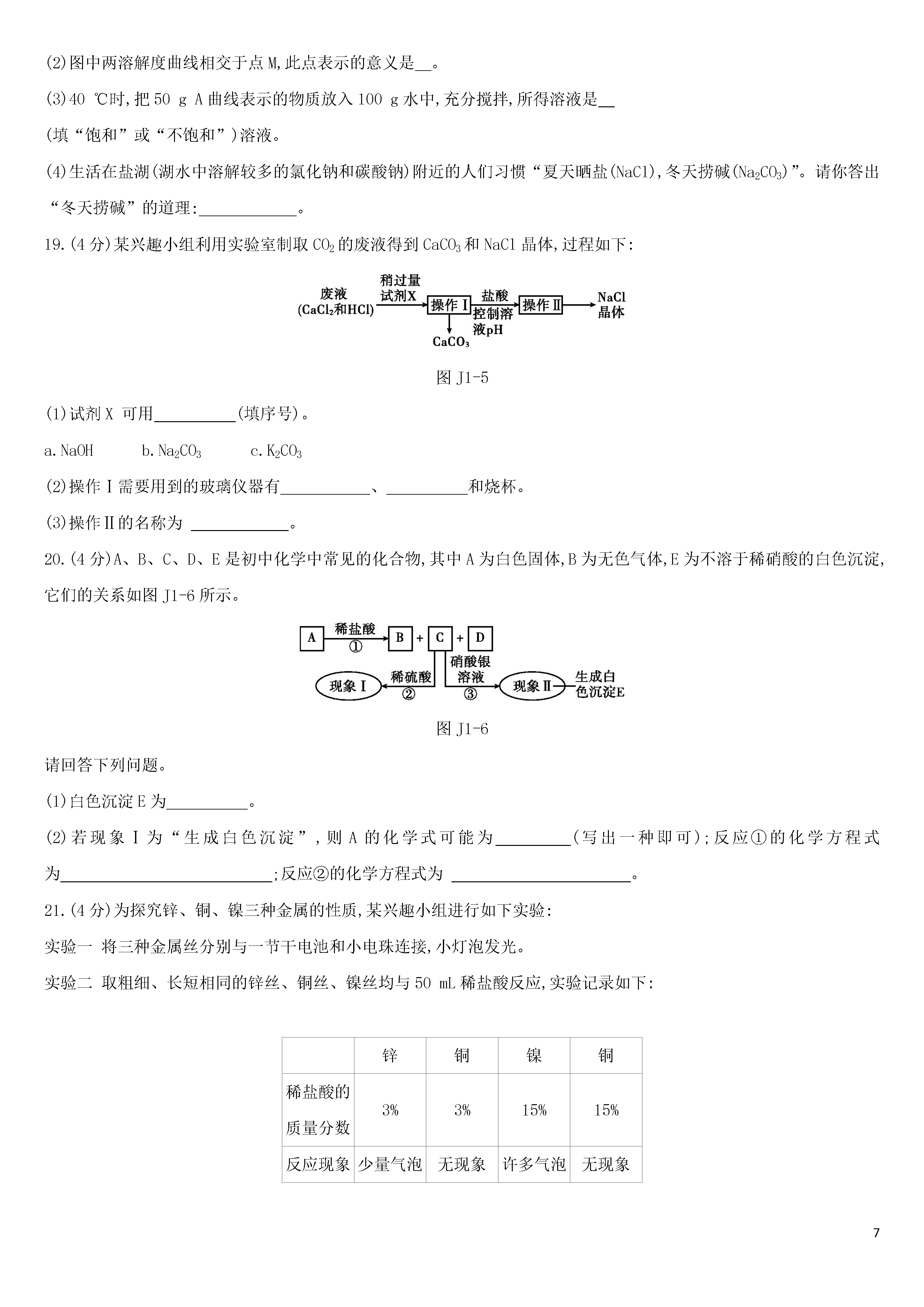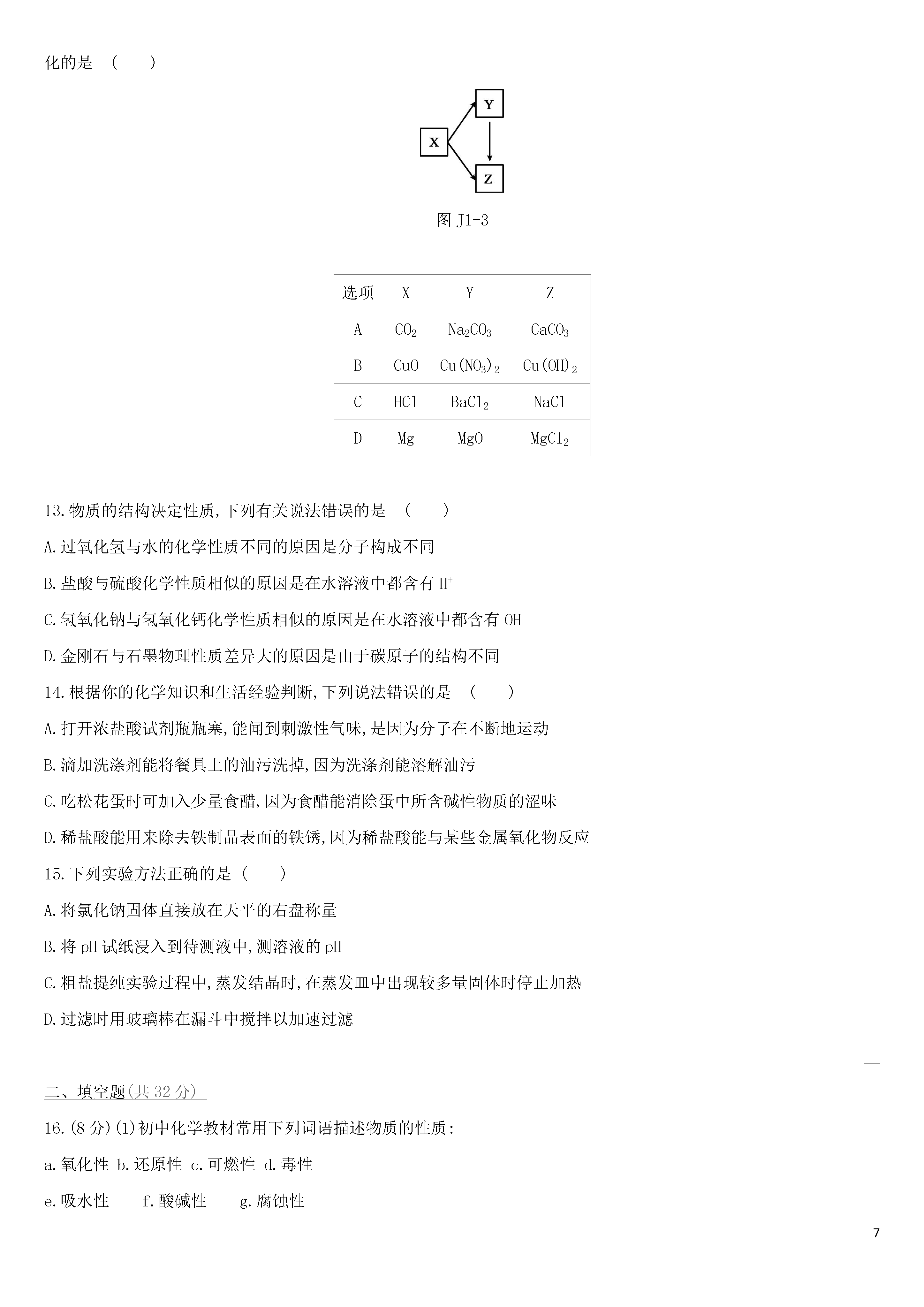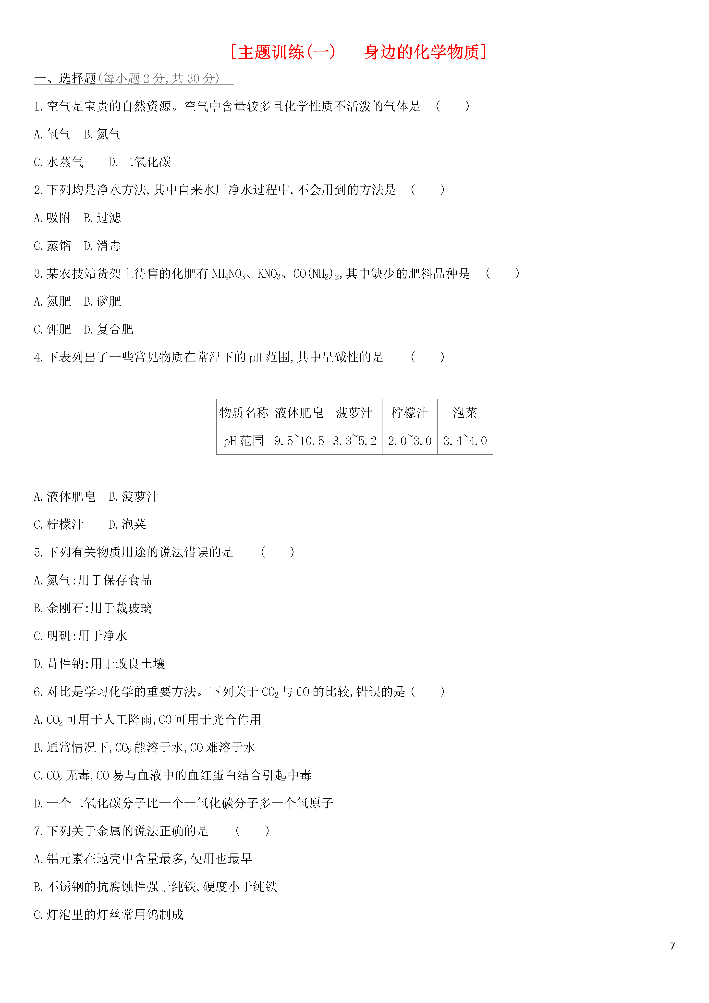 7[主题训练(一)身边的化学物质]一、选择题(每小题2分,共30分)1.空气是宝贵的自然资源。空气中含量较多且化学性质不活泼的气体是()A.氧气B.氮气C.水蒸气D.二氧化碳2.下列均是净水方法,其中自来水厂净水过程中,不会用到的方法是()A.吸附B.过滤C.蒸馏D.消毒3.某农技站货架上待售的化肥有NH4NO3、KNO3、CO(NH2)2,其中缺少的肥料品种是()A.氮肥B.磷肥C.钾肥D.复合肥4.下表列出了一些常见物质在常温下的pH范围,其中呈碱性的是()物质名称液体肥皂菠萝汁柠檬汁泡菜pH范围9.5~10.53.3~5.22.0~3.03.4~4.0A.液体肥皂B.菠萝汁C.柠檬汁D.泡菜5.下列有关物质用途的说法错误的是()A.氮气:用于保存食品B.金刚石:用于裁玻璃C.明矾:用于净水D.苛性钠:用于改良土壤6.对比是学习化学的重要方法。下列关于CO2与CO的比较,错误的是()A.CO2可用于人工降雨,CO可用于光合作用B.通常情况下,CO2能溶于水,CO难溶于水C.CO2无毒,CO易与血液中的血红蛋白结合引起中毒D.一个二氧化碳分子比一个一氧化碳分子多一个氧原子7.下列关于金属的说法正确的是()A.铝元素在地壳中含量最多,使用也最早B.不锈钢的抗腐蚀性强于纯铁,硬度小于纯铁C.灯泡里的灯丝常用钨制成D.地球上金属矿物资源储量有限,可再生8.下列关于溶液的说法中正确的是()A.水可以溶解任何物质B.物质溶于水时都放出热量C.溶质可以是固体,也可以是液体或气体D.饱和溶液就是不能再溶解任何物质的溶液9.下列各组变化中,每个转化在一定条件下均能一步实现的是()图J1-1A.①②B.①③C.②③D.①②③10.合理施用化肥可以提高农作物的产量。下列有关化肥的认识错误的是()A.KNO3是一种复合肥B.农作物缺氮会引起叶子发黄C.玉米倒伏是因为缺磷D.观察颜色可区别氯化钾与磷矿粉11.下列图像与对应叙述相符合的是()图J1-2A.向一定量的锌粒中加入稀硫酸B.向pH=3的溶液中加水C.向一定量的二氧化锰中加入过氧化氢溶液D.向一定量的氯化钙溶液中加入碳酸钾溶液12.通过一步化学反应实现如图J1-3所示的X、Y、Z三种物质间的转化。表格中X、Y、Z对应的物质不能实现这种转化的是()图J1-3选项XYZACO2Na2CO3CaCO3BCuOCu(NO3)2Cu(OH)2CHClBaCl2NaClDMgMgOMgCl213.物质的结构决定性质,下列有关说法错误的是()A.过氧化氢与水的化学性质不同的原因是分子构成不同B.盐酸与硫酸化学性质相似的原因是在水溶液中都含有H+C.氢氧化钠与氢氧化钙化学性质相似的原因是在水溶液中都含有OH-D.金刚石与石墨物理性质差异大的原因是由于碳原子的结构不同14.根据你的化学知识和生活经验判断,下列说法错误的是()A.打开浓盐酸试剂瓶瓶塞,能闻到刺激性气味,是因为分子在不断地运动B.滴加洗涤剂能将餐具上的油污洗掉,因为洗涤剂能溶解油污C.吃松花蛋时可加入少量食醋,因为食醋能消除蛋中所含碱性物质的涩味D.稀盐酸能用来除去铁制品表面的铁锈,因为稀盐酸能与某些金属氧化物反应15.下列实验方法正确的是()A.将氯化钠固体直接放在天平的右盘称量B.将pH试纸浸入到待测液中,测溶液的pHC.粗盐提纯实验过程中,蒸发结晶时,在蒸发皿中出现较多量固体时停止加热D.过滤时用玻璃棒在漏斗中搅拌以加速过滤二、填空题(共32分)16.(8分)(1)初中化学教材常用下列词语描述物质的性质:a.氧化性b.还原性c.可燃性d.毒性e.吸水性f.酸碱性g.腐蚀性请选择合适的序号(a~g),填写下列空格(每空只填写一个序号)。①固体烧碱常作为干燥剂,是因为它有。②用一氧化碳冶炼铁,是利用它的。③石蕊和酚酞可用来检验溶液的。④硫酸和氢氧化钠对人体的皮肤有。(2)用洗涤剂去除油污,是利用洗涤剂的作用。(3)某地区的生活用水多是硬水,生活中常用的方法降低水的硬度。(4)打开汽水瓶盖时,汽水会自动喷出来,说明气体在水中的溶解度随而减小。(5)医生给胃酸过多的病人所开处方中,常包括含Al(OH)3的药物,试用化学方程式表示其治疗原理:。17.(8分)水在自然界、生产和生活中都有广泛用途。(1)硬水和软水常用来区分;软化硬水的方法很多,在日常生活中常用法。(2)在水的净化过程中,常利用(填物质名称)的吸附性除去水中异味。高铁酸钾(化学式K2FeO4)是一种新型净水剂,可用于自来水净化处理,高铁酸钾中铁元素的化合价为。(3)水是重要的溶