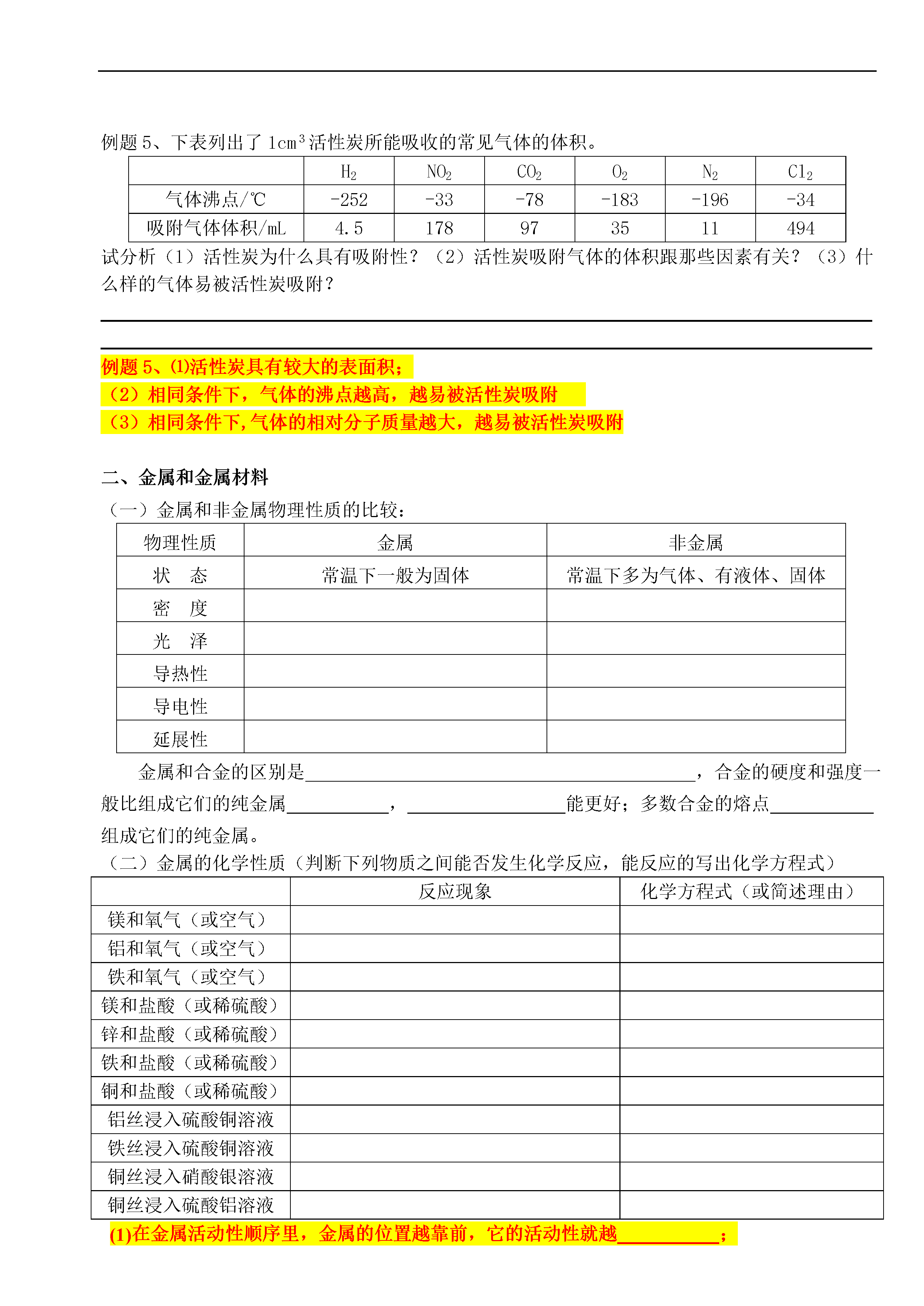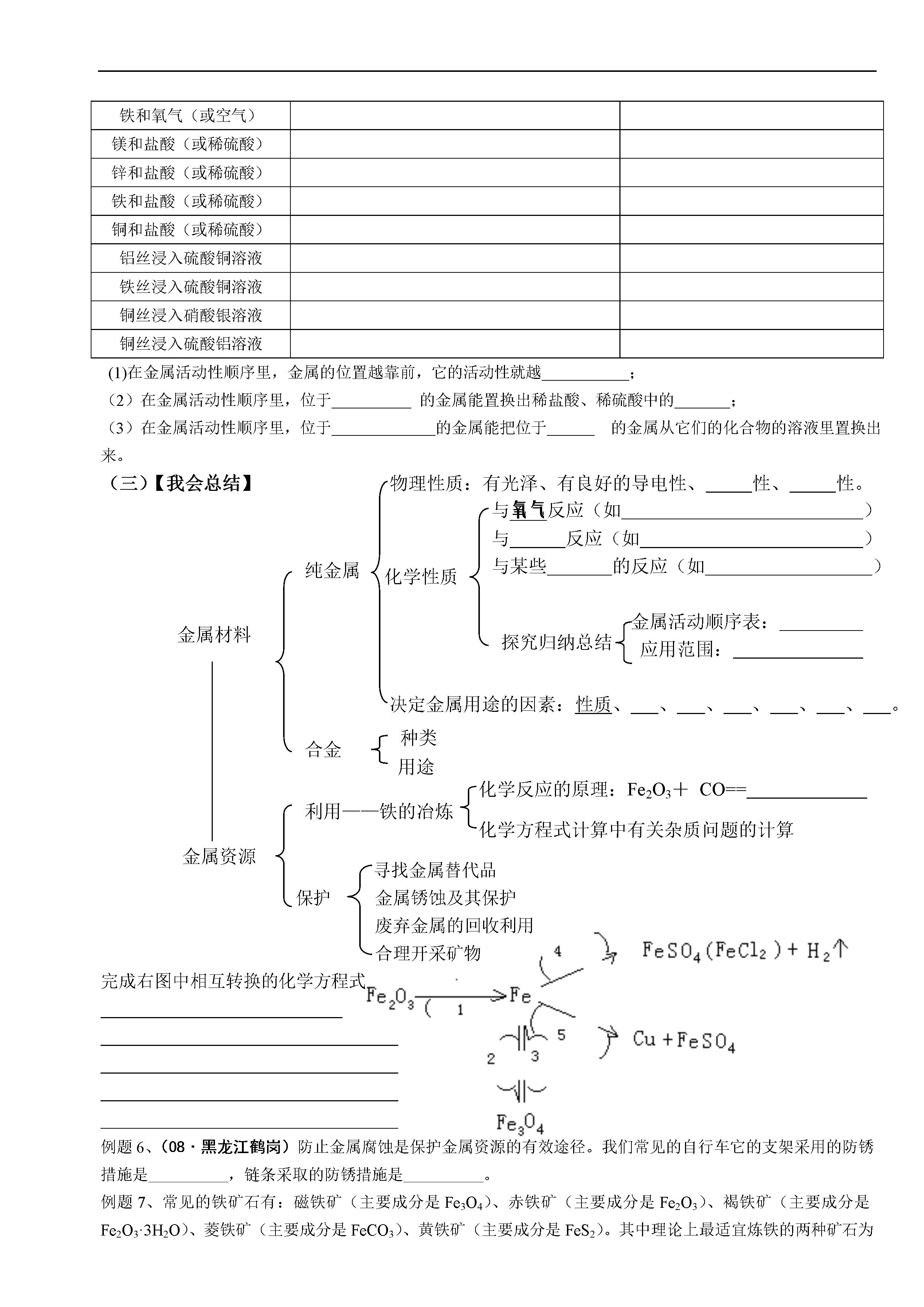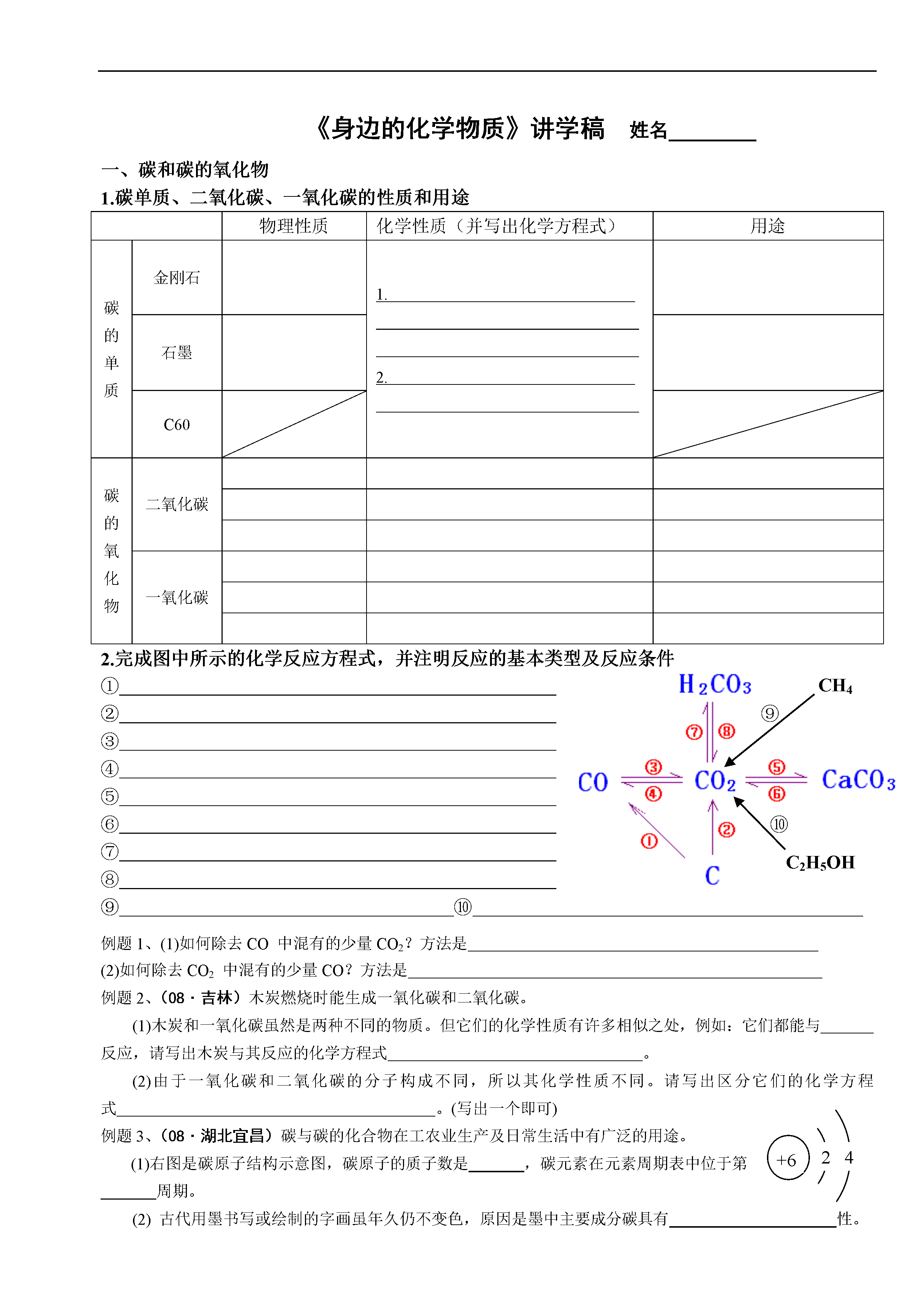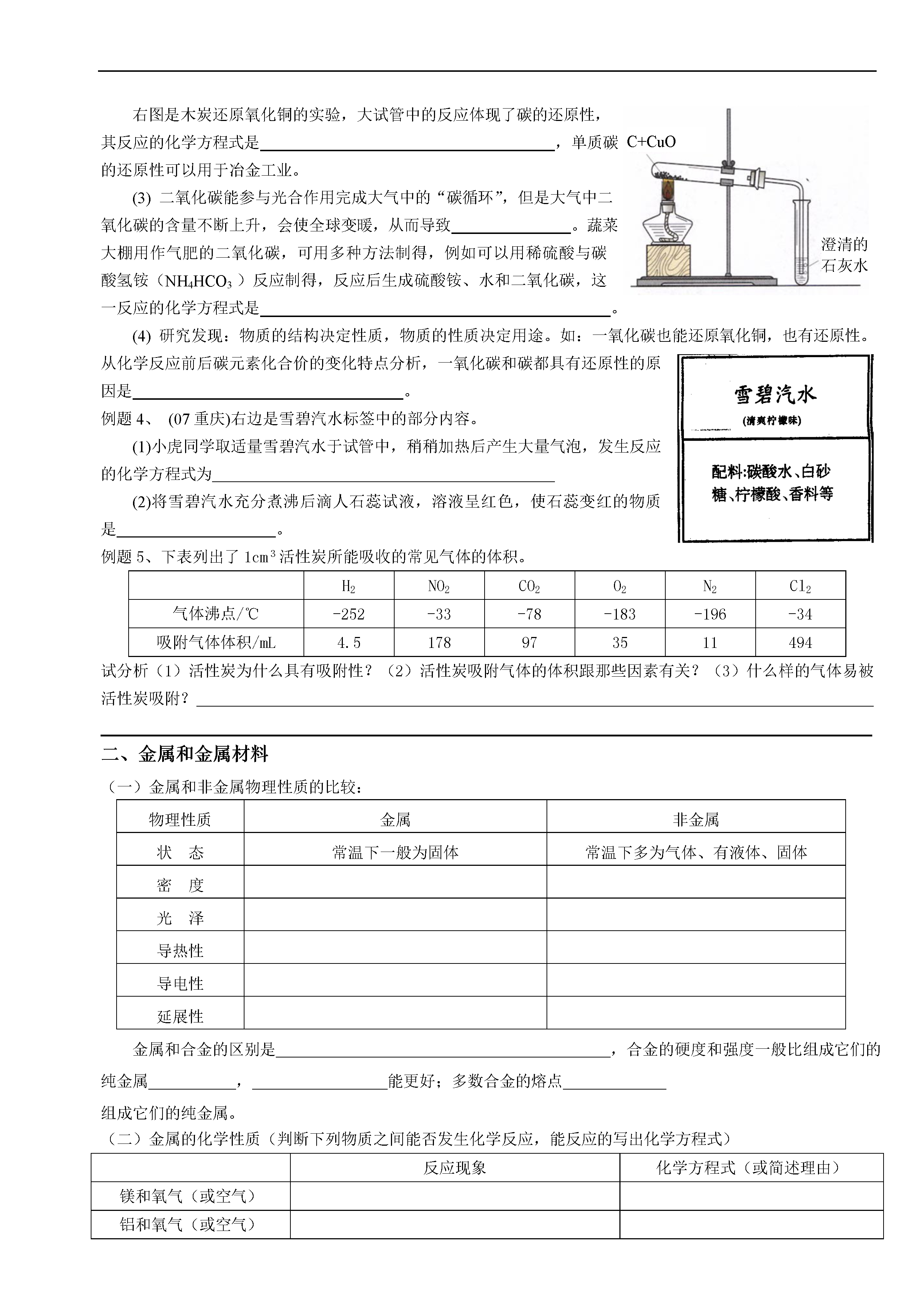 《身边的化学物质》讲学稿姓名一、碳和碳的氧化物1.碳单质、二氧化碳、一氧化碳的性质和用途物理性质化学性质(并写出化学方程式)用途碳的单质金刚石1.2.石墨C60碳的氧化物二氧化碳一氧化碳CH42.完成图中所示的化学反应方程式,并注明反应的基本类型及反应条件①②⑨③④⑤⑥⑩C2H5OH⑦⑧⑨CH4⑩例题1、(1)如何除去CO中混有的少量CO2?方法是(2)如何除去CO2中混有的少量CO?方法是例题2、(08·吉林)木炭燃烧时能生成一氧化碳和二氧化碳。(1)木炭和一氧化碳虽然是两种不同的物质。但它们的化学性质有许多相似之处,例如:它们都能与反应,请写出木炭与其反应的化学方程式。+624(2)由于一氧化碳和二氧化碳的分子构成不同,所以其化学性质不同。请写出区分它们的化学方程式。(写出一个即可)例题3、(08·湖北宜昌)碳与碳的化合物在工农业生产及日常生活中有广泛的用途。(1)右图是碳原子结构示意图,碳原子的质子数是,碳元素在元素周期表中位于第周期。(2)古代用墨书写或绘制的字画虽年久仍不变色,原因是墨中主要成分碳具有性。C+CuO澄清的石灰水右图是木炭还原氧化铜的实验,大试管中的反应体现了碳的还原性,其反应的化学方程式是,单质碳的还原性可以用于冶金工业。(3)二氧化碳能参与光合作用完成大气中的“碳循环”,但是大气中二氧化碳的含量不断上升,会使全球变暖,从而导致。蔬菜大棚用作气肥的二氧化碳,可用多种方法制得,例如可以用稀硫酸与碳酸氢铵(NH4HCO3)反应制得,反应后生成硫酸铵、水和二氧化碳,这一反应的化学方程式是。(4)研究发现:物质的结构决定性质,物质的性质决定用途。如:一氧化碳也能还原氧化铜,也有还原性。从化学反应前后碳元素化合价的变化特点分析,一氧化碳和碳都具有还原性的原因是。例题4、(07重庆)右边是雪碧汽水标签中的部分内容。(1)小虎同学取适量雪碧汽水于试管中,稍稍加热后产生大量气泡,发生反应的化学方程式为(2)将雪碧汽水充分煮沸后滴人石蕊试液,溶液呈红色,使石蕊变红的物质是。例题5、下表列出了1cm3活性炭所能吸收的常见气体的体积。H2NO2CO2O2N2Cl2气体沸点/℃-252-33-78-183-196-34吸附气体体积/mL4.5178973511494试分析(1)活性炭为什么具有吸附性?(2)活性炭吸附气体的体积跟那些因素有关?(3)什么样的气体易被活性炭吸附?二、金属和金属材料(一)金属和非金属物理性质的比较:物理性质金属非金属状态常温下一般为固体常温下多为气体、有液体、固体密度光泽导热性导电性延展性金属和合金的区别是,合金的硬度和强度一般比组成它们的纯金属,能更好;多数合金的熔点组成它们的纯金属。(二)金属的化学性质(判断下列物质之间能否发生化学反应,能反应的写出化学方程式)反应现象化学方程式(或简述理由)镁和氧气(或空气)铝和氧气(或空气)铁和氧气(或空气)镁和盐酸(或稀硫酸)锌和盐酸(或稀硫酸)铁和盐酸(或稀硫酸)铜和盐酸(或稀硫酸)铝丝浸入硫酸铜溶液铁丝浸入硫酸铜溶液铜丝浸入硝酸银溶液铜丝浸入硫酸铝溶液(1)在金属活动性顺序里,金属的位置越靠前,它的活动性就越;(2)在金属活动性顺序里,位于的金属能置换出稀盐酸、稀硫酸中的;(3)在金属活动性顺序里,位于的金属能把位于的金属从它们的化合物的溶液里置换出来。(三)【我会总结】物理性质:有光泽、有良好的导电性、性、性。与氧气反应(如)纯金属与反应(如)化学性质与某些的反应(如)探究归纳总结金属材料金属活动顺序表:应用范围:决定金属用途的因素:性质、、、、、、。种类合金化学反应的原理:Fe2O3+CO==化学方程式计算中有关杂质问题的计算用途利用——铁的冶炼金属资源寻找金属替代品保护金属锈蚀及其保护废弃金属的回收利用合理开采矿物完成右图中相互转换的化学方程式例题6、(08·黑龙江鹤岗)防止金属腐蚀是保护金属资源的有效途径。我们常见的自行车它的支架采用的防锈措施是__________,链条采取的防锈措施是__________。例题7、常见的铁矿石有:磁铁矿(主要成分是Fe3O4)、赤铁矿(主要成分是Fe2O3)、褐铁矿(主要成分是Fe2O3·3H2O)、菱铁矿(主要成分是FeCO3)、黄铁矿(主要成分是FeS2)。其中理论上最适宜炼铁的两种矿石为,理由是。例题8、(07山东)把一小包铁粉放入一定量的硝酸铜溶液中,使其充分反应后,过滤、洗涤、干燥,得到固体。请你对固体的成分进行探究。(1)猜想:固体的成分可能是____________________________