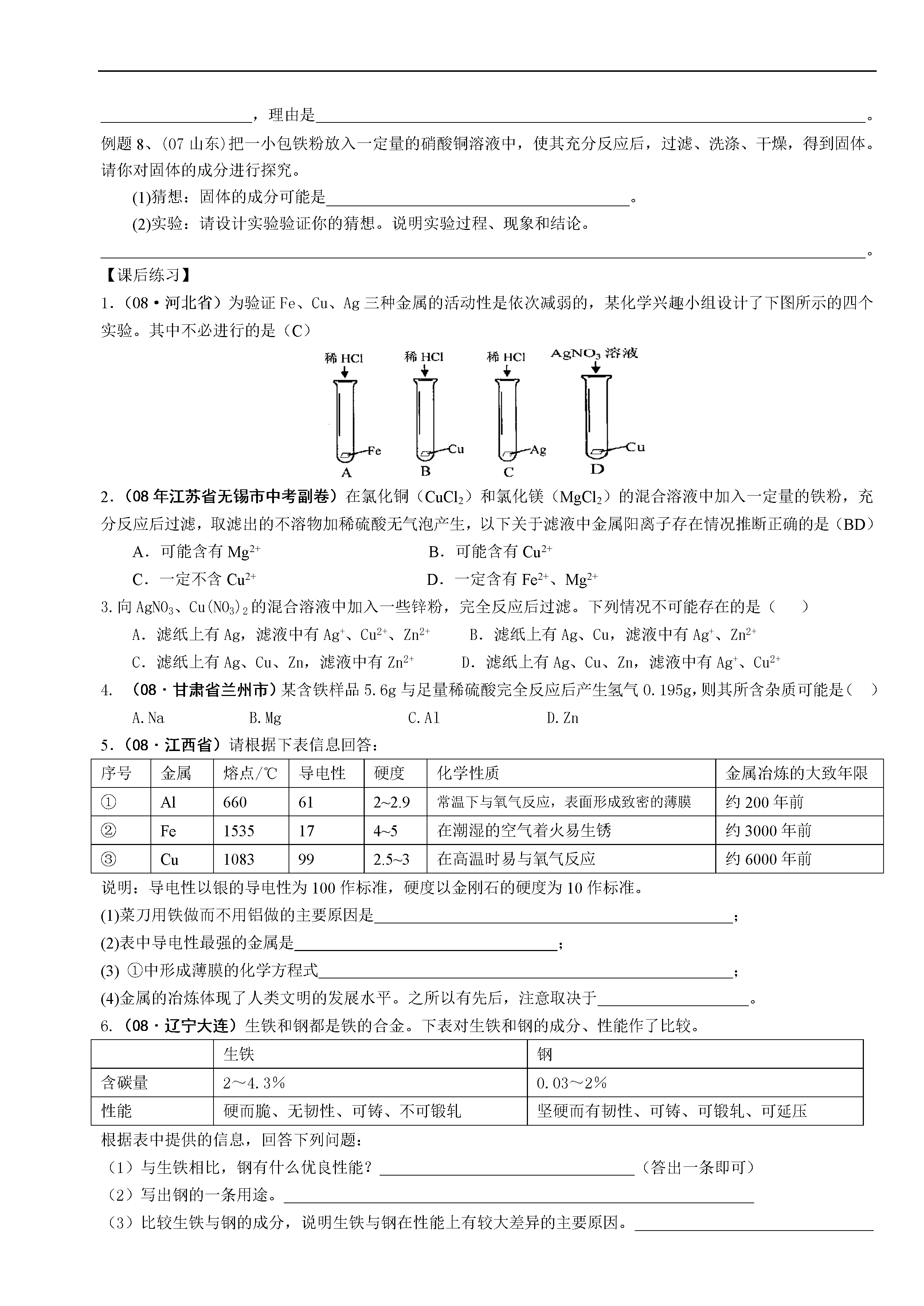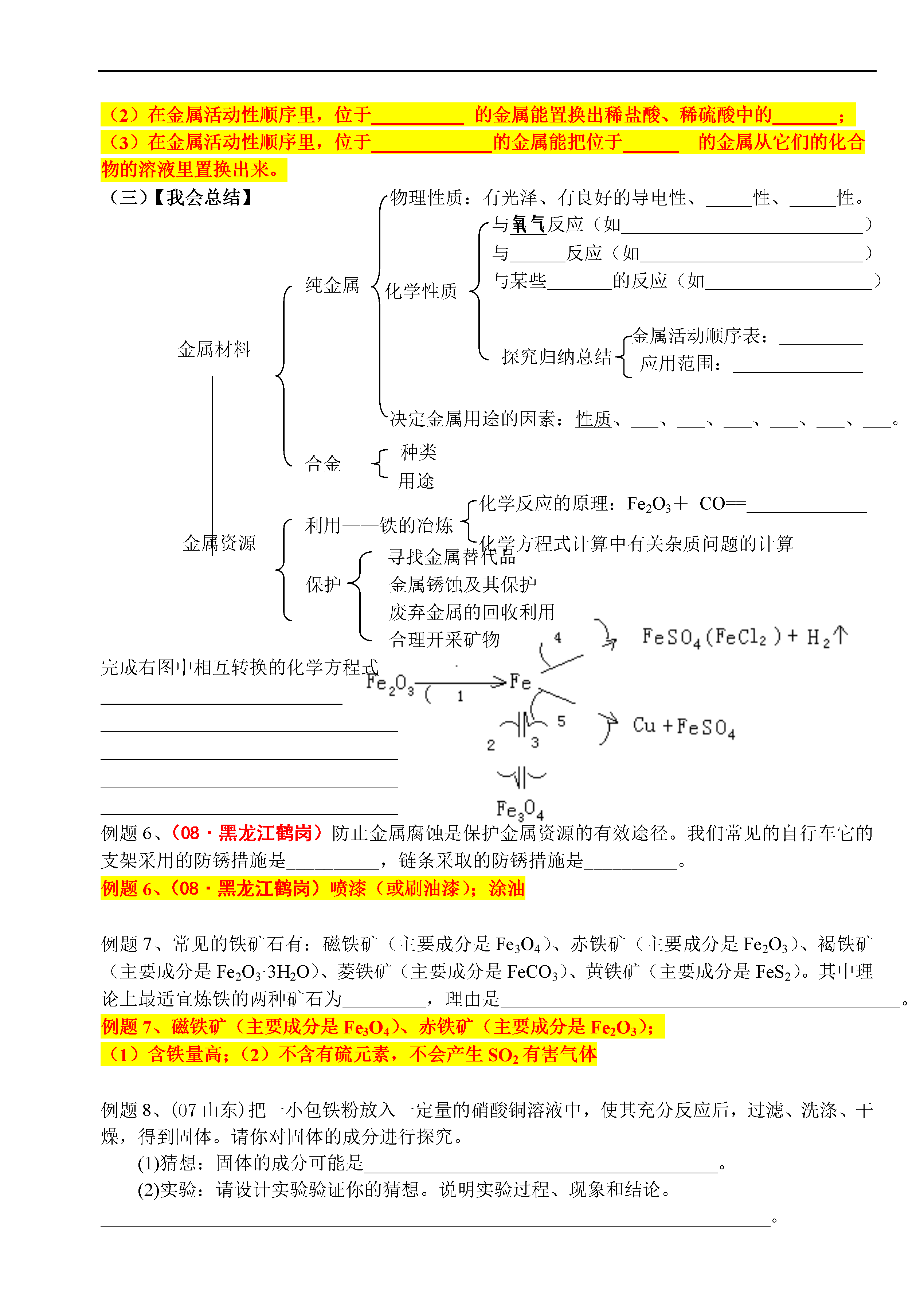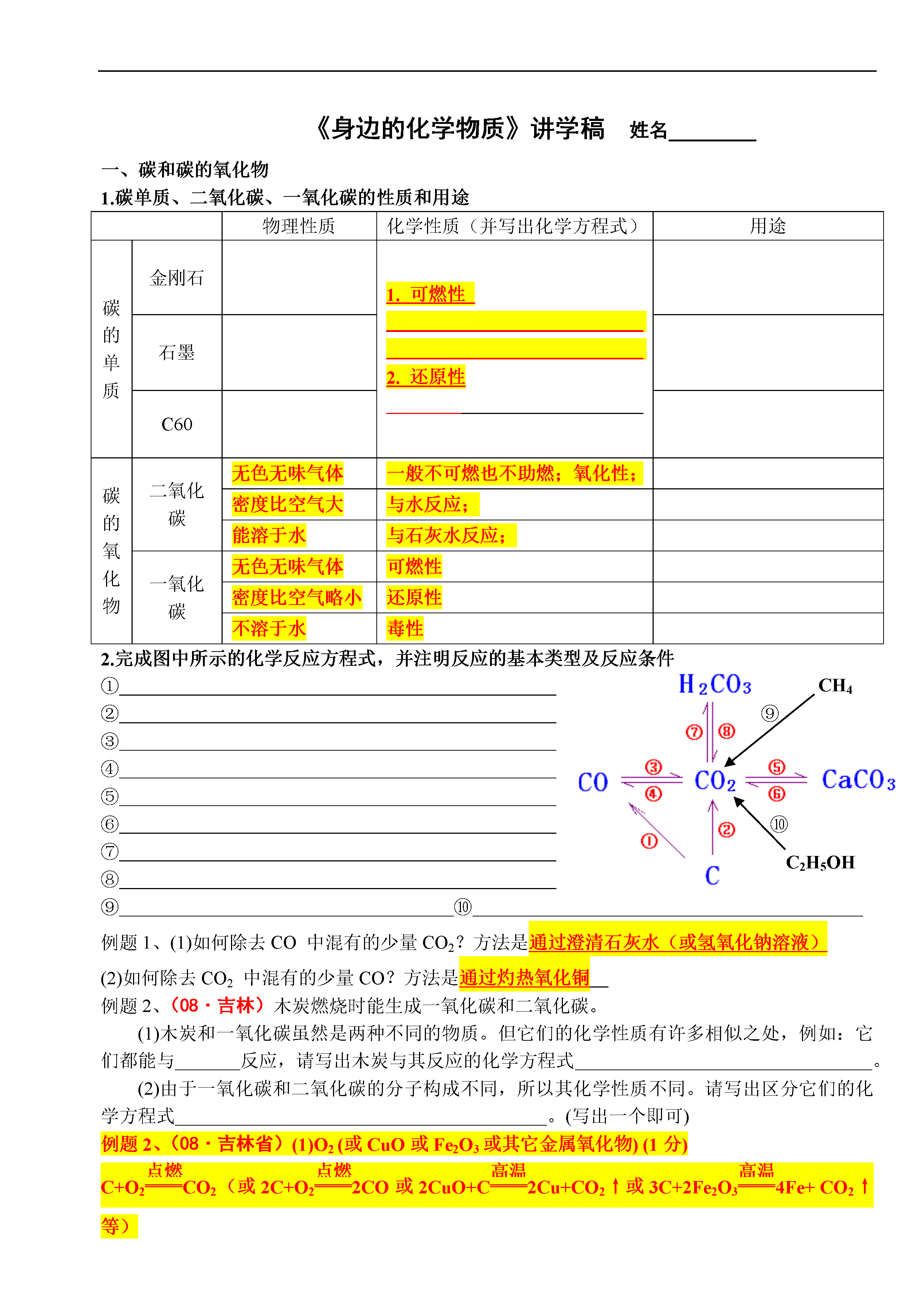 《身边的化学物质》讲学稿姓名一、碳和碳的氧化物1.碳单质、二氧化碳、一氧化碳的性质和用途物理性质化学性质(并写出化学方程式)用途碳的单质金刚石1.2.石墨C60碳的氧化物二氧化碳一氧化碳CH42.完成图中所示的化学反应方程式,并注明反应的基本类型及反应条件①②⑨③④⑤⑥⑩C2H5OH⑦⑧⑨CH4⑩例题1、(1)如何除去CO中混有的少量CO2?方法是(2)如何除去CO2中混有的少量CO?方法是例题2、(08·吉林)木炭燃烧时能生成一氧化碳和二氧化碳。(1)木炭和一氧化碳虽然是两种不同的物质。但它们的化学性质有许多相似之处,例如:它们都能与反应,请写出木炭与其反应的化学方程式。+624(2)由于一氧化碳和二氧化碳的分子构成不同,所以其化学性质不同。请写出区分它们的化学方程式。(写出一个即可)例题3、(08·湖北宜昌)碳与碳的化合物在工农业生产及日常生活中有广泛的用途。(1)右图是碳原子结构示意图,碳原子的质子数是,碳元素在元素周期表中位于第周期。(2)古代用墨书写或绘制的字画虽年久仍不变色,原因是墨中主要成分碳具有性。C+CuO澄清的石灰水右图是木炭还原氧化铜的实验,大试管中的反应体现了碳的还原性,其反应的化学方程式是,单质碳的还原性可以用于冶金工业。(3)二氧化碳能参与光合作用完成大气中的“碳循环”,但是大气中二氧化碳的含量不断上升,会使全球变暖,从而导致。蔬菜大棚用作气肥的二氧化碳,可用多种方法制得,例如可以用稀硫酸与碳酸氢铵(NH4HCO3)反应制得,反应后生成硫酸铵、水和二氧化碳,这一反应的化学方程式是。(4)研究发现:物质的结构决定性质,物质的性质决定用途。如:一氧化碳也能还原氧化铜,也有还原性。从化学反应前后碳元素化合价的变化特点分析,一氧化碳和碳都具有还原性的原因是。例题4、(07重庆)右边是雪碧汽水标签中的部分内容。(1)小虎同学取适量雪碧汽水于试管中,稍稍加热后产生大量气泡,发生反应的化学方程式为(2)将雪碧汽水充分煮沸后滴人石蕊试液,溶液呈红色,使石蕊变红的物质是。例题5、下表列出了1cm3活性炭所能吸收的常见气体的体积。H2NO2CO2O2N2Cl2气体沸点/℃-252-33-78-183-196-34吸附气体体积/mL4.5178973511494试分析(1)活性炭为什么具有吸附性?(2)活性炭吸附气体的体积跟那些因素有关?(3)什么样的气体易被活性炭吸附?二、金属和金属材料(一)金属和非金属物理性质的比较:物理性质金属非金属状态常温下一般为固体常温下多为气体、有液体、固体密度光泽导热性导电性延展性金属和合金的区别是,合金的硬度和强度一般比组成它们的纯金属,能更好;多数合金的熔点组成它们的纯金属。(二)金属的化学性质(判断下列物质之间能否发生化学反应,能反应的写出化学方程式)反应现象化学方程式(或简述理由)镁和氧气(或空气)铝和氧气(或空气)铁和氧气(或空气)镁和盐酸(或稀硫酸)锌和盐酸(或稀硫酸)铁和盐酸(或稀硫酸)铜和盐酸(或稀硫酸)铝丝浸入硫酸铜溶液铁丝浸入硫酸铜溶液铜丝浸入硝酸银溶液铜丝浸入硫酸铝溶液(1)在金属活动性顺序里,金属的位置越靠前,它的活动性就越;(2)在金属活动性顺序里,位于的金属能置换出稀盐酸、稀硫酸中的;(3)在金属活动性顺序里,位于的金属能把位于的金属从它们的化合物的溶液里置换出来。(三)【我会总结】物理性质:有光泽、有良好的导电性、性、性。与氧气反应(如)纯金属与反应(如)化学性质与某些的反应(如)探究归纳总结金属材料金属活动顺序表:应用范围:决定金属用途的因素:性质、、、、、、。种类合金化学反应的原理:Fe2O3+CO==化学方程式计算中有关杂质问题的计算用途利用——铁的冶炼金属资源寻找金属替代品保护金属锈蚀及其保护废弃金属的回收利用合理开采矿物完成右图中相互转换的化学方程式例题6、(08·黑龙江鹤岗)防止金属腐蚀是保护金属资源的有效途径。我们常见的自行车它的支架采用的防锈措施是__________,链条采取的防锈措施是__________。例题7、常见的铁矿石有:磁铁矿(主要成分是Fe3O4)、赤铁矿(主要成分是Fe2O3)、褐铁矿(主要成分是Fe2O3·3H2O)、菱铁矿(主要成分是FeCO3)、黄铁矿(主要成分是FeS2)。其中理论上最适宜炼铁的两种矿石为,理由是。例题8、(07山东)把一小包铁粉放入一定量的硝酸铜溶液中,使其充分反应后,过滤、洗涤、干燥,得到固体。请你对固体的成分进行探究。(1)猜想:固体的成分可能是____________________________