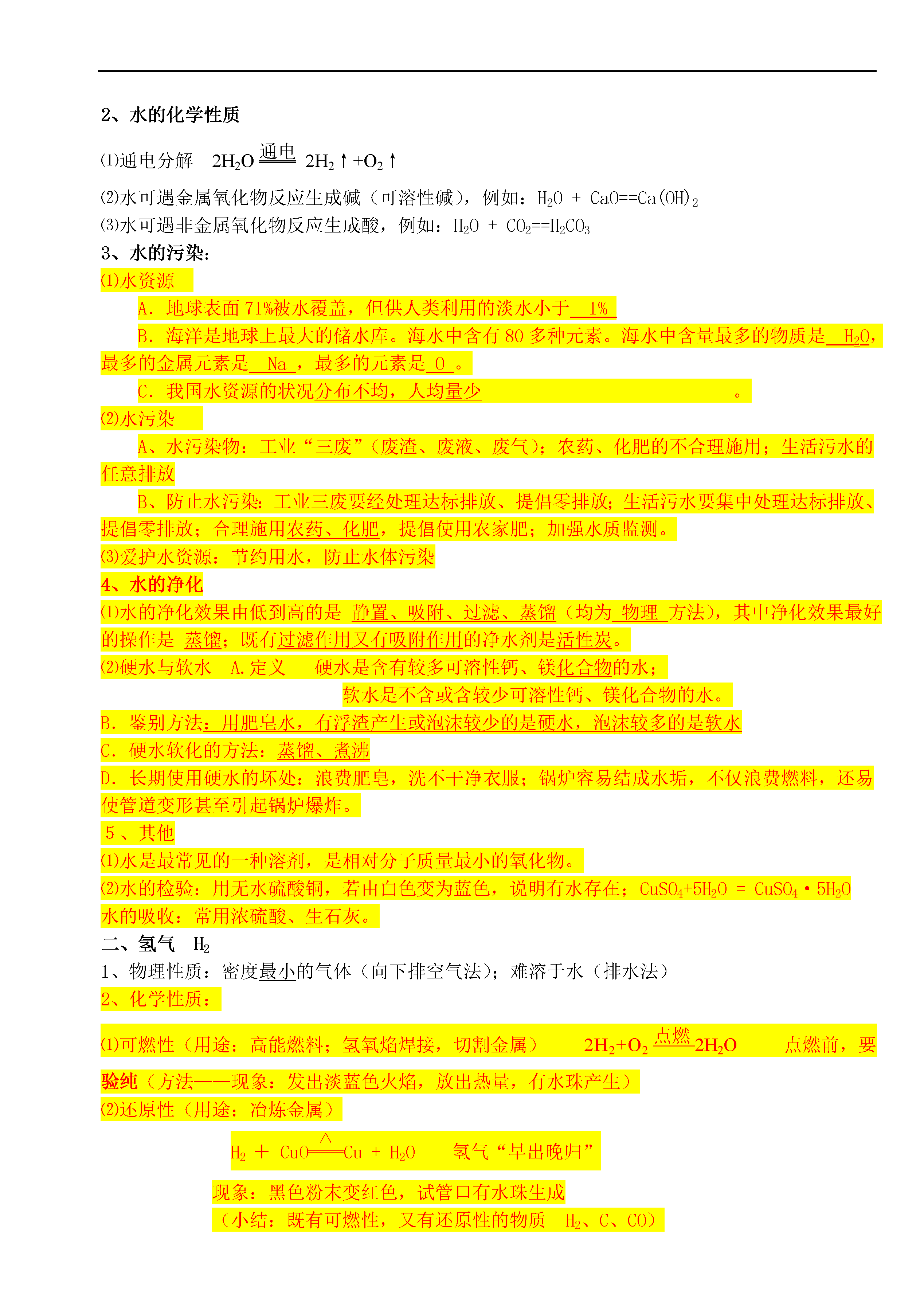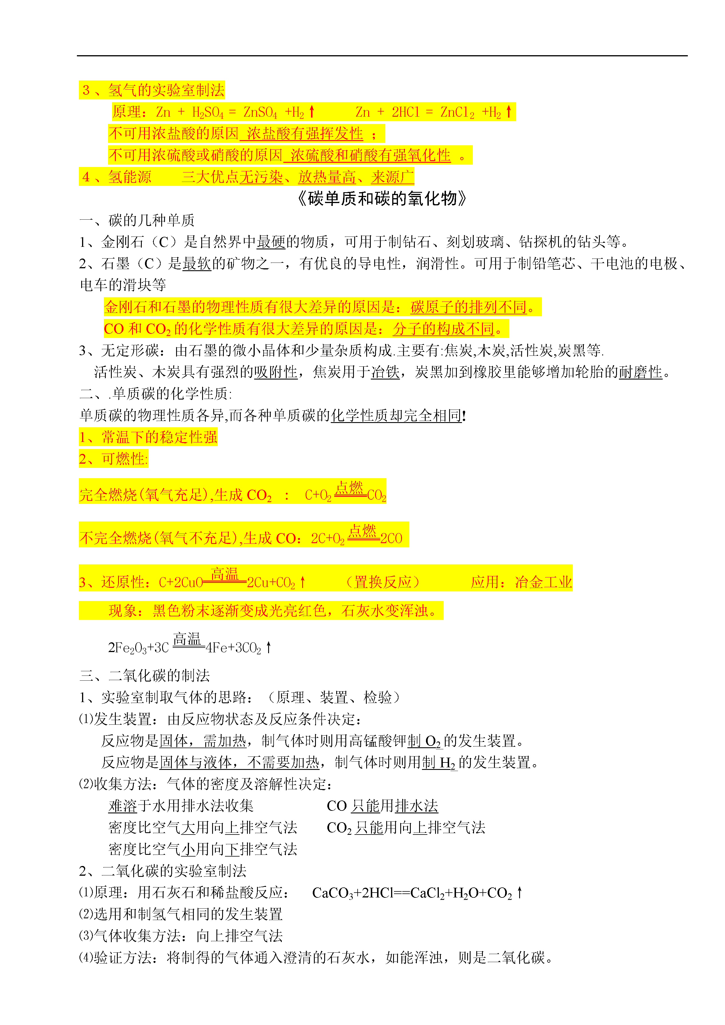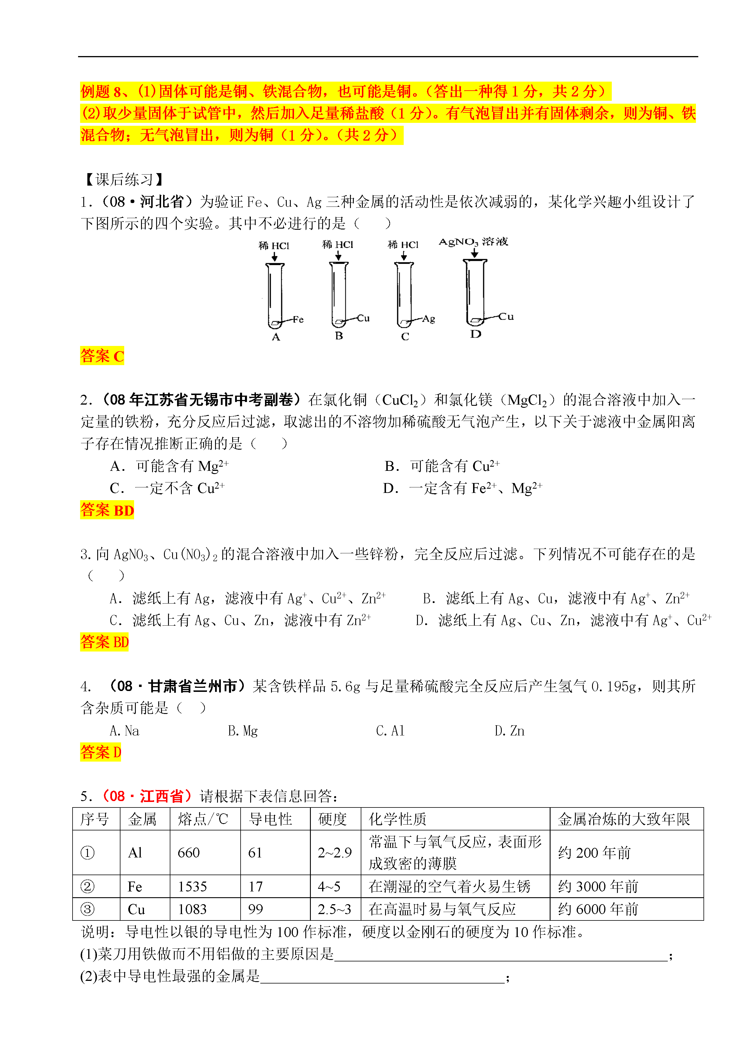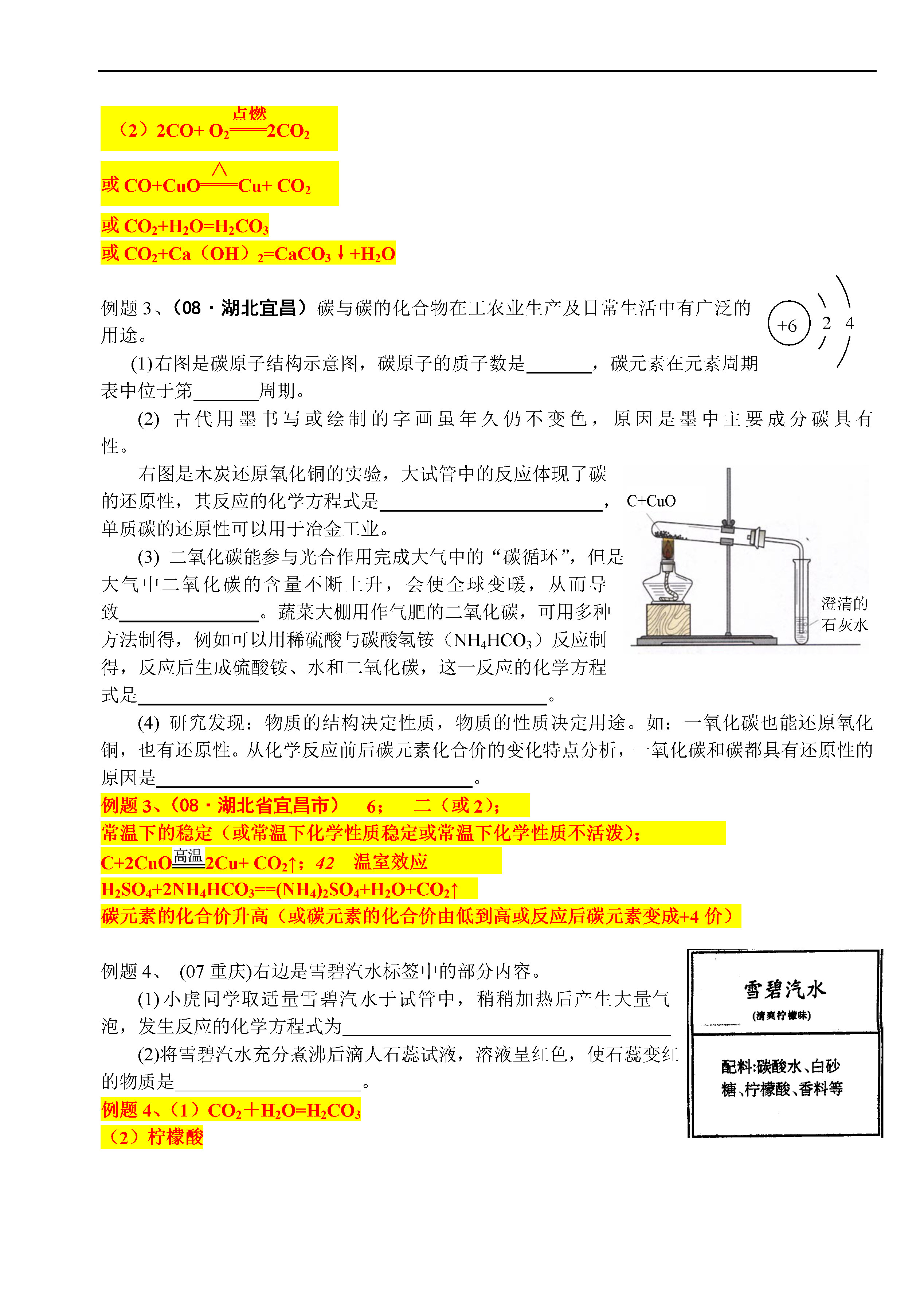 《身边的化学物质》讲学稿姓名一、碳和碳的氧化物1.碳单质、二氧化碳、一氧化碳的性质和用途物理性质化学性质(并写出化学方程式)用途碳的单质金刚石1.2.石墨C60碳的氧化物二氧化碳一氧化碳CH42.完成图中所示的化学反应方程式,并注明反应的基本类型及反应条件①②⑨③④⑤⑥⑩C2H5OH⑦⑧⑨CH4⑩例题1、(1)如何除去CO中混有的少量CO2?方法是(2)如何除去CO2中混有的少量CO?方法是例题2、(08·吉林)木炭燃烧时能生成一氧化碳和二氧化碳。(1)木炭和一氧化碳虽然是两种不同的物质。但它们的化学性质有许多相似之处,例如:它们都能与反应,请写出木炭与其反应的化学方程式。+624(2)由于一氧化碳和二氧化碳的分子构成不同,所以其化学性质不同。请写出区分它们的化学方程式。(写出一个即可)例题3、(08·湖北宜昌)碳与碳的化合物在工农业生产及日常生活中有广泛的用途。(1)右图是碳原子结构示意图,碳原子的质子数是,碳元素在元素周期表中位于第周期。(2)古代用墨书写或绘制的字画虽年久仍不变色,原因是墨中主要成分碳具有性。C+CuO澄清的石灰水右图是木炭还原氧化铜的实验,大试管中的反应体现了碳的还原性,其反应的化学方程式是,单质碳的还原性可以用于冶金工业。(3)二氧化碳能参与光合作用完成大气中的“碳循环”,但是大气中二氧化碳的含量不断上升,会使全球变暖,从而导致。蔬菜大棚用作气肥的二氧化碳,可用多种方法制得,例如可以用稀硫酸与碳酸氢铵(NH4HCO3)反应制得,反应后生成硫酸铵、水和二氧化碳,这一反应的化学方程式是。(4)研究发现:物质的结构决定性质,物质的性质决定用途。如:一氧化碳也能还原氧化铜,也有还原性。从化学反应前后碳元素化合价的变化特点分析,一氧化碳和碳都具有还原性的原因是。例题4、(07重庆)右边是雪碧汽水标签中的部分内容。(1)小虎同学取适量雪碧汽水于试管中,稍稍加热后产生大量气泡,发生反应的化学方程式为(2)将雪碧汽水充分煮沸后滴人石蕊试液,溶液呈红色,使石蕊变红的物质是。例题5、下表列出了1cm3活性炭所能吸收的常见气体的体积。H2NO2CO2O2N2Cl2气体沸点/℃-252-33-78-183-196-34吸附气体体积/mL4.5178973511494试分析(1)活性炭为什么具有吸附性?(2)活性炭吸附气体的体积跟那些因素有关?(3)什么样的气体易被活性炭吸附?二、金属和金属材料(一)金属和非金属物理性质的比较:物理性质金属非金属状态常温下一般为固体常温下多为气体、有液体、固体密度光泽导热性导电性延展性金属和合金的区别是,合金的硬度和强度一般比组成它们的纯金属,能更好;多数合金的熔点组成它们的纯金属。(二)金属的化学性质(判断下列物质之间能否发生化学反应,能反应的写出化学方程式)反应现象化学方程式(或简述理由)镁和氧气(或空气)铝和氧气(或空气)铁和氧气(或空气)镁和盐酸(或稀硫酸)锌和盐酸(或稀硫酸)铁和盐酸(或稀硫酸)铜和盐酸(或稀硫酸)铝丝浸入硫酸铜溶液铁丝浸入硫酸铜溶液铜丝浸入硝酸银溶液铜丝浸入硫酸铝溶液(1)在金属活动性顺序里,金属的位置越靠前,它的活动性就越;(2)在金属活动性顺序里,位于的金属能置换出稀盐酸、稀硫酸中的;(3)在金属活动性顺序里,位于的金属能把位于的金属从它们的化合物的溶液里置换出来。(三)【我会总结】物理性质:有光泽、有良好的导电性、性、性。与氧气反应(如)纯金属与反应(如)化学性质与某些的反应(如)探究归纳总结金属材料金属活动顺序表:应用范围:决定金属用途的因素:性质、、、、、、。种类合金化学反应的原理:Fe2O3+CO==化学方程式计算中有关杂质问题的计算用途利用——铁的冶炼金属资源寻找金属替代品保护金属锈蚀及其保护废弃金属的回收利用合理开采矿物完成右图中相互转换的化学方程式例题6、(08·黑龙江鹤岗)防止金属腐蚀是保护金属资源的有效途径。我们常见的自行车它的支架采用的防锈措施是__________,链条采取的防锈措施是__________。例题7、常见的铁矿石有:磁铁矿(主要成分是Fe3O4)、赤铁矿(主要成分是Fe2O3)、褐铁矿(主要成分是Fe2O3·3H2O)、菱铁矿(主要成分是FeCO3)、黄铁矿(主要成分是FeS2)。其中理论上最适宜炼铁的两种矿石为,理由是。例题8、(07山东)把一小包铁粉放入一定量的硝酸铜溶液中,使其充分反应后,过滤、洗涤、干燥,得到固体。请你对固体的成分进行探究。(1)猜想:固体的成分可能是____________________________