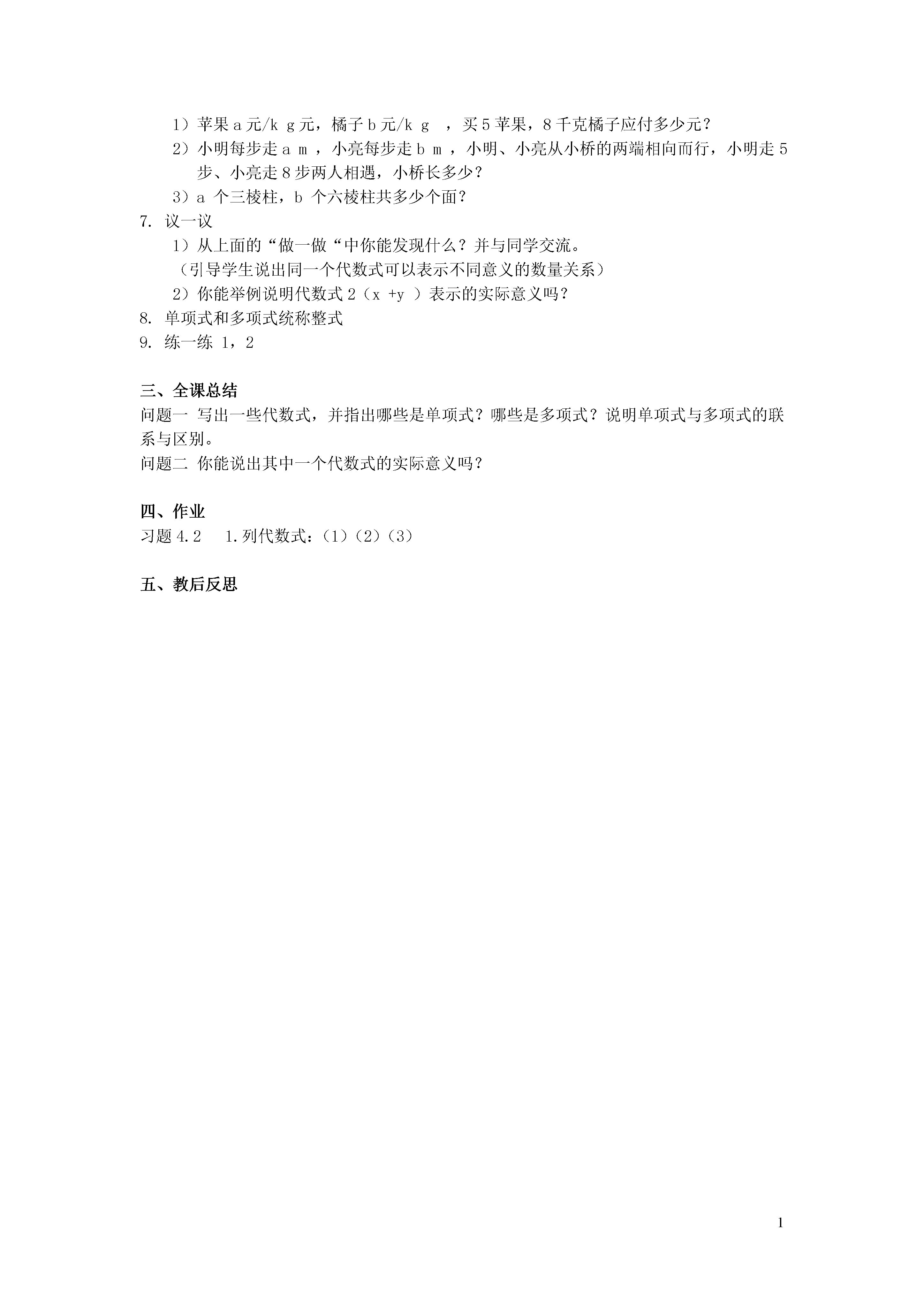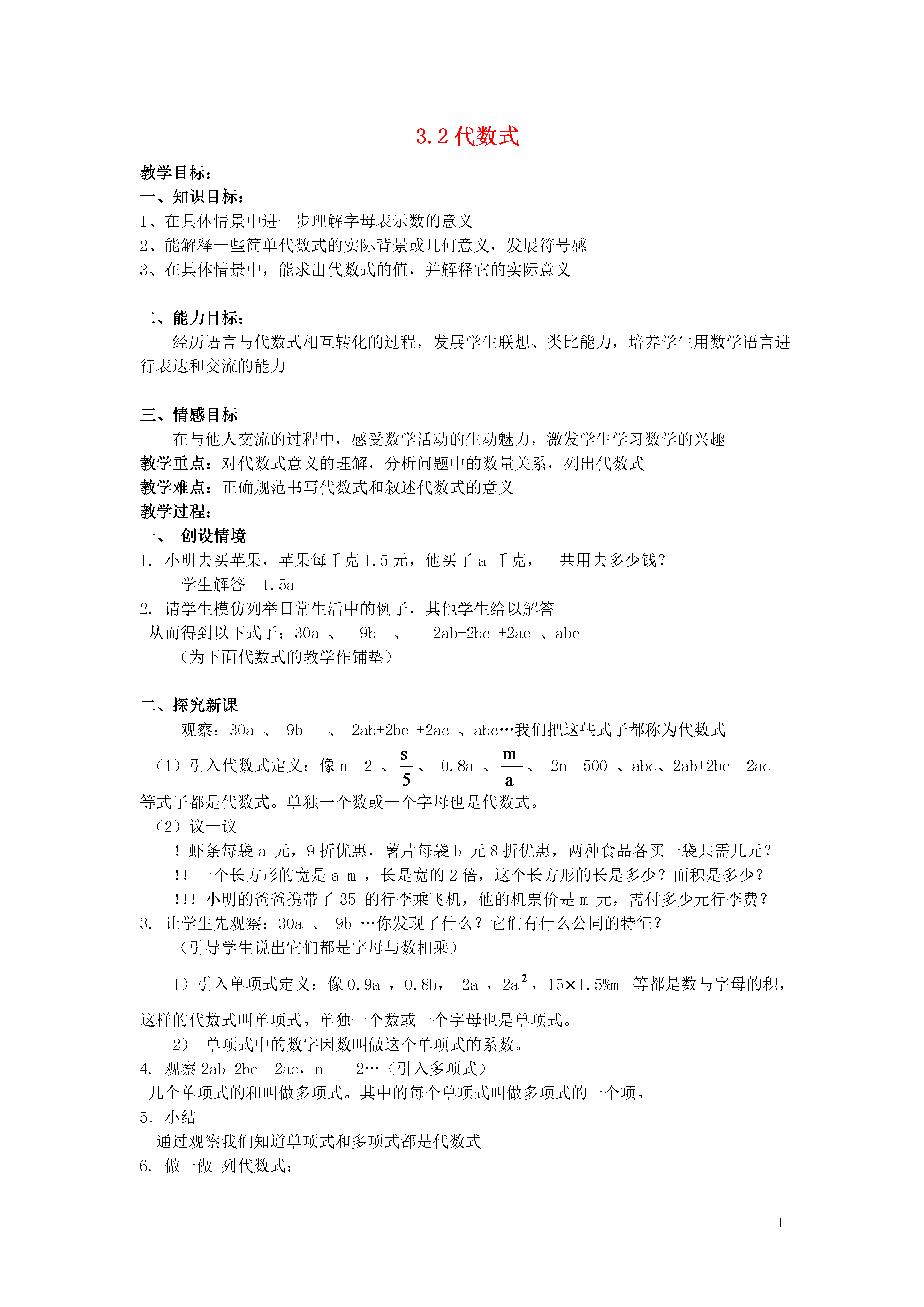 13.2代数式教学目标:一、知识目标:1、在具体情景中进一步理解字母表示数的意义2、能解释一些简单代数式的实际背景或几何意义,发展符号感3、在具体情景中,能求出代数式的值,并解释它的实际意义二、能力目标:经历语言与代数式相互转化的过程,发展学生联想、类比能力,培养学生用数学语言进行表达和交流的能力三、情感目标在与他人交流的过程中,感受数学活动的生动魅力,激发学生学习数学的兴趣教学重点:对代数式意义的理解,分析问题中的数量关系,列出代数式教学难点:正确规范书写代数式和叙述代数式的意义教学过程:一、创设情境1.小明去买苹果,苹果每千克1.5元,他买了a千克,一共用去多少钱?学生解答1.5a2.请学生模仿列举日常生活中的例子,其他学生给以解答从而得到以下式子:30a、9b、2ab+2bc+2ac、abc(为下面代数式的教学作铺垫)二、探究新课观察:30a、9b、2ab+2bc+2ac、abc…我们把这些式子都称为代数式(1)引入代数式定义:像n-2、、0.8a、、2n+500、abc、2ab+2bc+2ac等式子都是代数式。单独一个数或一个字母也是代数式。(2)议一议!虾条每袋a元,9折优惠,薯片每袋b元8折优惠,两种食品各买一袋共需几元?!!一个长方形的宽是am,长是宽的2倍,这个长方形的长是多少?面积是多少?!!!小明的爸爸携带了35的行李乘飞机,他的机票价是m元,需付多少元行李费?3.让学生先观察:30a、9b…你发现了什么?它们有什么公同的特征?(引导学生说出它们都是字母与数相乘)1)引入单项式定义:像0.9a,0.8b,2a,2a,151.5%m等都是数与字母的积,这样的代数式叫单项式。单独一个数或一个字母也是单项式。2)单项式中的数字因数叫做这个单项式的系数。4.观察2ab+2bc+2ac,n–2…(引入多项式)几个单项式的和叫做多项式。其中的每个单项式叫做多项式的一个项。5.小结通过观察我们知道单项式和多项式都是代数式6.做一做列代数式:1)苹果a元/kg元,橘子b元/kg,买5苹果,8千克橘子应付多少元?2)小明每步走am,小亮每步走bm,小明、小亮从小桥的两端相向而行,小明走5步、小亮走8步两人相遇,小桥长多少?3)a个三棱柱,b个六棱柱共多少个面?7.议一议1)从上面的“做一做“中你能发现什么?并与同学交流。(引导学生说出同一个代数式可以表示不同意义的数量关系)2)你能举例说明代数式2(x+y)表示的实际意义吗?8.单项式和多项式统称整式9.练一练1,2三、全课总结问题一写出一些代数式,并指出哪些是单项式?哪些是多项式?说明单项式与多项式的联系与区别。问题二你能说出其中一个代数式的实际意义吗?四、作业习题4.21.列代数式:(1)(2)(3)五、教后反思