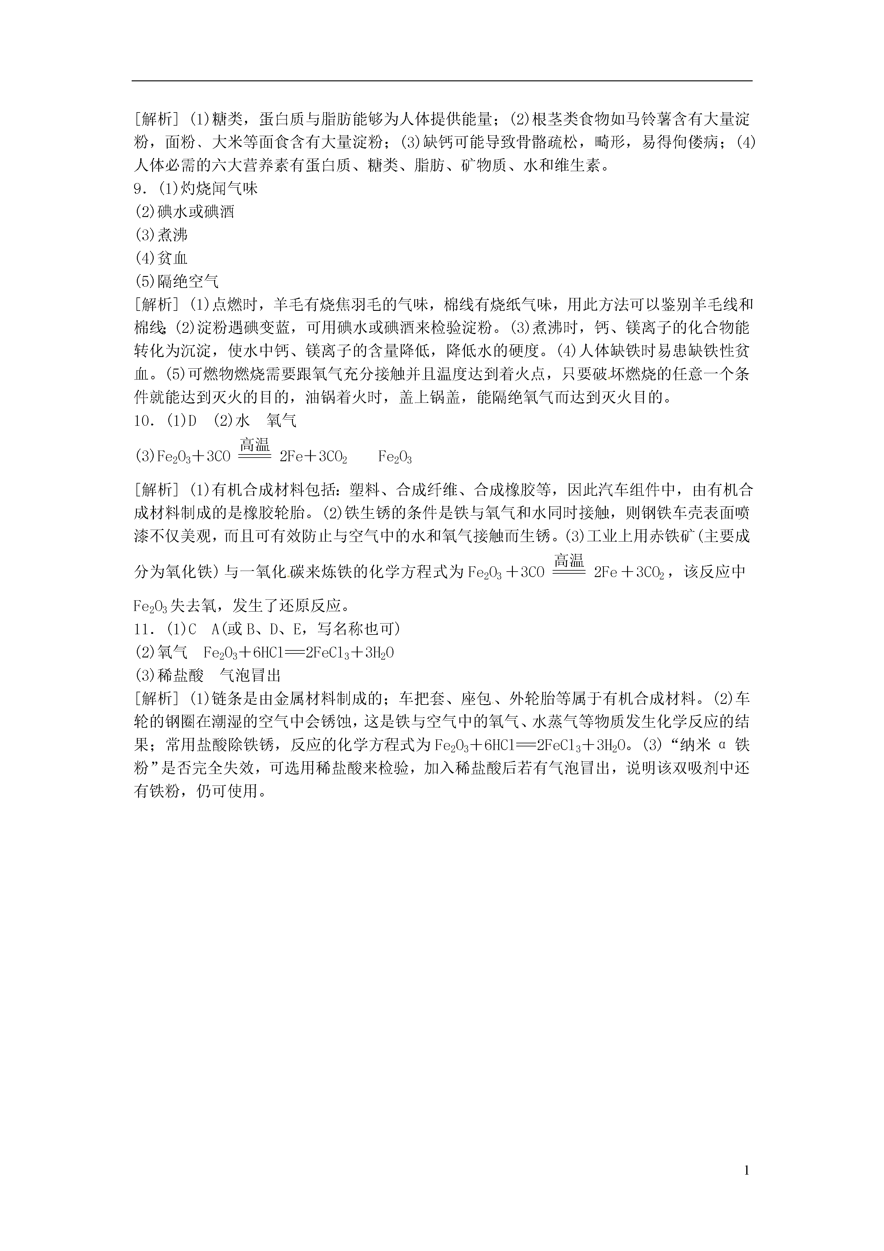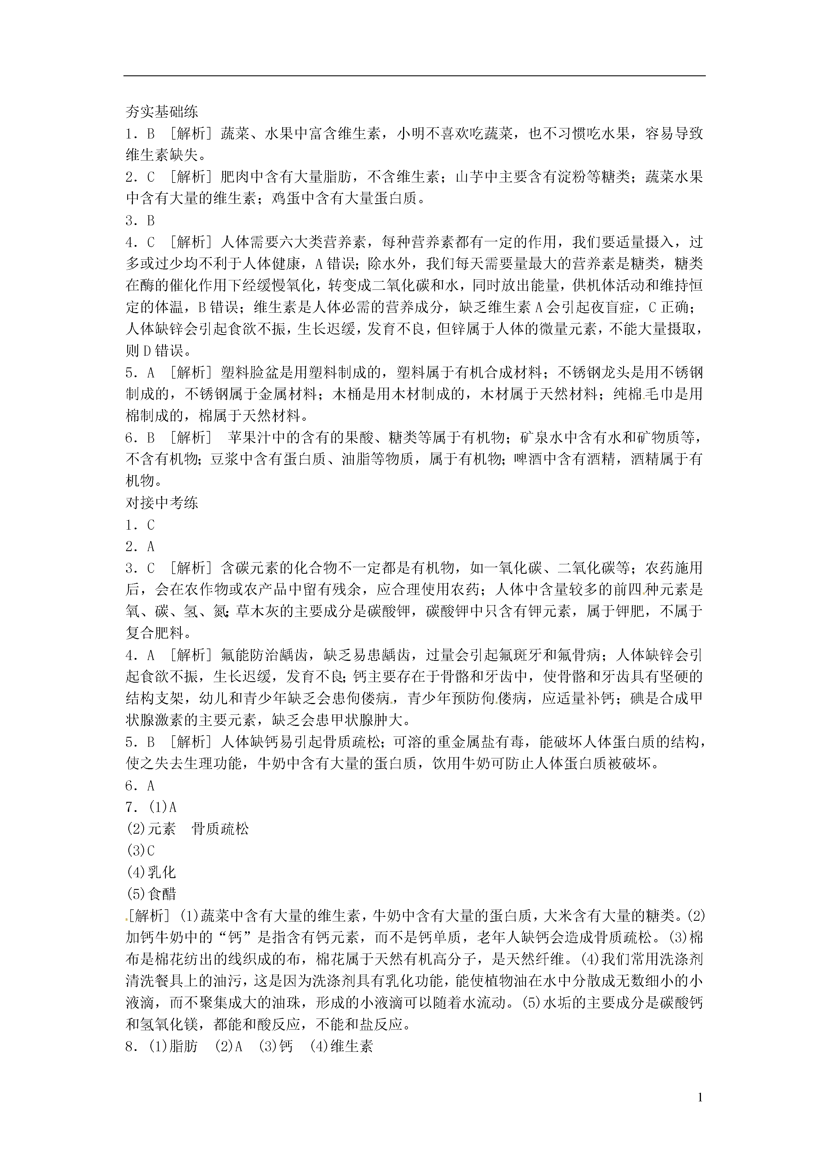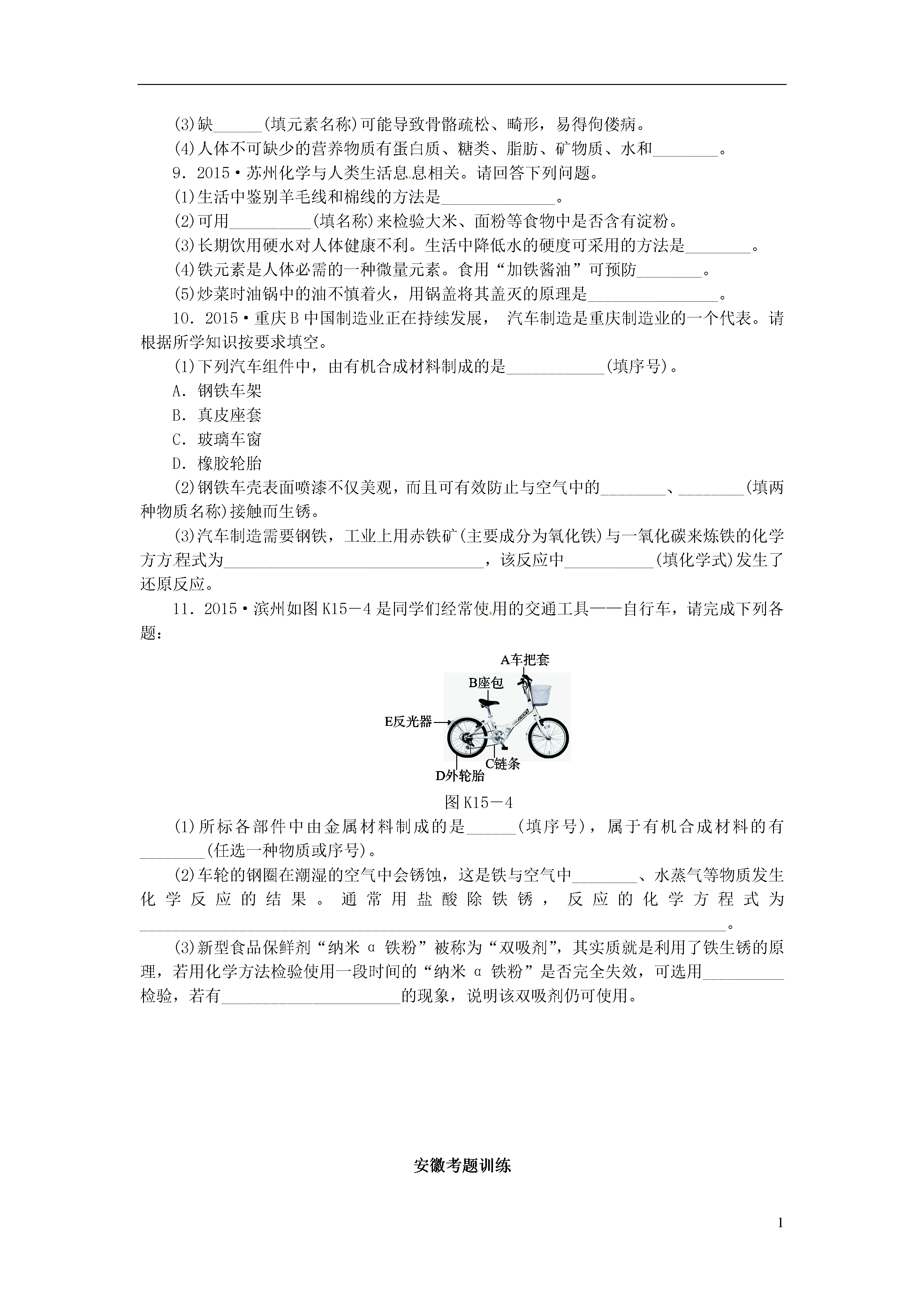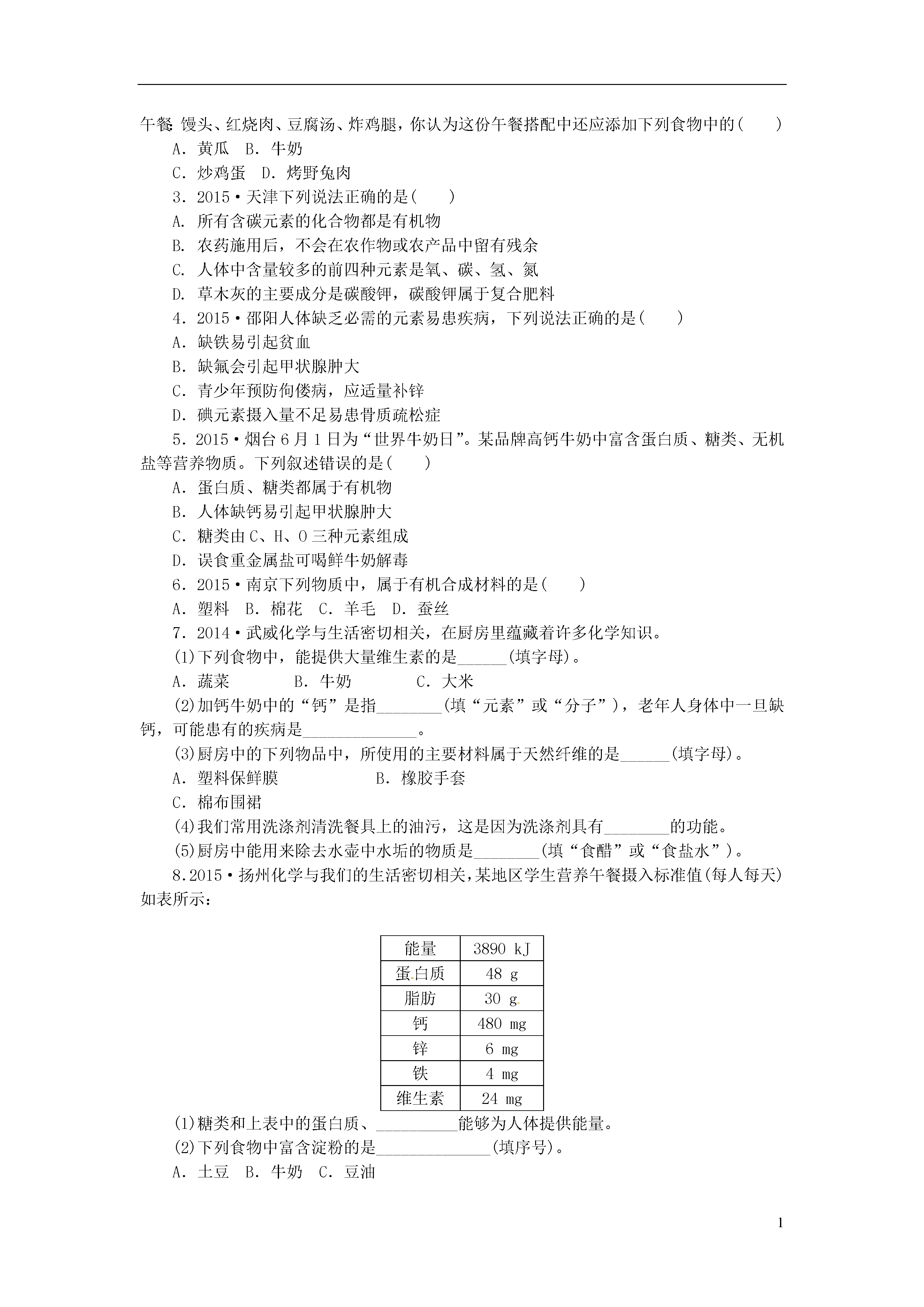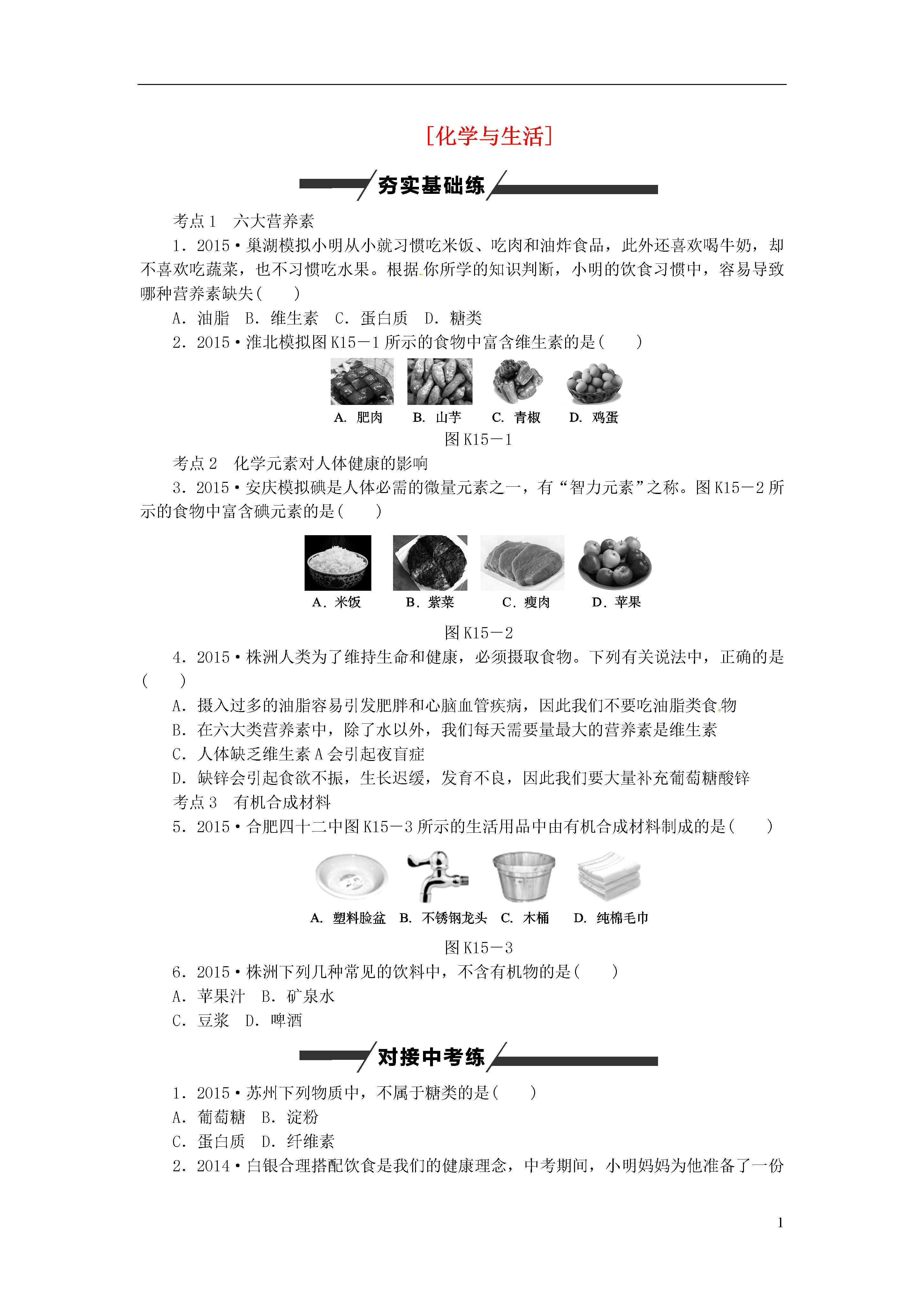 1[化学与生活]考点1六大营养素1.2015·巢湖模拟小明从小就习惯吃米饭、吃肉和油炸食品,此外还喜欢喝牛奶,却不喜欢吃蔬菜,也不习惯吃水果。根据你所学的知识判断,小明的饮食习惯中,容易导致哪种营养素缺失()A.油脂B.维生素C.蛋白质D.糖类2.2015·淮北模拟图K15-1所示的食物中富含维生素的是()图K15-1考点2化学元素对人体健康的影响3.2015·安庆模拟碘是人体必需的微量元素之一,有“智力元素”之称。图K15-2所示的食物中富含碘元素的是()图K15-24.2015·株洲人类为了维持生命和健康,必须摄取食物。下列有关说法中,正确的是()A.摄入过多的油脂容易引发肥胖和心脑血管疾病,因此我们不要吃油脂类食物B.在六大类营养素中,除了水以外,我们每天需要量最大的营养素是维生素C.人体缺乏维生素A会引起夜盲症D.缺锌会引起食欲不振,生长迟缓,发育不良,因此我们要大量补充葡萄糖酸锌考点3有机合成材料5.2015·合肥四十二中图K15-3所示的生活用品中由有机合成材料制成的是()图K15-36.2015·株洲下列几种常见的饮料中,不含有机物的是()A.苹果汁B.矿泉水C.豆浆D.啤酒1.2015·苏州下列物质中,不属于糖类的是()A.葡萄糖B.淀粉C.蛋白质D.纤维素2.2014·白银合理搭配饮食是我们的健康理念,中考期间,小明妈妈为他准备了一份午餐:馒头、红烧肉、豆腐汤、炸鸡腿,你认为这份午餐搭配中还应添加下列食物中的()A.黄瓜B.牛奶C.炒鸡蛋D.烤野兔肉3.2015·天津下列说法正确的是()A.所有含碳元素的化合物都是有机物B.农药施用后,不会在农作物或农产品中留有残余C.人体中含量较多的前四种元素是氧、碳、氢、氮D.草木灰的主要成分是碳酸钾,碳酸钾属于复合肥料4.2015·邵阳人体缺乏必需的元素易患疾病,下列说法正确的是()A.缺铁易引起贫血B.缺氟会引起甲状腺肿大C.青少年预防佝偻病,应适量补锌D.碘元素摄入量不足易患骨质疏松症5.2015·烟台6月1日为“世界牛奶日”。某品牌高钙牛奶中富含蛋白质、糖类、无机盐等营养物质。下列叙述错误的是()A.蛋白质、糖类都属于有机物B.人体缺钙易引起甲状腺肿大C.糖类由C、H、O三种元素组成D.误食重金属盐可喝鲜牛奶解毒6.2015·南京下列物质中,属于有机合成材料的是()A.塑料B.棉花C.羊毛D.蚕丝7.2014·武威化学与生活密切相关,在厨房里蕴藏着许多化学知识。(1)下列食物中,能提供大量维生素的是______(填字母)。A.蔬菜B.牛奶C.大米(2)加钙牛奶中的“钙”是指________(填“元素”或“分子”),老年人身体中一旦缺钙,可能患有的疾病是______________。(3)厨房中的下列物品中,所使用的主要材料属于天然纤维的是______(填字母)。A.塑料保鲜膜B.橡胶手套C.棉布围裙(4)我们常用洗涤剂清洗餐具上的油污,这是因为洗涤剂具有________的功能。(5)厨房中能用来除去水壶中水垢的物质是________(填“食醋”或“食盐水”)。8.2015·扬州化学与我们的生活密切相关,某地区学生营养午餐摄入标准值(每人每天)如表所示:能量3890kJ蛋白质48g脂肪30g钙480mg锌6mg铁4mg维生素24mg(1)糖类和上表中的蛋白质、__________能够为人体提供能量。(2)下列食物中富含淀粉的是______________(填序号)。A.土豆B.牛奶C.豆油(3)缺______(填元素名称)可能导致骨骼疏松、畸形,易得佝偻病。(4)人体不可缺少的营养物质有蛋白质、糖类、脂肪、矿物质、水和________。9.2015·苏州化学与人类生活息息相关。请回答下列问题。(1)生活中鉴别羊毛线和棉线的方法是______________。(2)可用__________(填名称)来检验大米、面粉等食物中是否含有淀粉。(3)长期饮用硬水对人体健康不利。生活中降低水的硬度可采用的方法是________。(4)铁元素是人体必需的一种微量元素。食用“加铁酱油”可预防________。(5)炒菜时油锅中的油不慎着火,用锅盖将其盖灭的原理是________________。10.2015·重庆B中国制造业正在持续发展,汽车制造是重庆制造业的一个代表。请根据所学知识按要求填空。(1)下列汽车组件中,由有机合成材料制成的是____________(填序号)。A.钢铁车架B.真皮座套C.玻璃车窗D.橡胶轮胎(2)钢铁车壳表面喷漆不仅美观,而且可有效防止与空气中的________、________(填两