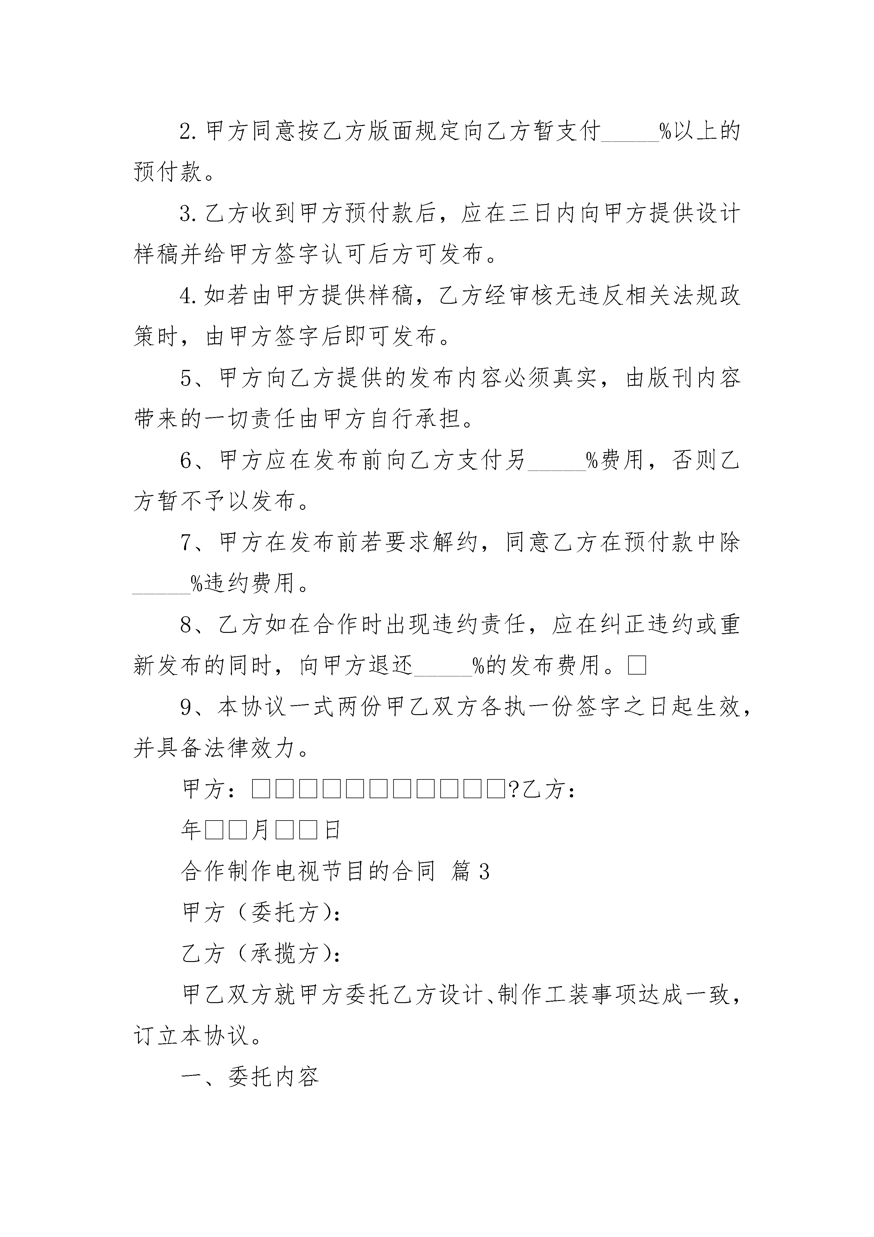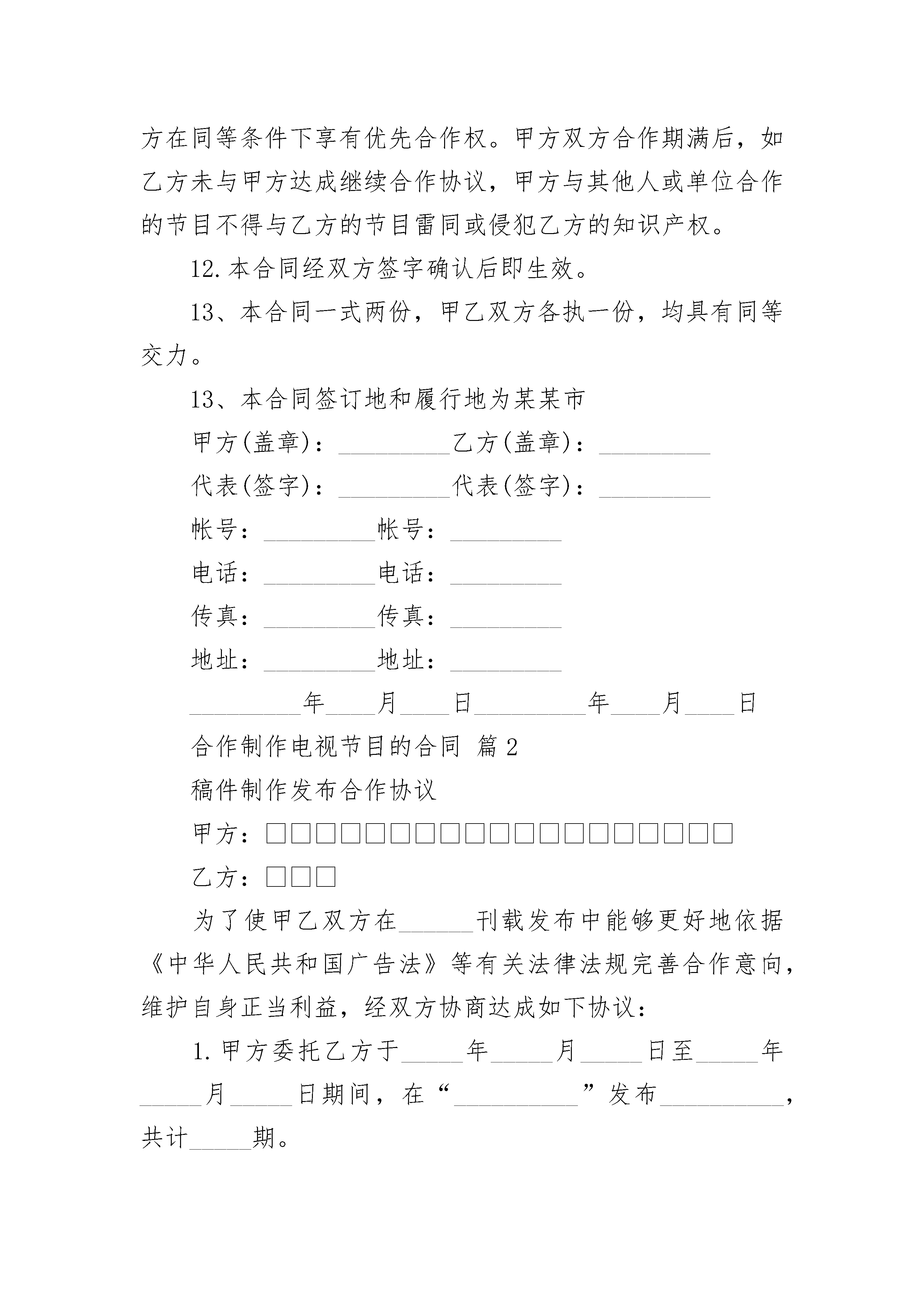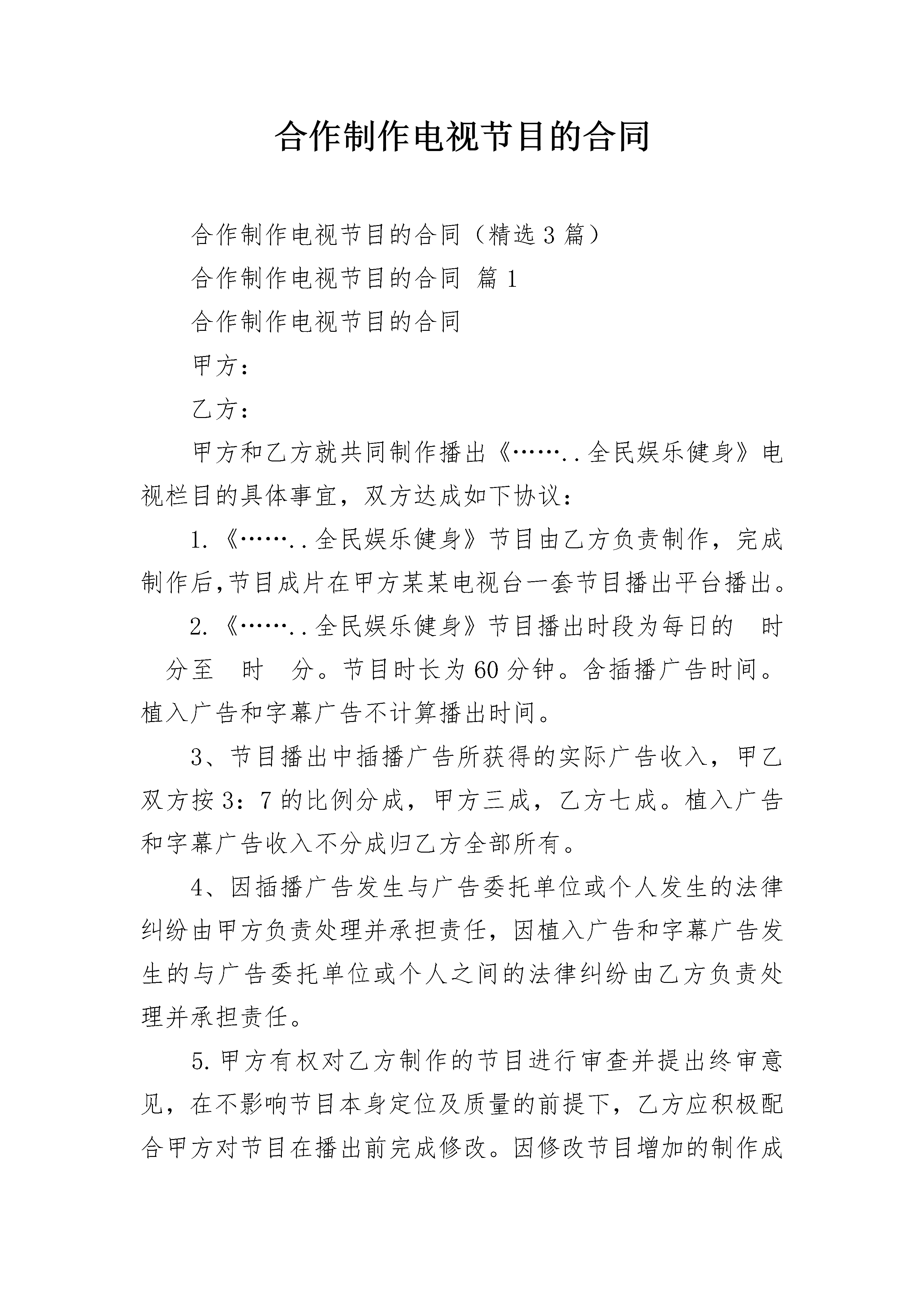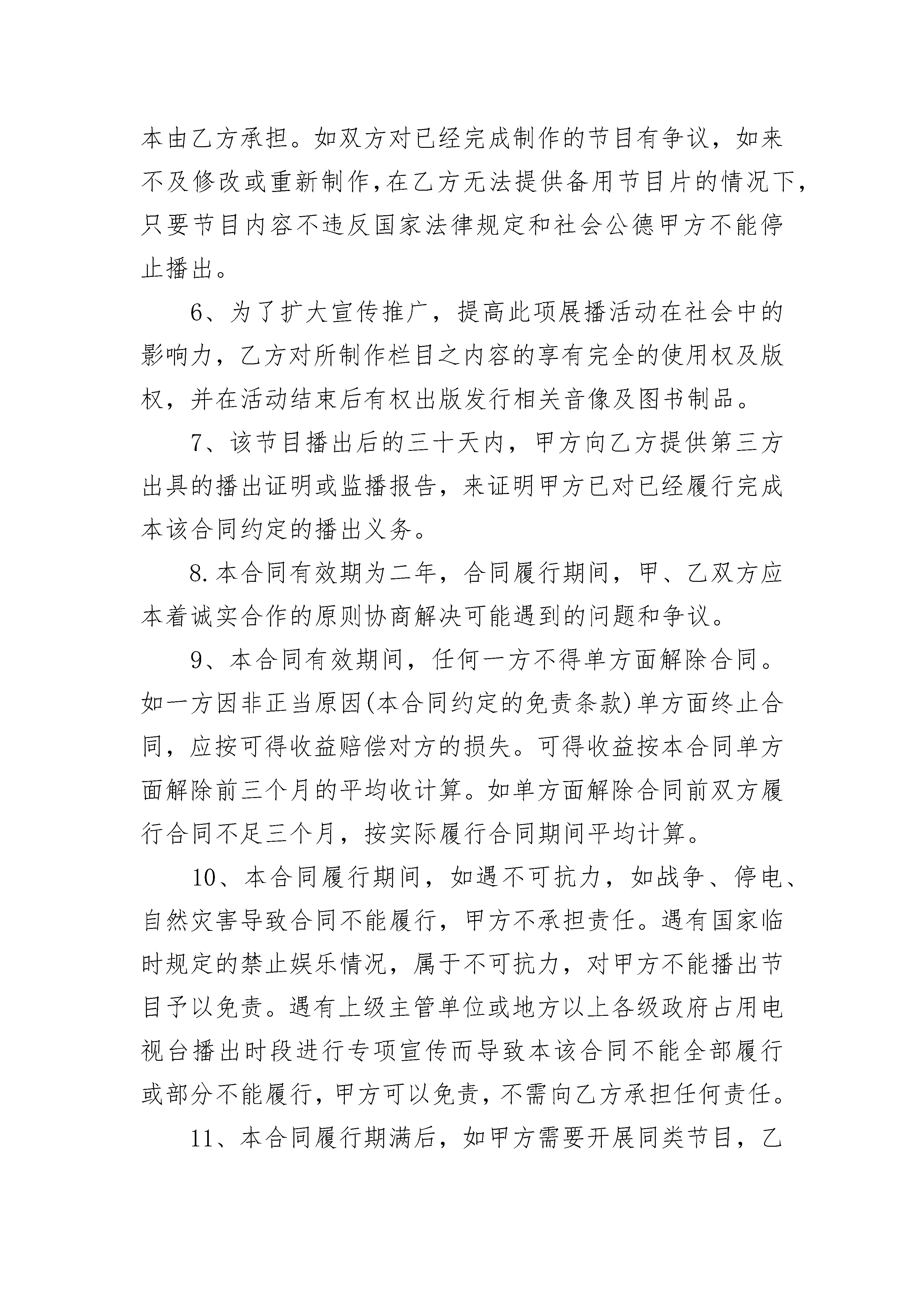 合作制作电视节目的合同合作制作电视节目的合同(精选3篇)合作制作电视节目的合同篇1合作制作电视节目的合同甲方:乙方:甲方和乙方就共同制作播出《……..全民娱乐健身》电视栏目的具体事宜,双方达成如下协议:1.《……..全民娱乐健身》节目由乙方负责制作,完成制作后,节目成片在甲方某某电视台一套节目播出平台播出。2.《……..全民娱乐健身》节目播出时段为每日的时分至时分。节目时长为60分钟。含插播广告时间。植入广告和字幕广告不计算播出时间。3、节目播出中插播广告所获得的实际广告收入,甲乙双方按3:7的比例分成,甲方三成,乙方七成。植入广告和字幕广告收入不分成归乙方全部所有。4、因插播广告发生与广告委托单位或个人发生的法律纠纷由甲方负责处理并承担责任,因植入广告和字幕广告发生的与广告委托单位或个人之间的法律纠纷由乙方负责处理并承担责任。5.甲方有权对乙方制作的节目进行审查并提出终审意见,在不影响节目本身定位及质量的前提下,乙方应积极配合甲方对节目在播出前完成修改。因修改节目增加的制作成本由乙方承担。如双方对已经完成制作的节目有争议,如来不及修改或重新制作,在乙方无法提供备用节目片的情况下,只要节目内容不违反国家法律规定和社会公德甲方不能停止播出。6、为了扩大宣传推广,提高此项展播活动在社会中的影响力,乙方对所制作栏目之内容的享有完全的使用权及版权,并在活动结束后有权出版发行相关音像及图书制品。7、该节目播出后的三十天内,甲方向乙方提供第三方出具的播出证明或监播报告,来证明甲方已对已经履行完成本该合同约定的播出义务。8.本合同有效期为二年,合同履行期间,甲、乙双方应本着诚实合作的原则协商解决可能遇到的问题和争议。9、本合同有效期间,任何一方不得单方面解除合同。如一方因非正当原因(本合同约定的免责条款)单方面终止合同,应按可得收益赔偿对方的损失。可得收益按本合同单方面解除前三个月的平均收计算。如单方面解除合同前双方履行合同不足三个月,按实际履行合同期间平均计算。10、本合同履行期间,如遇不可抗力,如战争、停电、自然灾害导致合同不能履行,甲方不承担责任。遇有国家临时规定的禁止娱乐情况,属于不可抗力,对甲方不能播出节目予以免责。遇有上级主管单位或地方以上各级政府占用电视台播出时段进行专项宣传而导致本该合同不能全部履行或部分不能履行,甲方可以免责,不需向乙方承担任何责任。11、本合同履行期满后,如甲方需要开展同类节目,乙方在同等条件下享有优先合作权。甲方双方合作期满后,如乙方未与甲方达成继续合作协议,甲方与其他人或单位合作的节目不得与乙方的节目雷同或侵犯乙方的知识产权。12.本合同经双方签字确认后即生效。13、本合同一式两份,甲乙双方各执一份,均具有同等交力。13、本合同签订地和履行地为某某市甲方(盖章):_________乙方(盖章):_________代表(签字):_________代表(签字):_________帐号:_________帐号:_________电话:_________电话:_________传真:_________传真:_________地址:_________地址:__________________年____月____日_________年____月____日合作制作电视节目的合同篇2稿件制作发布合作协议甲方:乙方:为了使甲乙双方在______刊载发布中能够更好地依据《中华人民共和国广告法》等有关法律法规完善合作意向,维护自身正当利益,经双方协商达成如下协议:1.甲方委托乙方于_____年_____月_____日至_____年_____月_____日期间,在“__________”发布__________,共计_____期。2.甲方同意按乙方版面规定向乙方暂支付_____%以上的预付款。3.乙方收到甲方预付款后,应在三日内向甲方提供设计样稿并给甲方签字认可后方可发布。4.如若由甲方提供样稿,乙方经审核无违反相关法规政策时,由甲方签字后即可发布。5、甲方向乙方提供的发布内容必须真实,由版刊内容带来的一切责任由甲方自行承担。6、甲方应在发布前向乙方支付另_____%费用,否则乙方暂不予以发布。7、甲方在发布前若要求解约,同意乙方在预付款中除_____%违约费用。8、乙方如在合作时出现违约责任,应在纠正违约或重新发布的同时,向甲方退还_____%的发布费用。9、本协议一式两份甲乙双方各执一份签字之日起生效,并具备法律效力。甲方:?乙方:年月日合作制作电视节目的合同篇3甲方(委托方):乙方(承揽方):甲乙双方就甲方委托乙方设计、制作工装事项达成一致,订立本协议。一、委托内容1、甲方委托乙方设计、加工和制作指定服装,作为甲方人员工作服装,详
