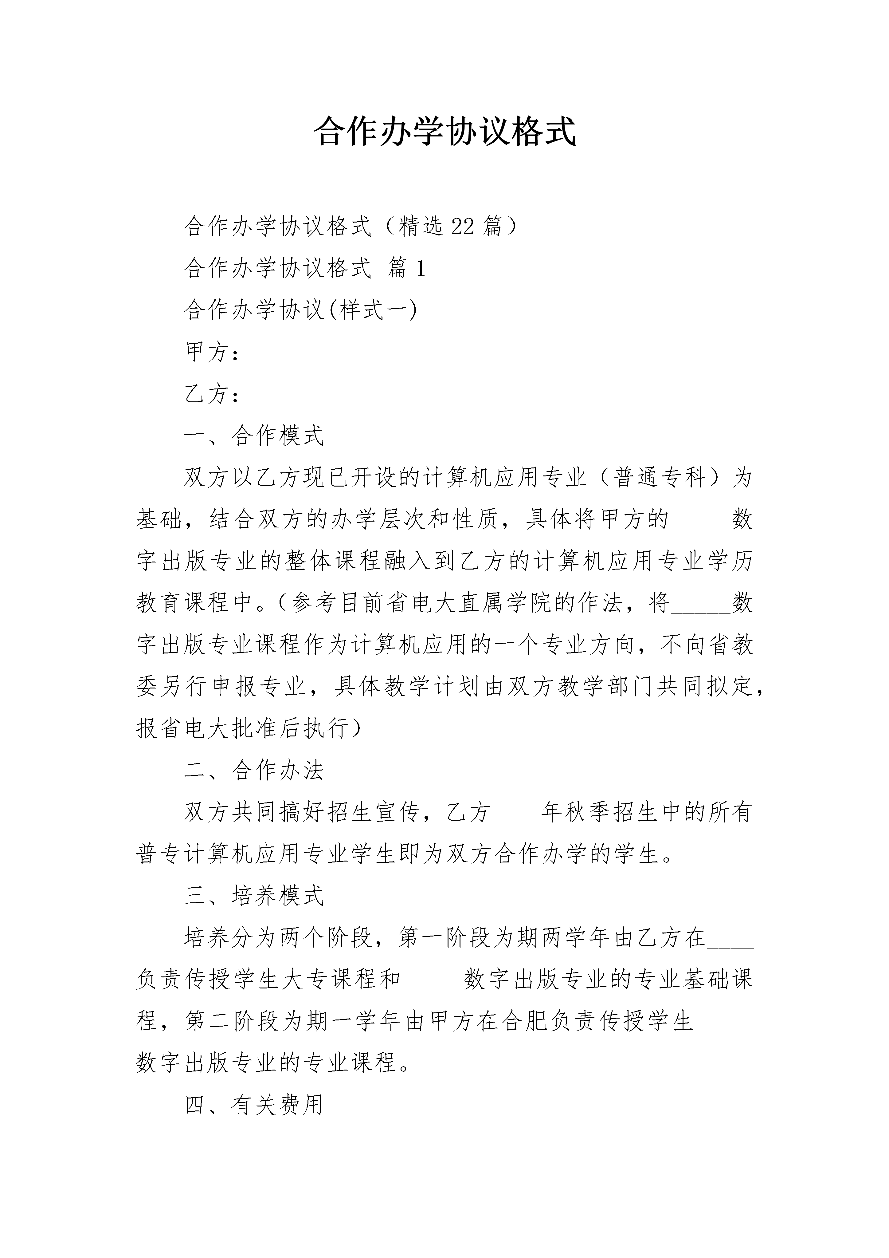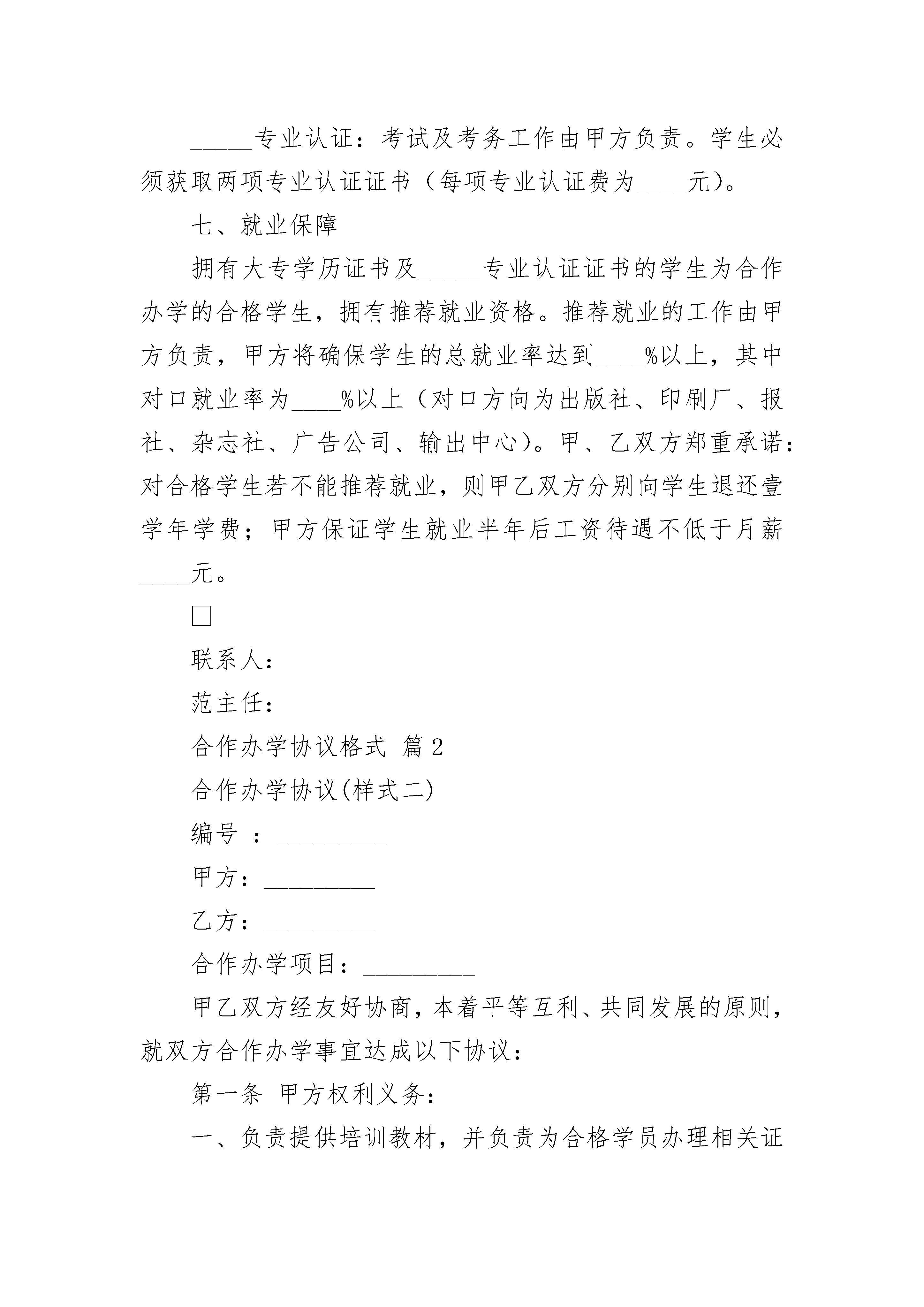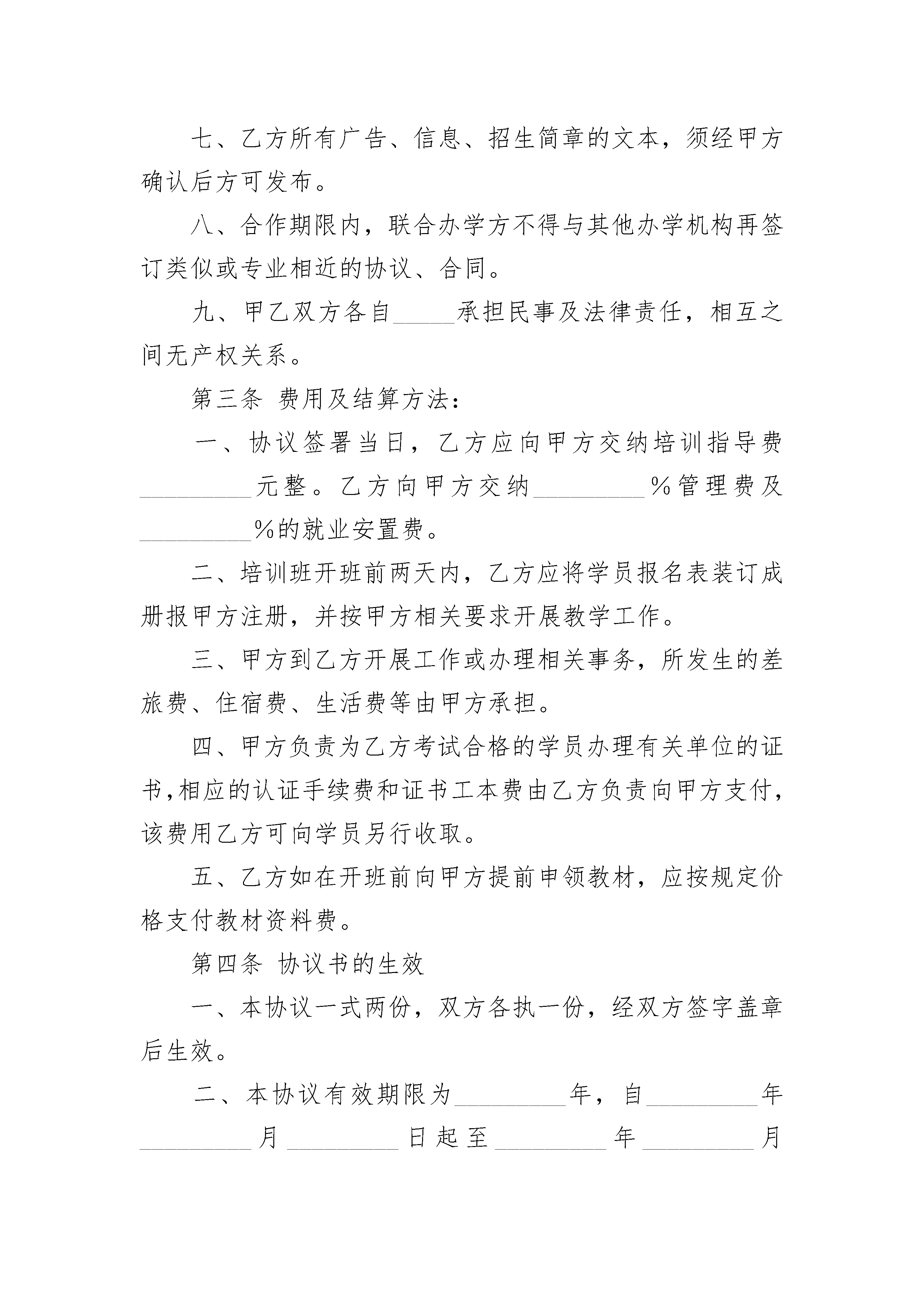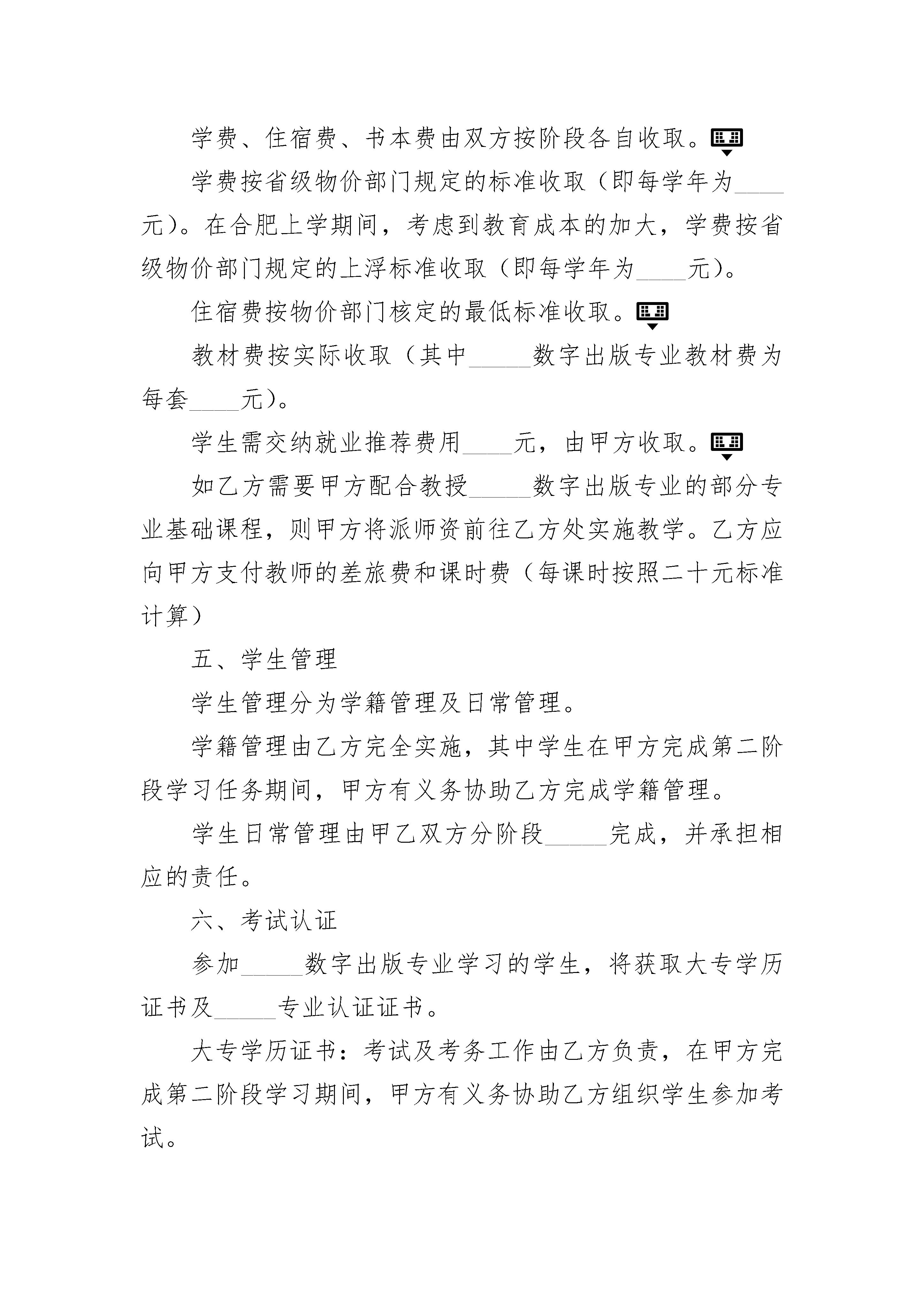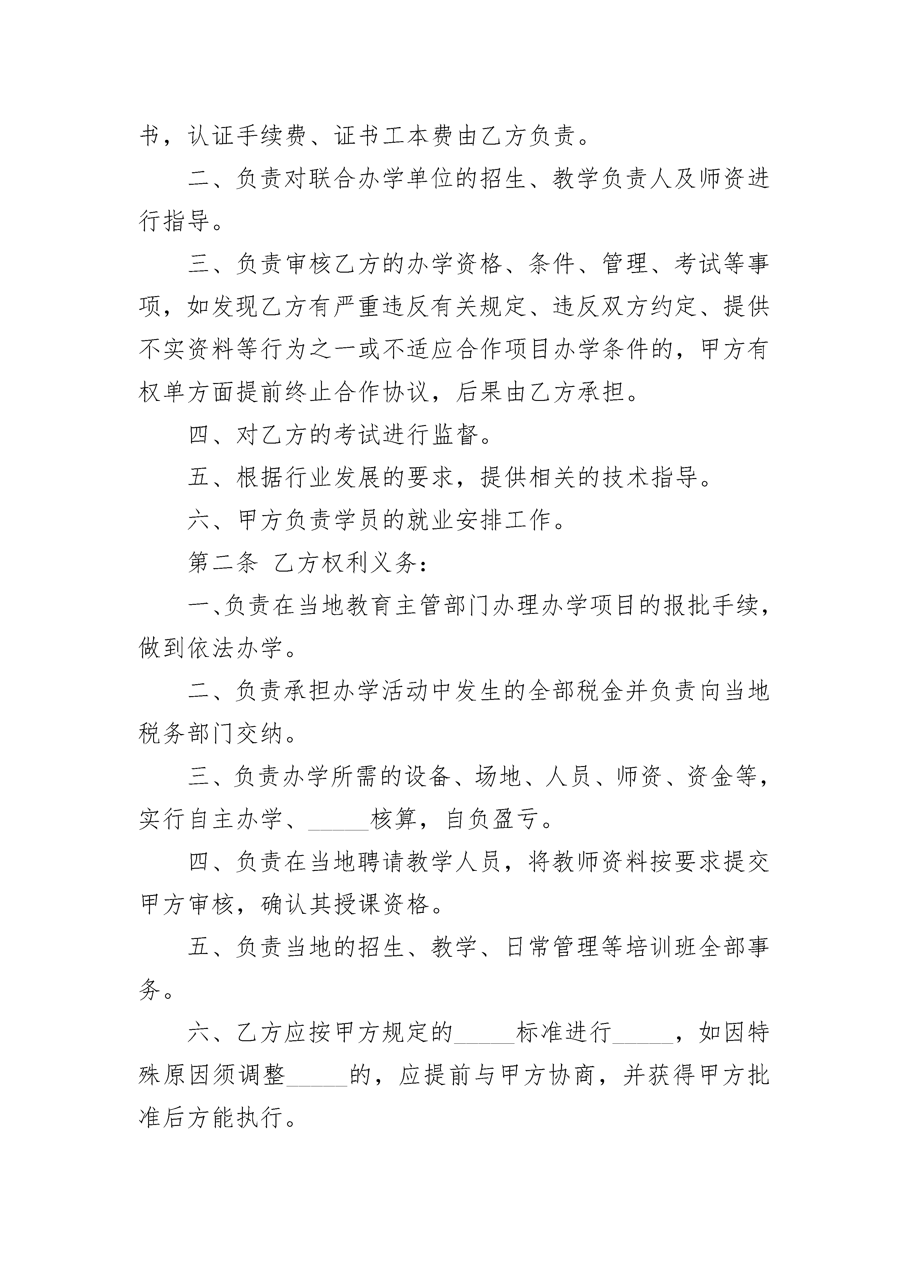 合作办学协议格式合作办学协议格式(精选22篇)合作办学协议格式篇1合作办学协议(样式一)甲方:乙方:一、合作模式双方以乙方现已开设的计算机应用专业(普通专科)为基础,结合双方的办学层次和性质,具体将甲方的_____数字出版专业的整体课程融入到乙方的计算机应用专业学历教育课程中。(参考目前省电大直属学院的作法,将_____数字出版专业课程作为计算机应用的一个专业方向,不向省教委另行申报专业,具体教学计划由双方教学部门共同拟定,报省电大批准后执行)二、合作办法双方共同搞好招生宣传,乙方____年秋季招生中的所有普专计算机应用专业学生即为双方合作办学的学生。三、培养模式培养分为两个阶段,第一阶段为期两学年由乙方在____负责传授学生大专课程和_____数字出版专业的专业基础课程,第二阶段为期一学年由甲方在合肥负责传授学生_____数字出版专业的专业课程。四、有关费用学费、住宿费、书本费由双方按阶段各自收取。学费按省级物价部门规定的标准收取(即每学年为____元)。在合肥上学期间,考虑到教育成本的加大,学费按省级物价部门规定的上浮标准收取(即每学年为____元)。住宿费按物价部门核定的最低标准收取。教材费按实际收取(其中_____数字出版专业教材费为每套____元)。学生需交纳就业推荐费用____元,由甲方收取。如乙方需要甲方配合教授_____数字出版专业的部分专业基础课程,则甲方将派师资前往乙方处实施教学。乙方应向甲方支付教师的差旅费和课时费(每课时按照二十元标准计算)五、学生管理学生管理分为学籍管理及日常管理。学籍管理由乙方完全实施,其中学生在甲方完成第二阶段学习任务期间,甲方有义务协助乙方完成学籍管理。学生日常管理由甲乙双方分阶段_____完成,并承担相应的责任。六、考试认证参加_____数字出版专业学习的学生,将获取大专学历证书及_____专业认证证书。大专学历证书:考试及考务工作由乙方负责,在甲方完成第二阶段学习期间,甲方有义务协助乙方组织学生参加考试。_____专业认证:考试及考务工作由甲方负责。学生必须获取两项专业认证证书(每项专业认证费为____元)。七、就业保障拥有大专学历证书及_____专业认证证书的学生为合作办学的合格学生,拥有推荐就业资格。推荐就业的工作由甲方负责,甲方将确保学生的总就业率达到____%以上,其中对口就业率为____%以上(对口方向为出版社、印刷厂、报社、杂志社、广告公司、输出中心)。甲、乙双方郑重承诺:对合格学生若不能推荐就业,则甲乙双方分别向学生退还壹学年学费;甲方保证学生就业半年后工资待遇不低于月薪____元。联系人:范主任:合作办学协议格式篇2合作办学协议(样式二)编号:_________甲方:_________乙方:_________合作办学项目:_________甲乙双方经友好协商,本着平等互利、共同发展的原则,就双方合作办学事宜达成以下协议:第一条甲方权利义务:一、负责提供培训教材,并负责为合格学员办理相关证书,认证手续费、证书工本费由乙方负责。二、负责对联合办学单位的招生、教学负责人及师资进行指导。三、负责审核乙方的办学资格、条件、管理、考试等事项,如发现乙方有严重违反有关规定、违反双方约定、提供不实资料等行为之一或不适应合作项目办学条件的,甲方有权单方面提前终止合作协议,后果由乙方承担。四、对乙方的考试进行监督。五、根据行业发展的要求,提供相关的技术指导。六、甲方负责学员的就业安排工作。第二条乙方权利义务:一、负责在当地教育主管部门办理办学项目的报批手续,做到依法办学。二、负责承担办学活动中发生的全部税金并负责向当地税务部门交纳。三、负责办学所需的设备、场地、人员、师资、资金等,实行自主办学、_____核算,自负盈亏。四、负责在当地聘请教学人员,将教师资料按要求提交甲方审核,确认其授课资格。五、负责当地的招生、教学、日常管理等培训班全部事务。六、乙方应按甲方规定的_____标准进行_____,如因特殊原因须调整_____的,应提前与甲方协商,并获得甲方批准后方能执行。七、乙方所有广告、信息、招生简章的文本,须经甲方确认后方可发布。八、合作期限内,联合办学方不得与其他办学机构再签订类似或专业相近的协议、合同。九、甲乙双方各自_____承担民事及法律责任,相互之间无产权关系。第三条费用及结算方法:一、协议签署当日,乙方应向甲方交纳培训指导费_________元整。乙方向甲方交纳_________%管理费及_________%的就业安置费。二、培训班开班前两天内,乙方应将学员报名表装订成册报甲方注册,并按甲方相关要求开展教学工作。三、甲方到乙方开展工作或办理相关事务,所发生的差旅费、住宿费、生活费等由甲方承担。四、甲方负责为乙方考试合格的学员办理有关单位的证书,相应的认证
