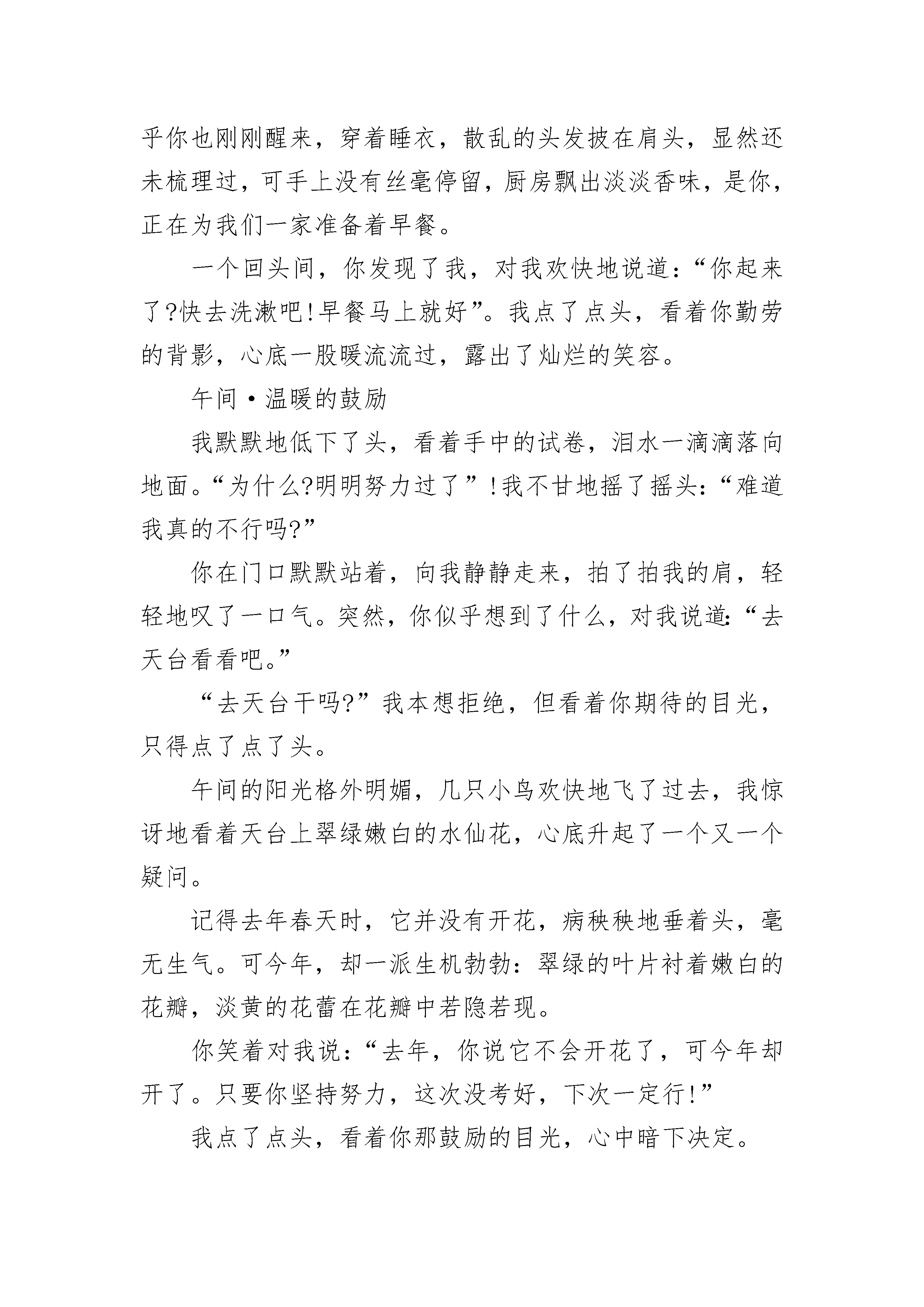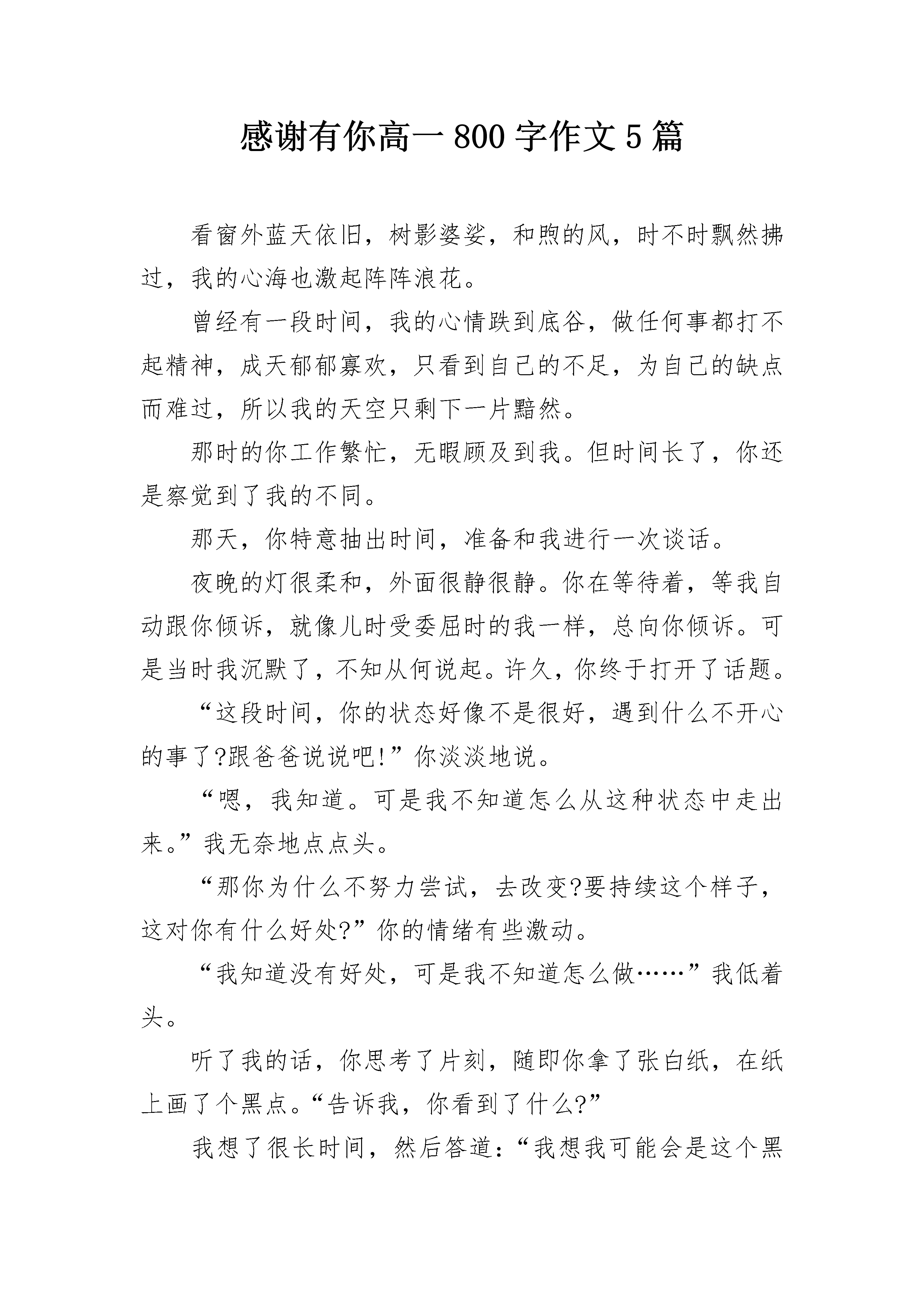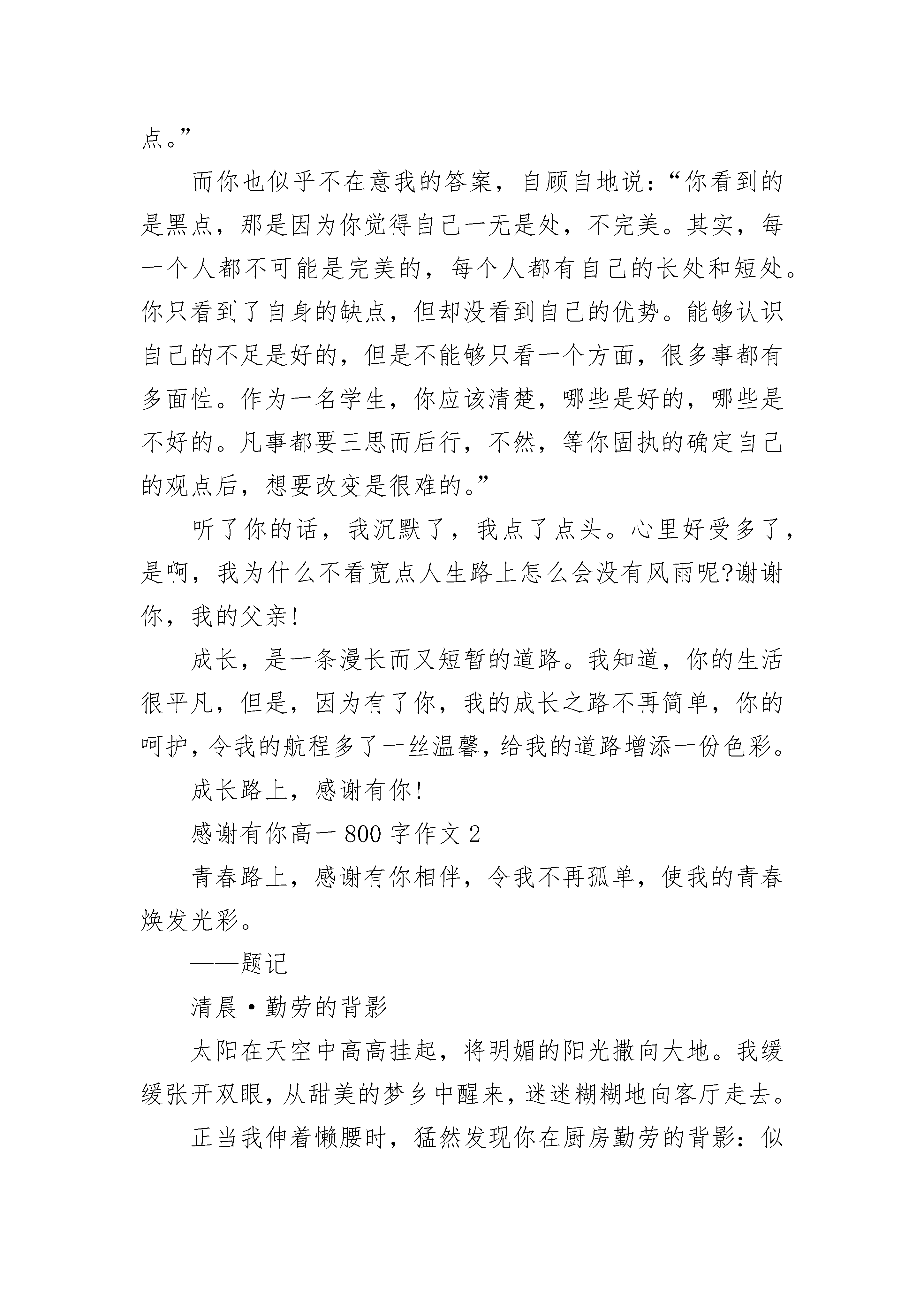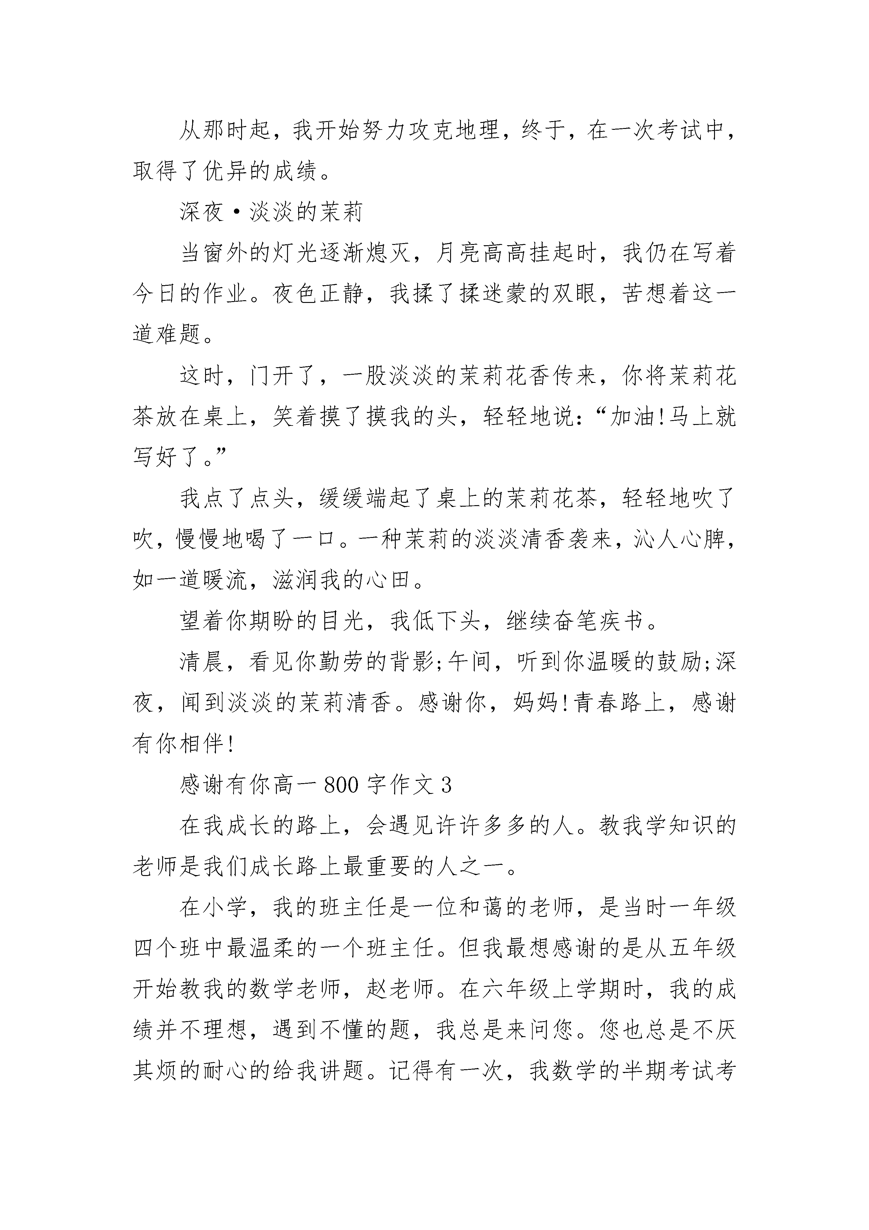 感谢有你高一800字作文5篇看窗外蓝天依旧,树影婆娑,和煦的风,时不时飘然拂过,我的心海也激起阵阵浪花。曾经有一段时间,我的心情跌到底谷,做任何事都打不起精神,成天郁郁寡欢,只看到自己的不足,为自己的缺点而难过,所以我的天空只剩下一片黯然。那时的你工作繁忙,无暇顾及到我。但时间长了,你还是察觉到了我的不同。那天,你特意抽出时间,准备和我进行一次谈话。夜晚的灯很柔和,外面很静很静。你在等待着,等我自动跟你倾诉,就像儿时受委屈时的我一样,总向你倾诉。可是当时我沉默了,不知从何说起。许久,你终于打开了话题。“这段时间,你的状态好像不是很好,遇到什么不开心的事了?跟爸爸说说吧!”你淡淡地说。“嗯,我知道。可是我不知道怎么从这种状态中走出来。”我无奈地点点头。“那你为什么不努力尝试,去改变?要持续这个样子,这对你有什么好处?”你的情绪有些激动。“我知道没有好处,可是我不知道怎么做……”我低着头。听了我的话,你思考了片刻,随即你拿了张白纸,在纸上画了个黑点。“告诉我,你看到了什么?”我想了很长时间,然后答道:“我想我可能会是这个黑点。”而你也似乎不在意我的答案,自顾自地说:“你看到的是黑点,那是因为你觉得自己一无是处,不完美。其实,每一个人都不可能是完美的,每个人都有自己的长处和短处。你只看到了自身的缺点,但却没看到自己的优势。能够认识自己的不足是好的,但是不能够只看一个方面,很多事都有多面性。作为一名学生,你应该清楚,哪些是好的,哪些是不好的。凡事都要三思而后行,不然,等你固执的确定自己的观点后,想要改变是很难的。”听了你的话,我沉默了,我点了点头。心里好受多了,是啊,我为什么不看宽点人生路上怎么会没有风雨呢?谢谢你,我的父亲!成长,是一条漫长而又短暂的道路。我知道,你的生活很平凡,但是,因为有了你,我的成长之路不再简单,你的呵护,令我的航程多了一丝温馨,给我的道路增添一份色彩。成长路上,感谢有你!感谢有你高一800字作文2青春路上,感谢有你相伴,令我不再孤单,使我的青春焕发光彩。——题记清晨·勤劳的背影太阳在天空中高高挂起,将明媚的阳光撒向大地。我缓缓张开双眼,从甜美的梦乡中醒来,迷迷糊糊地向客厅走去。正当我伸着懒腰时,猛然发现你在厨房勤劳的背影:似乎你也刚刚醒来,穿着睡衣,散乱的头发披在肩头,显然还未梳理过,可手上没有丝毫停留,厨房飘出淡淡香味,是你,正在为我们一家准备着早餐。一个回头间,你发现了我,对我欢快地说道:“你起来了?快去洗漱吧!早餐马上就好”。我点了点头,看着你勤劳的背影,心底一股暖流流过,露出了灿烂的笑容。午间·温暖的鼓励我默默地低下了头,看着手中的试卷,泪水一滴滴落向地面。“为什么?明明努力过了”!我不甘地摇了摇头:“难道我真的不行吗?”你在门口默默站着,向我静静走来,拍了拍我的肩,轻轻地叹了一口气。突然,你似乎想到了什么,对我说道:“去天台看看吧。”“去天台干吗?”我本想拒绝,但看着你期待的目光,只得点了点了头。午间的阳光格外明媚,几只小鸟欢快地飞了过去,我惊讶地看着天台上翠绿嫩白的水仙花,心底升起了一个又一个疑问。记得去年春天时,它并没有开花,病秧秧地垂着头,毫无生气。可今年,却一派生机勃勃:翠绿的叶片衬着嫩白的花瓣,淡黄的花蕾在花瓣中若隐若现。你笑着对我说:“去年,你说它不会开花了,可今年却开了。只要你坚持努力,这次没考好,下次一定行!”我点了点头,看着你那鼓励的目光,心中暗下决定。从那时起,我开始努力攻克地理,终于,在一次考试中,取得了优异的成绩。深夜·淡淡的茉莉当窗外的灯光逐渐熄灭,月亮高高挂起时,我仍在写着今日的作业。夜色正静,我揉了揉迷蒙的双眼,苦想着这一道难题。这时,门开了,一股淡淡的茉莉花香传来,你将茉莉花茶放在桌上,笑着摸了摸我的头,轻轻地说:“加油!马上就写好了。”我点了点头,缓缓端起了桌上的茉莉花茶,轻轻地吹了吹,慢慢地喝了一口。一种茉莉的淡淡清香袭来,沁人心脾,如一道暖流,滋润我的心田。望着你期盼的目光,我低下头,继续奋笔疾书。清晨,看见你勤劳的背影;午间,听到你温暖的鼓励;深夜,闻到淡淡的茉莉清香。感谢你,妈妈!青春路上,感谢有你相伴!感谢有你高一800字作文3在我成长的路上,会遇见许许多多的人。教我学知识的老师是我们成长路上最重要的人之一。在小学,我的班主任是一位和蔼的老师,是当时一年级四个班中最温柔的一个班主任。但我最想感谢的是从五年级开始教我的数学老师,赵老师。在六年级上学期时,我的成绩并不理想,遇到不懂的题,我总是来问您。您也总是不厌其烦的耐心的给我讲题。记得有一次,我数学的半期考试考了八十九分,半期考试题是十分简单的,而我连九十分都没有上到,简直是考的太差了。而老师您却没有严厉地批评我,而是对我说错的题都是不应该的,让我反思这些题是为什么错的,总结这次的经验,下次遇到这种题就