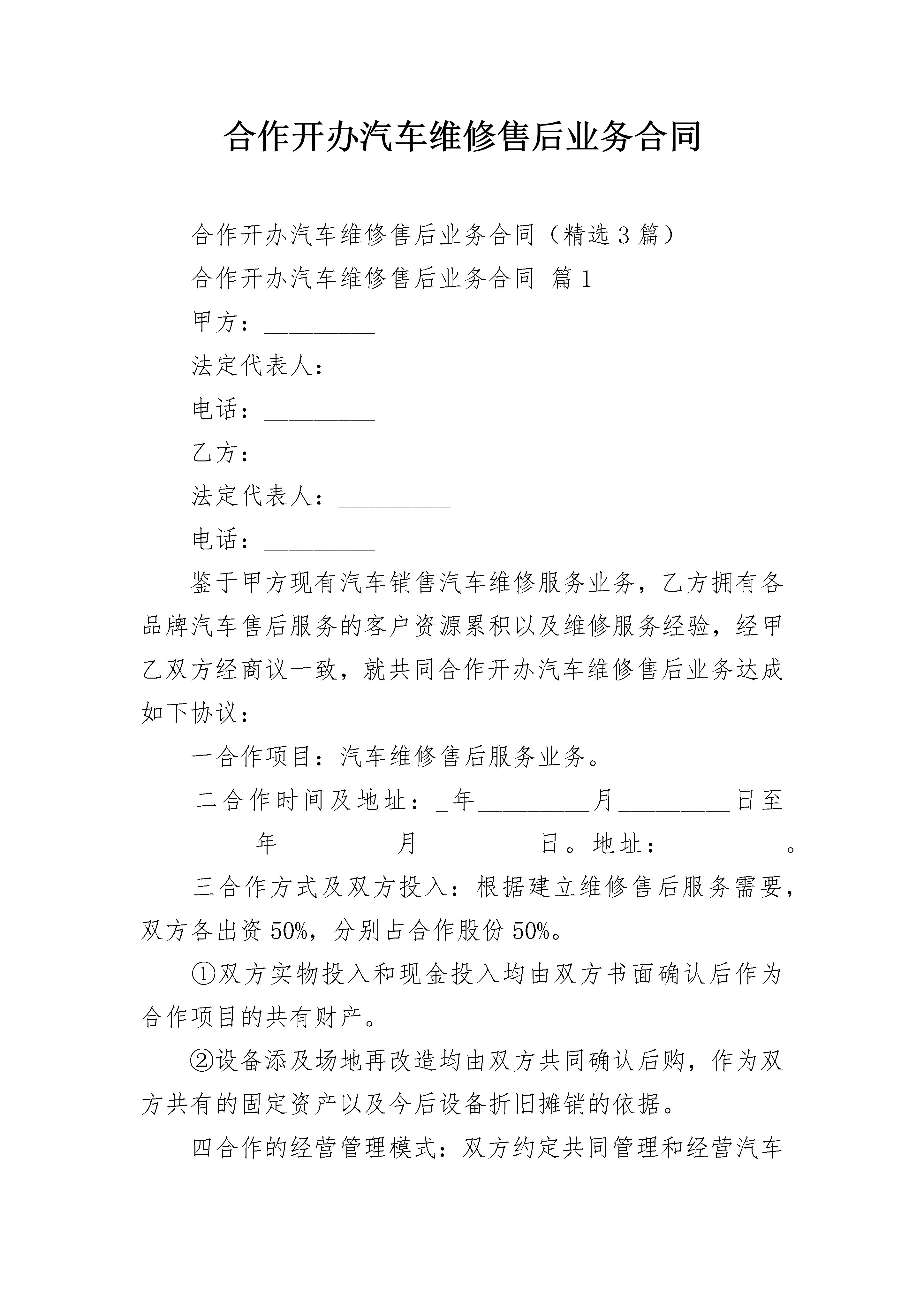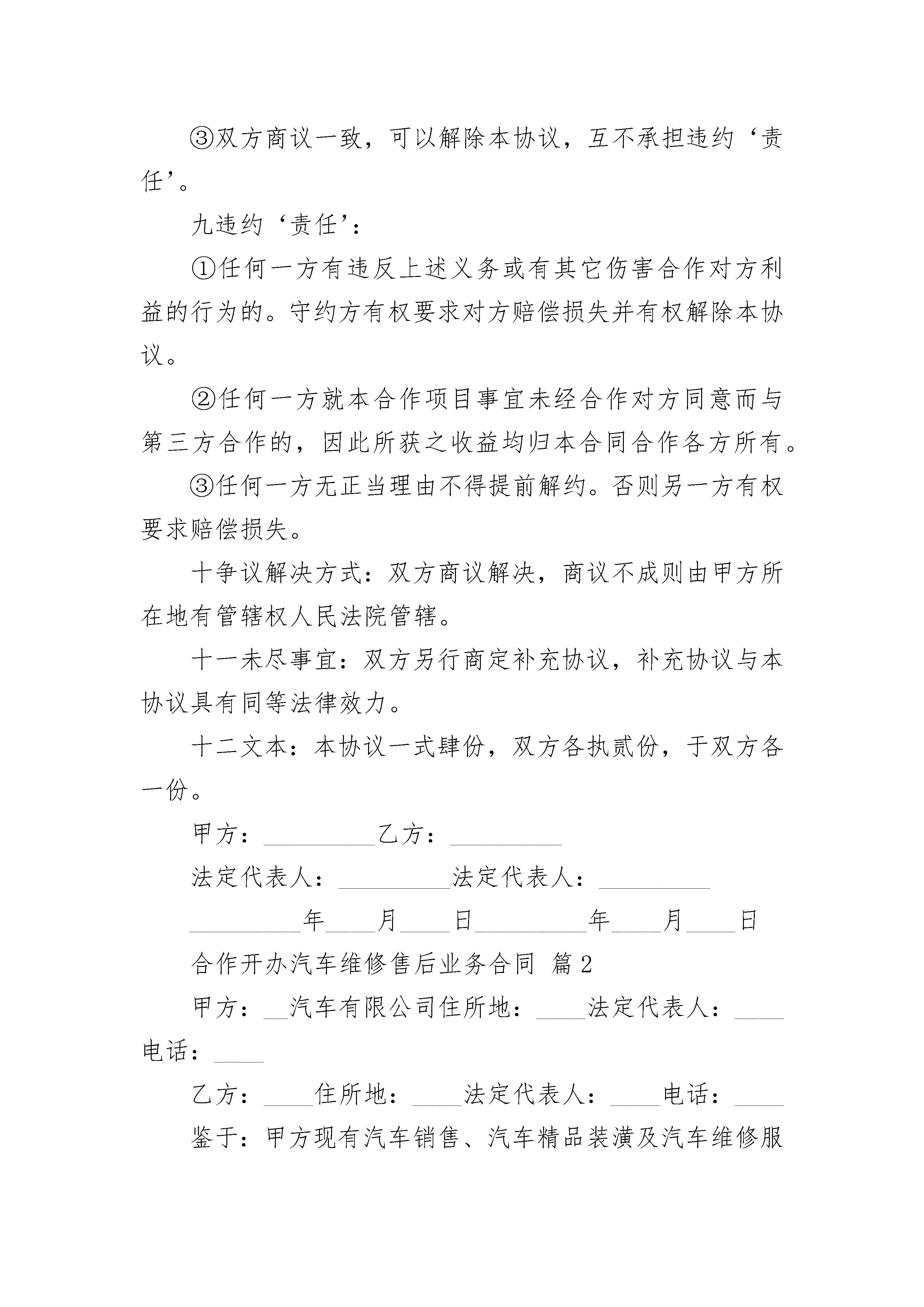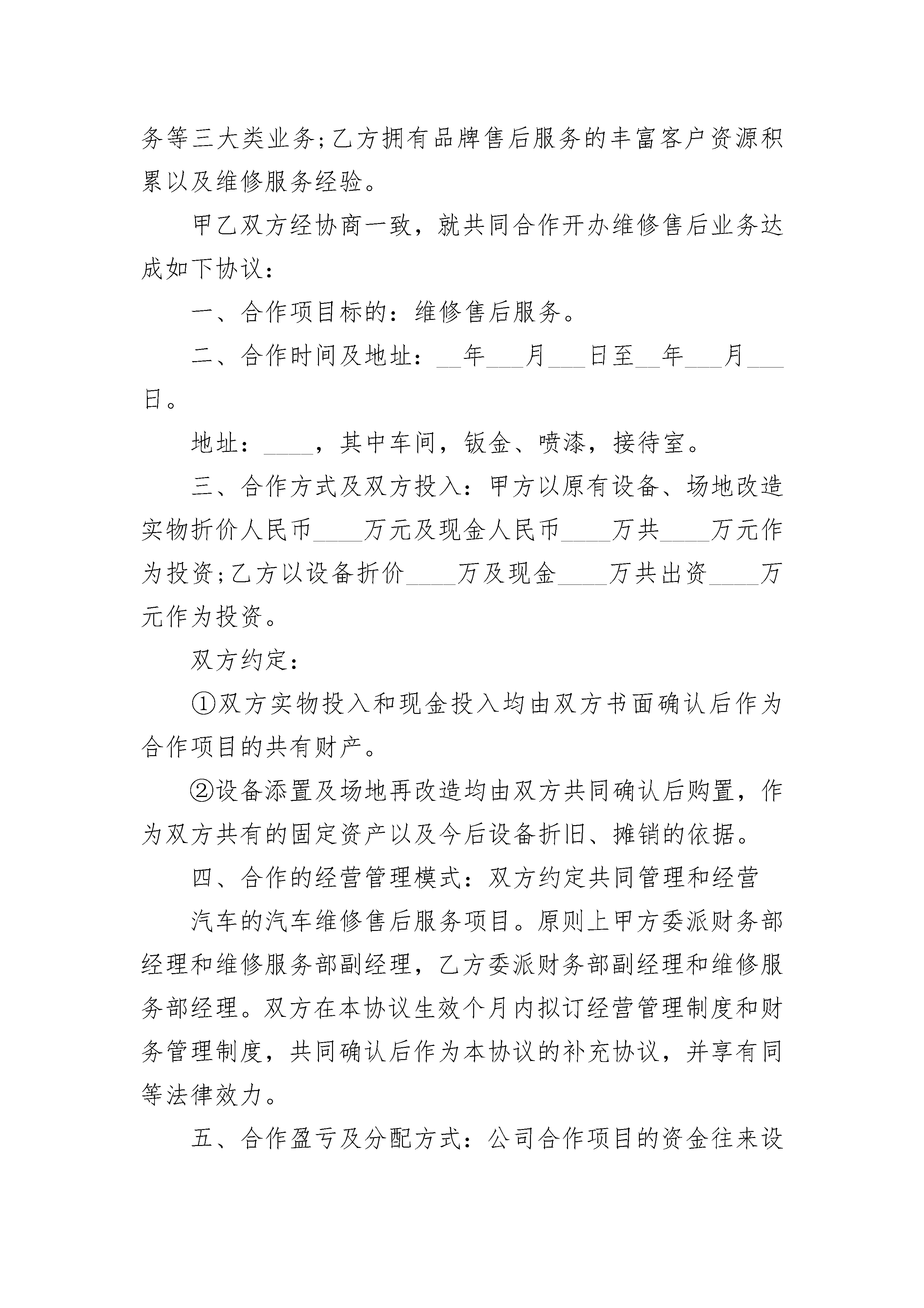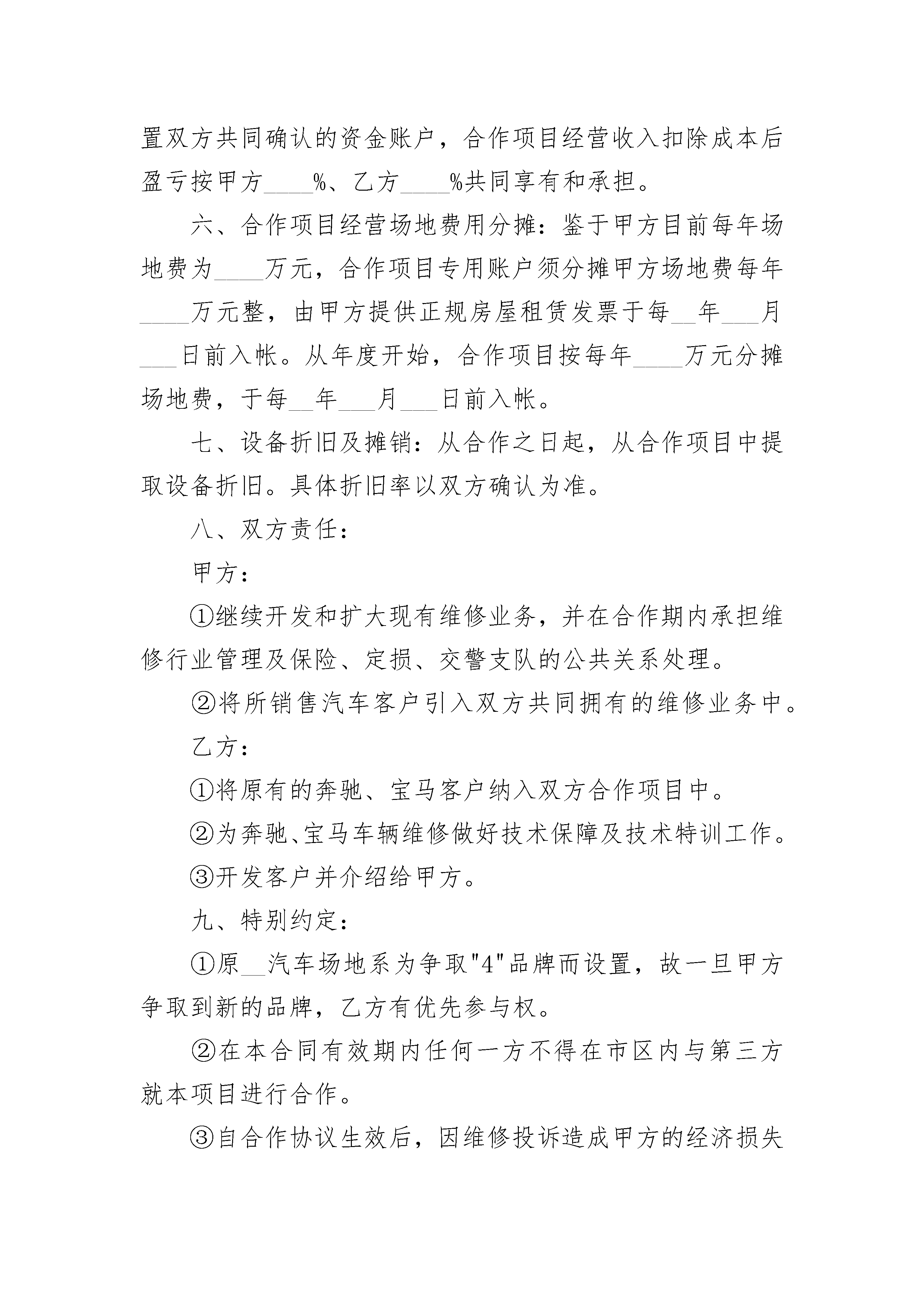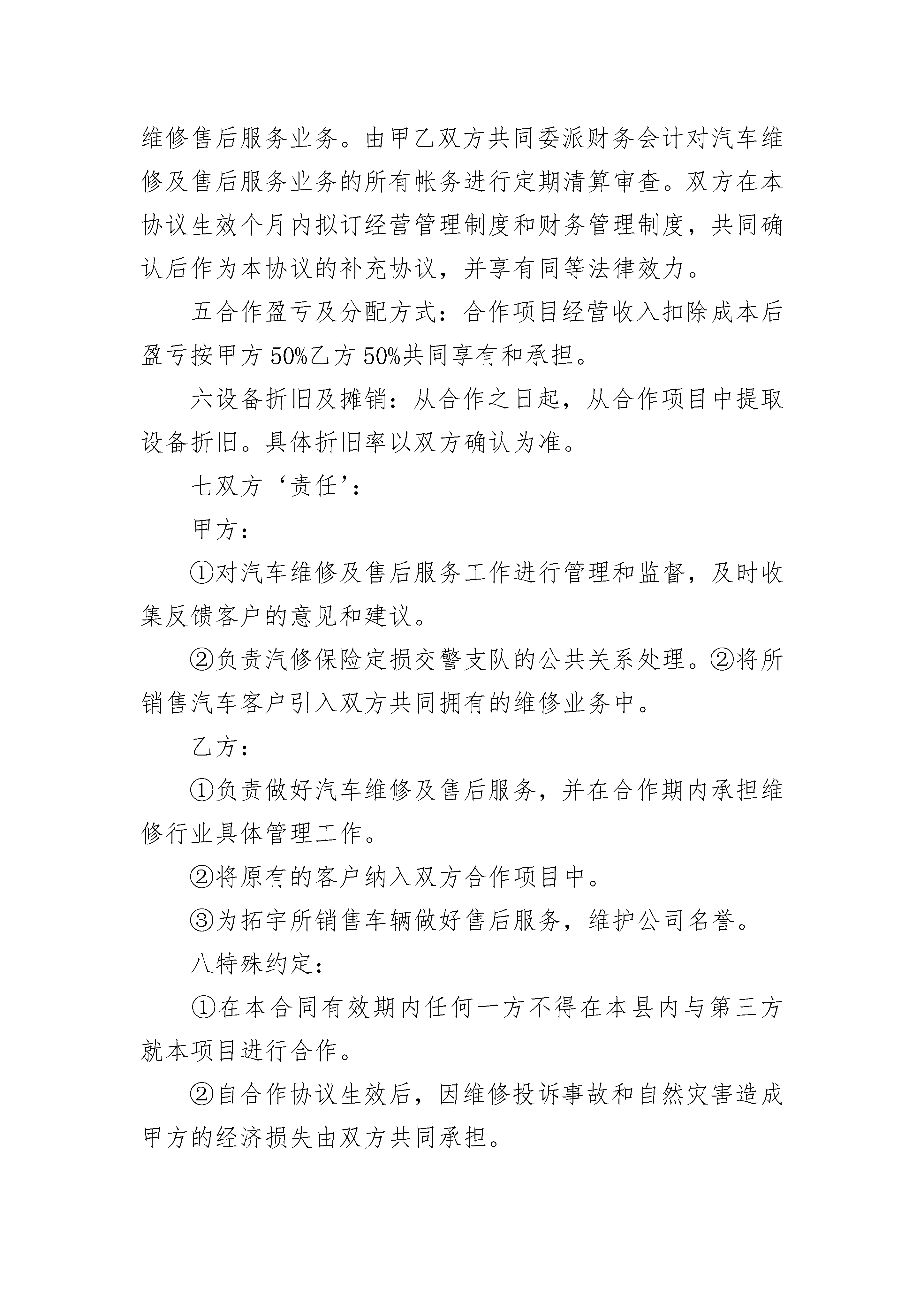 合作开办汽车维修售后业务合同合作开办汽车维修售后业务合同(精选3篇)合作开办汽车维修售后业务合同篇1甲方:_________法定代表人:_________电话:_________乙方:_________法定代表人:_________电话:_________鉴于甲方现有汽车销售汽车维修服务业务,乙方拥有各品牌汽车售后服务的客户资源累积以及维修服务经验,经甲乙双方经商议一致,就共同合作开办汽车维修售后业务达成如下协议:一合作项目:汽车维修售后服务业务。二合作时间及地址:_年_________月_________日至_________年_________月_________日。地址:_________。三合作方式及双方投入:根据建立维修售后服务需要,双方各出资50%,分别占合作股份50%。①双方实物投入和现金投入均由双方书面确认后作为合作项目的共有财产。②设备添及场地再改造均由双方共同确认后购,作为双方共有的固定资产以及今后设备折旧摊销的依据。四合作的经营管理模式:双方约定共同管理和经营汽车维修售后服务业务。由甲乙双方共同委派财务会计对汽车维修及售后服务业务的所有帐务进行定期清算审查。双方在本协议生效个月内拟订经营管理制度和财务管理制度,共同确认后作为本协议的补充协议,并享有同等法律效力。五合作盈亏及分配方式:合作项目经营收入扣除成本后盈亏按甲方50%乙方50%共同享有和承担。六设备折旧及摊销:从合作之日起,从合作项目中提取设备折旧。具体折旧率以双方确认为准。七双方‘责任’:甲方:①对汽车维修及售后服务工作进行管理和监督,及时收集反馈客户的意见和建议。②负责汽修保险定损交警支队的公共关系处理。②将所销售汽车客户引入双方共同拥有的维修业务中。乙方:①负责做好汽车维修及售后服务,并在合作期内承担维修行业具体管理工作。②将原有的客户纳入双方合作项目中。③为拓宇所销售车辆做好售后服务,维护公司名誉。八特殊约定:①在本合同有效期内任何一方不得在本县内与第三方就本项目进行合作。②自合作协议生效后,因维修投诉事故和自然灾害造成甲方的经济损失由双方共同承担。③双方商议一致,可以解除本协议,互不承担违约‘责任’。九违约‘责任’:①任何一方有违反上述义务或有其它伤害合作对方利益的行为的。守约方有权要求对方赔偿损失并有权解除本协议。②任何一方就本合作项目事宜未经合作对方同意而与第三方合作的,因此所获之收益均归本合同合作各方所有。③任何一方无正当理由不得提前解约。否则另一方有权要求赔偿损失。十争议解决方式:双方商议解决,商议不成则由甲方所在地有管辖权人民法院管辖。十一未尽事宜:双方另行商定补充协议,补充协议与本协议具有同等法律效力。十二文本:本协议一式肆份,双方各执贰份,于双方各一份。甲方:_________乙方:_________法定代表人:_________法定代表人:__________________年____月____日_________年____月____日合作开办汽车维修售后业务合同篇2甲方:__汽车有限公司住所地:____法定代表人:____电话:____乙方:____住所地:____法定代表人:____电话:____鉴于:甲方现有汽车销售、汽车精品装潢及汽车维修服务等三大类业务;乙方拥有品牌售后服务的丰富客户资源积累以及维修服务经验。甲乙双方经协商一致,就共同合作开办维修售后业务达成如下协议:一、合作项目标的:维修售后服务。二、合作时间及地址:__年___月___日至__年___月___日。地址:____,其中车间,钣金、喷漆,接待室。三、合作方式及双方投入:甲方以原有设备、场地改造实物折价人民币____万元及现金人民币____万共____万元作为投资;乙方以设备折价____万及现金____万共出资____万元作为投资。双方约定:①双方实物投入和现金投入均由双方书面确认后作为合作项目的共有财产。②设备添置及场地再改造均由双方共同确认后购置,作为双方共有的固定资产以及今后设备折旧、摊销的依据。四、合作的经营管理模式:双方约定共同管理和经营汽车的汽车维修售后服务项目。原则上甲方委派财务部经理和维修服务部副经理,乙方委派财务部副经理和维修服务部经理。双方在本协议生效个月内拟订经营管理制度和财务管理制度,共同确认后作为本协议的补充协议,并享有同等法律效力。五、合作盈亏及分配方式:公司合作项目的资金往来设置双方共同确认的资金账户,合作项目经营收入扣除成本后盈亏按甲方____%、乙方____%共同享有和承担。六、合作项目经营场地费用分摊:鉴于甲方目前每年场地费为____万元,合作项目专用账户须分摊甲方场地费每年____万元整,由甲方提供正规房屋租赁发票于每__年___月___日前入帐。从年度开始,合作项目按每年____万元分摊场地费,于每__年_