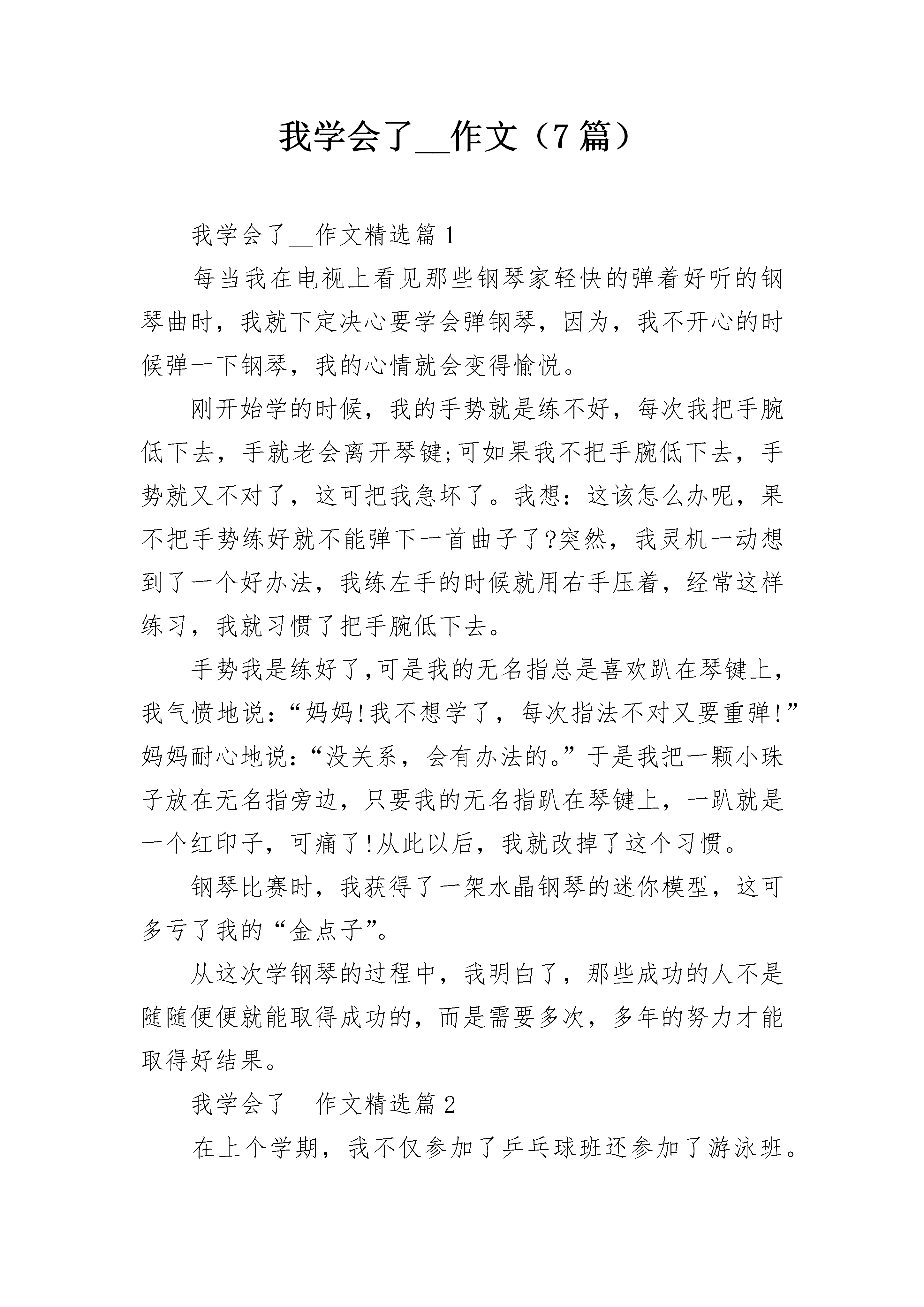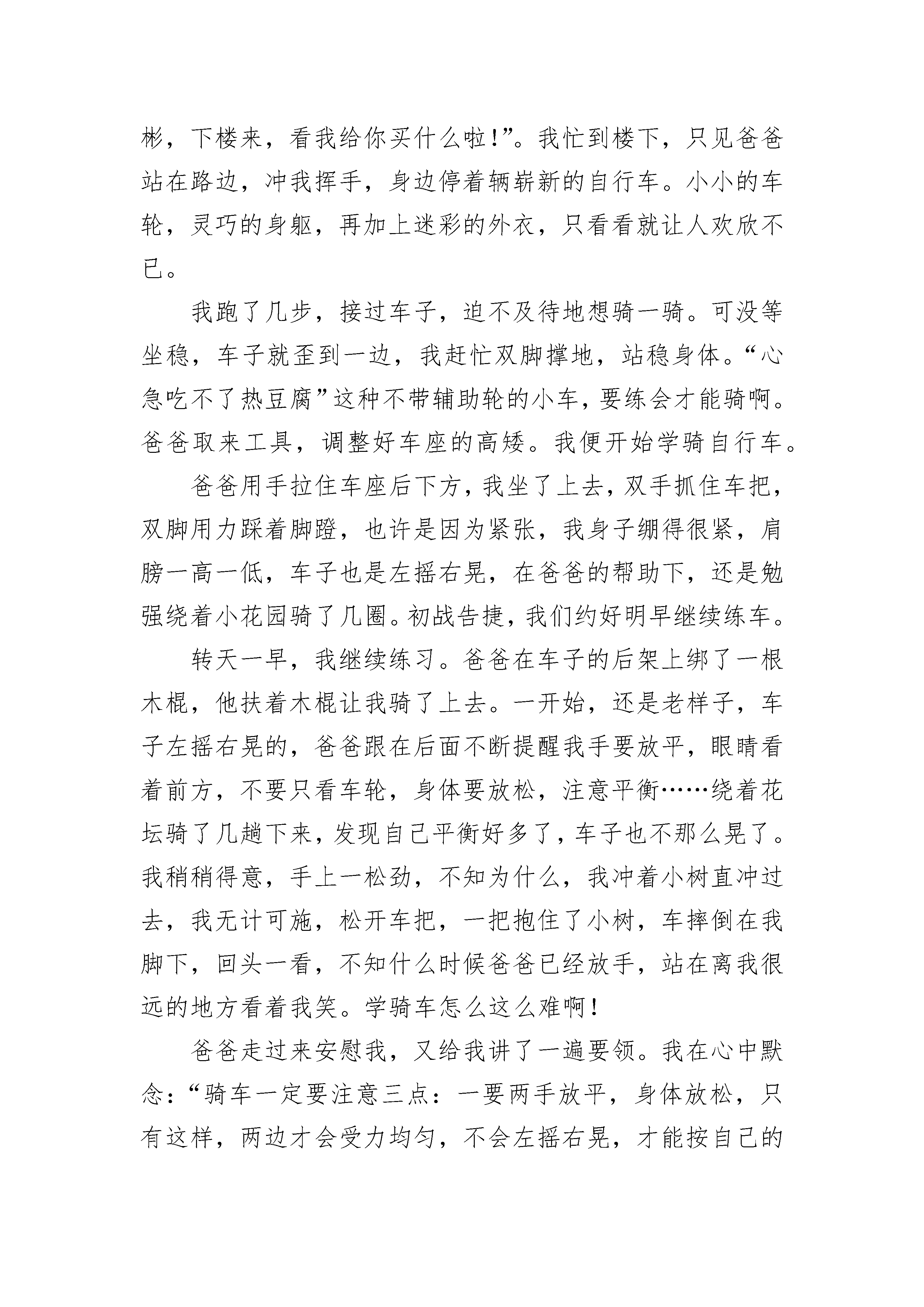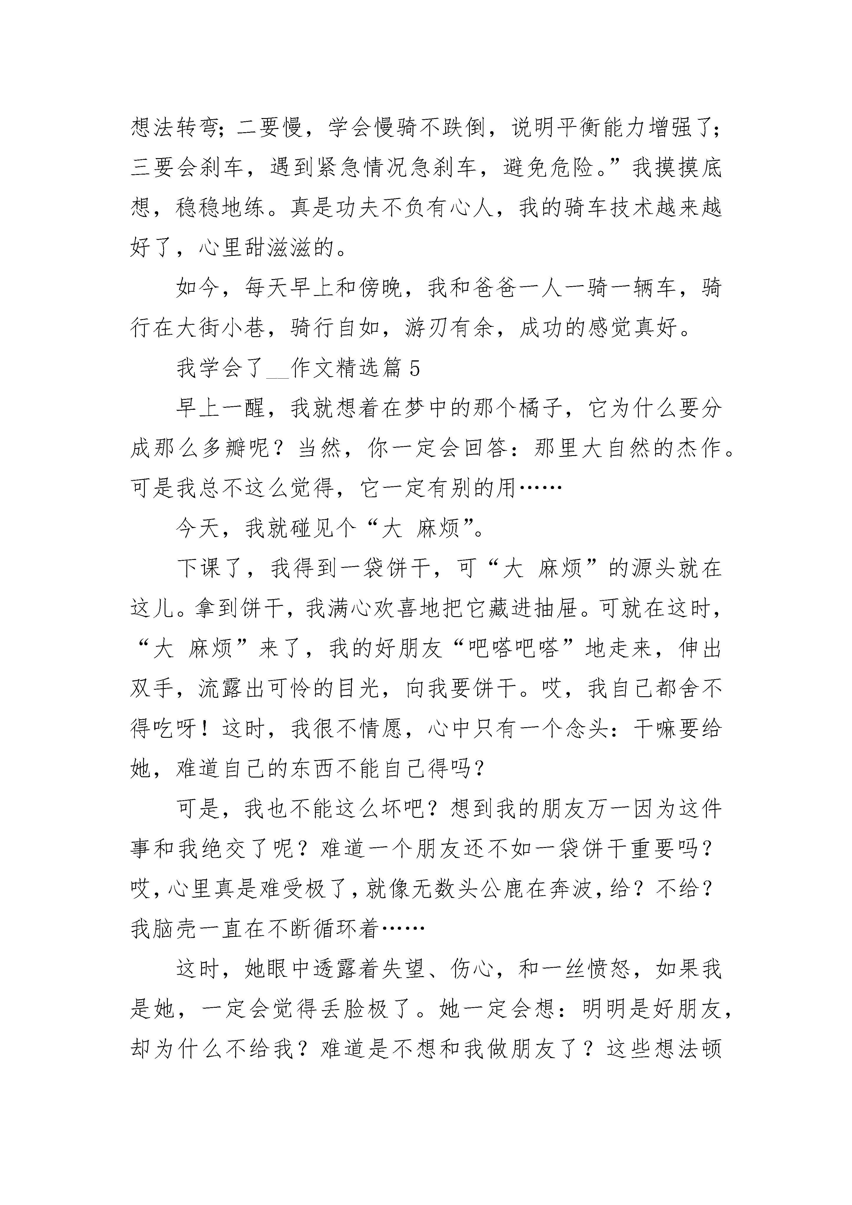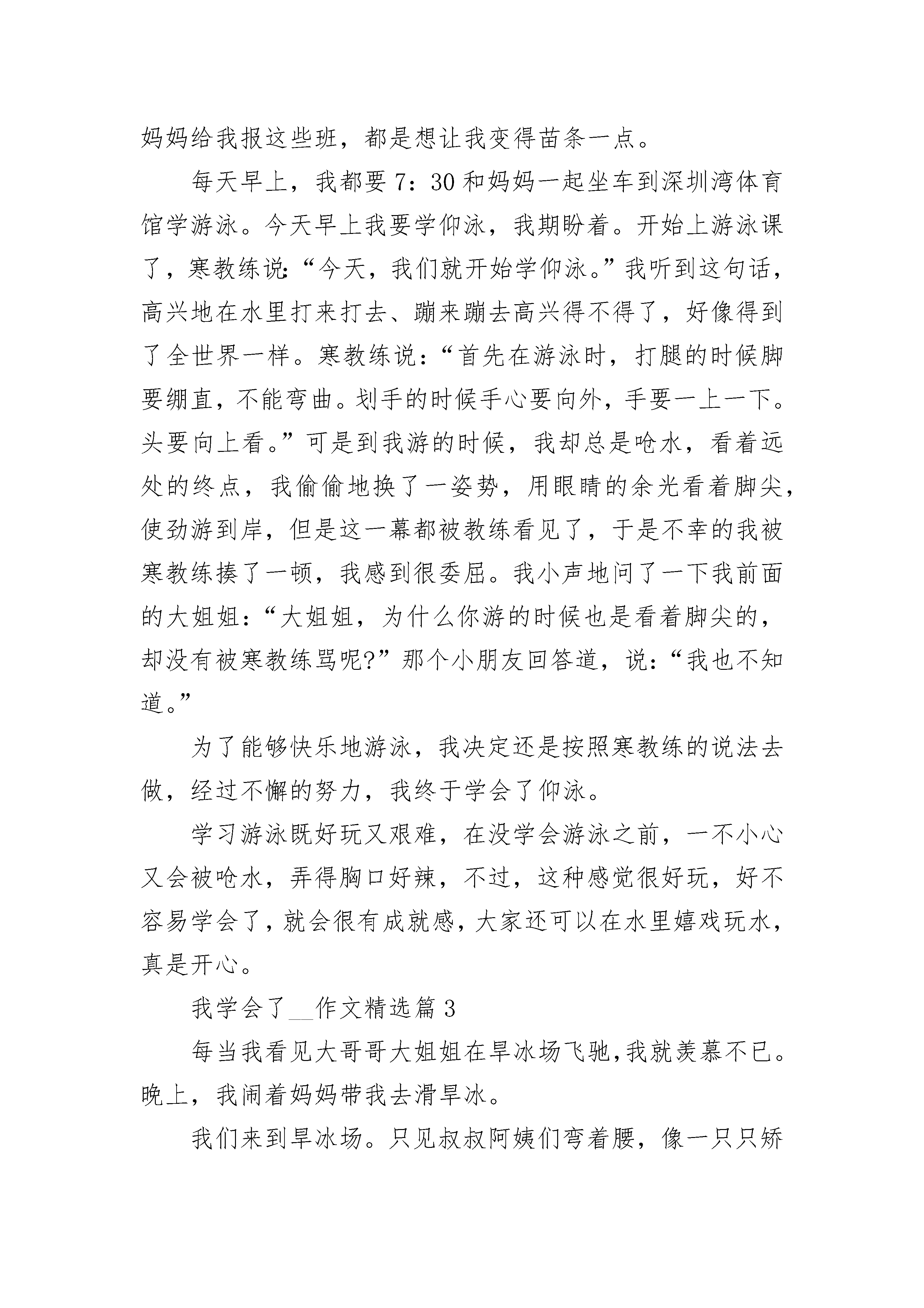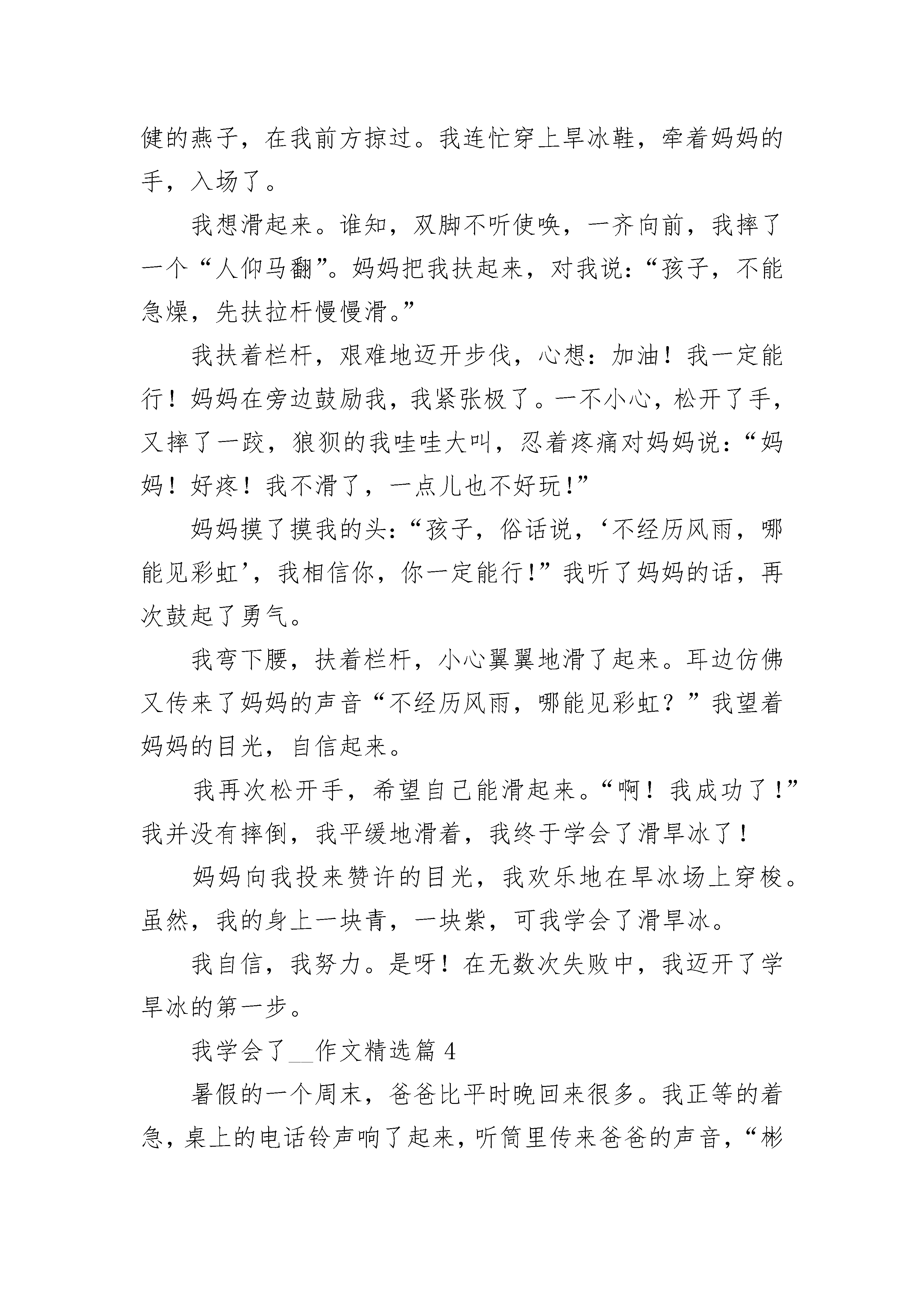 我学会了__作文(7篇)我学会了__作文精选篇1每当我在电视上看见那些钢琴家轻快的弹着好听的钢琴曲时,我就下定决心要学会弹钢琴,因为,我不开心的时候弹一下钢琴,我的心情就会变得愉悦。刚开始学的时候,我的手势就是练不好,每次我把手腕低下去,手就老会离开琴键;可如果我不把手腕低下去,手势就又不对了,这可把我急坏了。我想:这该怎么办呢,果不把手势练好就不能弹下一首曲子了?突然,我灵机一动想到了一个好办法,我练左手的时候就用右手压着,经常这样练习,我就习惯了把手腕低下去。手势我是练好了,可是我的无名指总是喜欢趴在琴键上,我气愤地说:“妈妈!我不想学了,每次指法不对又要重弹!”妈妈耐心地说:“没关系,会有办法的。”于是我把一颗小珠子放在无名指旁边,只要我的无名指趴在琴键上,一趴就是一个红印子,可痛了!从此以后,我就改掉了这个习惯。钢琴比赛时,我获得了一架水晶钢琴的迷你模型,这可多亏了我的“金点子”。从这次学钢琴的过程中,我明白了,那些成功的人不是随随便便就能取得成功的,而是需要多次,多年的努力才能取得好结果。我学会了__作文精选篇2在上个学期,我不仅参加了乒乓球班还参加了游泳班。妈妈给我报这些班,都是想让我变得苗条一点。每天早上,我都要7:30和妈妈一起坐车到深圳湾体育馆学游泳。今天早上我要学仰泳,我期盼着。开始上游泳课了,寒教练说:“今天,我们就开始学仰泳。”我听到这句话,高兴地在水里打来打去、蹦来蹦去高兴得不得了,好像得到了全世界一样。寒教练说:“首先在游泳时,打腿的时候脚要绷直,不能弯曲。划手的时候手心要向外,手要一上一下。头要向上看。”可是到我游的时候,我却总是呛水,看着远处的终点,我偷偷地换了一姿势,用眼睛的余光看着脚尖,使劲游到岸,但是这一幕都被教练看见了,于是不幸的我被寒教练揍了一顿,我感到很委屈。我小声地问了一下我前面的大姐姐:“大姐姐,为什么你游的时候也是看着脚尖的,却没有被寒教练骂呢?”那个小朋友回答道,说:“我也不知道。”为了能够快乐地游泳,我决定还是按照寒教练的说法去做,经过不懈的努力,我终于学会了仰泳。学习游泳既好玩又艰难,在没学会游泳之前,一不小心又会被呛水,弄得胸口好辣,不过,这种感觉很好玩,好不容易学会了,就会很有成就感,大家还可以在水里嬉戏玩水,真是开心。我学会了__作文精选篇3每当我看见大哥哥大姐姐在旱冰场飞驰,我就羡慕不已。晚上,我闹着妈妈带我去滑旱冰。我们来到旱冰场。只见叔叔阿姨们弯着腰,像一只只矫健的燕子,在我前方掠过。我连忙穿上旱冰鞋,牵着妈妈的手,入场了。我想滑起来。谁知,双脚不听使唤,一齐向前,我摔了一个“人仰马翻”。妈妈把我扶起来,对我说:“孩子,不能急燥,先扶拉杆慢慢滑。”我扶着栏杆,艰难地迈开步伐,心想:加油!我一定能行!妈妈在旁边鼓励我,我紧张极了。一不小心,松开了手,又摔了一跤,狼狈的我哇哇大叫,忍着疼痛对妈妈说:“妈妈!好疼!我不滑了,一点儿也不好玩!”妈妈摸了摸我的头:“孩子,俗话说,‘不经历风雨,哪能见彩虹’,我相信你,你一定能行!”我听了妈妈的话,再次鼓起了勇气。我弯下腰,扶着栏杆,小心翼翼地滑了起来。耳边仿佛又传来了妈妈的声音“不经历风雨,哪能见彩虹?”我望着妈妈的目光,自信起来。我再次松开手,希望自己能滑起来。“啊!我成功了!”我并没有摔倒,我平缓地滑着,我终于学会了滑旱冰了!妈妈向我投来赞许的目光,我欢乐地在旱冰场上穿梭。虽然,我的身上一块青,一块紫,可我学会了滑旱冰。我自信,我努力。是呀!在无数次失败中,我迈开了学旱冰的第一步。我学会了__作文精选篇4暑假的一个周末,爸爸比平时晚回来很多。我正等的着急,桌上的电话铃声响了起来,听筒里传来爸爸的声音,“彬彬,下楼来,看我给你买什么啦!”。我忙到楼下,只见爸爸站在路边,冲我挥手,身边停着辆崭新的自行车。小小的车轮,灵巧的身躯,再加上迷彩的外衣,只看看就让人欢欣不已。我跑了几步,接过车子,迫不及待地想骑一骑。可没等坐稳,车子就歪到一边,我赶忙双脚撑地,站稳身体。“心急吃不了热豆腐”这种不带辅助轮的小车,要练会才能骑啊。爸爸取来工具,调整好车座的高矮。我便开始学骑自行车。爸爸用手拉住车座后下方,我坐了上去,双手抓住车把,双脚用力踩着脚蹬,也许是因为紧张,我身子绷得很紧,肩膀一高一低,车子也是左摇右晃,在爸爸的帮助下,还是勉强绕着小花园骑了几圈。初战告捷,我们约好明早继续练车。转天一早,我继续练习。爸爸在车子的后架上绑了一根木棍,他扶着木棍让我骑了上去。一开始,还是老样子,车子左摇右晃的,爸爸跟在后面不断提醒我手要放平,眼睛看着前方,不要只看车轮,身体要放松,注意平衡……绕着花坛骑了几趟下来,发现自己平衡好多了,车子也不那么晃了。我稍稍得意,手上一松劲,不知为什么,我冲着小树直冲过去,我无计可施,松开车把,一把抱住了小树