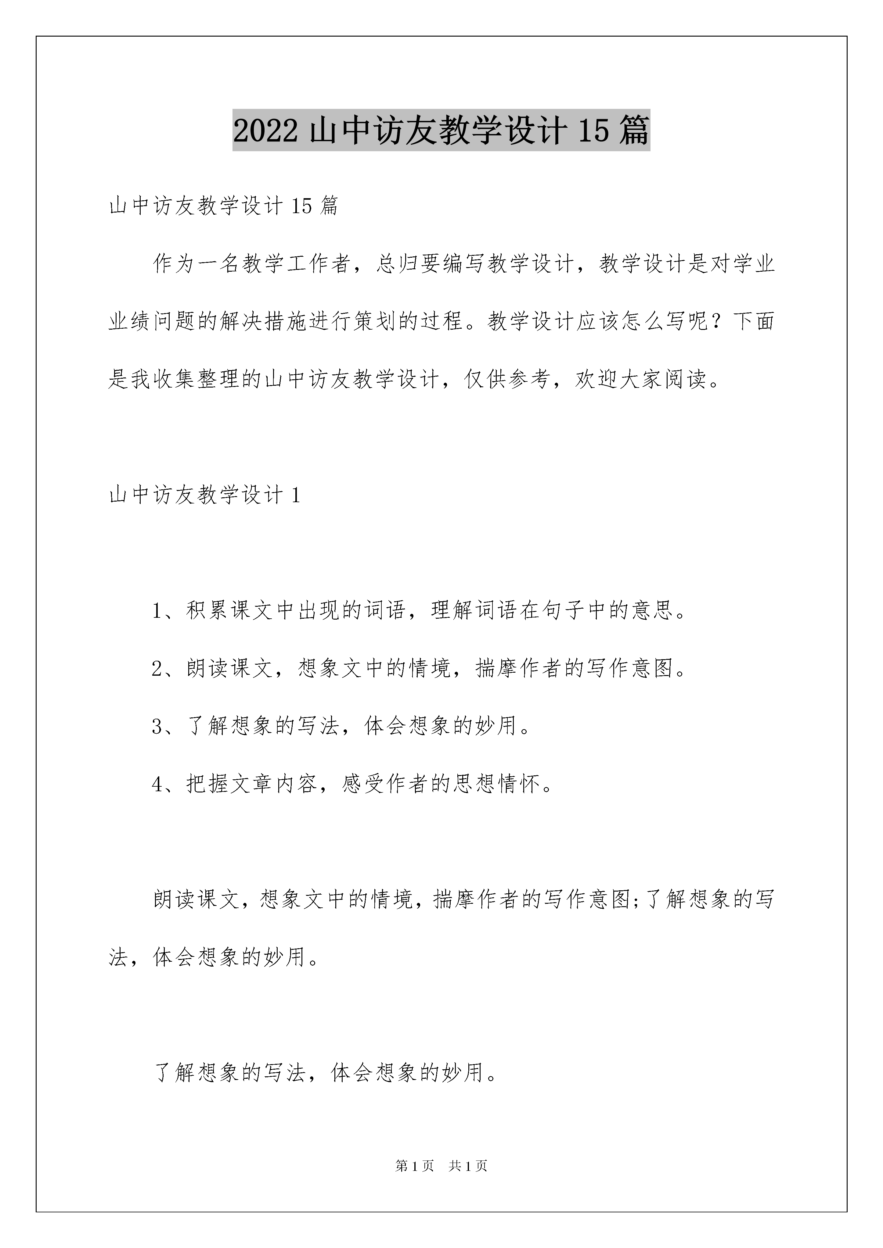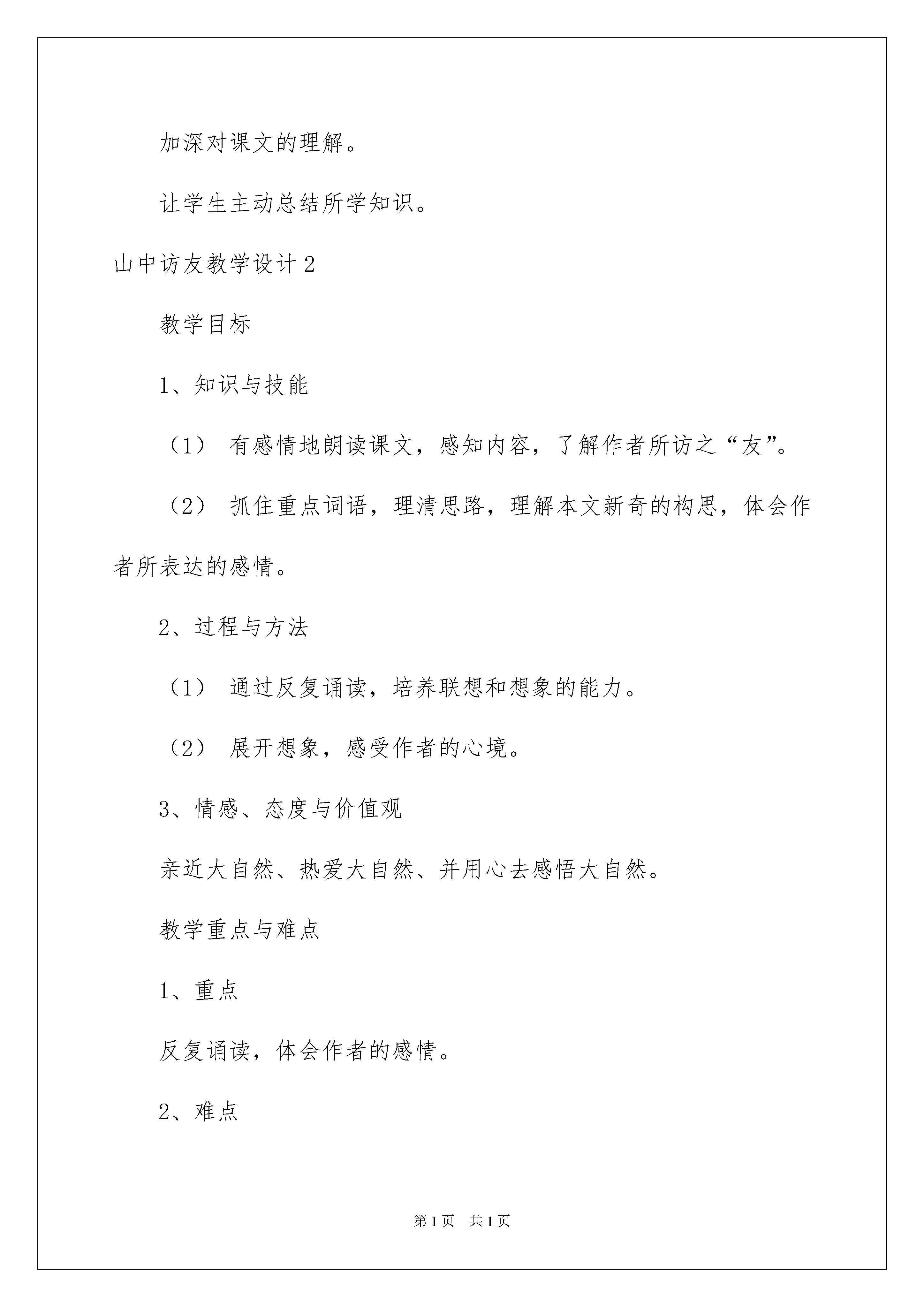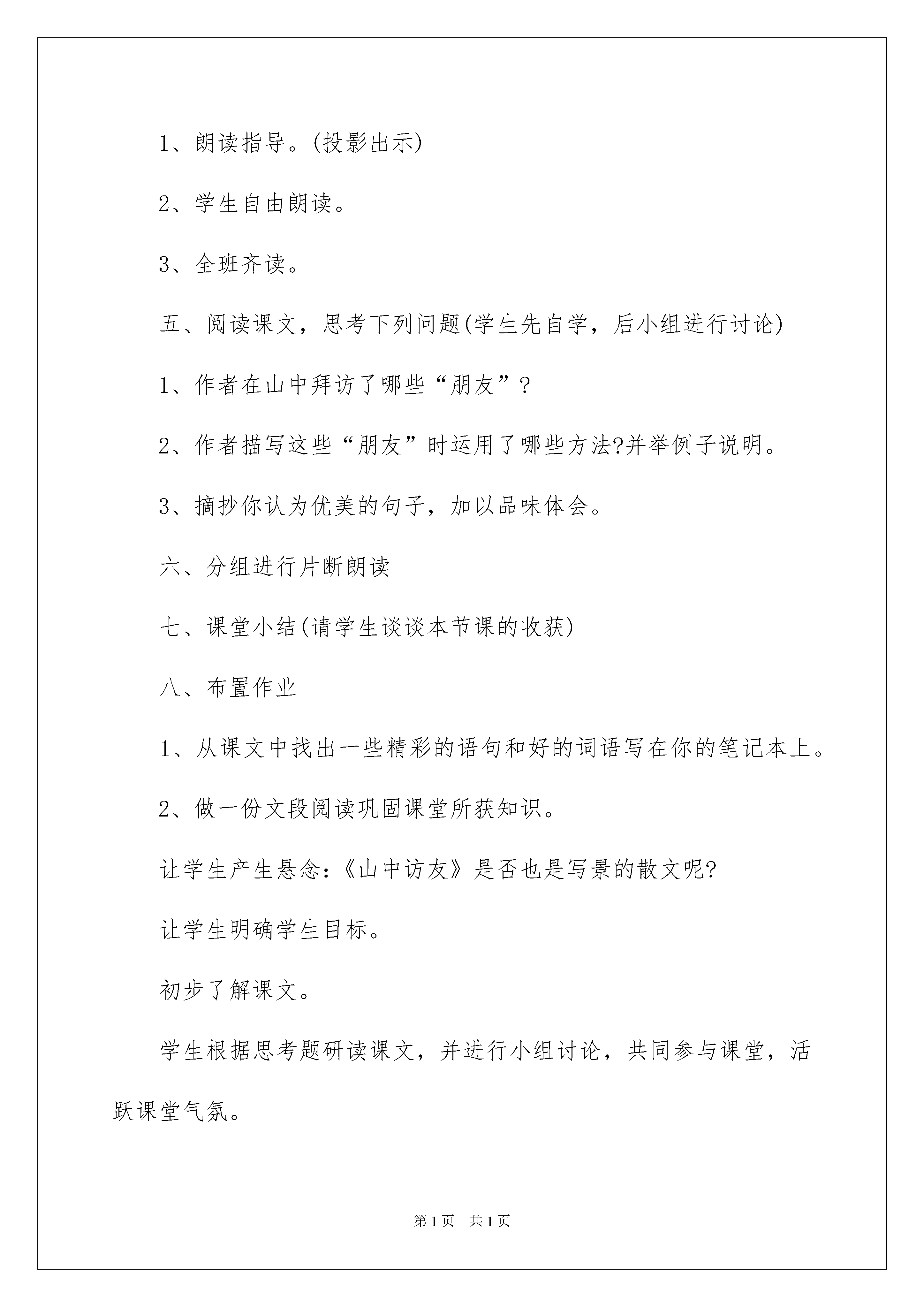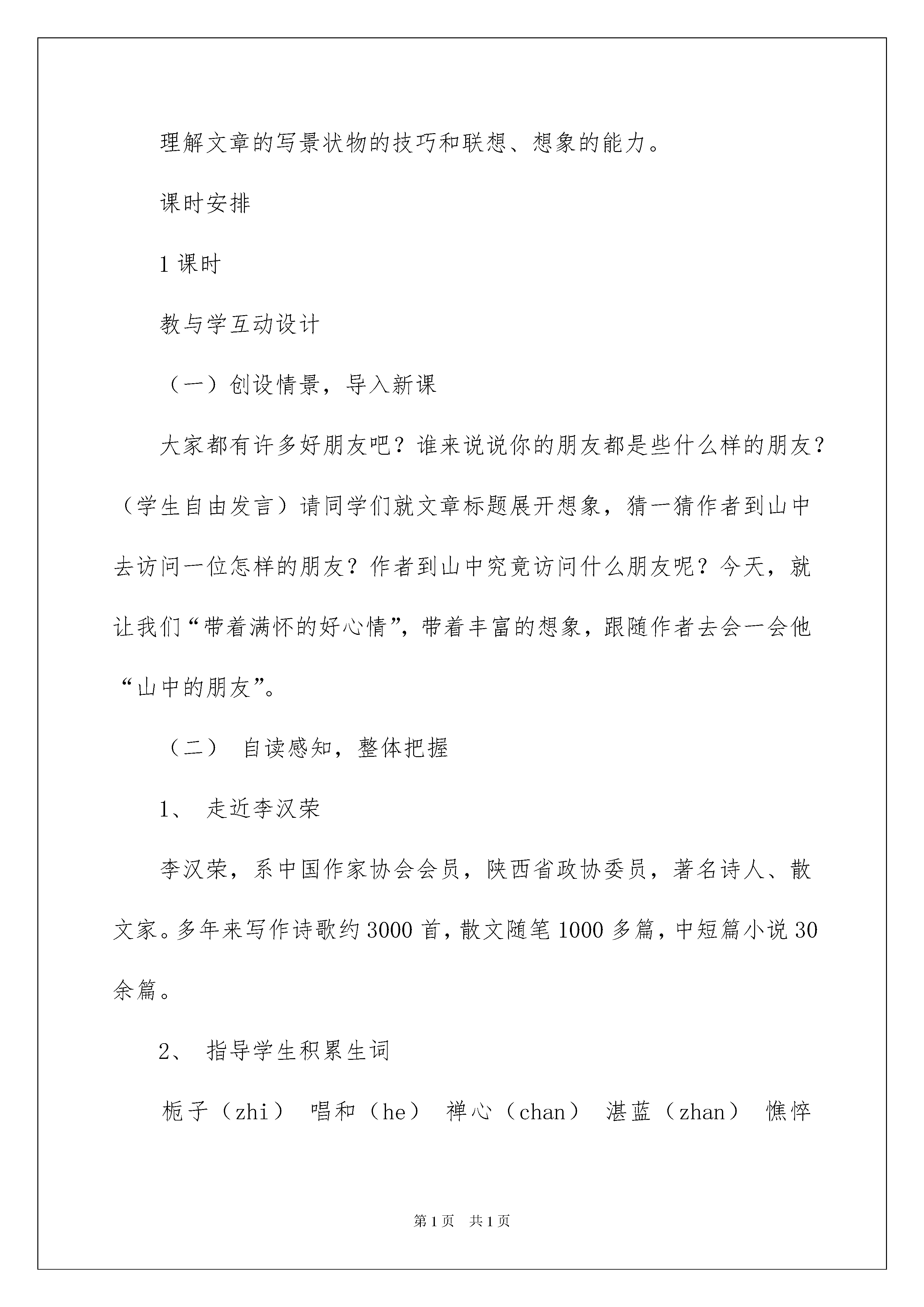 2022山中访友教学设计15篇山中访友教学设计15篇作为一名教学工作者,总归要编写教学设计,教学设计是对学业业绩问题的解决措施进行策划的过程。教学设计应该怎么写呢?下面是我收集整理的山中访友教学设计,仅供参考,欢迎大家阅读。山中访友教学设计11、积累课文中出现的词语,理解词语在句子中的意思。2、朗读课文,想象文中的情境,揣摩作者的写作意图。3、了解想象的写法,体会想象的妙用。4、把握文章内容,感受作者的思想情怀。朗读课文,想象文中的情境,揣摩作者的写作意图;了解想象的写法,体会想象的妙用。了解想象的写法,体会想象的妙用。注重培养学生自学能力,引导学生采取“自主、合作、探究”方式学习本文。多媒体。1课时。教学过程设计意图一、新课导入1、引导学生回忆第三单元学过的两篇写景的散文:《春》、《济南的冬天》。2、全班齐读文中导语。二、展示本课学习目标(投影出示)三、出示课件检察学生预习情况四、朗读课文1、朗读指导。(投影出示)2、学生自由朗读。3、全班齐读。五、阅读课文,思考下列问题(学生先自学,后小组进行讨论)1、作者在山中拜访了哪些“朋友”?2、作者描写这些“朋友”时运用了哪些方法?并举例子说明。3、摘抄你认为优美的句子,加以品味体会。六、分组进行片断朗读七、课堂小结(请学生谈谈本节课的收获)八、布置作业1、从课文中找出一些精彩的语句和好的词语写在你的笔记本上。2、做一份文段阅读巩固课堂所获知识。让学生产生悬念:《山中访友》是否也是写景的散文呢?让学生明确学生目标。初步了解课文。学生根据思考题研读课文,并进行小组讨论,共同参与课堂,活跃课堂气氛。加深对课文的理解。让学生主动总结所学知识。山中访友教学设计2教学目标1、知识与技能(1)有感情地朗读课文,感知内容,了解作者所访之“友”。(2)抓住重点词语,理清思路,理解本文新奇的构思,体会作者所表达的感情。2、过程与方法(1)通过反复诵读,培养联想和想象的能力。(2)展开想象,感受作者的心境。3、情感、态度与价值观亲近大自然、热爱大自然、并用心去感悟大自然。教学重点与难点1、重点反复诵读,体会作者的感情。2、难点理解文章的写景状物的技巧和联想、想象的能力。课时安排1课时教与学互动设计(一)创设情景,导入新课大家都有许多好朋友吧?谁来说说你的朋友都是些什么样的朋友?(学生自由发言)请同学们就文章标题展开想象,猜一猜作者到山中去访问一位怎样的朋友?作者到山中究竟访问什么朋友呢?今天,就让我们“带着满怀的好心情”,带着丰富的想象,跟随作者去会一会他“山中的朋友”。(二)自读感知,整体把握1、走近李汉荣李汉荣,系中国作家协会会员,陕西省政协委员,著名诗人、散文家。多年来写作诗歌约3000首,散文随笔1000多篇,中短篇小说30余篇。2、指导学生积累生词栀子(zhi)唱和(he)禅心(chan)湛蓝(zhan)憔悴(qiaocui)逝川(shi)逝川:流水,比喻消逝的时光。凝神:精神高度集中,不分散。玄奥:玄秘深奥。唱和:指歌唱时此唱彼和,互相呼应。德高望重:道德高尚,有很高的声望。津津乐道:形容有滋味或有兴趣的说道。憔悴:形容人瘦弱,面色不好看。3、整体感知(1)教师范读课文,学生思考:本文的题材是什么?写了什么?作者要表达怎样的感情?[点拨]《山中访友》是一篇构思新奇、富有想象力、充满童心和好奇心的散文。作者“带着满怀的好心情”,走进山林,探访“山中的众朋友”,与“朋友们”互诉心声,营造了一个如诗如画的童话世界,表达了对大自然的热爱之情。(2)自渎课文[学生活动]画出文中“走进山林”后所描述的具体事物,抓重点词语,感知内容,理解思路。(使学生在自由阅读中了解课文内容,体会作者的感情,自主培养阅读能力)[点拨]作品依次描述了:古桥—树林—山泉—小溪—白云—瀑布—悬崖—云雀—石头—落叶—小花—阵雨—老柏树—蚂蚁—归鸟。(三)合作交流,解读探究1、理解作品中作者“走进山林”后的所见所想[学生活动]由学生精细地朗读课文,细细品味并思考探究:作者与大自然是那样贴近,关系是那么密切,他来到山中探访朋友,作者分别从山中的众朋友身上感悟到什么?得到了怎样的启示?(分小组讨论,合作探究,教师参与。对学生的发现给予鼓励,这类训练重在语言的感悟和理解)[点拨]古桥——德高望重——古老而坚韧的灵魂树林——知己——我变成了树山泉——姐姐——照出我的浑浊小溪——妹妹——唱和小诗白云——大嫂——天空的护士,使天空返老还童瀑布——大哥——天生金嗓子,无回报地从古唱到今悬崖——爷爷——给人清净、无杂念的心境云雀——弟弟——纯洁少年,从不说是非石头——敲击——时间的回声落叶