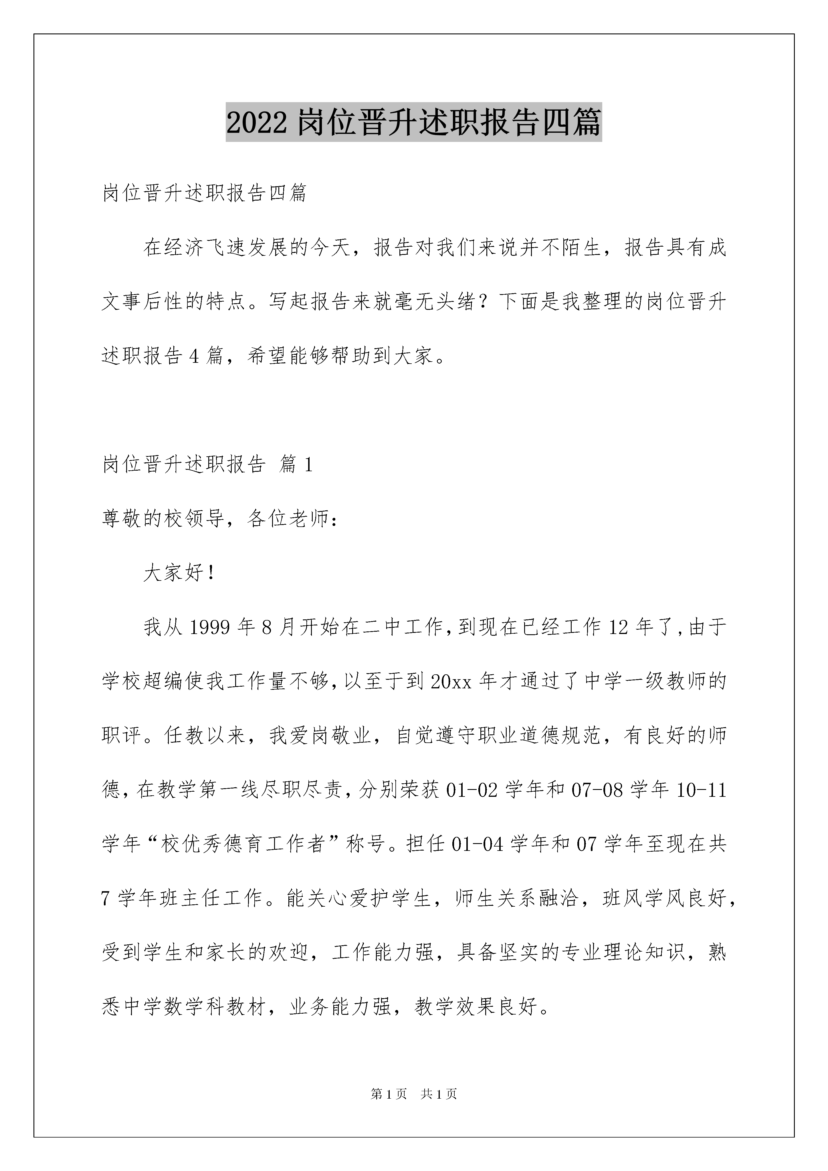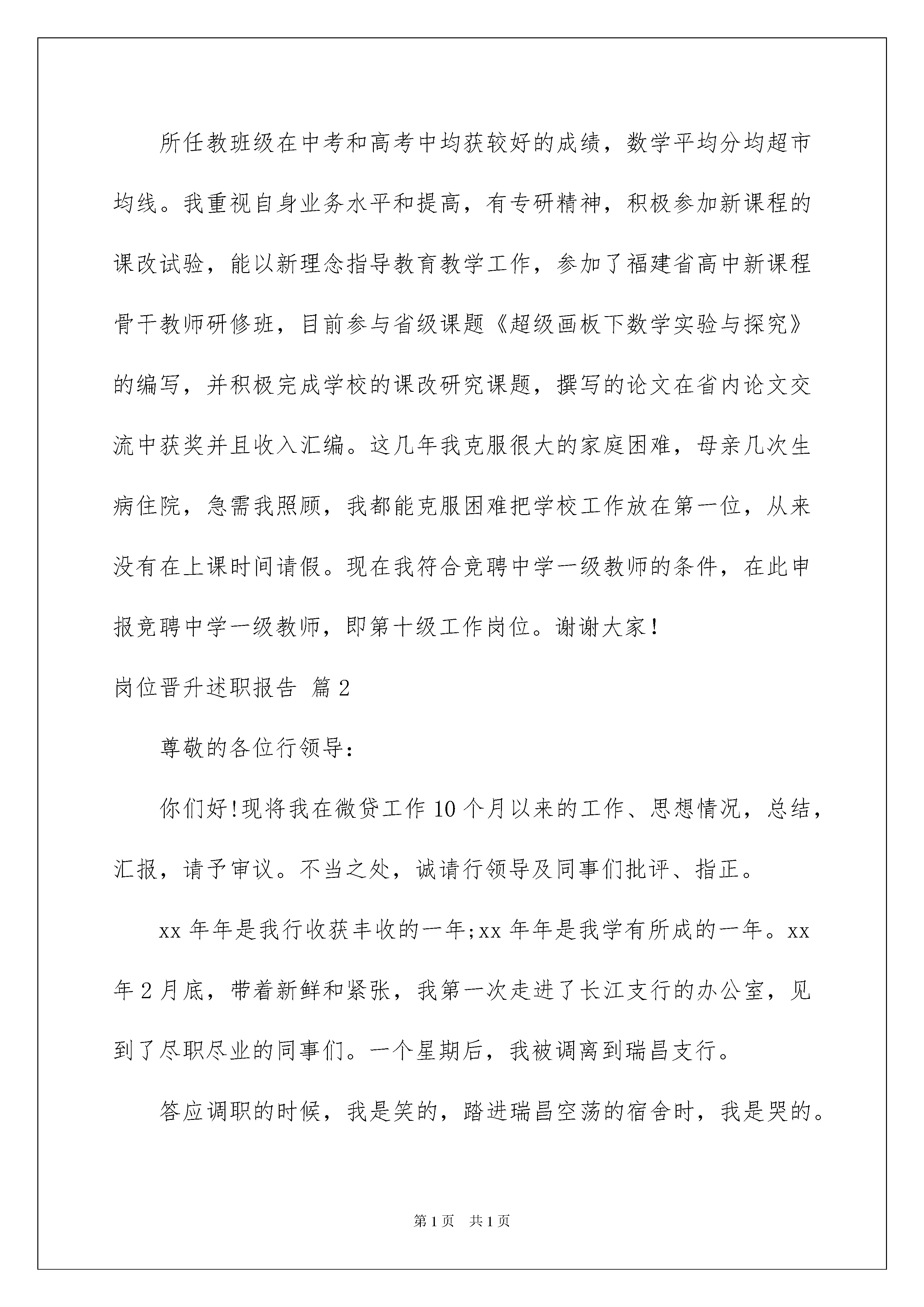 2022岗位晋升述职报告四篇岗位晋升述职报告四篇在经济飞速发展的今天,报告对我们来说并不陌生,报告具有成文事后性的特点。写起报告来就毫无头绪?下面是我整理的岗位晋升述职报告4篇,希望能够帮助到大家。岗位晋升述职报告篇1尊敬的校领导,各位老师:大家好!我从1999年8月开始在二中工作,到现在已经工作12年了,由于学校超编使我工作量不够,以至于到20xx年才通过了中学一级教师的职评。任教以来,我爱岗敬业,自觉遵守职业道德规范,有良好的师德,在教学第一线尽职尽责,分别荣获01-02学年和07-08学年10-11学年“校优秀德育工作者”称号。担任01-04学年和07学年至现在共7学年班主任工作。能关心爱护学生,师生关系融洽,班风学风良好,受到学生和家长的欢迎,工作能力强,具备坚实的专业理论知识,熟悉中学数学科教材,业务能力强,教学效果良好。所任教班级在中考和高考中均获较好的成绩,数学平均分均超市均线。我重视自身业务水平和提高,有专研精神,积极参加新课程的课改试验,能以新理念指导教育教学工作,参加了福建省高中新课程骨干教师研修班,目前参与省级课题《超级画板下数学实验与探究》的编写,并积极完成学校的课改研究课题,撰写的论文在省内论文交流中获奖并且收入汇编。这几年我克服很大的家庭困难,母亲几次生病住院,急需我照顾,我都能克服困难把学校工作放在第一位,从来没有在上课时间请假。现在我符合竞聘中学一级教师的条件,在此申报竞聘中学一级教师,即第十级工作岗位。谢谢大家!岗位晋升述职报告篇2尊敬的各位行领导:你们好!现将我在微贷工作10个月以来的工作、思想情况,总结,汇报,请予审议。不当之处,诚请行领导及同事们批评、指正。xx年年是我行收获丰收的一年;xx年年是我学有所成的一年。xx年2月底,带着新鲜和紧张,我第一次走进了长江支行的办公室,见到了尽职尽业的同事们。一个星期后,我被调离到瑞昌支行。答应调职的时候,我是笑的,踏进瑞昌空荡的宿舍时,我是哭的。异地生活的艰苦;开展工作的辛酸时常让我感叹生活的不易,但是我仍然忘我地工作。刚去瑞昌的时候,经常找不到地方吃饭,饿肚子是常事。上班也是面对同事,下班也是面对同事,做梦都在算客户的权益。做市场的时候,从瑞昌的东头走到西头,挨家挨户的发传单,一排一排地数店铺的数量,统计行业的分布。这些前期准备工作很快让我们看到了成效。许多带着疑惑的客户纷纷来到银行大厅,一句句:“你这个小额贷款怎么贷法?”的声音不断传来,分到手中的贷款,从两位数好不容易做到了一位,又很快变成了两位数。微贷瑞昌分中心的业绩也让人惊喜。一、工作业绩在艰苦的环境中,我磨砺自己,给自己压力,从而快速成长。在几位顾问和师傅的带领下,从实习开始,我便以个人名义独立放款。在4月底的时候就独立分析贷款。七月初调离瑞昌支行的时候,共计发放贷款24笔,当时的余额已达到50万。调到湓浦支行时,分配到我名下的贷款为25笔,余额50至60万。目前,现行的贷款笔数为39,贷款总额166.3万,余额118.8万。包括7月调职时分配到我名下的贷款,按贷款流程汇总统计可知:申请139笔,分析105笔,审贷会审核52笔,批准52笔,发放47笔,被银行拒绝75笔,被客户拒绝16笔。在瑞昌支行工作期间无逾期客户,在湓浦支行工作以来出现3人次逾期情况。3次均为同一客户,一般逾期1-5天,目前该客户已按计划于12月底还清全部贷款,没有给我行带来资产损失。二、控制风险,积极回收贷款在工作中,我时刻铭记资产质量是生命的经营理念。时刻提醒自己,每天都在和风险打交道,我们必须保证储户的每一分钱都能合理地发放,合法地使用,安全地回收。所以,工作中,我严格遵守贷款流程,该问客户的问题,一定问,该搜集的资料毫不忽视。在资料整理汇报过程中,不弄虚作假,实事求是。能放的贷款,一定为客户据以力争;不能发放的贷款,坚决不放;可放可不放的,仔细斟酌,权衡利弊再作出决定。古人云“三思而后行”,我坚持用审慎的态度去处理每一笔贷款,尽可能地控制住每笔贷款的风险。并且牢记防范是控制风险的最好方法。在贷款发放之后,和客户经常客户联系,既了解客户生意变动情况,又和客户保持良好的关系,为我们争取来更多的客户。当客户出现逾期情况后,不断地通过各种方法给客户施加压力。要让客户明白一个道理,欠商业银行的钱是躲不掉的,信贷员会像讨回自己家的钱一样,拿出浑身解数去催款。一般客户感受到这样的信息之后,便不再耍赖,按时还款。三、积极沟通,提高满意度在与客户沟通方面,既维护银行的利益和形象,在客户面前热忱大方,不卑不亢;又能注意客户满意度,不光是只为客户回答有关小额贷款的问题,还尽量