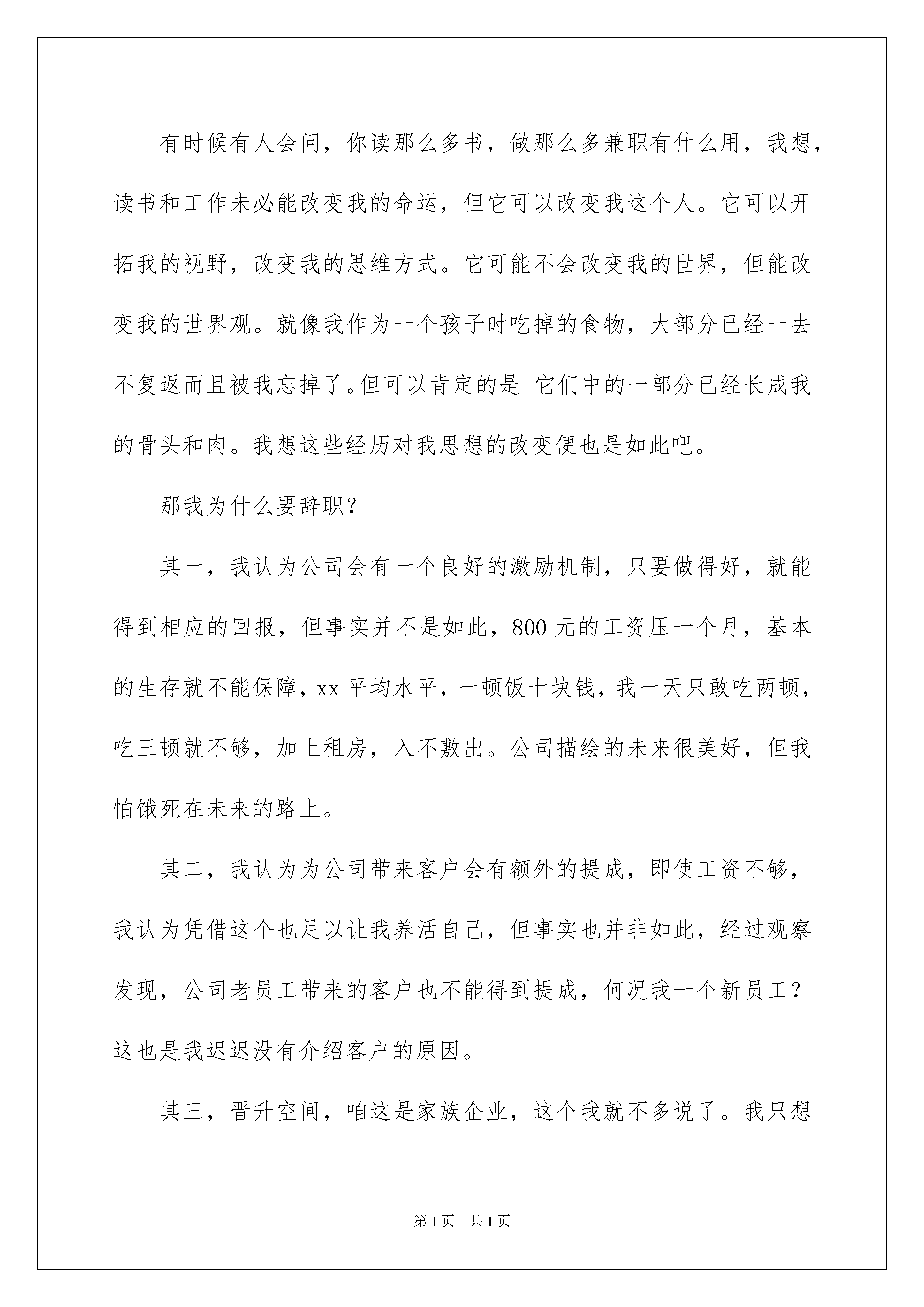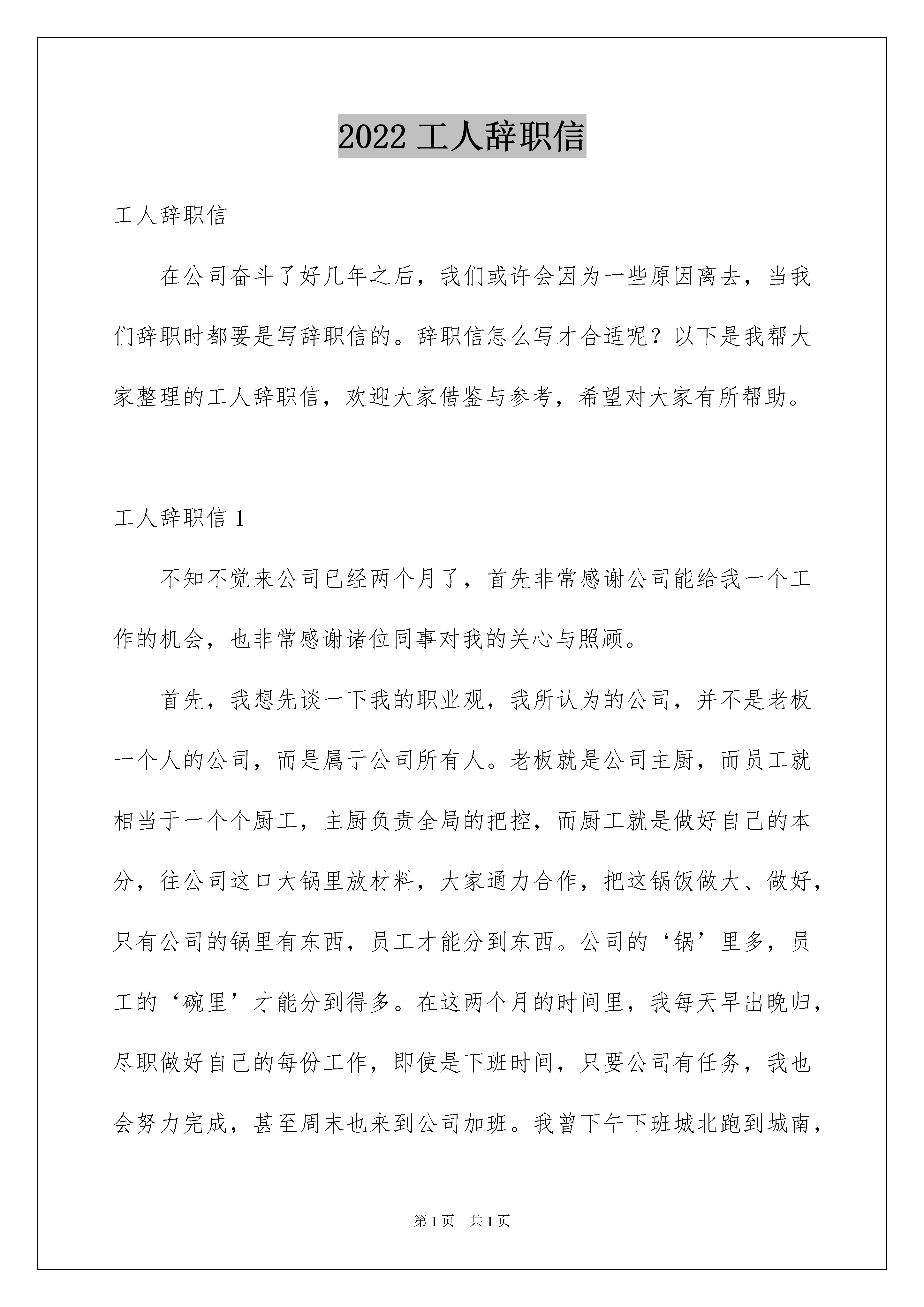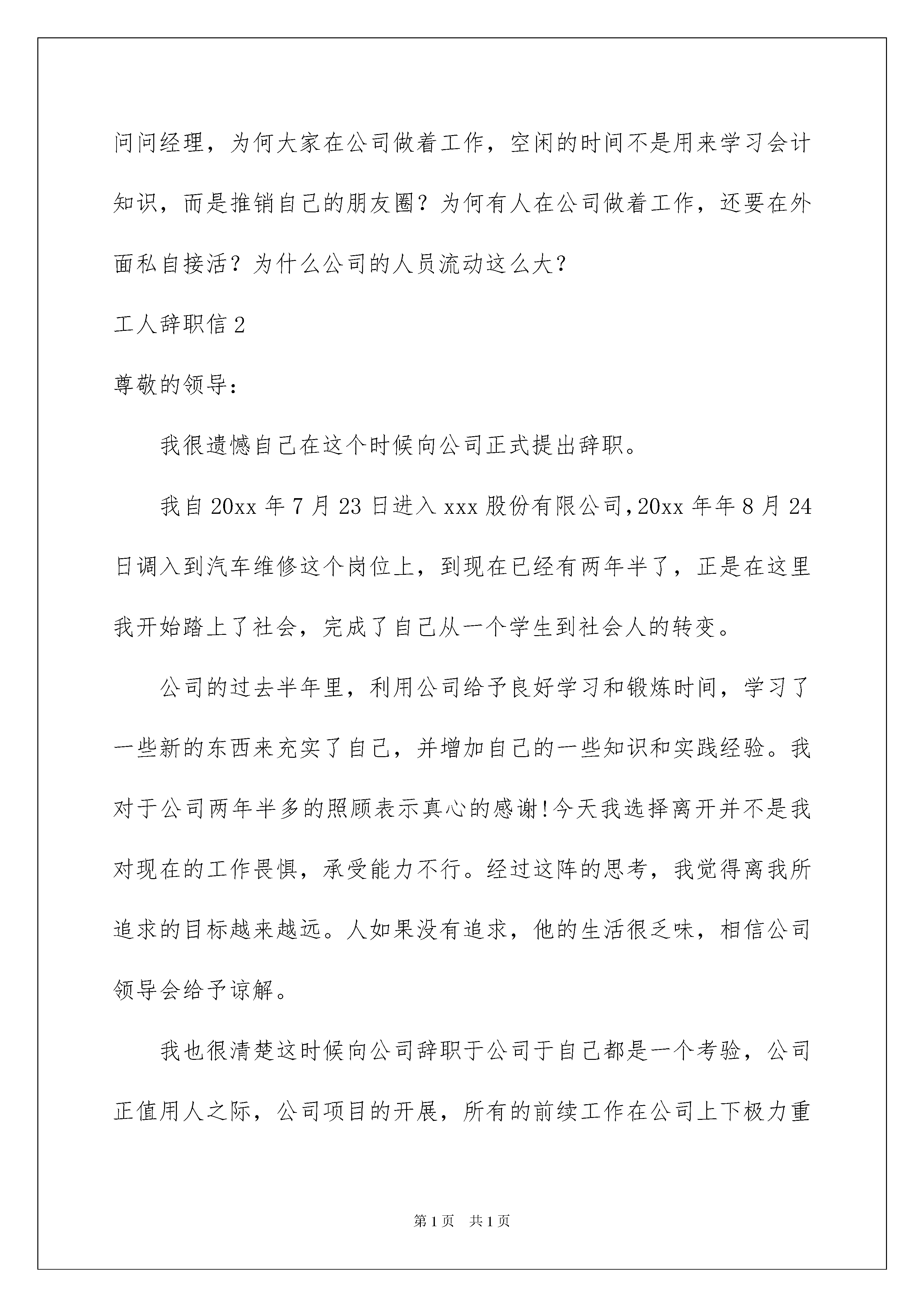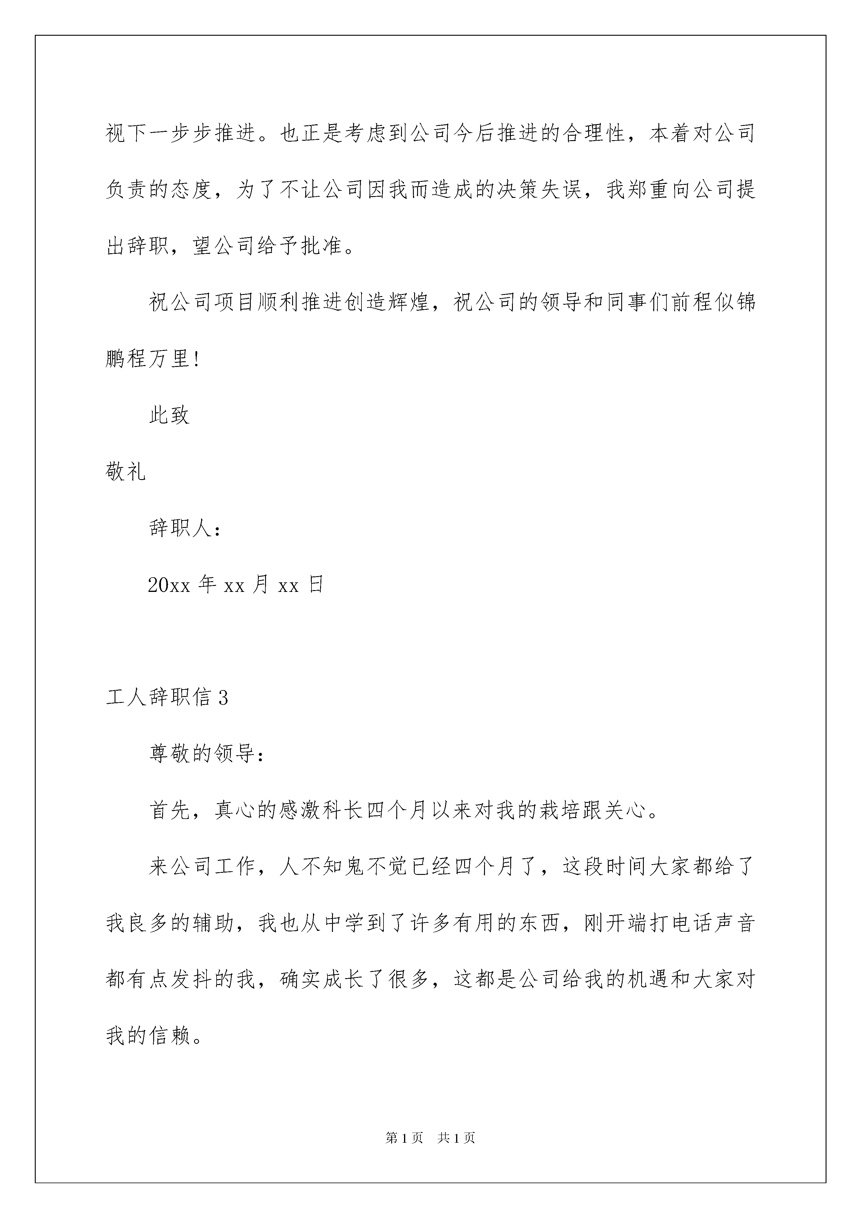 2022工人辞职信工人辞职信在公司奋斗了好几年之后,我们或许会因为一些原因离去,当我们辞职时都要是写辞职信的。辞职信怎么写才合适呢?以下是我帮大家整理的工人辞职信,欢迎大家借鉴与参考,希望对大家有所帮助。工人辞职信1不知不觉来公司已经两个月了,首先非常感谢公司能给我一个工作的机会,也非常感谢诸位同事对我的关心与照顾。首先,我想先谈一下我的职业观,我所认为的公司,并不是老板一个人的公司,而是属于公司所有人。老板就是公司主厨,而员工就相当于一个个厨工,主厨负责全局的把控,而厨工就是做好自己的本分,往公司这口大锅里放材料,大家通力合作,把这锅饭做大、做好,只有公司的锅里有东西,员工才能分到东西。公司的‘锅’里多,员工的‘碗里’才能分到得多。在这两个月的时间里,我每天早出晚归,尽职做好自己的每份工作,即使是下班时间,只要公司有任务,我也会努力完成,甚至周末也来到公司加班。我曾下午下班城北跑到城南,在客户公司待到晚上八点,也曾因为公司催促任务,几个晚上待在公司彻夜通宵。有时间同事会看到我早上不到七点半就来到公司,并不是因为我来得早,那是因为我晚上跟本就没回去。第一个月进入财务二部,有五家公司要做账,我在同事协助下完成了工作。第二个月,十七家公司的账目我已经基本可以独立完成。我并不是一个怕吃苦的人,工厂流水线,地下停车场打扫卫生,室内装修,在田地里帮人背烟叶,这些活我都做过,并且我做过的每一份工作,也从不会凑合,都尽自己最大努力去做好。11年淮安电子工厂流水线,仅仅两个月的工作,厂区主管留我当线长,然而我以学业为重,婉言相拒。14年我们附近某村镇招人烟田干活,从一开始工作,我俨然与一个干过五六年的村民无异。15年广州萝岗万达广场,十五天的清洁工作,得到卫生主管领导的一致好评。这些还只是我实习经历的一小部分,虽然与我的专业并不相关,但是每一份工作我都会认真对待,努力做到最好。人们现在常说的就是,现在的大学生吃不了苦,但对我来说,吃苦算不得什么,主要看你能得到什么。一份工作即使再枯燥,能把它做到极致,也是一种能力。有时候有人会问,你读那么多书,做那么多兼职有什么用,我想,读书和工作未必能改变我的命运,但它可以改变我这个人。它可以开拓我的视野,改变我的思维方式。它可能不会改变我的世界,但能改变我的世界观。就像我作为一个孩子时吃掉的食物,大部分已经一去不复返而且被我忘掉了。但可以肯定的是它们中的一部分已经长成我的骨头和肉。我想这些经历对我思想的改变便也是如此吧。那我为什么要辞职?其一,我认为公司会有一个良好的激励机制,只要做得好,就能得到相应的回报,但事实并不是如此,800元的工资压一个月,基本的生存就不能保障,xx平均水平,一顿饭十块钱,我一天只敢吃两顿,吃三顿就不够,加上租房,入不敷出。公司描绘的未来很美好,但我怕饿死在未来的路上。其二,我认为为公司带来客户会有额外的提成,即使工资不够,我认为凭借这个也足以让我养活自己,但事实也并非如此,经过观察发现,公司老员工带来的客户也不能得到提成,何况我一个新员工?这也是我迟迟没有介绍客户的原因。其三,晋升空间,咱这是家族企业,这个我就不多说了。我只想问问经理,为何大家在公司做着工作,空闲的时间不是用来学习会计知识,而是推销自己的朋友圈?为何有人在公司做着工作,还要在外面私自接活?为什么公司的人员流动这么大?工人辞职信2尊敬的领导:我很遗憾自己在这个时候向公司正式提出辞职。我自20xx年7月23日进入xxx股份有限公司,20xx年年8月24日调入到汽车维修这个岗位上,到现在已经有两年半了,正是在这里我开始踏上了社会,完成了自己从一个学生到社会人的转变。公司的过去半年里,利用公司给予良好学习和锻炼时间,学习了一些新的东西来充实了自己,并增加自己的一些知识和实践经验。我对于公司两年半多的照顾表示真心的感谢!今天我选择离开并不是我对现在的工作畏惧,承受能力不行。经过这阵的思考,我觉得离我所追求的目标越来越远。人如果没有追求,他的生活很乏味,相信公司领导会给予谅解。我也很清楚这时候向公司辞职于公司于自己都是一个考验,公司正值用人之际,公司项目的开展,所有的前续工作在公司上下极力重视下一步步推进。也正是考虑到公司今后推进的合理性,本着对公司负责的态度,为了不让公司因我而造成的决策失误,我郑重向公司提出辞职,望公司给予批准。祝公司项目顺利推进创造辉煌,祝公司的领导和同事们前程似锦鹏程万里!此致敬礼辞职人:20xx年xx月xx日工人辞职信3尊敬的领导:首先,真心的感激科长四个月以来对我的栽培跟关心。来公司工作,人不知鬼不觉已经四个月了,这段时间大家都给了我良多的
