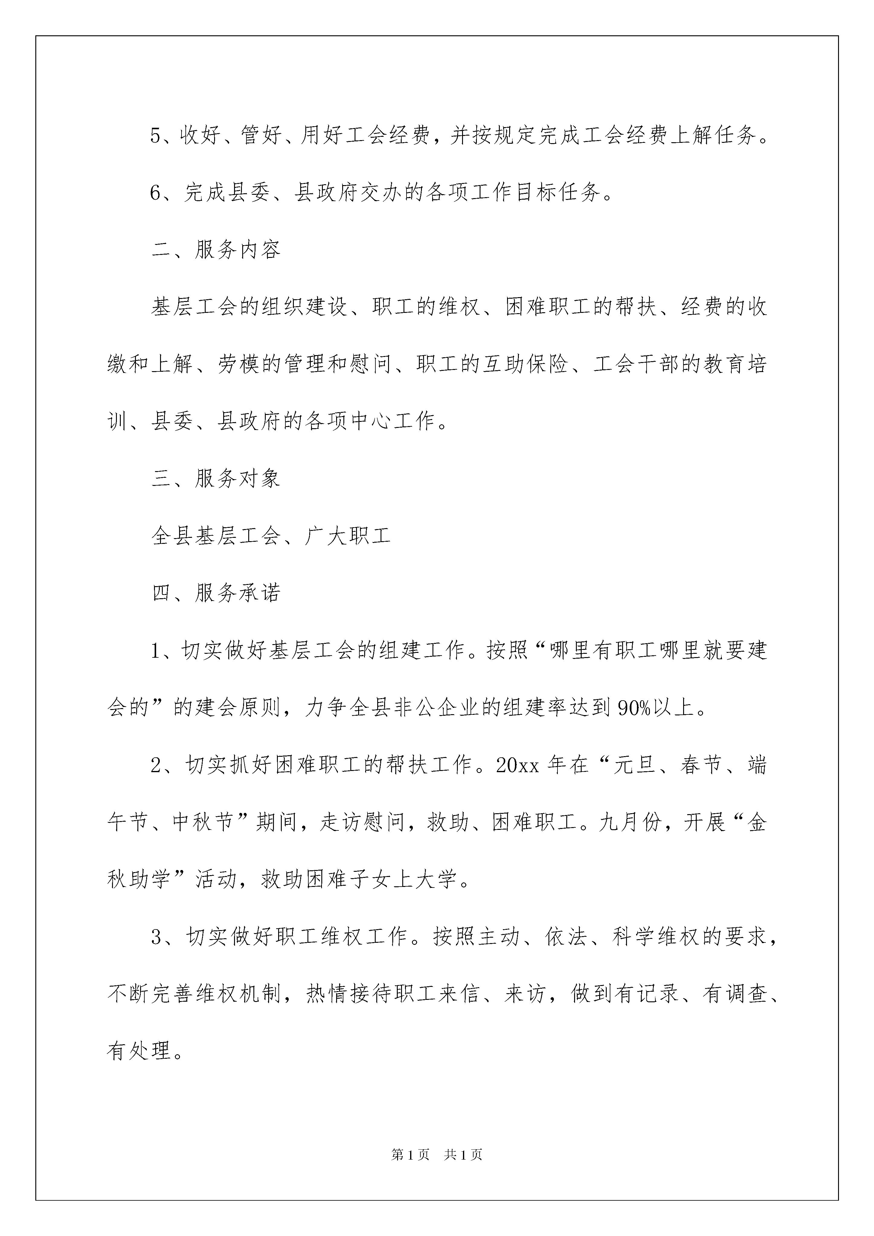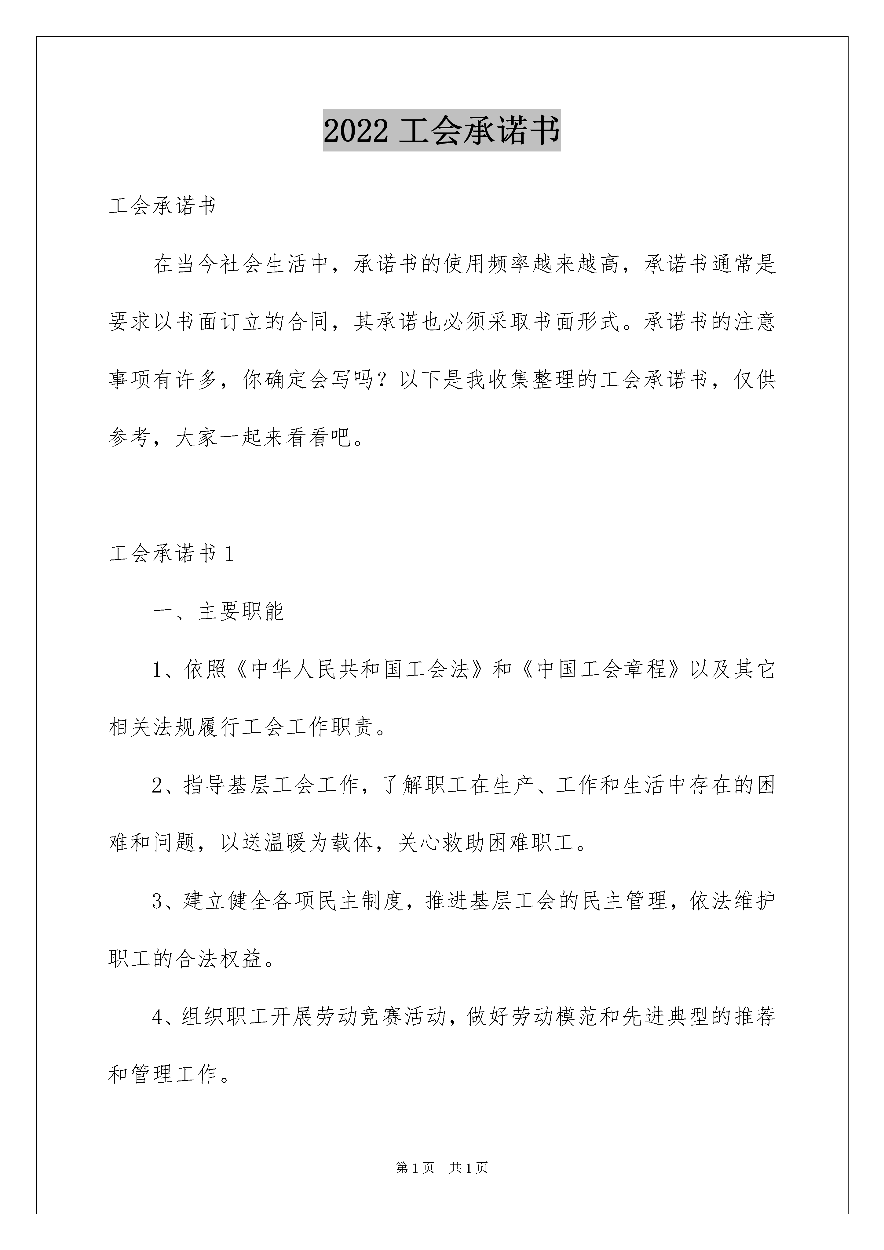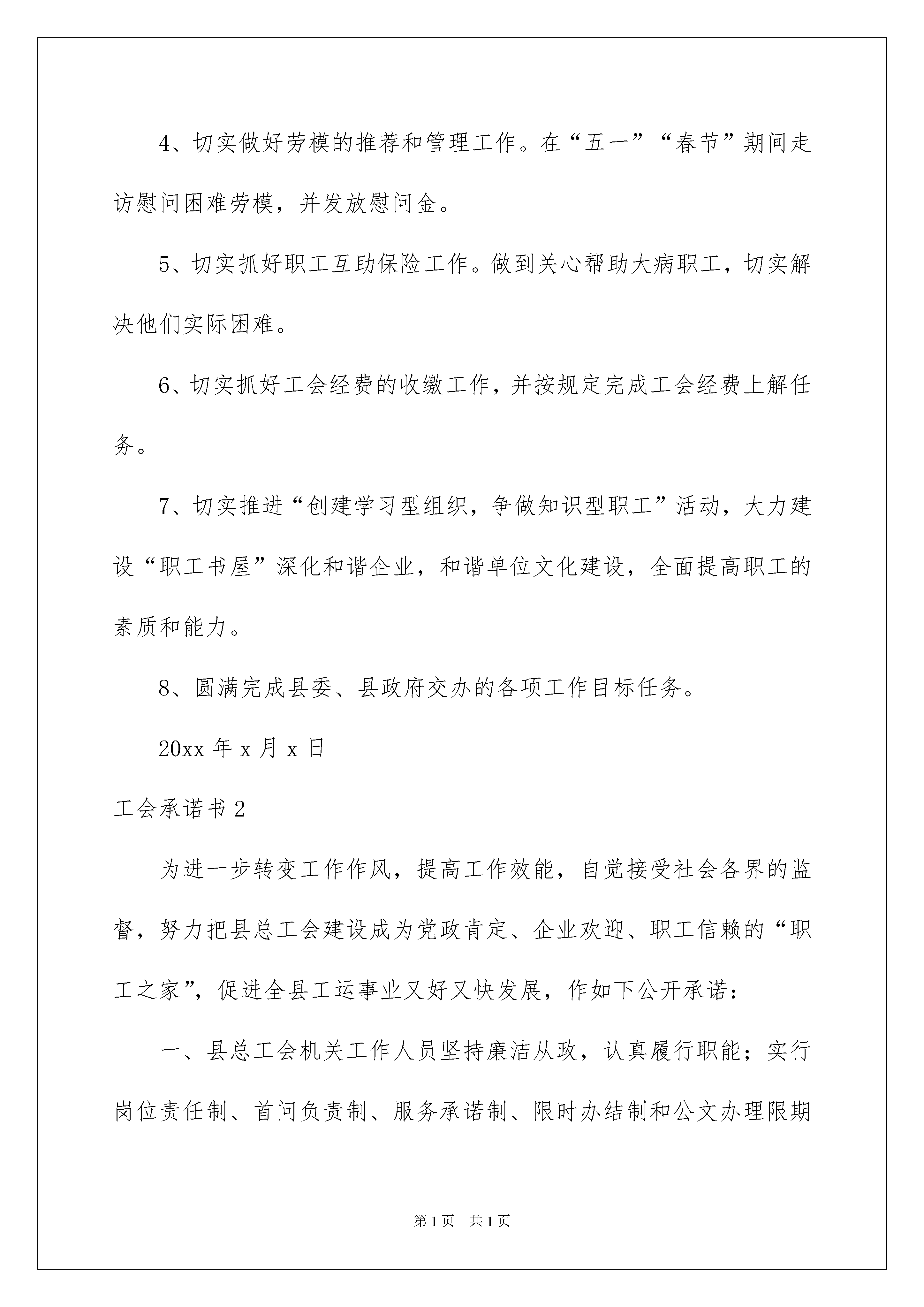 2022工会承诺书工会承诺书在当今社会生活中,承诺书的使用频率越来越高,承诺书通常是要求以书面订立的合同,其承诺也必须采取书面形式。承诺书的注意事项有许多,你确定会写吗?以下是我收集整理的工会承诺书,仅供参考,大家一起来看看吧。工会承诺书1一、主要职能1、依照《中华人民共和国工会法》和《中国工会章程》以及其它相关法规履行工会工作职责。2、指导基层工会工作,了解职工在生产、工作和生活中存在的困难和问题,以送温暖为载体,关心救助困难职工。3、建立健全各项民主制度,推进基层工会的民主管理,依法维护职工的合法权益。4、组织职工开展劳动竞赛活动,做好劳动模范和先进典型的推荐和管理工作。5、收好、管好、用好工会经费,并按规定完成工会经费上解任务。6、完成县委、县政府交办的各项工作目标任务。二、服务内容基层工会的组织建设、职工的维权、困难职工的帮扶、经费的收缴和上解、劳模的管理和慰问、职工的互助保险、工会干部的教育培训、县委、县政府的各项中心工作。三、服务对象全县基层工会、广大职工四、服务承诺1、切实做好基层工会的组建工作。按照“哪里有职工哪里就要建会的”的建会原则,力争全县非公企业的组建率达到90%以上。2、切实抓好困难职工的帮扶工作。20xx年在“元旦、春节、端午节、中秋节”期间,走访慰问,救助、困难职工。九月份,开展“金秋助学”活动,救助困难子女上大学。3、切实做好职工维权工作。按照主动、依法、科学维权的要求,不断完善维权机制,热情接待职工来信、来访,做到有记录、有调查、有处理。4、切实做好劳模的推荐和管理工作。在“五一”“春节”期间走访慰问困难劳模,并发放慰问金。5、切实抓好职工互助保险工作。做到关心帮助大病职工,切实解决他们实际困难。6、切实抓好工会经费的收缴工作,并按规定完成工会经费上解任务。7、切实推进“创建学习型组织,争做知识型职工”活动,大力建设“职工书屋”深化和谐企业,和谐单位文化建设,全面提高职工的素质和能力。8、圆满完成县委、县政府交办的各项工作目标任务。20xx年x月x日工会承诺书2为进一步转变工作作风,提高工作效能,自觉接受社会各界的监督,努力把县总工会建设成为党政肯定、企业欢迎、职工信赖的“职工之家”,促进全县工运事业又好又快发展,作如下公开承诺:一、县总工会机关工作人员坚持廉洁从政,认真履行职能;实行岗位责任制、首问负责制、服务承诺制、限时办结制和公文办理限期制;使用文明用语,热情周到、诚恳耐心、特事特办。二、基层单位工会咨询请示工作,情况清楚的,当即予以答复;需请示研究的,五个工作日内答复。三、基层单位工会组建(或换届),选举程序规范、选举结果报告符合要求的,七个工作日内予以批复。四、基层工会办理法人资格登记,资料齐全、符合条件的,七个工作日内送市总工会办理。五、随时保证开通的职工维权热线电话畅通,接到来电、来访,能解答的及时解答;不能解答的,转到其它相关部门,并在三个工作日内告知当事人。六、对困难职工申请救助,符合条件者及时给予救助,对特别困难的再帮助其向市总工会申请救助。七、做好劳动模范的管理和服务工作。受上级总工会委托,做好劳动模范的评选工作。按照有关规定,每年对全国(省部级)劳模发放三金(慰问金、低收入生活困难补助、特殊困难帮扶金);重大节日组织开展活动;不定期组织劳模体检和疗休养。承诺人:工会承诺书3一、带头学习,推动科学发展。认真学习党的路线方针政策,学习科学发展观,学习党的建设理论,不断提高工会组织思想政治水平,在组织职工服务科学发展中发挥模范带头作用,带动工会组织和广大会员的创先争优。工会委员每人撰写1篇学习体会文章。二、带头工作,促进院所和谐。做好本职工作,创新工作思路,争创工作佳绩,为完成院的中心工作任务作贡献;遵守纪律,热心公益,不断完善协调委的工作机制,引导职工依法、有序表达利益诉求,促进院所、社会和谐。三、带头服务,提高工作实效。以职工为本,主动倾听职工意愿和诉求,为职工办好事、办实事、解难事。组织开展职工喜闻乐见、丰富多彩的业余文化体育活动,不断满足职工日益增长的精神文化需求。做到“每年特困职工慰问必到,职工纠纷调解必到,职工住院必到,职工过世必到”。一、认真履行职责,全面完成任务。坚持客观公正、务实高效和公开透明、民主监督的原则,认真履行职责、全力做好职工维权援助、困难职工帮扶、工会会员服务工作,抓好工会财务管理、经费审查、劳模管理和女职工工作,认真开展职工经济技术创新工程。按照县委、县政府的要求,全面完成今年“创先争优”工作指标:一是抓好全县职工抗旱救灾捐款献爱心活动,力争捐款达3万以上;争取省、市总工会的大力支持,为全