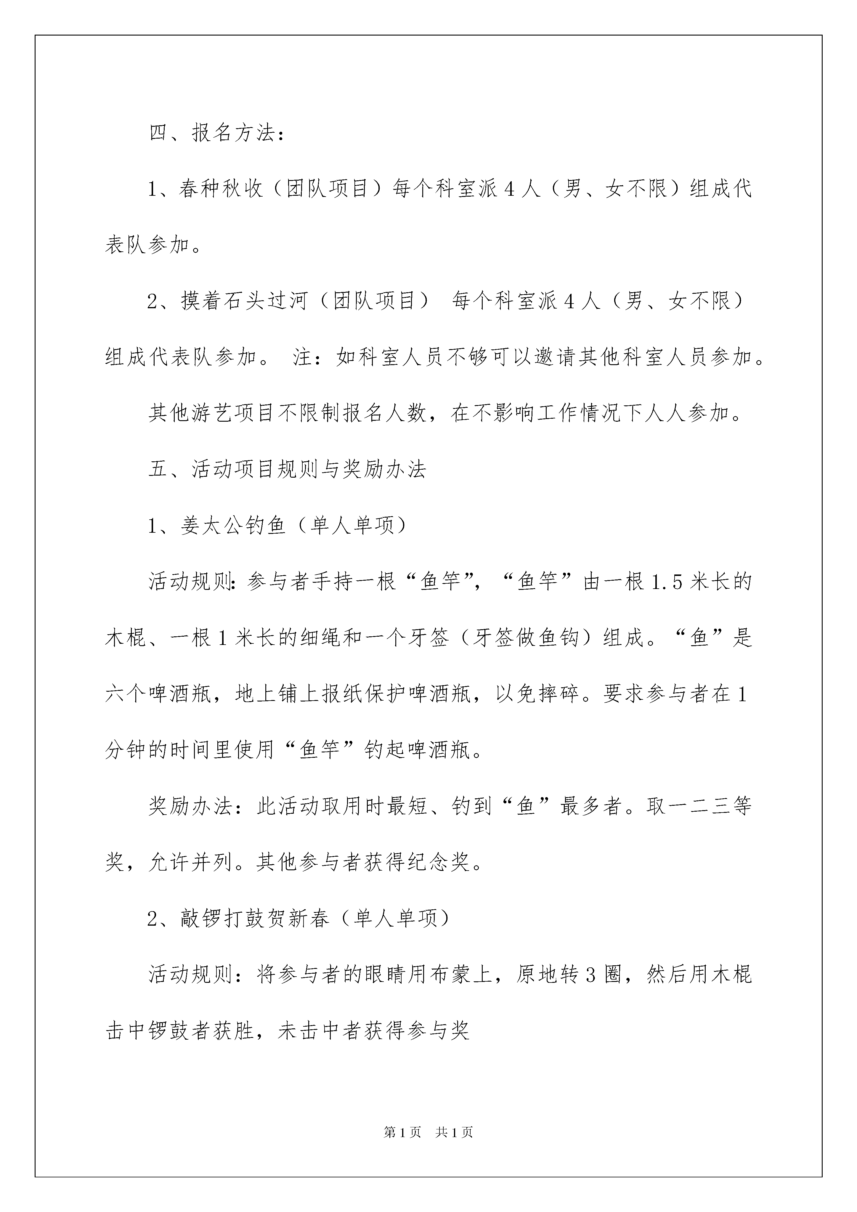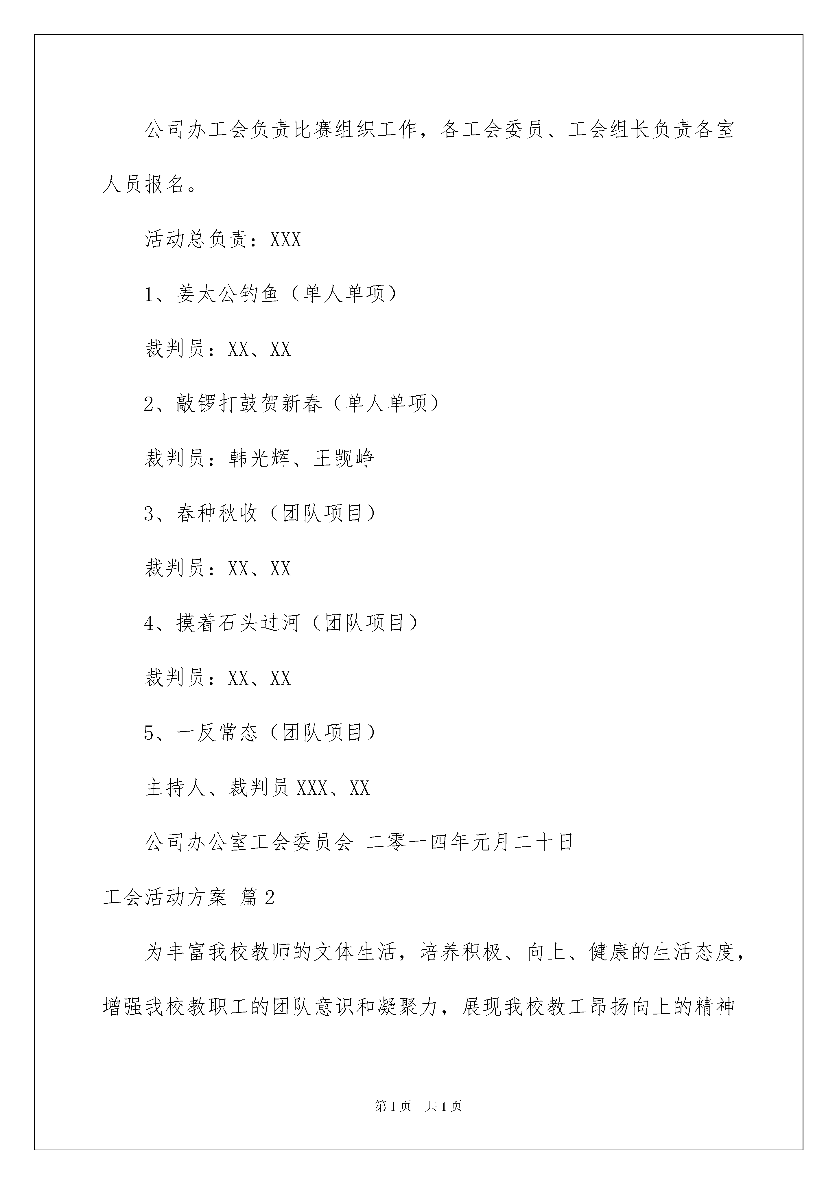 2022工会活动方案模板集锦7篇工会活动方案模板集锦7篇为了确保工作或事情能高效地开展,时常需要预先制定一份周密的方案,一份好的方案一定会注重受众的参与性及互动性。方案应该怎么制定呢?下面是我帮大家整理的工会活动方案7篇,欢迎阅读与收藏。工会活动方案篇1在新春佳节即将到来之际,为延续并深化XXX文化活动内涵,给各位员工营造开心愉悦、压力释放、和谐竞争、团结协作的氛围,更进一步凝聚人心,增强团队向心力与执行力。本着因地制宜、简约欢快、隆重热烈、适度拓展的原则,特开展本次活动。现将活动有关事项通知如下:一、活动时间:拟定20xx年1月23日下午14:30二、活动地点:6层会议室三、活动项目:姜太公钓鱼、敲锣打鼓贺新春、春种秋收(团队项目)、摸着石头过河(团队项目)、一反常态(团队项目)四、报名方法:1、春种秋收(团队项目)每个科室派4人(男、女不限)组成代表队参加。2、摸着石头过河(团队项目)每个科室派4人(男、女不限)组成代表队参加。注:如科室人员不够可以邀请其他科室人员参加。其他游艺项目不限制报名人数,在不影响工作情况下人人参加。五、活动项目规则与奖励办法1、姜太公钓鱼(单人单项)活动规则:参与者手持一根“鱼竿”,“鱼竿”由一根1.5米长的木棍、一根1米长的细绳和一个牙签(牙签做鱼钩)组成。“鱼”是六个啤酒瓶,地上铺上报纸保护啤酒瓶,以免摔碎。要求参与者在1分钟的时间里使用“鱼竿”钓起啤酒瓶。奖励办法:此活动取用时最短、钓到“鱼”最多者。取一二三等奖,允许并列。其他参与者获得纪念奖。2、敲锣打鼓贺新春(单人单项)活动规则:将参与者的眼睛用布蒙上,原地转3圈,然后用木棍击中锣鼓者获胜,未击中者获得参与奖奖励办法:击中者获得优胜奖,未击中者获纪念奖。3、春种秋收(团队项目)活动规则:每队4人,距离32米,中间每隔8米放一个瓶子,开始前每队4人站成一路纵队在起跑线后。第一位运动员手拿4束鲜花,听到出发口令后,快速往前跑。快速将1束鲜花插在瓶子里,继续往前跑,重复上述动作。直到4束鲜花分别插在4个瓶子里,然后跑回到起点,击掌交接后第二位运动员快速前跑依次将4个瓶子里的4束鲜花取回跑回起点递给第三位运动员,第三位运动员将4束鲜花依次插到4个瓶子里跑回,击掌交接后下位运动员出发;如上述方法循环,至四位运动员全部完成。全部完成的用时最少的队伍获胜。瓶子不能倒地,如倒地须及时扶起,并计算犯规一次,加时3秒;鲜花必须插在瓶子里。如没插准、掉地上、须及时重插,且不能碰倒瓶子。奖励办法:本活动取团体一等奖。其他队伍发给纪念奖。4、摸着石头过河(团队项目)活动规则:每队4人,迎面接力,每道3块“石头”(木板长20cm宽10cm高5cm),赛距为15米,开赛前,参赛队员在各自赛道的起点线后,第一名队员手持一块石头,两脚分别站在起点线后的两块石头上。发令后,队员先将手中石头放置在前方适当位置,然后脚踩在前方石头上,再取回身后的石头并放置在前方适当位置,依次反复前进直至终点,以人过终点线后捡起终点线内的最后一块石头为完成,第二名队员同样方式返回,依次进行,直至4名队员全部完成即为该队成功。队员双脚须各踩在一块石头上才能去拾身后空出的石头,途中队员身体的任何部位均不得触及地面,单手、单脚触地一次加时2秒。如双手、双脚触地,即从该队员起跑处重来。奖惩规则:取用时最少的团队获得一等奖,其他队伍发给纪念奖。5、一反常态(团队项目)活动规则:每队派出来4名队员,排成一列,主持人念出口令或动作,相对应的每队成员做出相反的动作,动做错误的人直接出局淘汰,在1分钟的时间内,剩余人数最多的队伍获胜。例如:主持人说举右手,队员则举左手,说抬左脚,队员则抬右脚。奖励办法:该活动取一等奖。其他人员获得纪念奖。六、活动组织工作公司办工会负责比赛组织工作,各工会委员、工会组长负责各室人员报名。活动总负责:XXX1、姜太公钓鱼(单人单项)裁判员:XX、XX2、敲锣打鼓贺新春(单人单项)裁判员:韩光辉、王觊峥3、春种秋收(团队项目)裁判员:XX、XX4、摸着石头过河(团队项目)裁判员:XX、XX5、一反常态(团队项目)主持人、裁判员XXX、XX公司办公室工会委员会二零一四年元月二十日工会活动方案篇2为丰富我校教师的文体生活,培养积极、向上、健康的生活态度,增强我校教职工的团队意识和凝聚力,展现我校教工昂扬向上的精神风貌。经学校工会研究决定,举行全体教职工活动,具体方案如下:一、时间:3月24日下午4:20分。二、地点:学校校门口至小观音岩(邓全新房屋)三、参加对象:全体教职工(部分除外)四、登山活动工作人员安排:1、总指挥:宋兴平2
