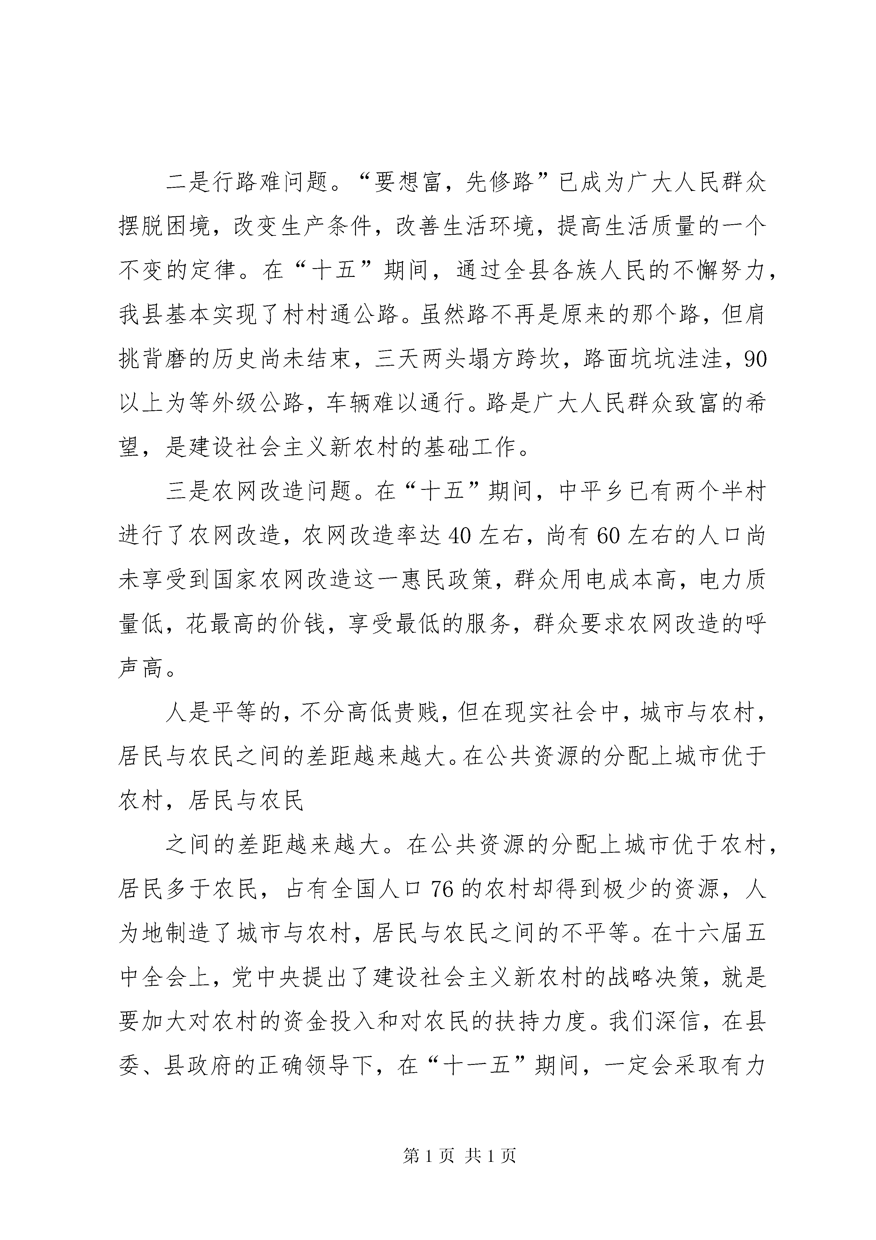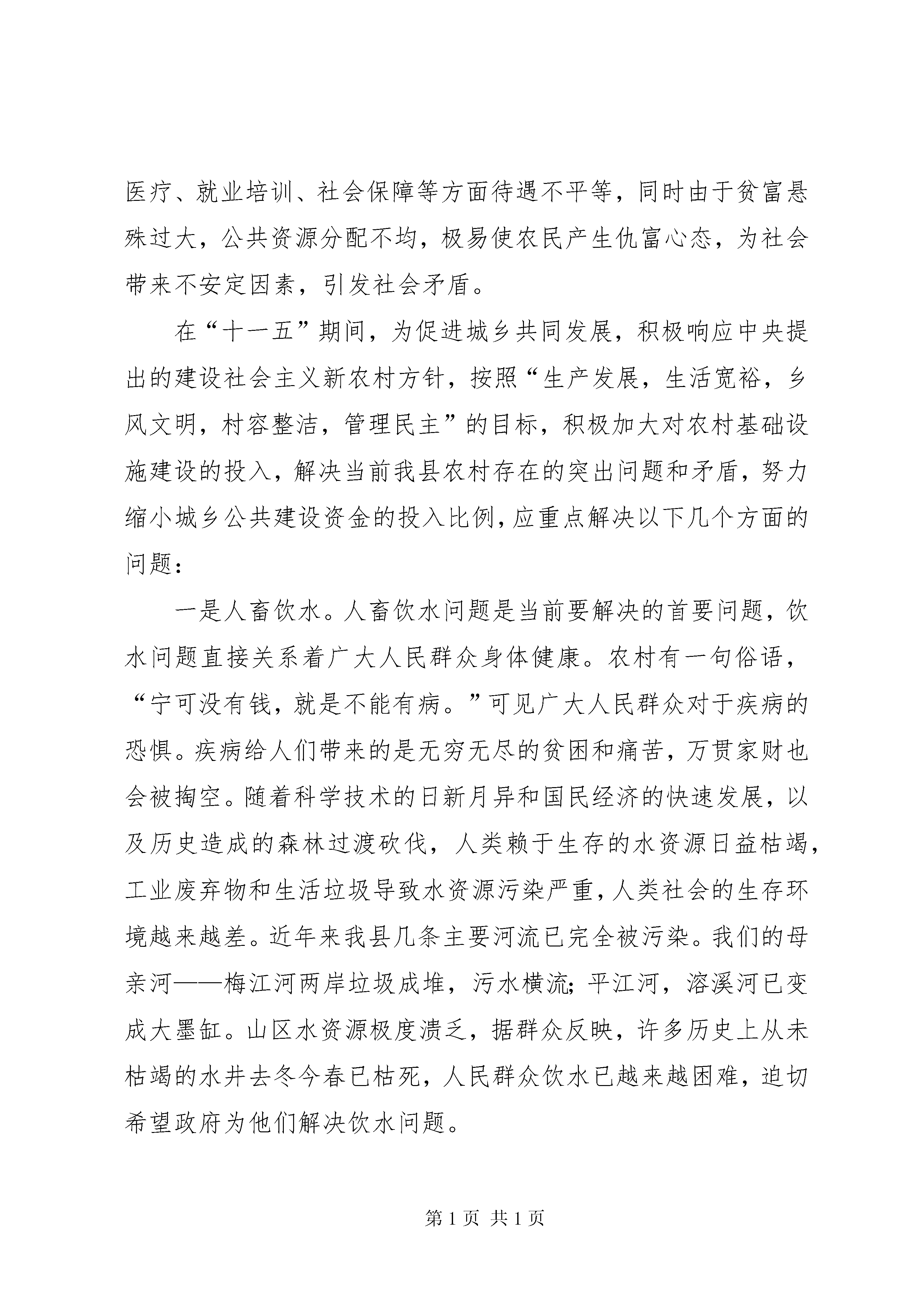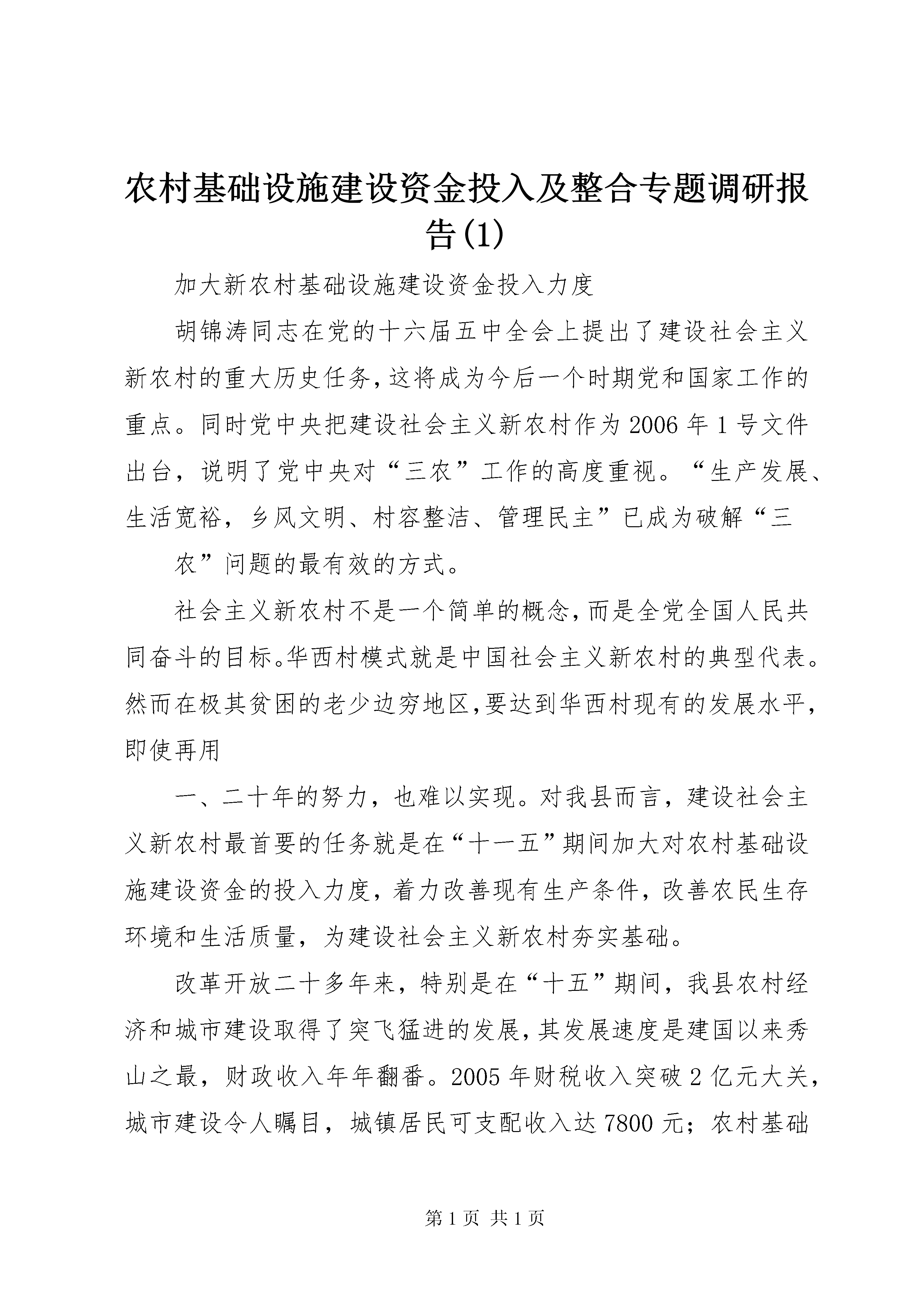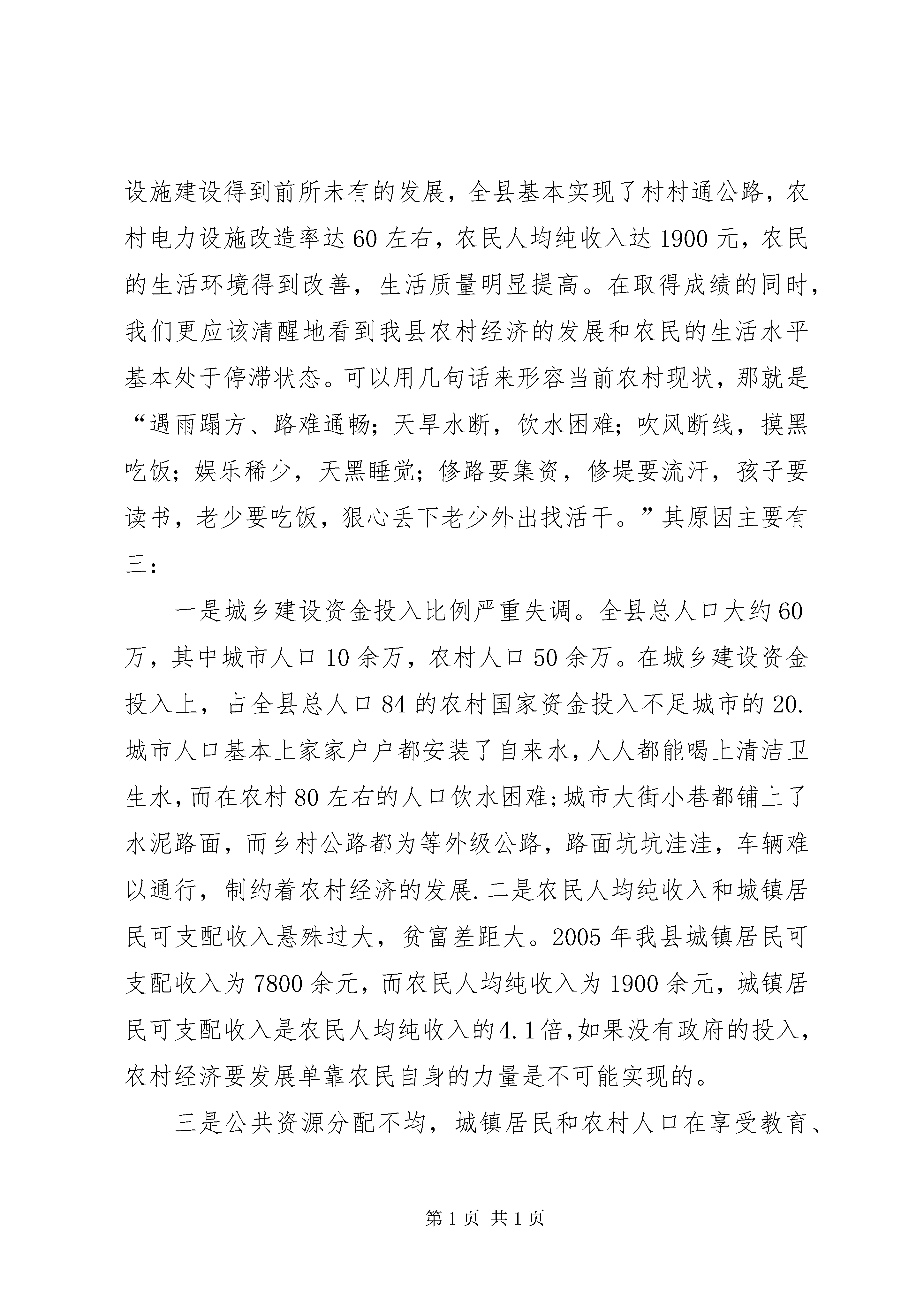 农村基础设施建设资金投入及整合专题调研报告(1)加大新农村基础设施建设资金投入力度胡锦涛同志在党的十六届五中全会上提出了建设社会主义新农村的重大历史任务,这将成为今后一个时期党和国家工作的重点。同时党中央把建设社会主义新农村作为2006年1号文件出台,说明了党中央对“三农”工作的高度重视。“生产发展、生活宽裕,乡风文明、村容整洁、管理民主”已成为破解“三农”问题的最有效的方式。社会主义新农村不是一个简单的概念,而是全党全国人民共同奋斗的目标。华西村模式就是中国社会主义新农村的典型代表。然而在极其贫困的老少边穷地区,要达到华西村现有的发展水平,即使再用一、二十年的努力,也难以实现。对我县而言,建设社会主义新农村最首要的任务就是在“十一五”期间加大对农村基础设施建设资金的投入力度,着力改善现有生产条件,改善农民生存环境和生活质量,为建设社会主义新农村夯实基础。改革开放二十多年来,特别是在“十五”期间,我县农村经济和城市建设取得了突飞猛进的发展,其发展速度是建国以来秀山之最,财政收入年年翻番。2005年财税收入突破2亿元大关,城市建设令人瞩目,城镇居民可支配收入达7800元;农村基础设施建设得到前所未有的发展,全县基本实现了村村通公路,农村电力设施改造率达60左右,农民人均纯收入达1900元,农民的生活环境得到改善,生活质量明显提高。在取得成绩的同时,我们更应该清醒地看到我县农村经济的发展和农民的生活水平基本处于停滞状态。可以用几句话来形容当前农村现状,那就是“遇雨蹋方、路难通畅;天旱水断,饮水困难;吹风断线,摸黑吃饭;娱乐稀少,天黑睡觉;修路要集资,修堤要流汗,孩子要读书,老少要吃饭,狠心丢下老少外出找活干。”其原因主要有三:一是城乡建设资金投入比例严重失调。全县总人口大约60万,其中城市人口10余万,农村人口50余万。在城乡建设资金投入上,占全县总人口84的农村国家资金投入不足城市的20.城市人口基本上家家户户都安装了自来水,人人都能喝上清洁卫生水,而在农村80左右的人口饮水困难;城市大街小巷都铺上了水泥路面,而乡村公路都为等外级公路,路面坑坑洼洼,车辆难以通行,制约着农村经济的发展.二是农民人均纯收入和城镇居民可支配收入悬殊过大,贫富差距大。2005年我县城镇居民可支配收入为7800余元,而农民人均纯收入为1900余元,城镇居民可支配收入是农民人均纯收入的4.1倍,如果没有政府的投入,农村经济要发展单靠农民自身的力量是不可能实现的。三是公共资源分配不均,城镇居民和农村人口在享受教育、医疗、就业培训、社会保障等方面待遇不平等,同时由于贫富悬殊过大,公共资源分配不均,极易使农民产生仇富心态,为社会带来不安定因素,引发社会矛盾。在“十一五”期间,为促进城乡共同发展,积极响应中央提出的建设社会主义新农村方针,按照“生产发展,生活宽裕,乡风文明,村容整洁,管理民主”的目标,积极加大对农村基础设施建设的投入,解决当前我县农村存在的突出问题和矛盾,努力缩小城乡公共建设资金的投入比例,应重点解决以下几个方面的问题:一是人畜饮水。人畜饮水问题是当前要解决的首要问题,饮水问题直接关系着广大人民群众身体健康。农村有一句俗语,“宁可没有钱,就是不能有病。”可见广大人民群众对于疾病的恐惧。疾病给人们带来的是无穷无尽的贫困和痛苦,万贯家财也会被掏空。随着科学技术的日新月异和国民经济的快速发展,以及历史造成的森林过渡砍伐,人类赖于生存的水资源日益枯竭,工业废弃物和生活垃圾导致水资源污染严重,人类社会的生存环境越来越差。近年来我县几条主要河流已完全被污染。我们的母亲河——梅江河两岸垃圾成堆,污水横流;平江河,溶溪河已变成大墨缸。山区水资源极度溃乏,据群众反映,许多历史上从未枯竭的水井去冬今春已枯死,人民群众饮水已越来越困难,迫切希望政府为他们解决饮水问题。二是行路难问题。“要想富,先修路”已成为广大人民群众摆脱困境,改变生产条件,改善生活环境,提高生活质量的一个不变的定律。在“十五”期间,通过全县各族人民的不懈努力,我县基本实现了村村通公路。虽然路不再是原来的那个路,但肩挑背磨的历史尚未结束,三天两头塌方跨坎,路面坑坑洼洼,90以上为等外级公路,车辆难以通行。路是广大人民群众致富的希望,是建设社会主义新农村的基础工作。三是农网改造问题。在“十五”期间,中平乡已有两个半村进行了农网改造,农网改造率达40左右,尚有60左右的人口尚未享受到国家农网改造这一惠民政策,群众用电成本高,电力质量低,花最高的价钱,享受最低的服务,群众要求农网改造的呼声高。人是平等的,不分高低贵贱,但在现实社会中,城市与农村,居民与农民之间的差距越来越大。在公共资源的分配上城市优于农村,居民与农民之间的差距越来越大。在公共资源的分配上城市优于农村,居民多于农民,占