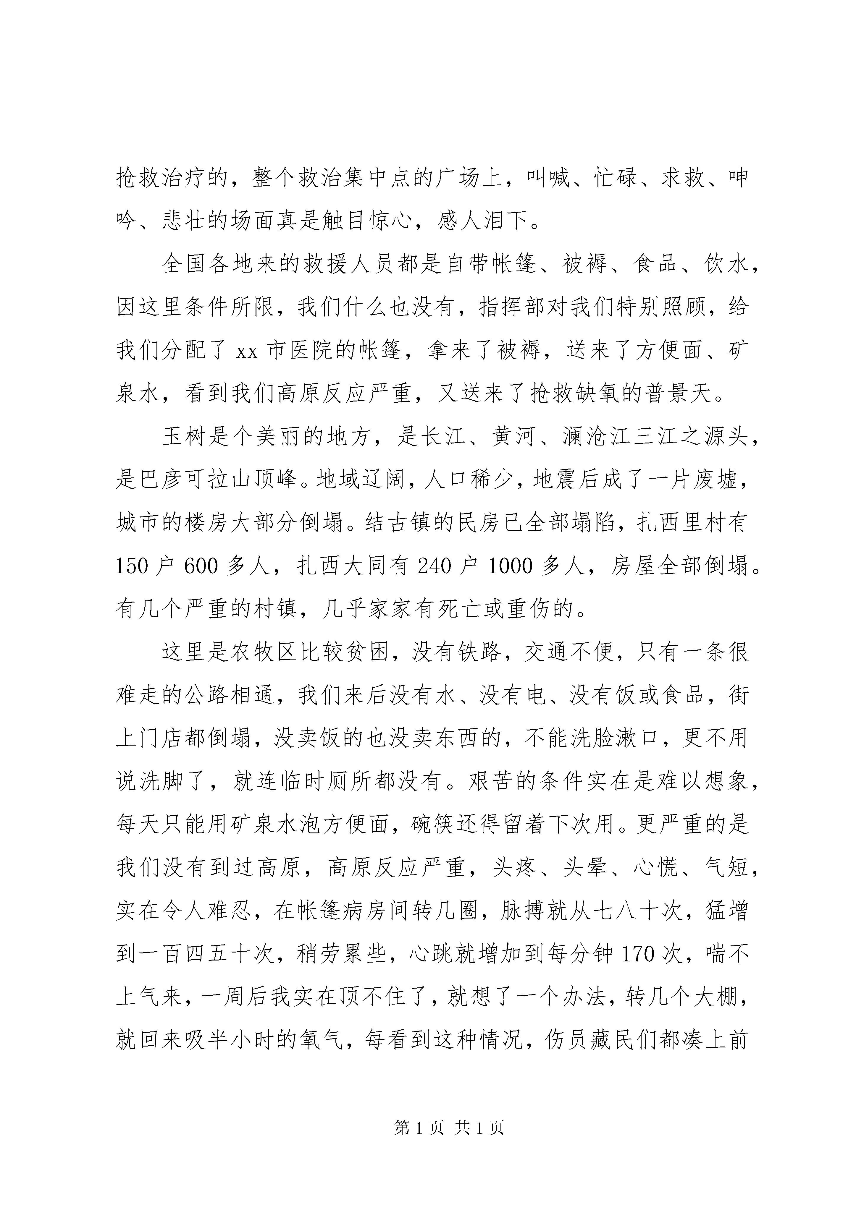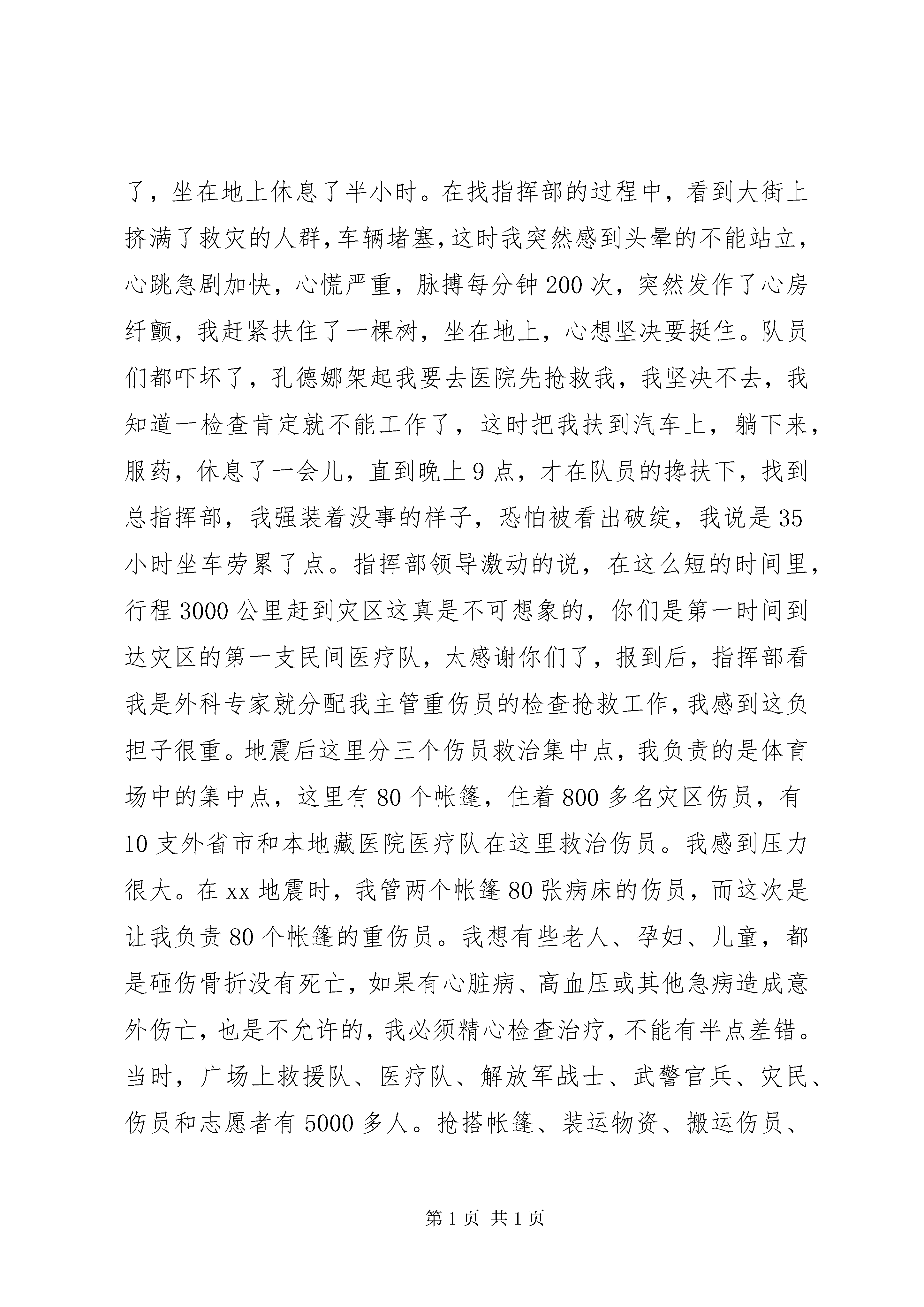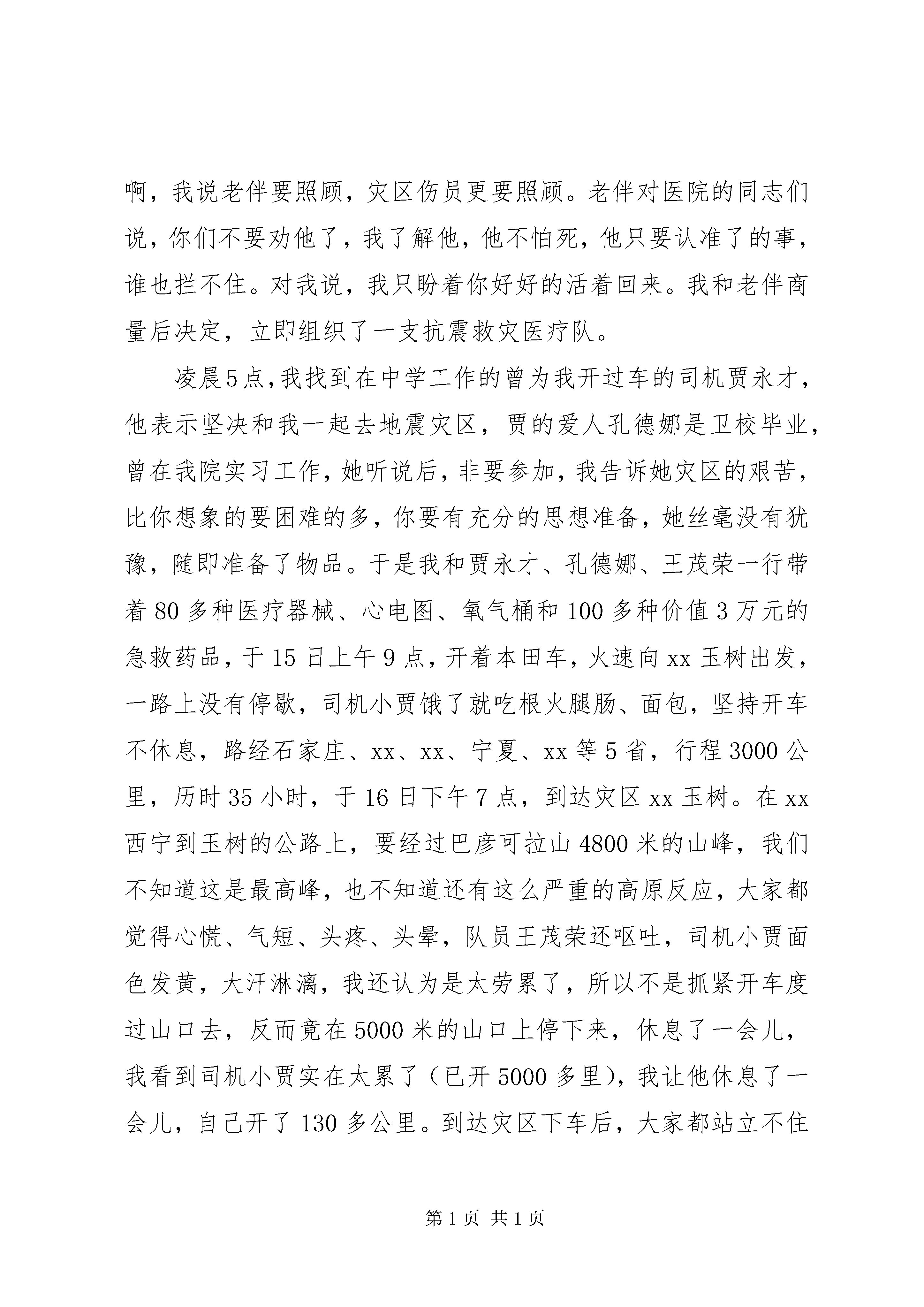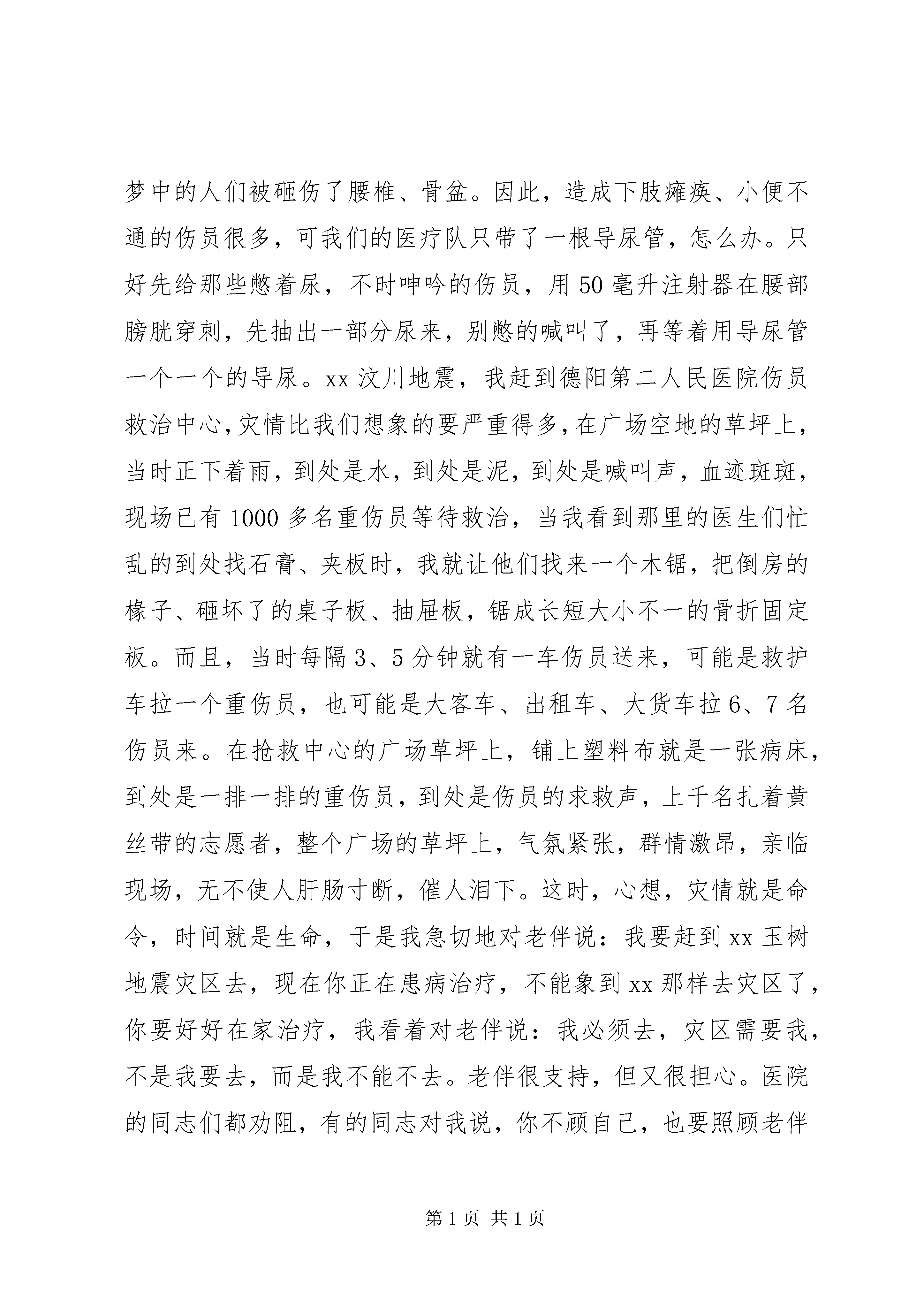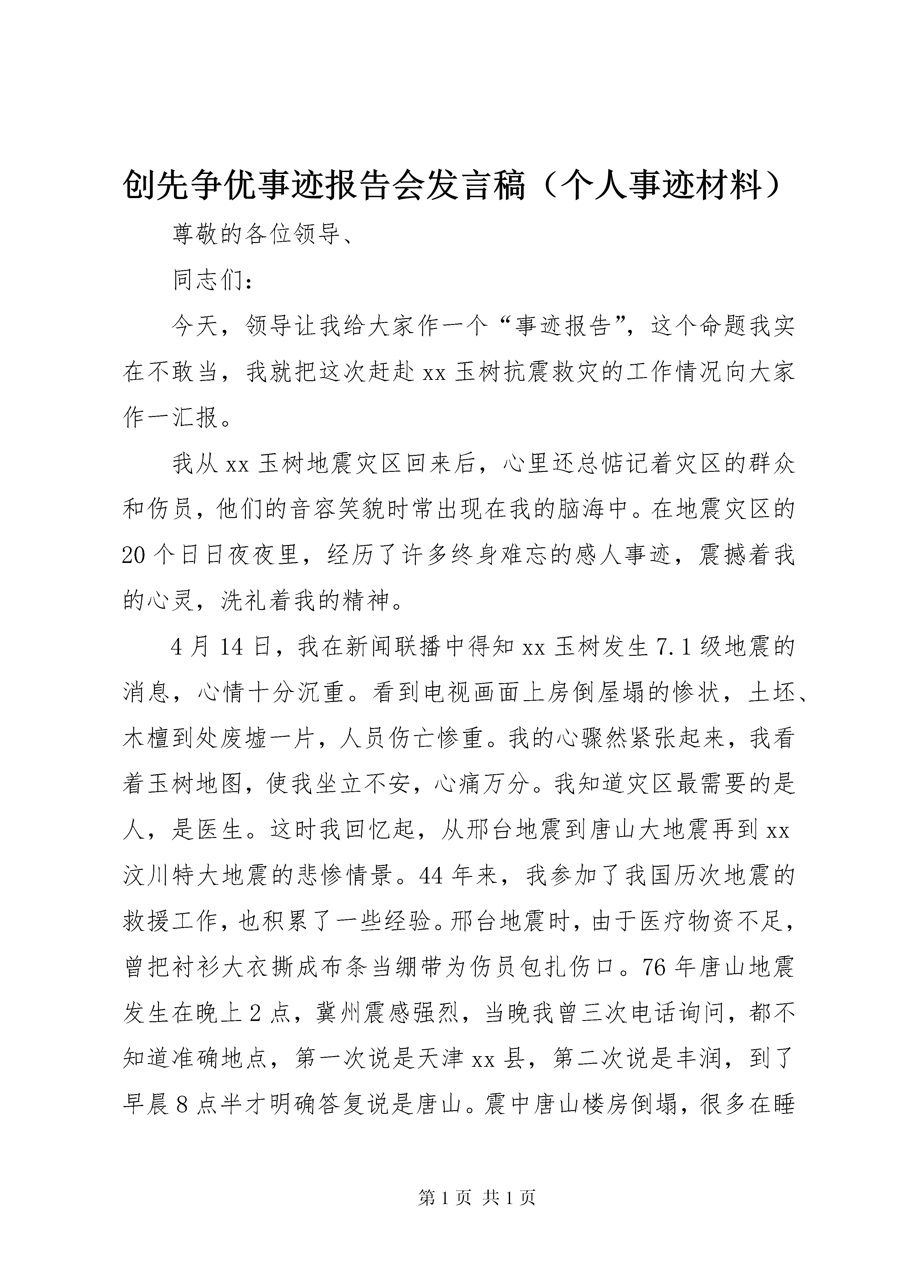 创先争优事迹报告会发言稿(个人事迹材料)尊敬的各位领导、同志们:今天,领导让我给大家作一个“事迹报告”,这个命题我实在不敢当,我就把这次赶赴xx玉树抗震救灾的工作情况向大家作一汇报。我从xx玉树地震灾区回来后,心里还总惦记着灾区的群众和伤员,他们的音容笑貌时常出现在我的脑海中。在地震灾区的20个日日夜夜里,经历了许多终身难忘的感人事迹,震撼着我的心灵,洗礼着我的精神。4月14日,我在新闻联播中得知xx玉树发生7.1级地震的消息,心情十分沉重。看到电视画面上房倒屋塌的惨状,土坯、木檀到处废墟一片,人员伤亡惨重。我的心骤然紧张起来,我看着玉树地图,使我坐立不安,心痛万分。我知道灾区最需要的是人,是医生。这时我回忆起,从邢台地震到唐山大地震再到xx汶川特大地震的悲惨情景。44年来,我参加了我国历次地震的救援工作,也积累了一些经验。邢台地震时,由于医疗物资不足,曾把衬衫大衣撕成布条当绷带为伤员包扎伤口。76年唐山地震发生在晚上2点,冀州震感强烈,当晚我曾三次电话询问,都不知道准确地点,第一次说是天津xx县,第二次说是丰润,到了早晨8点半才明确答复说是唐山。震中唐山楼房倒塌,很多在睡梦中的人们被砸伤了腰椎、骨盆。因此,造成下肢瘫痪、小便不通的伤员很多,可我们的医疗队只带了一根导尿管,怎么办。只好先给那些憋着尿,不时呻吟的伤员,用50毫升注射器在腰部膀胱穿刺,先抽出一部分尿来,别憋的喊叫了,再等着用导尿管一个一个的导尿。xx汶川地震,我赶到德阳第二人民医院伤员救治中心,灾情比我们想象的要严重得多,在广场空地的草坪上,当时正下着雨,到处是水,到处是泥,到处是喊叫声,血迹斑斑,现场已有1000多名重伤员等待救治,当我看到那里的医生们忙乱的到处找石膏、夹板时,我就让他们找来一个木锯,把倒房的椽子、砸坏了的桌子板、抽屉板,锯成长短大小不一的骨折固定板。而且,当时每隔3、5分钟就有一车伤员送来,可能是救护车拉一个重伤员,也可能是大客车、出租车、大货车拉6、7名伤员来。在抢救中心的广场草坪上,铺上塑料布就是一张病床,到处是一排一排的重伤员,到处是伤员的求救声,上千名扎着黄丝带的志愿者,整个广场的草坪上,气氛紧张,群情激昂,亲临现场,无不使人肝肠寸断,催人泪下。这时,心想,灾情就是命令,时间就是生命,于是我急切地对老伴说:我要赶到xx玉树地震灾区去,现在你正在患病治疗,不能象到xx那样去灾区了,你要好好在家治疗,我看着对老伴说:我必须去,灾区需要我,不是我要去,而是我不能不去。老伴很支持,但又很担心。医院的同志们都劝阻,有的同志对我说,你不顾自己,也要照顾老伴啊,我说老伴要照顾,灾区伤员更要照顾。老伴对医院的同志们说,你们不要劝他了,我了解他,他不怕死,他只要认准了的事,谁也拦不住。对我说,我只盼着你好好的活着回来。我和老伴商量后决定,立即组织了一支抗震救灾医疗队。凌晨5点,我找到在中学工作的曾为我开过车的司机贾永才,他表示坚决和我一起去地震灾区,贾的爱人孔德娜是卫校毕业,曾在我院实习工作,她听说后,非要参加,我告诉她灾区的艰苦,比你想象的要困难的多,你要有充分的思想准备,她丝毫没有犹豫,随即准备了物品。于是我和贾永才、孔德娜、王茂荣一行带着80多种医疗器械、心电图、氧气桶和100多种价值3万元的急救药品,于15日上午9点,开着本田车,火速向xx玉树出发,一路上没有停歇,司机小贾饿了就吃根火腿肠、面包,坚持开车不休息,路经石家庄、xx、xx、宁夏、xx等5省,行程3000公里,历时35小时,于16日下午7点,到达灾区xx玉树。在xx西宁到玉树的公路上,要经过巴彦可拉山4800米的山峰,我们不知道这是最高峰,也不知道还有这么严重的高原反应,大家都觉得心慌、气短、头疼、头晕,队员王茂荣还呕吐,司机小贾面色发黄,大汗淋漓,我还认为是太劳累了,所以不是抓紧开车度过山口去,反而竟在5000米的山口上停下来,休息了一会儿,我看到司机小贾实在太累了(已开5000多里),我让他休息了一会儿,自己开了130多公里。到达灾区下车后,大家都站立不住了,坐在地上休息了半小时。在找指挥部的过程中,看到大街上挤满了救灾的人群,车辆堵塞,这时我突然感到头晕的不能站立,心跳急剧加快,心慌严重,脉搏每分钟200次,突然发作了心房纤颤,我赶紧扶住了一棵树,坐在地上,心想坚决要挺住。队员们都吓坏了,孔德娜架起我要去医院先抢救我,我坚决不去,我知道一检查肯定就不能工作了,这时把我扶到汽车上,躺下来,服药,休息了一会儿,直到晚上9点,才在队员的搀扶下,找到总指挥部,我强装着没事的样子,恐怕被看出破绽,我说是35小时坐车劳累了点。指挥部领导激动的说,在这么短的时间里,行程3000公里赶到灾区这真是不可想象的,你们是第一时间到达灾区的第一支民间医疗队,太感谢你们了,报到后