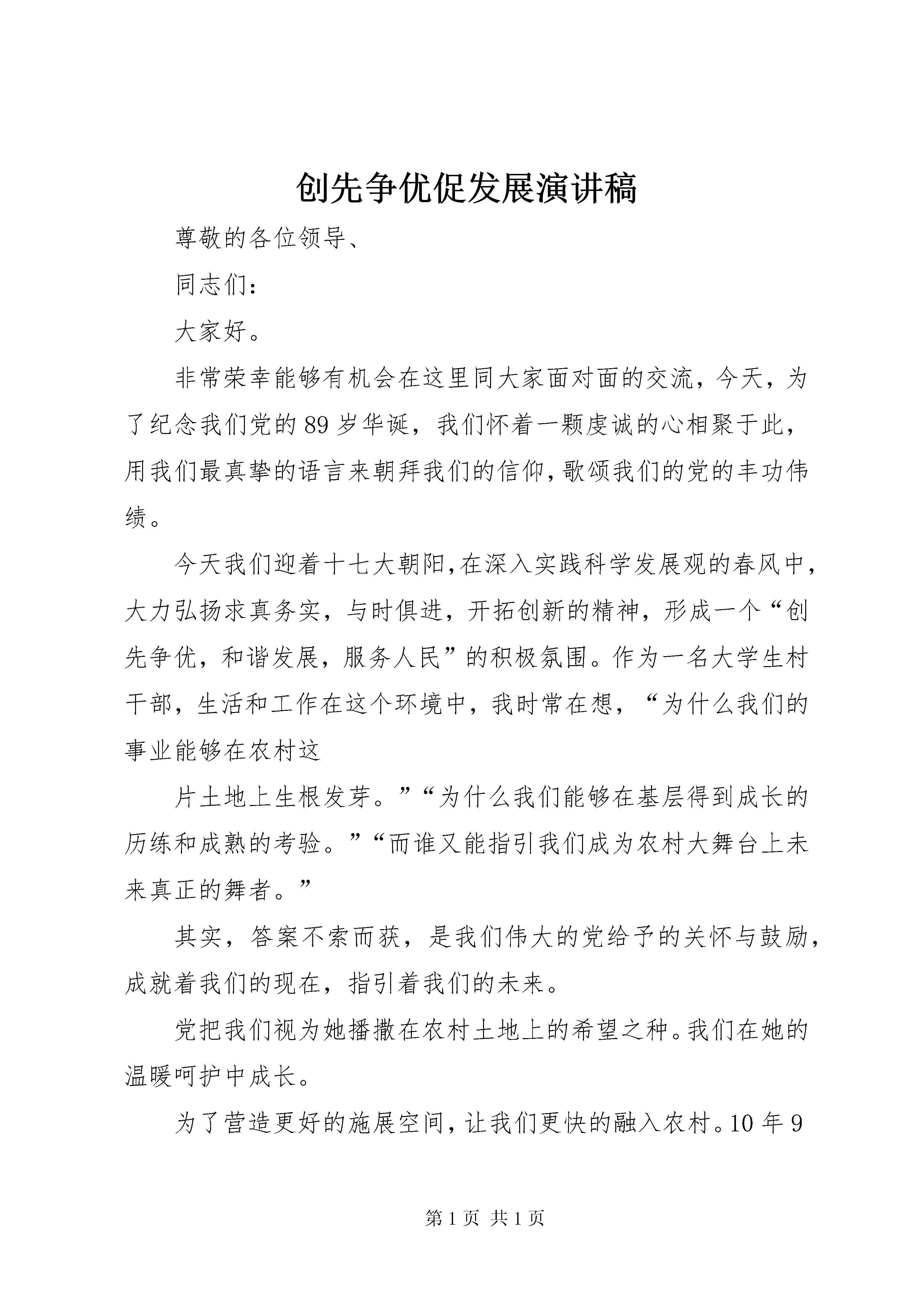 创先争优促发展演讲稿尊敬的各位领导、同志们:大家好。非常荣幸能够有机会在这里同大家面对面的交流,今天,为了纪念我们党的89岁华诞,我们怀着一颗虔诚的心相聚于此,用我们最真挚的语言来朝拜我们的信仰,歌颂我们的党的丰功伟绩。今天我们迎着十七大朝阳,在深入实践科学发展观的春风中,大力弘扬求真务实,与时俱进,开拓创新的精神,形成一个“创先争优,和谐发展,服务人民”的积极氛围。作为一名大学生村干部,生活和工作在这个环境中,我时常在想,“为什么我们的事业能够在农村这片土地上生根发芽。”“为什么我们能够在基层得到成长的历练和成熟的考验。”“而谁又能指引我们成为农村大舞台上未来真正的舞者。”其实,答案不索而获,是我们伟大的党给予的关怀与鼓励,成就着我们的现在,指引着我们的未来。党把我们视为她播撒在农村土地上的希望之种。我们在她的温暖呵护中成长。为了营造更好的施展空间,让我们更快的融入农村。10年9月份,在党委政府与支部的支持下,我们大学生村干部在村委换届选举中成功入选村委会。竞选中,郭书记在现场的亲切问候,机关同事与村干部鼓励的话语,村民们的信任与支持,都让我们感到无比的温暖,是这些关怀、鼓励与支持更加增强了我们扎根这片土地的信心,更加坚定我们用青春和知识回报这片土地的信念。为了加强我们的理论素养,优化我们的知识结构,提高我们的综合素质。镇党委政府有计划的安排机关经验丰富的同志,向我们传授工作经验与方法。09年月份在镇党委的安排下,我们在村里带头学习科学发展观;09月,镇政府组织了大学生村干部理论知识考核,以及平时例会上对我们的党建知识培训,这些都让我们感觉到了党委政府的关怀与期盼。党视我们为新农村建设的主力军,我们在她赋予的责任中,得以历练。每年两次的入村调研,让我们学会了俯下身子,走进农户,真正的去了解农民的所需所求。每月的远程教育组织群众学习工作,让我们懂得如何将理论应用到实际工作中,懂得如何运用先进的技术服务农村。养老保险工作,让我们学会了在工作中更好的发挥我们的知识优势,学会了更好的同村民交流的方式服务信访工作案件的处理,使让我们在化解纠纷的过程中,得到了锻炼和提高。面对村里千头万绪,繁琐复杂的日常工作更是让我们学会了去理清自己的工作思路,去改进自己的工作方法。在这两年的成长道路上,是党政府的引导与支持赋予了我们用行动守望理想的决心,是同事们的帮助与鼓励增加了我们在风雨中磨砺青春的勇气。农村是个大熔炉,在件件平凡的小事中将我们百炼成钢,农村也是个大舞台,未来的我们,在这个舞台上是看客还是舞者,我们不禁忐忑。我们内心殷切的期盼,在未来的道路上,党能够给予我们更多的引导与支持,因为,我们爱这片土地,我们愿在这个“村官”的履历中,用勤劳和实干写下我们的理想篇章,我们愿在美好的青春年华中驰骋在这片土地上一步一个脚印的走向我们的人生新坐标,为新农村建设做出更多的贡献。