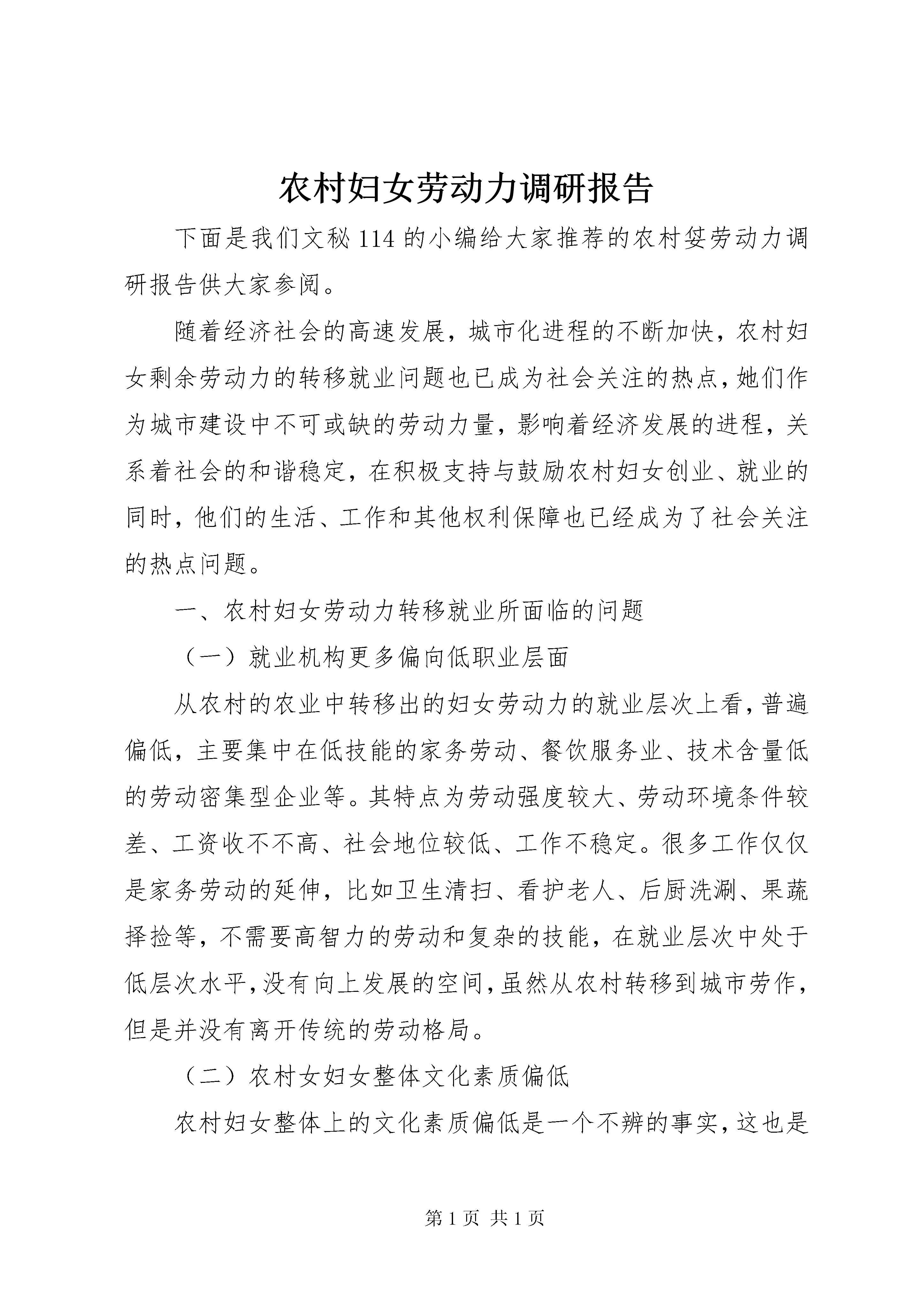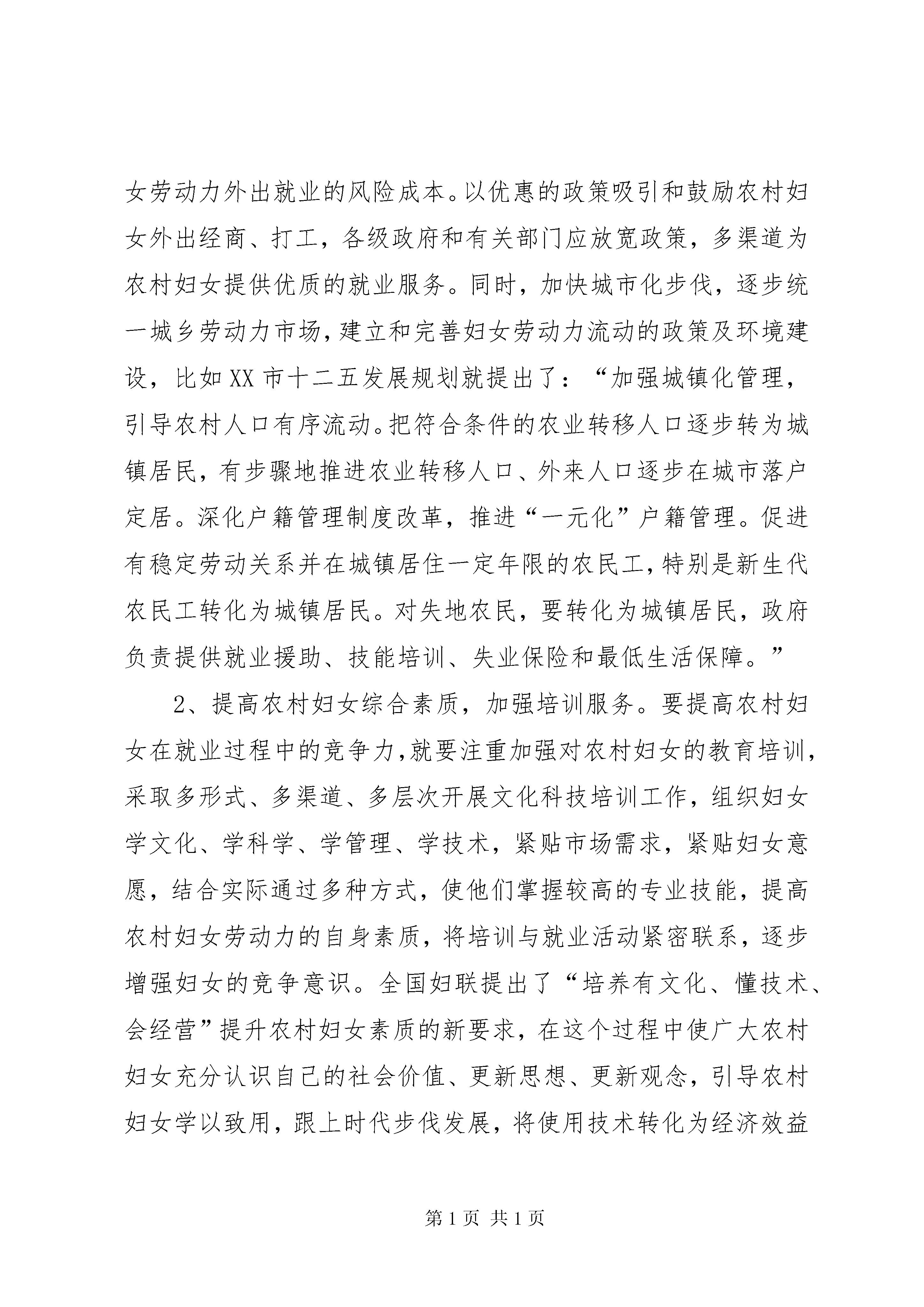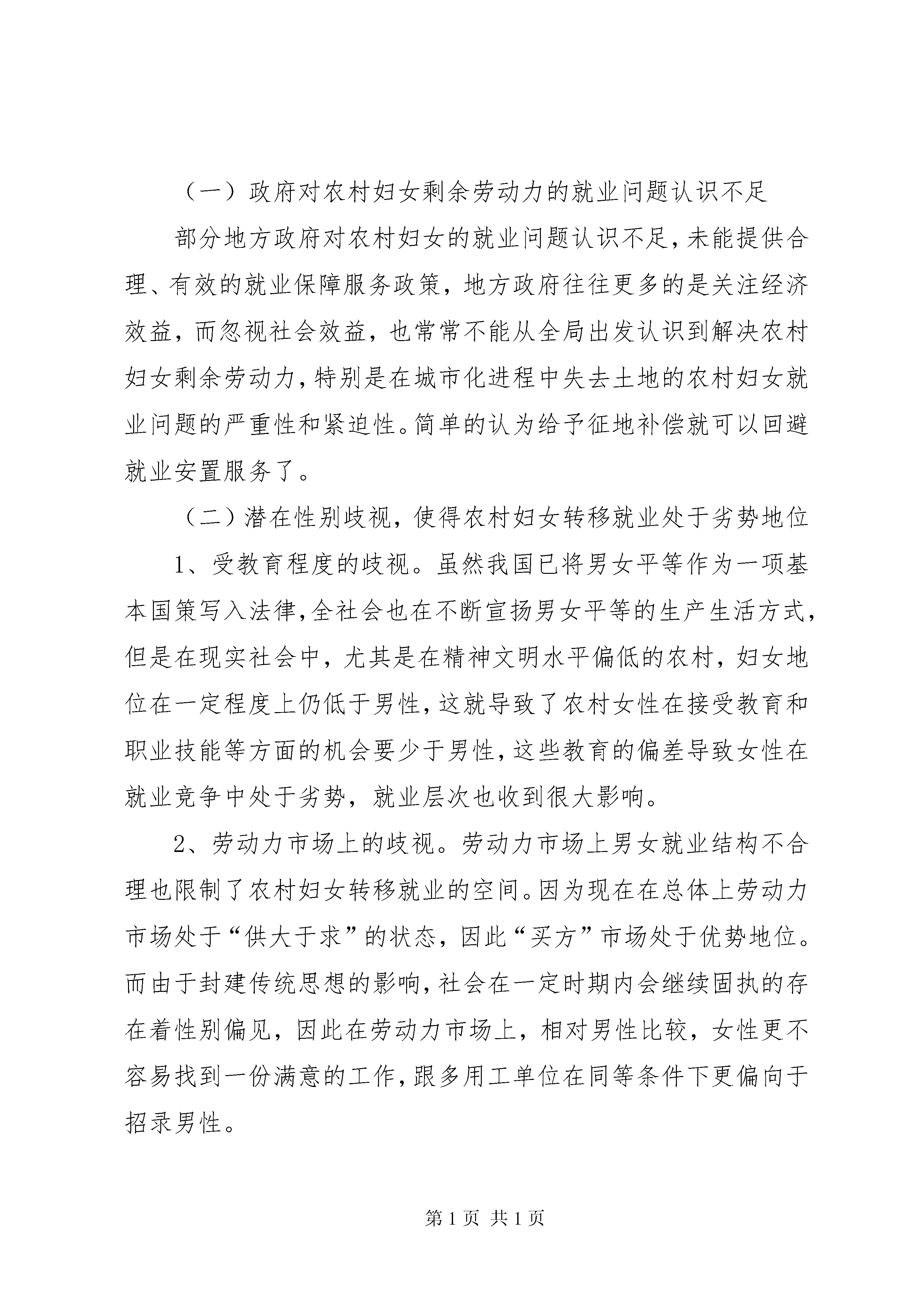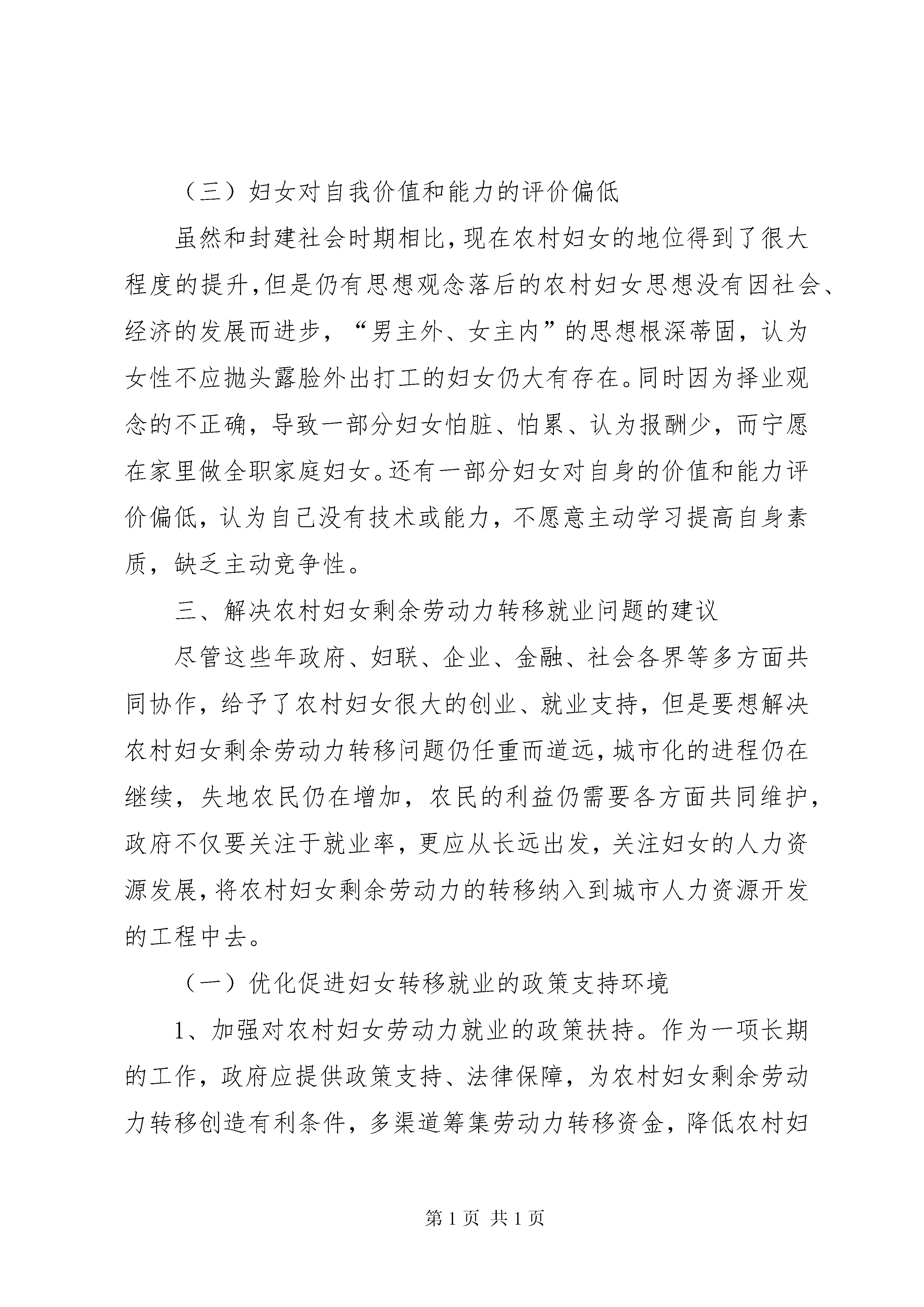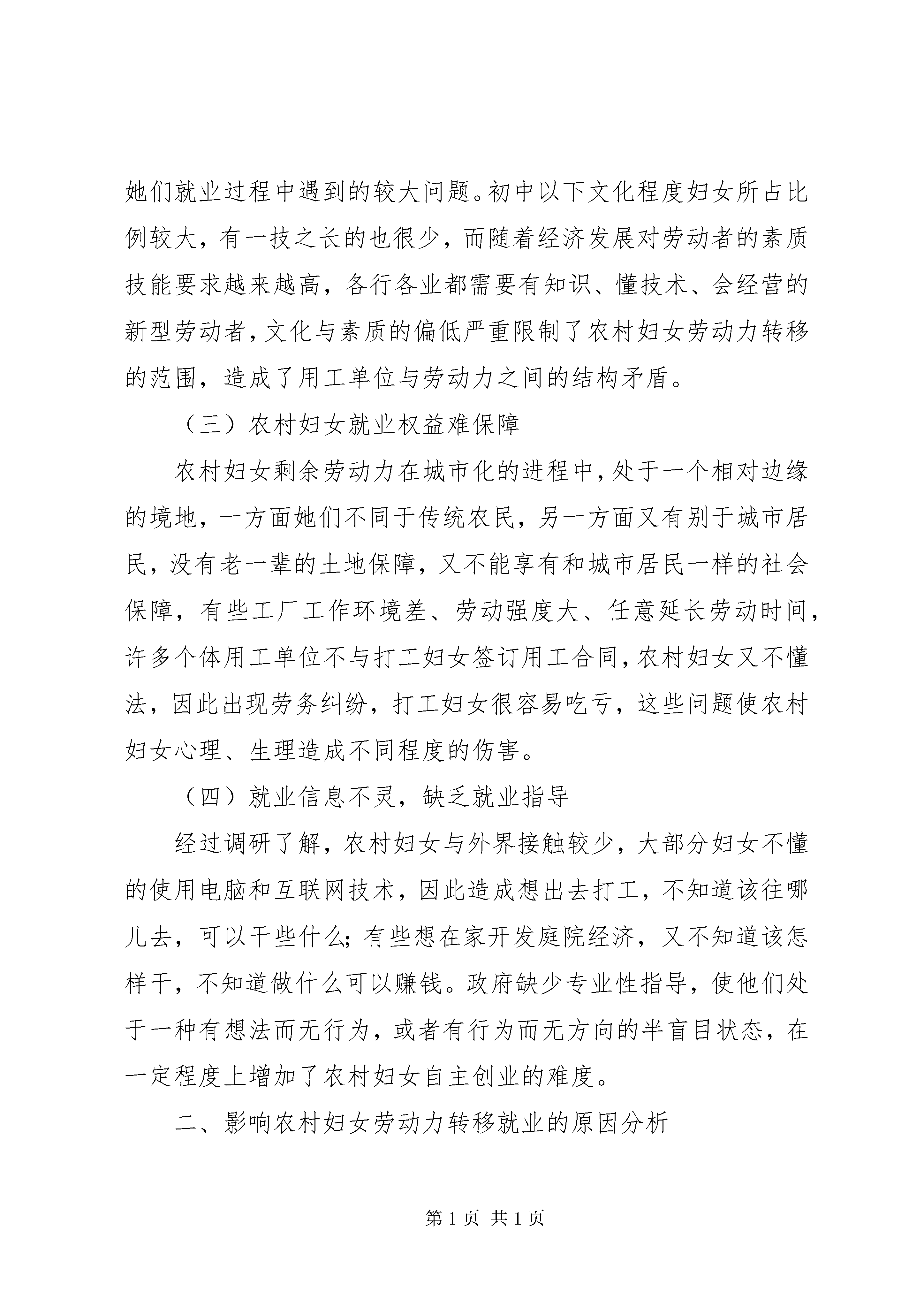 农村妇女劳动力调研报告下面是我们文秘114的小编给大家推荐的农村姇劳动力调研报告供大家参阅。随着经济社会的高速发展,城市化进程的不断加快,农村妇女剩余劳动力的转移就业问题也已成为社会关注的热点,她们作为城市建设中不可或缺的劳动力量,影响着经济发展的进程,关系着社会的和谐稳定,在积极支持与鼓励农村妇女创业、就业的同时,他们的生活、工作和其他权利保障也已经成为了社会关注的热点问题。一、农村妇女劳动力转移就业所面临的问题(一)就业机构更多偏向低职业层面从农村的农业中转移出的妇女劳动力的就业层次上看,普遍偏低,主要集中在低技能的家务劳动、餐饮服务业、技术含量低的劳动密集型企业等。其特点为劳动强度较大、劳动环境条件较差、工资收不不高、社会地位较低、工作不稳定。很多工作仅仅是家务劳动的延伸,比如卫生清扫、看护老人、后厨洗涮、果蔬择捡等,不需要高智力的劳动和复杂的技能,在就业层次中处于低层次水平,没有向上发展的空间,虽然从农村转移到城市劳作,但是并没有离开传统的劳动格局。(二)农村女妇女整体文化素质偏低农村妇女整体上的文化素质偏低是一个不辨的事实,这也是她们就业过程中遇到的较大问题。初中以下文化程度妇女所占比例较大,有一技之长的也很少,而随着经济发展对劳动者的素质技能要求越来越高,各行各业都需要有知识、懂技术、会经营的新型劳动者,文化与素质的偏低严重限制了农村妇女劳动力转移的范围,造成了用工单位与劳动力之间的结构矛盾。(三)农村妇女就业权益难保障农村妇女剩余劳动力在城市化的进程中,处于一个相对边缘的境地,一方面她们不同于传统农民,另一方面又有别于城市居民,没有老一辈的土地保障,又不能享有和城市居民一样的社会保障,有些工厂工作环境差、劳动强度大、任意延长劳动时间,许多个体用工单位不与打工妇女签订用工合同,农村妇女又不懂法,因此出现劳务纠纷,打工妇女很容易吃亏,这些问题使农村妇女心理、生理造成不同程度的伤害。(四)就业信息不灵,缺乏就业指导经过调研了解,农村妇女与外界接触较少,大部分妇女不懂的使用电脑和互联网技术,因此造成想出去打工,不知道该往哪儿去,可以干些什么;有些想在家开发庭院经济,又不知道该怎样干,不知道做什么可以赚钱。政府缺少专业性指导,使他们处于一种有想法而无行为,或者有行为而无方向的半盲目状态,在一定程度上增加了农村妇女自主创业的难度。二、影响农村妇女劳动力转移就业的原因分析(一)政府对农村妇女剩余劳动力的就业问题认识不足部分地方政府对农村妇女的就业问题认识不足,未能提供合理、有效的就业保障服务政策,地方政府往往更多的是关注经济效益,而忽视社会效益,也常常不能从全局出发认识到解决农村妇女剩余劳动力,特别是在城市化进程中失去土地的农村妇女就业问题的严重性和紧迫性。简单的认为给予征地补偿就可以回避就业安置服务了。(二)潜在性别歧视,使得农村妇女转移就业处于劣势地位1、受教育程度的歧视。虽然我国已将男女平等作为一项基本国策写入法律,全社会也在不断宣扬男女平等的生产生活方式,但是在现实社会中,尤其是在精神文明水平偏低的农村,妇女地位在一定程度上仍低于男性,这就导致了农村女性在接受教育和职业技能等方面的机会要少于男性,这些教育的偏差导致女性在就业竞争中处于劣势,就业层次也收到很大影响。2、劳动力市场上的歧视。劳动力市场上男女就业结构不合理也限制了农村妇女转移就业的空间。因为现在在总体上劳动力市场处于“供大于求”的状态,因此“买方”市场处于优势地位。而由于封建传统思想的影响,社会在一定时期内会继续固执的存在着性别偏见,因此在劳动力市场上,相对男性比较,女性更不容易找到一份满意的工作,跟多用工单位在同等条件下更偏向于招录男性。(三)妇女对自我价值和能力的评价偏低虽然和封建社会时期相比,现在农村妇女的地位得到了很大程度的提升,但是仍有思想观念落后的农村妇女思想没有因社会、经济的发展而进步,“男主外、女主内”的思想根深蒂固,认为女性不应抛头露脸外出打工的妇女仍大有存在。同时因为择业观念的不正确,导致一部分妇女怕脏、怕累、认为报酬少,而宁愿在家里做全职家庭妇女。还有一部分妇女对自身的价值和能力评价偏低,认为自己没有技术或能力,不愿意主动学习提高自身素质,缺乏主动竞争性。三、解决农村妇女剩余劳动力转移就业问题的建议尽管这些年政府、妇联、企业、金融、社会各界等多方面共同协作,给予了农村妇女很大的创业、就业支持,但是要想解决农村妇女剩余劳动力转移问题仍任重而道远,城市化的进程仍在继续,失地农民仍在增加,农民的利益仍需要各方面共同维护,政府不仅要关注于就业率,更应从长远出发,关注妇女的人力资源发展,将农村妇女剩余劳动力的转移纳入到城市人力资源开发的工程中去。(一)优化促进妇女转移就业的政策支持环境1、加强对农村妇女劳动力就业的政策扶