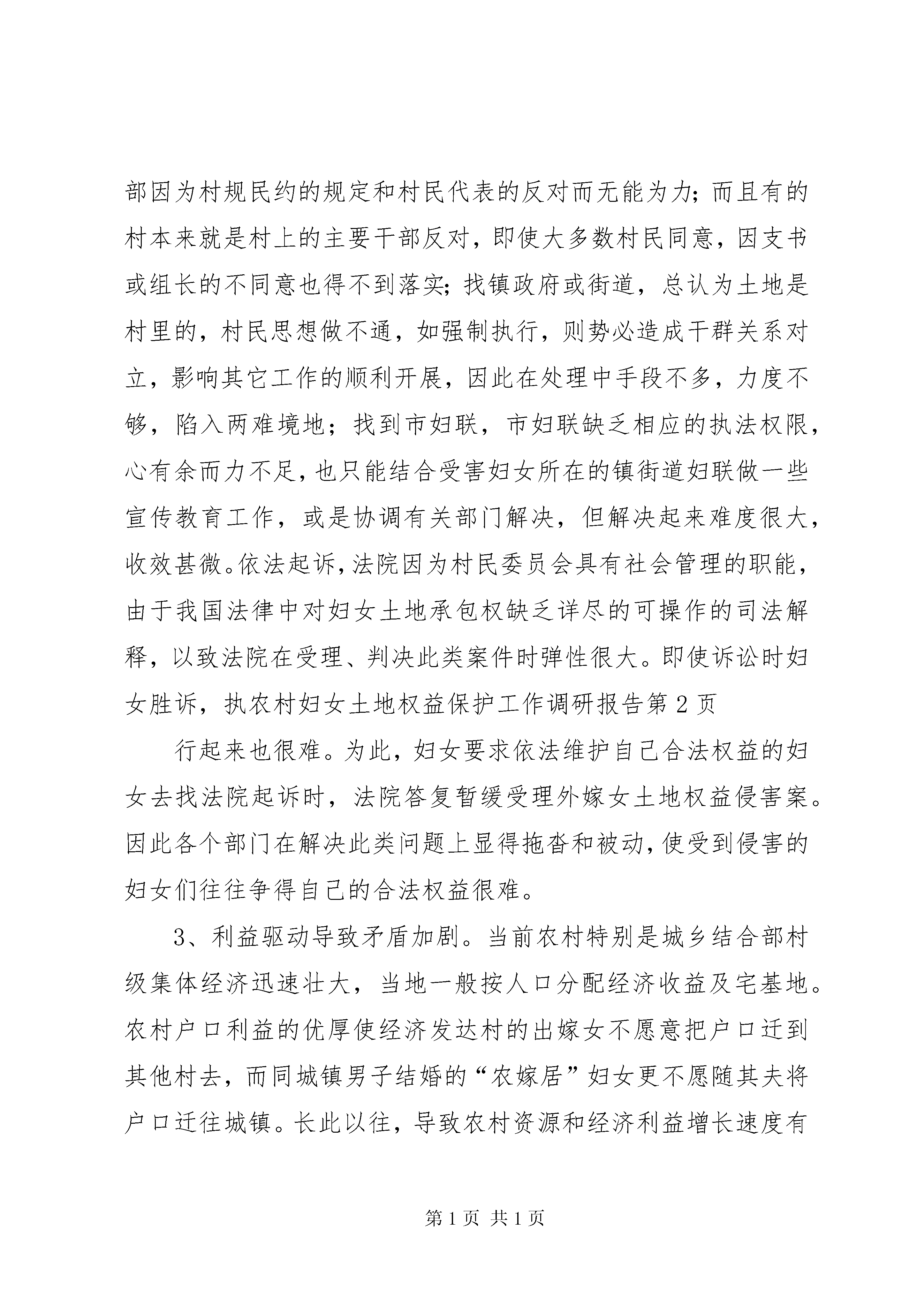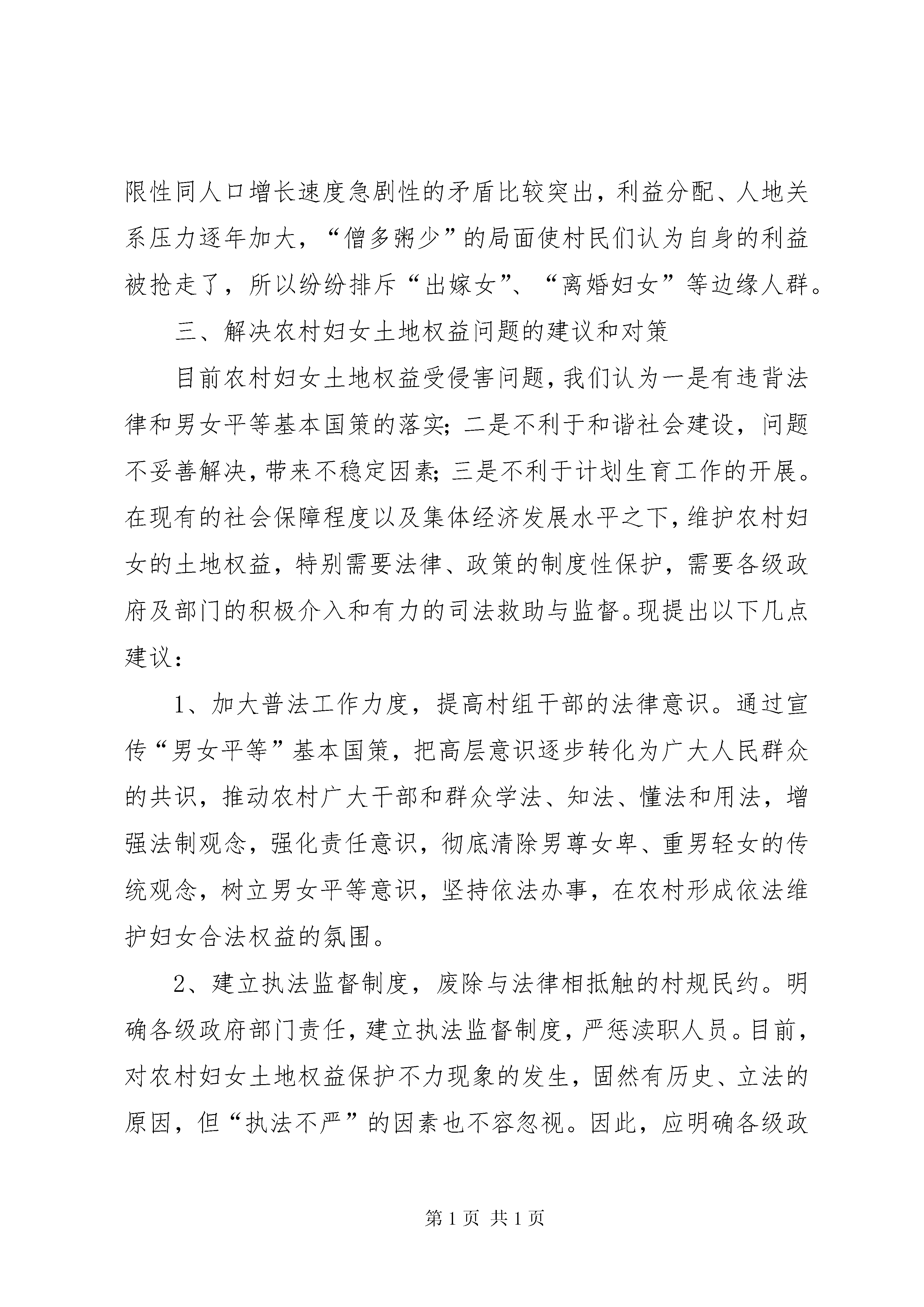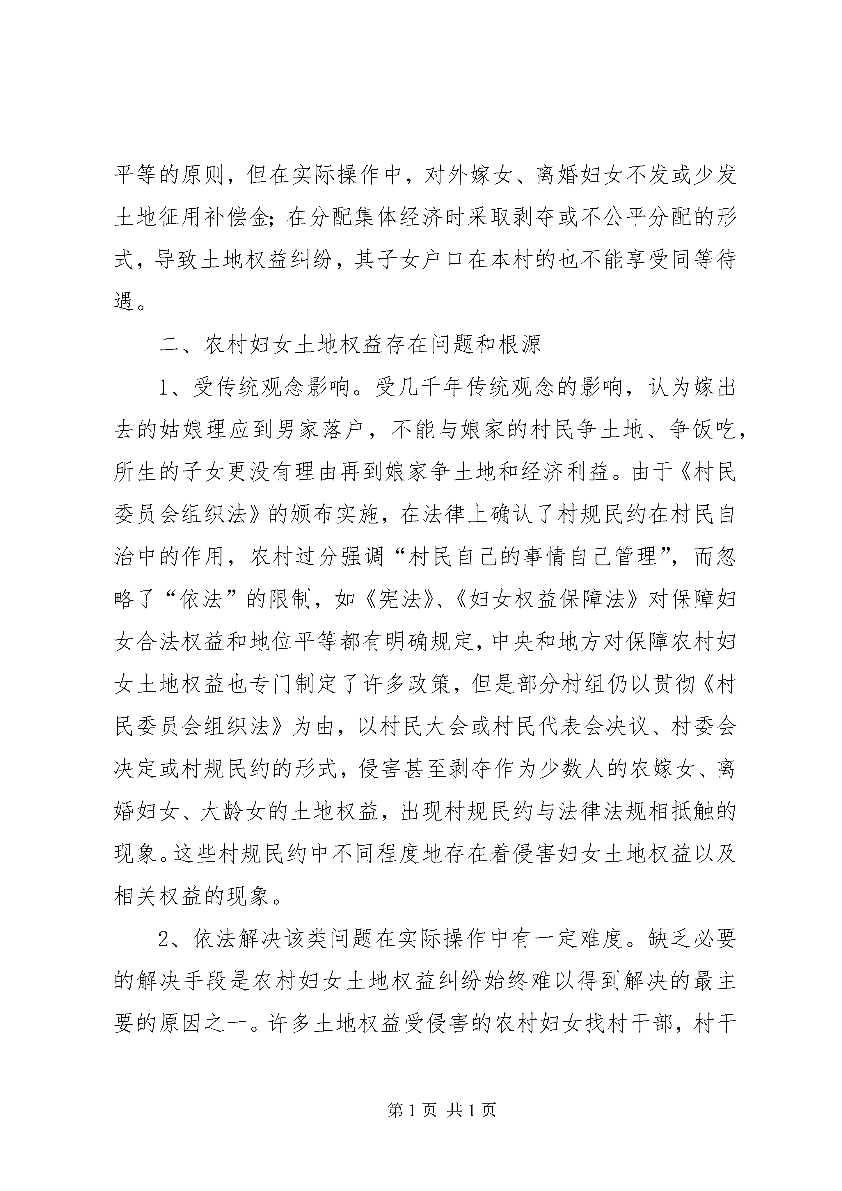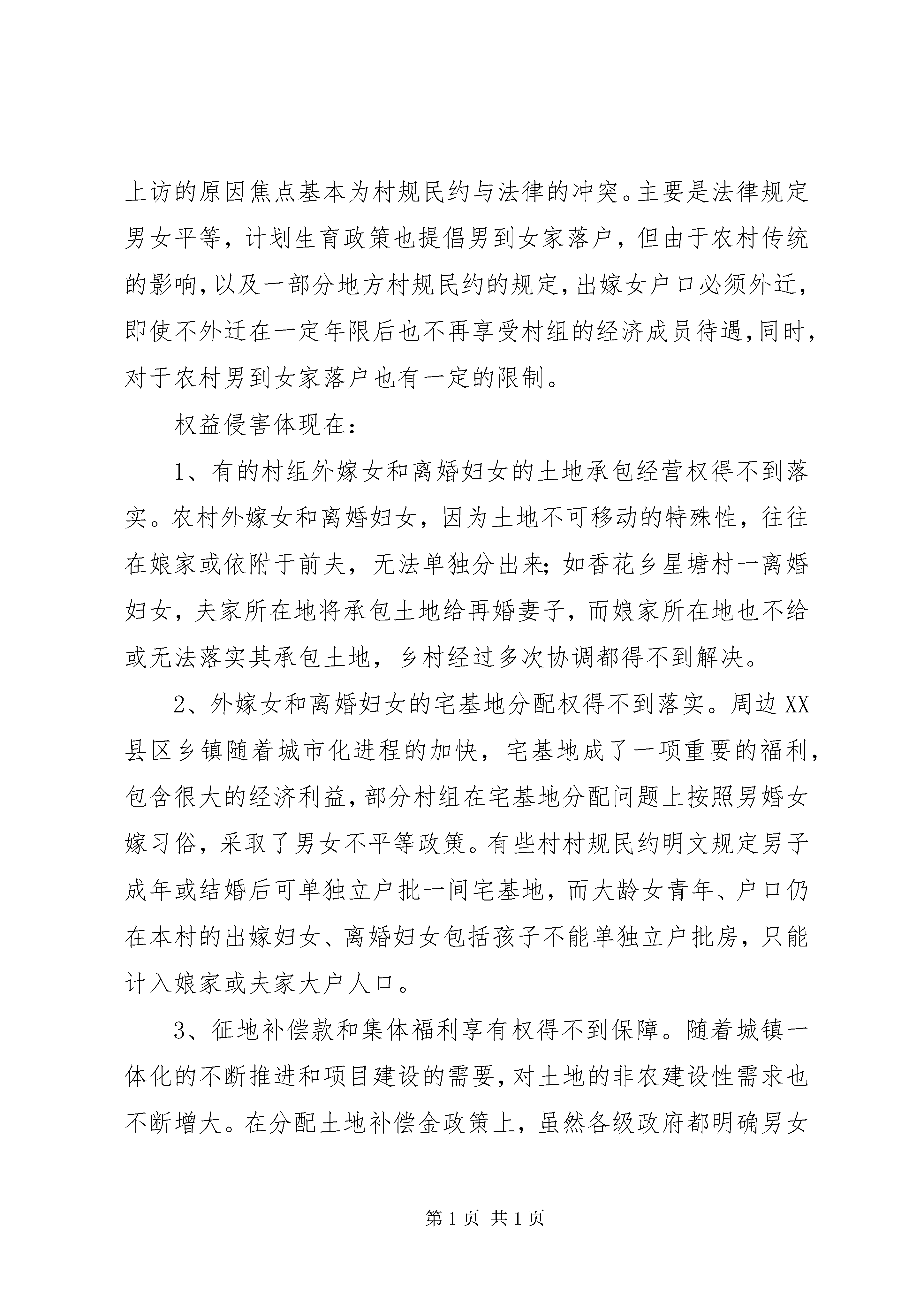 农村妇女土地权益保护工作调研报告农村妇女土地权益保护工作调研报告近年来,由于农村城镇化和项目建设的不断发展,尤其是部分乡镇、开发区的农村集体土地被国家征用,征地款的分配问题引起群众的广泛关注,在分配土地征用款时往往出现一些侵害妇女权益的问题。近两年来,我市妇联共接待涉及农村妇女土地权益问题的信访案件7件(其中4件,20xx年3件),涉及25人,其中重复上访2批7人。占信访总量181件(126件,20xx年55件)的3.8%。为依法维护农村妇女儿童土地权益、探索妇女土地权益案件解决、落实妇女土地权益的办法,妇联就农村妇女土地权益问题在我市的几个重点乡镇作了专题的调研。一、接待来访事项的简要情况和特点从我市妇联接待有关农村妇女反映土地权益纠纷的信访事项的情况看,主要有以下几个特点:一是上访来源地相对集中,主要集中在土地被征用的地方,如:高码乡、经济开发区、东江镇、香花乡等;二是反映的诉求基本一致。基本上是户口在本地的出嫁女、男到女家落户者家庭成员要求享受土地征用分配款,也有少部分为丈夫去世后或离婚后其土地权益受到一定侵害的问题;三是因妇女权益受损引发的上访多存在重复上访倾向。如高码乡邵爱玲因其夫到女家落户家庭成员要求享受组上同等待遇问题多次赴京、赴省、赴郴,到本市不计其数上访;四是造成上访的原因焦点基本为村规民约与法律的冲突。主要是法律规定男女平等,计划生育政策也提倡男到女家落户,但由于农村传统的影响,以及一部分地方村规民约的规定,出嫁女户口必须外迁,即使不外迁在一定年限后也不再享受村组的经济成员待遇,同时,对于农村男到女家落户也有一定的限制。权益侵害体现在:1、有的村组外嫁女和离婚妇女的土地承包经营权得不到落实。农村外嫁女和离婚妇女,因为土地不可移动的特殊性,往往在娘家或依附于前夫,无法单独分出来;如香花乡星塘村一离婚妇女,夫家所在地将承包土地给再婚妻子,而娘家所在地也不给或无法落实其承包土地,乡村经过多次协调都得不到解决。2、外嫁女和离婚妇女的宅基地分配权得不到落实。周边XX县区乡镇随着城市化进程的加快,宅基地成了一项重要的福利,包含很大的经济利益,部分村组在宅基地分配问题上按照男婚女嫁习俗,采取了男女不平等政策。有些村村规民约明文规定男子成年或结婚后可单独立户批一间宅基地,而大龄女青年、户口仍在本村的出嫁妇女、离婚妇女包括孩子不能单独立户批房,只能计入娘家或夫家大户人口。3、征地补偿款和集体福利享有权得不到保障。随着城镇一体化的不断推进和项目建设的需要,对土地的非农建设性需求也不断增大。在分配土地补偿金政策上,虽然各级政府都明确男女平等的原则,但在实际操作中,对外嫁女、离婚妇女不发或少发土地征用补偿金;在分配集体经济时采取剥夺或不公平分配的形式,导致土地权益纠纷,其子女户口在本村的也不能享受同等待遇。二、农村妇女土地权益存在问题和根源1、受传统观念影响。受几千年传统观念的影响,认为嫁出去的姑娘理应到男家落户,不能与娘家的村民争土地、争饭吃,所生的子女更没有理由再到娘家争土地和经济利益。由于《村民委员会组织法》的颁布实施,在法律上确认了村规民约在村民自治中的作用,农村过分强调“村民自己的事情自己管理”,而忽略了“依法”的限制,如《宪法》、《妇女权益保障法》对保障妇女合法权益和地位平等都有明确规定,中央和地方对保障农村妇女土地权益也专门制定了许多政策,但是部分村组仍以贯彻《村民委员会组织法》为由,以村民大会或村民代表会决议、村委会决定或村规民约的形式,侵害甚至剥夺作为少数人的农嫁女、离婚妇女、大龄女的土地权益,出现村规民约与法律法规相抵触的现象。这些村规民约中不同程度地存在着侵害妇女土地权益以及相关权益的现象。2、依法解决该类问题在实际操作中有一定难度。缺乏必要的解决手段是农村妇女土地权益纠纷始终难以得到解决的最主要的原因之一。许多土地权益受侵害的农村妇女找村干部,村干部因为村规民约的规定和村民代表的反对而无能为力;而且有的村本来就是村上的主要干部反对,即使大多数村民同意,因支书或组长的不同意也得不到落实;找镇政府或街道,总认为土地是村里的,村民思想做不通,如强制执行,则势必造成干群关系对立,影响其它工作的顺利开展,因此在处理中手段不多,力度不够,陷入两难境地;找到市妇联,市妇联缺乏相应的执法权限,心有余而力不足,也只能结合受害妇女所在的镇街道妇联做一些宣传教育工作,或是协调有关部门解决,但解决起来难度很大,收效甚微。依法起诉,法院因为村民委员会具有社会管理的职能,由于我国法律中对妇女土地承包权缺乏详尽的可操作的司法解释,以致法院在受理、判决此类案件时弹性很大。即使诉讼时妇女胜诉,执农村妇女土地权益保护工作调研报告行起来也很难。为此,妇女要求依法维护自己合法权益的妇女去找法院起诉时,法院答复暂缓受
