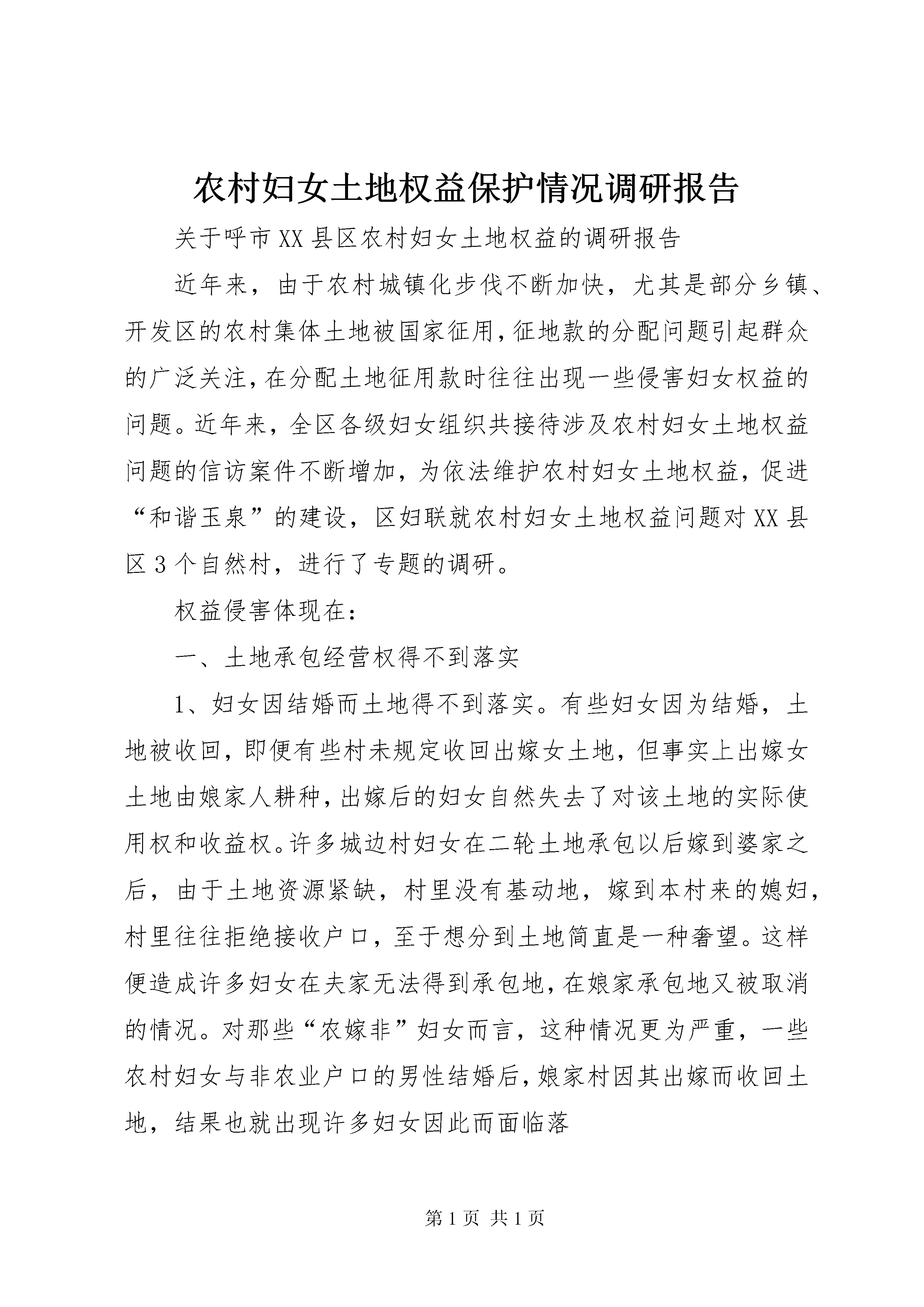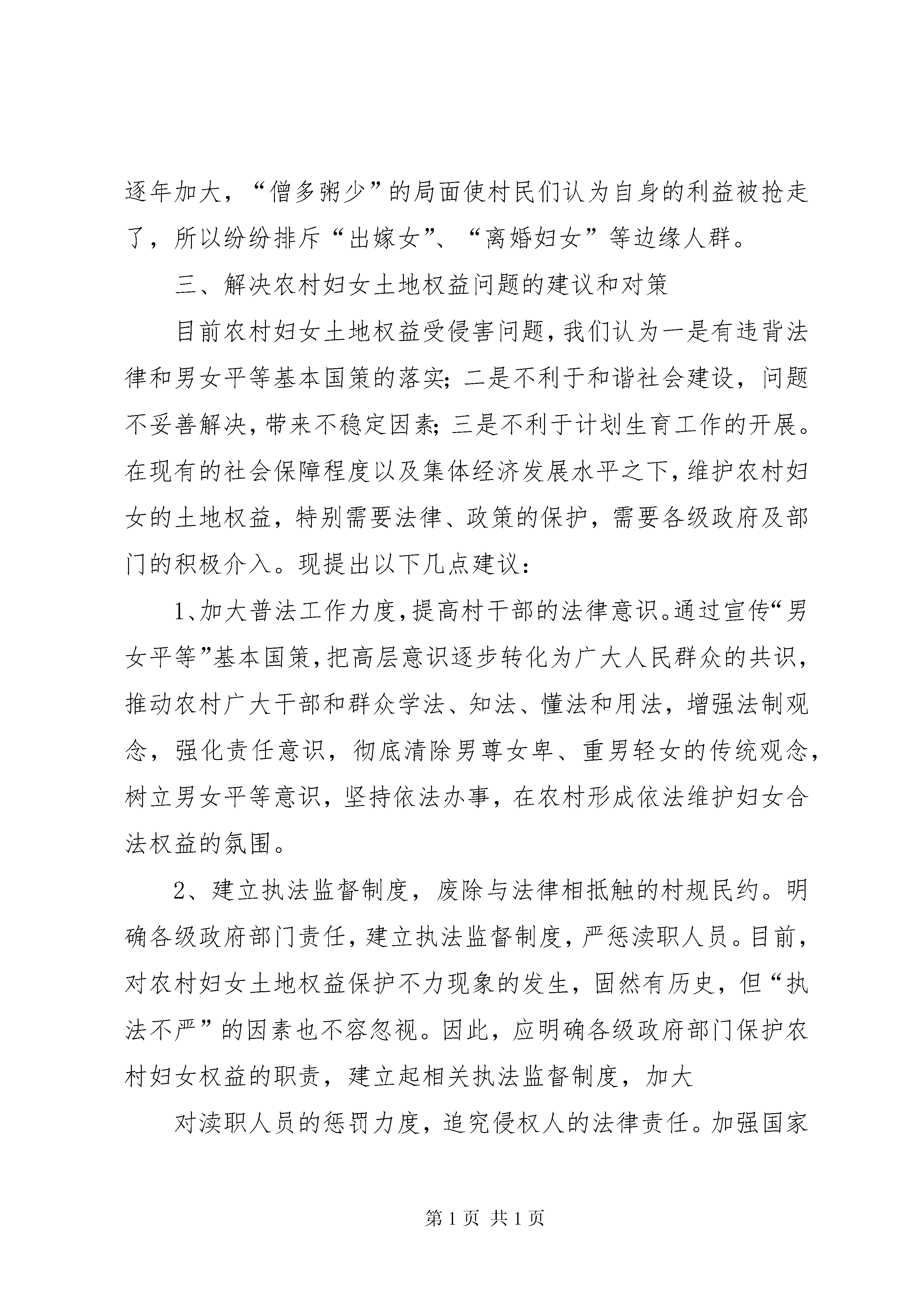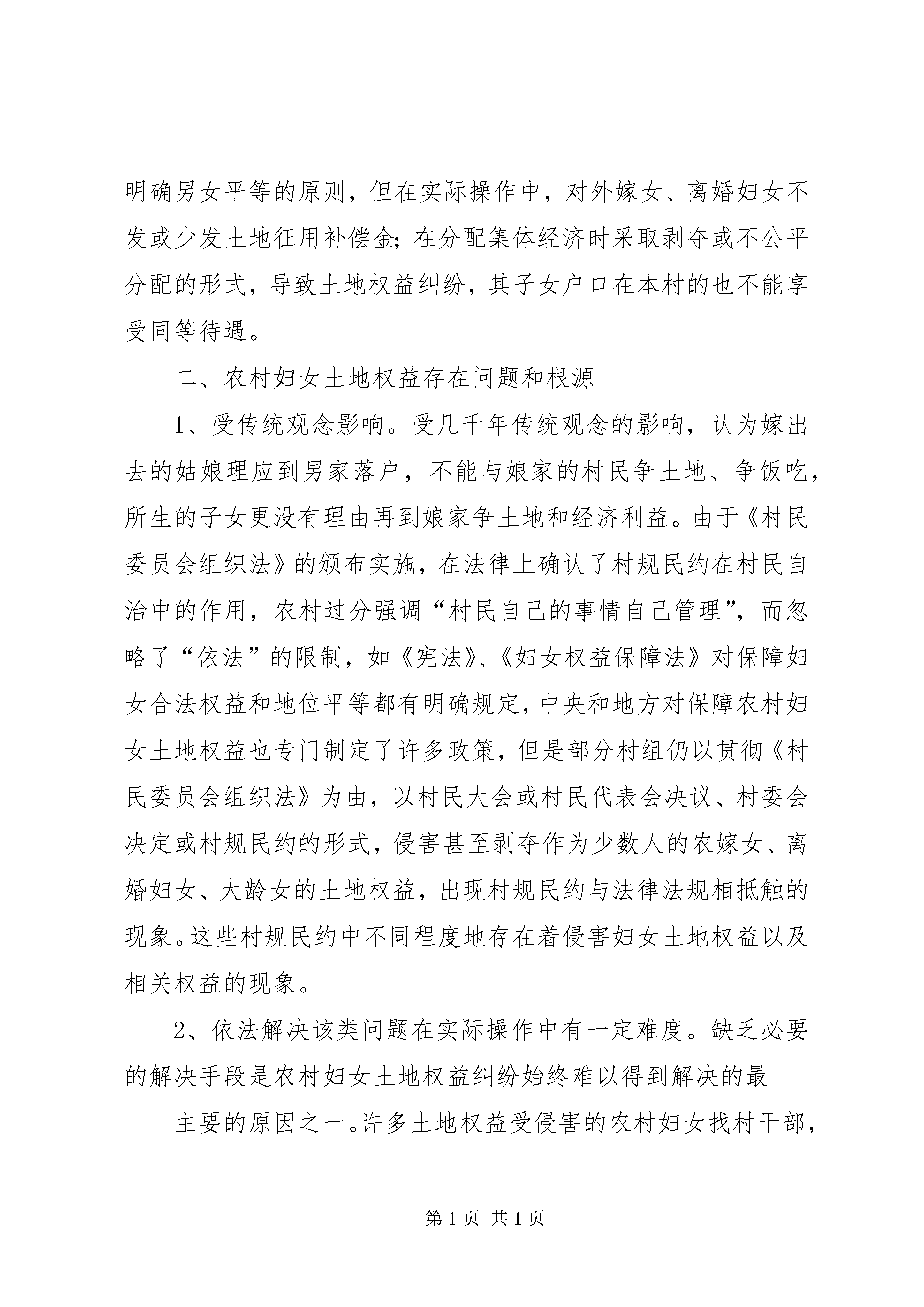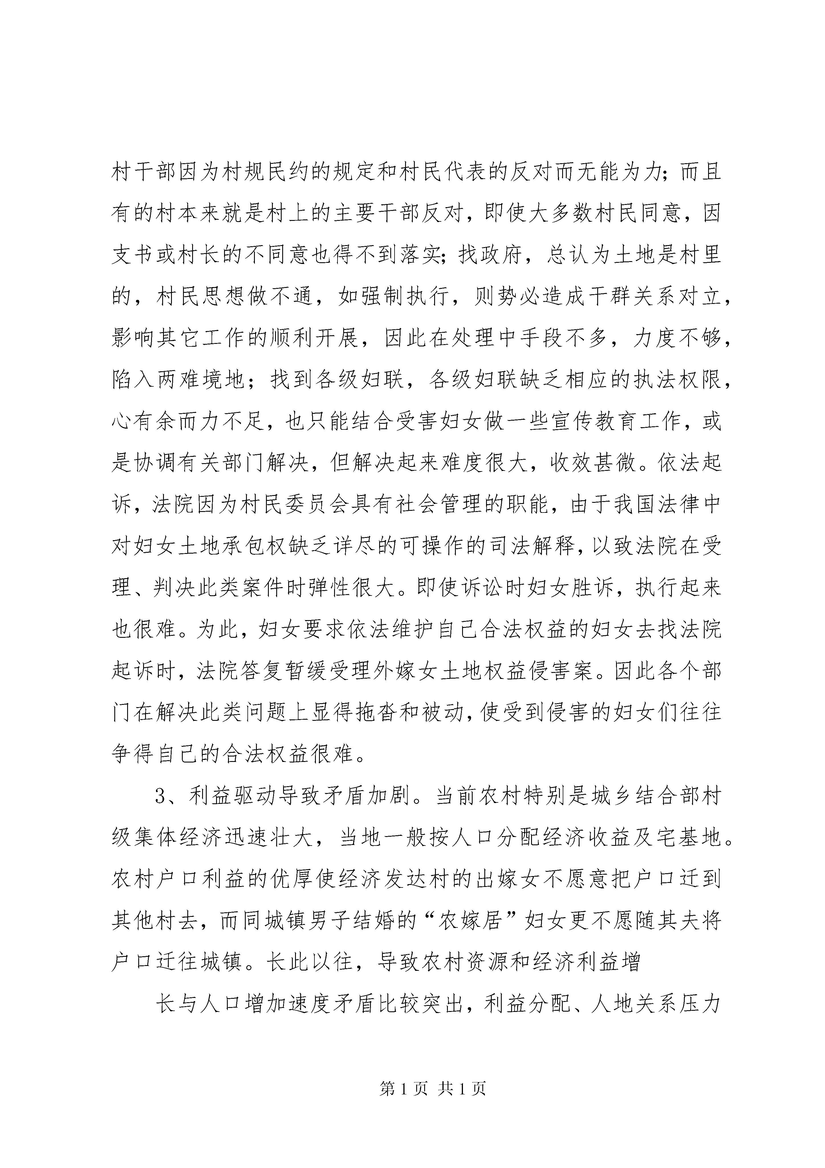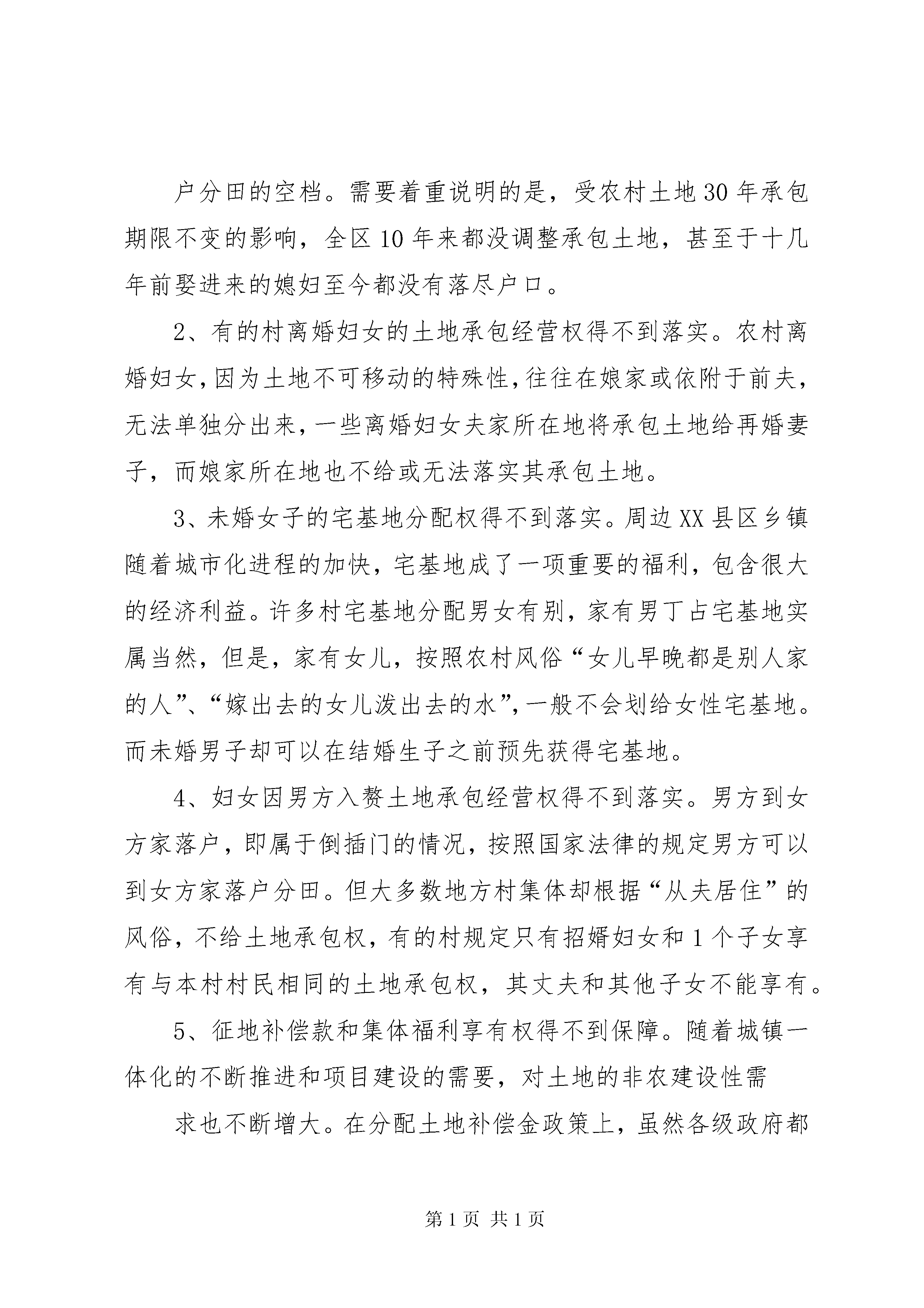农村妇女土地权益保护情况调研报告关于呼市XX县区农村妇女土地权益的调研报告近年来,由于农村城镇化步伐不断加快,尤其是部分乡镇、开发区的农村集体土地被国家征用,征地款的分配问题引起群众的广泛关注,在分配土地征用款时往往出现一些侵害妇女权益的问题。近年来,全区各级妇女组织共接待涉及农村妇女土地权益问题的信访案件不断增加,为依法维护农村妇女土地权益,促进“和谐玉泉”的建设,区妇联就农村妇女土地权益问题对XX县区3个自然村,进行了专题的调研。权益侵害体现在:一、土地承包经营权得不到落实1、妇女因结婚而土地得不到落实。有些妇女因为结婚,土地被收回,即便有些村未规定收回出嫁女土地,但事实上出嫁女土地由娘家人耕种,出嫁后的妇女自然失去了对该土地的实际使用权和收益权。许多城边村妇女在二轮土地承包以后嫁到婆家之后,由于土地资源紧缺,村里没有基动地,嫁到本村来的媳妇,村里往往拒绝接收户口,至于想分到土地简直是一种奢望。这样便造成许多妇女在夫家无法得到承包地,在娘家承包地又被取消的情况。对那些“农嫁非”妇女而言,这种情况更为严重,一些农村妇女与非农业户口的男性结婚后,娘家村因其出嫁而收回土地,结果也就出现许多妇女因此而面临落户分田的空档。需要着重说明的是,受农村土地30年承包期限不变的影响,全区10年来都没调整承包土地,甚至于十几年前娶进来的媳妇至今都没有落尽户口。2、有的村离婚妇女的土地承包经营权得不到落实。农村离婚妇女,因为土地不可移动的特殊性,往往在娘家或依附于前夫,无法单独分出来,一些离婚妇女夫家所在地将承包土地给再婚妻子,而娘家所在地也不给或无法落实其承包土地。3、未婚女子的宅基地分配权得不到落实。周边XX县区乡镇随着城市化进程的加快,宅基地成了一项重要的福利,包含很大的经济利益。许多村宅基地分配男女有别,家有男丁占宅基地实属当然,但是,家有女儿,按照农村风俗“女儿早晚都是别人家的人”、“嫁出去的女儿泼出去的水”,一般不会划给女性宅基地。而未婚男子却可以在结婚生子之前预先获得宅基地。4、妇女因男方入赘土地承包经营权得不到落实。男方到女方家落户,即属于倒插门的情况,按照国家法律的规定男方可以到女方家落户分田。但大多数地方村集体却根据“从夫居住”的风俗,不给土地承包权,有的村规定只有招婿妇女和1个子女享有与本村村民相同的土地承包权,其丈夫和其他子女不能享有。5、征地补偿款和集体福利享有权得不到保障。随着城镇一体化的不断推进和项目建设的需要,对土地的非农建设性需求也不断增大。在分配土地补偿金政策上,虽然各级政府都明确男女平等的原则,但在实际操作中,对外嫁女、离婚妇女不发或少发土地征用补偿金;在分配集体经济时采取剥夺或不公平分配的形式,导致土地权益纠纷,其子女户口在本村的也不能享受同等待遇。二、农村妇女土地权益存在问题和根源1、受传统观念影响。受几千年传统观念的影响,认为嫁出去的姑娘理应到男家落户,不能与娘家的村民争土地、争饭吃,所生的子女更没有理由再到娘家争土地和经济利益。由于《村民委员会组织法》的颁布实施,在法律上确认了村规民约在村民自治中的作用,农村过分强调“村民自己的事情自己管理”,而忽略了“依法”的限制,如《宪法》、《妇女权益保障法》对保障妇女合法权益和地位平等都有明确规定,中央和地方对保障农村妇女土地权益也专门制定了许多政策,但是部分村组仍以贯彻《村民委员会组织法》为由,以村民大会或村民代表会决议、村委会决定或村规民约的形式,侵害甚至剥夺作为少数人的农嫁女、离婚妇女、大龄女的土地权益,出现村规民约与法律法规相抵触的现象。这些村规民约中不同程度地存在着侵害妇女土地权益以及相关权益的现象。2、依法解决该类问题在实际操作中有一定难度。缺乏必要的解决手段是农村妇女土地权益纠纷始终难以得到解决的最主要的原因之一。许多土地权益受侵害的农村妇女找村干部,村干部因为村规民约的规定和村民代表的反对而无能为力;而且有的村本来就是村上的主要干部反对,即使大多数村民同意,因支书或村长的不同意也得不到落实;找政府,总认为土地是村里的,村民思想做不通,如强制执行,则势必造成干群关系对立,影响其它工作的顺利开展,因此在处理中手段不多,力度不够,陷入两难境地;找到各级妇联,各级妇联缺乏相应的执法权限,心有余而力不足,也只能结合受害妇女做一些宣传教育工作,或是协调有关部门解决,但解决起来难度很大,收效甚微。依法起诉,法院因为村民委员会具有社会管理的职能,由于我国法律中对妇女土地承包权缺乏详尽的可操作的司法解释,以致法院在受理、判决此类案件时弹性很大。即使诉讼时妇女胜诉,执行起来也很难。为此,妇女要求依法维护自己合法权益的妇女去找法院起诉时,法院答复暂缓受理外嫁女土地权益侵害案。因此各个部门在解决此类问题上显得拖沓和被动,使受到侵害的妇女们往往