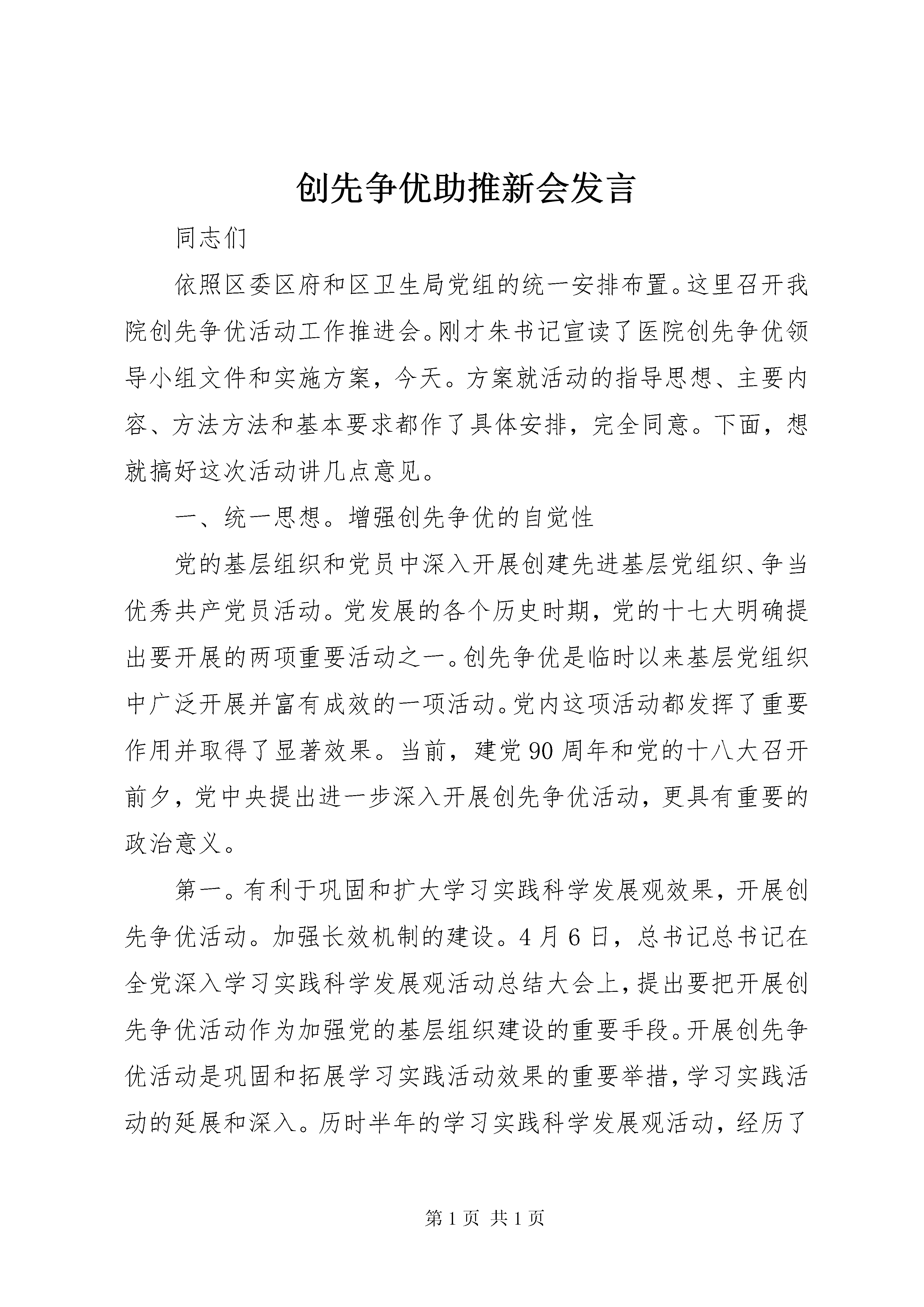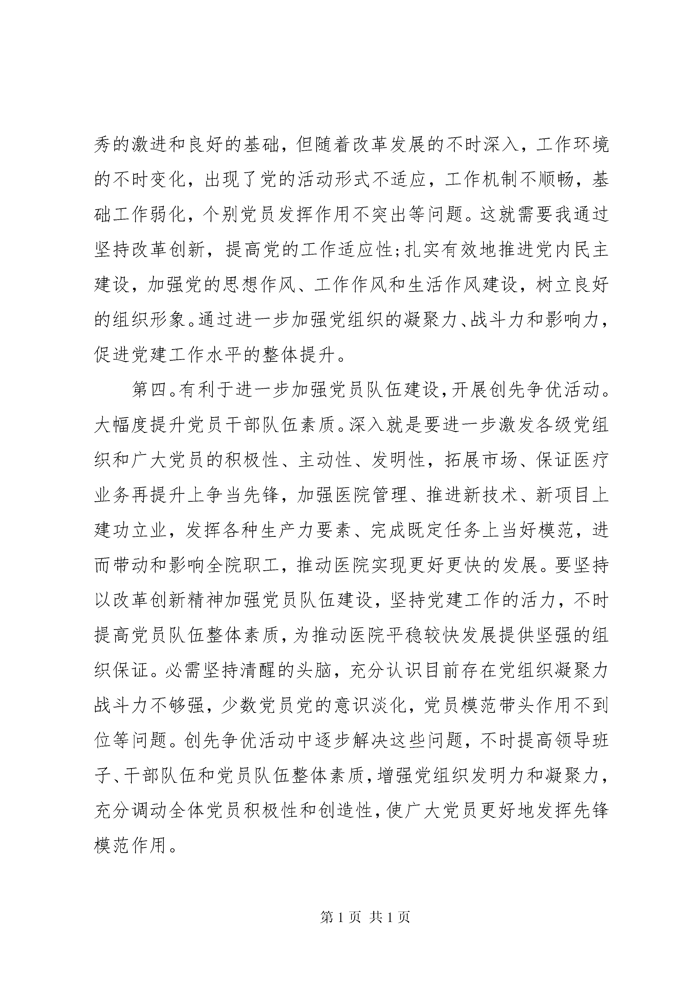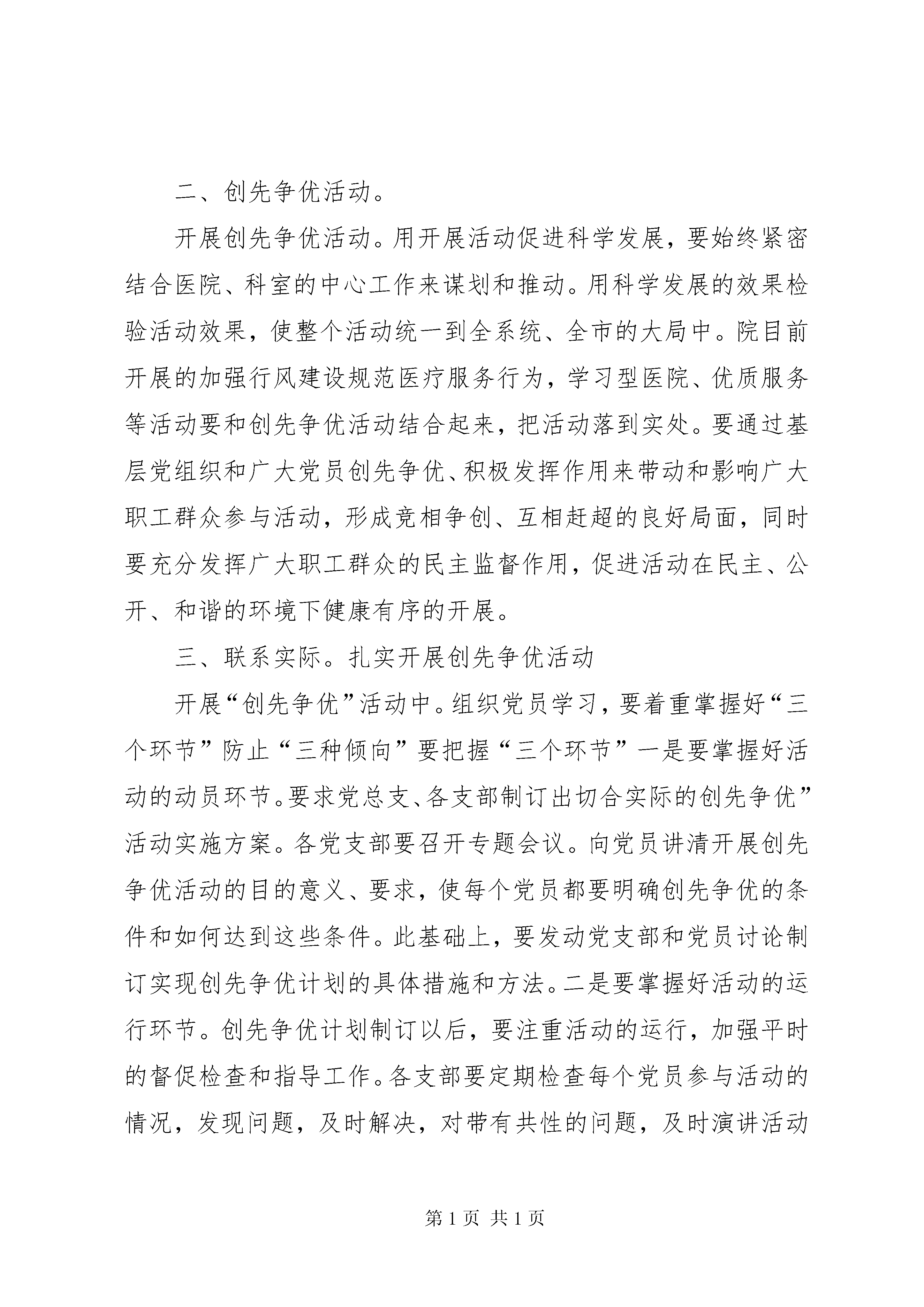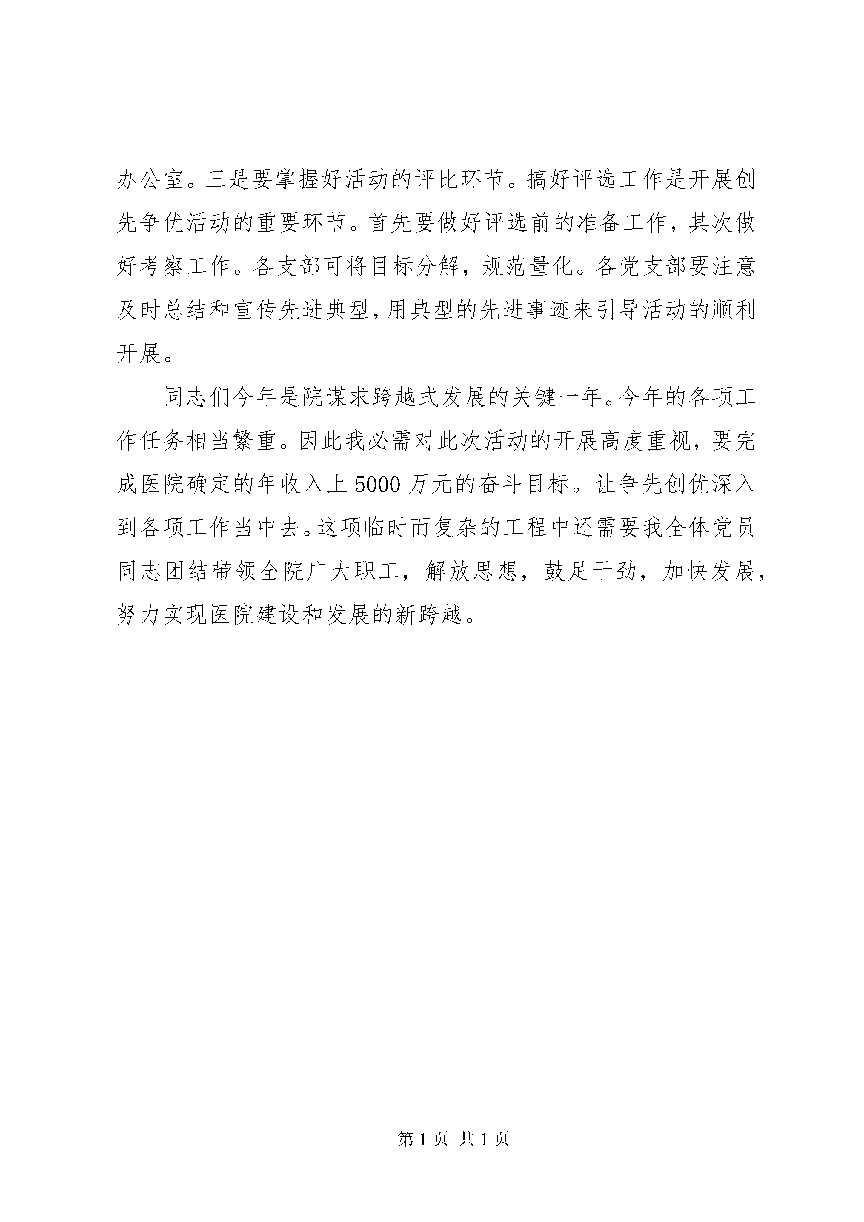 创先争优助推新会发言同志们依照区委区府和区卫生局党组的统一安排布置。这里召开我院创先争优活动工作推进会。刚才朱书记宣读了医院创先争优领导小组文件和实施方案,今天。方案就活动的指导思想、主要内容、方法方法和基本要求都作了具体安排,完全同意。下面,想就搞好这次活动讲几点意见。一、统一思想。增强创先争优的自觉性党的基层组织和党员中深入开展创建先进基层党组织、争当优秀共产党员活动。党发展的各个历史时期,党的十七大明确提出要开展的两项重要活动之一。创先争优是临时以来基层党组织中广泛开展并富有成效的一项活动。党内这项活动都发挥了重要作用并取得了显著效果。当前,建党90周年和党的十八大召开前夕,党中央提出进一步深入开展创先争优活动,更具有重要的政治意义。第一。有利于巩固和扩大学习实践科学发展观效果,开展创先争优活动。加强长效机制的建设。4月6日,总书记总书记在全党深入学习实践科学发展观活动总结大会上,提出要把开展创先争优活动作为加强党的基层组织建设的重要手段。开展创先争优活动是巩固和拓展学习实践活动效果的重要举措,学习实践活动的延展和深入。历时半年的学习实践科学发展观活动,经历了提高思想认识、解决突出问题、创新体制机制、促进科学发展、加强基层组织建设的不同阶段,取得了很好的效果。但也应该清醒地看到学习实践活动效果来之不易,巩固和扩大学习实践活动效果更需做出临时艰苦的努力。整改落实阶段查找进去的问题还没有完全解决,这需要通过进一步抓好各项整改落实的后续工作,兑现向职工群众作出的许诺,进一步健全促进科学发展的体制机制,推动学习实践活动向深度和广度发展。第二。有利于促进医院的快速发展。当前,开展创先争优活动。医院正面临着一个重要的发展机遇期,作为三医人,每个职工特别是每个共产党员要通过进一步增强振兴三医的强烈使命感和责任感,紧紧扭住机遇不放松,解放思想,勤奋工作,从自身岗位做起,争做业务技术过硬,服务质量创优,工作业绩突出的先进标兵。通过全院职工的不懈努力,力争在十二五”期间把我院建设成专业学科门内齐全,人才队伍结构合理,技术设备全市一流,综合管理精干高效,人文环境和谐向上的二甲医院。第三。有利于进一步加强基层组织建设,开展创先争优活动。夯实党的执政基础。党要管党,从严治党是党加强自身建设的一贯原则,新的历史时期,面对复杂的外部环境和艰巨的历史任务,加强党组织的自身建设,显得尤为重要。党的十七届四中全会,鲜明地提出了推进党的建设科学化水平”重要命题,这也是今后一个时期党的工作要把握的主旋律。党的自身建设方面,有着优秀的激进和良好的基础,但随着改革发展的不时深入,工作环境的不时变化,出现了党的活动形式不适应,工作机制不顺畅,基础工作弱化,个别党员发挥作用不突出等问题。这就需要我通过坚持改革创新,提高党的工作适应性;扎实有效地推进党内民主建设,加强党的思想作风、工作作风和生活作风建设,树立良好的组织形象。通过进一步加强党组织的凝聚力、战斗力和影响力,促进党建工作水平的整体提升。第四。有利于进一步加强党员队伍建设,开展创先争优活动。大幅度提升党员干部队伍素质。深入就是要进一步激发各级党组织和广大党员的积极性、主动性、发明性,拓展市场、保证医疗业务再提升上争当先锋,加强医院管理、推进新技术、新项目上建功立业,发挥各种生产力要素、完成既定任务上当好模范,进而带动和影响全院职工,推动医院实现更好更快的发展。要坚持以改革创新精神加强党员队伍建设,坚持党建工作的活力,不时提高党员队伍整体素质,为推动医院平稳较快发展提供坚强的组织保证。必需坚持清醒的头脑,充分认识目前存在党组织凝聚力战斗力不够强,少数党员党的意识淡化,党员模范带头作用不到位等问题。创先争优活动中逐步解决这些问题,不时提高领导班子、干部队伍和党员队伍整体素质,增强党组织发明力和凝聚力,充分调动全体党员积极性和创造性,使广大党员更好地发挥先锋模范作用。二、创先争优活动。开展创先争优活动。用开展活动促进科学发展,要始终紧密结合医院、科室的中心工作来谋划和推动。用科学发展的效果检验活动效果,使整个活动统一到全系统、全市的大局中。院目前开展的加强行风建设规范医疗服务行为,学习型医院、优质服务等活动要和创先争优活动结合起来,把活动落到实处。要通过基层党组织和广大党员创先争优、积极发挥作用来带动和影响广大职工群众参与活动,形成竞相争创、互相赶超的良好局面,同时要充分发挥广大职工群众的民主监督作用,促进活动在民主、公开、和谐的环境下健康有序的开展。三、联系实际。扎实开展创先争优活动开展“创先争优”活动中。组织党员学习,要着重掌握好“三个环节”防止“三种倾向”要把握“三个环节”一是要掌握好活动的动员环节。要求党总支、各支部制订出切合实际的创先争优”活动实施方案。各党支部要召开专题会议。向党