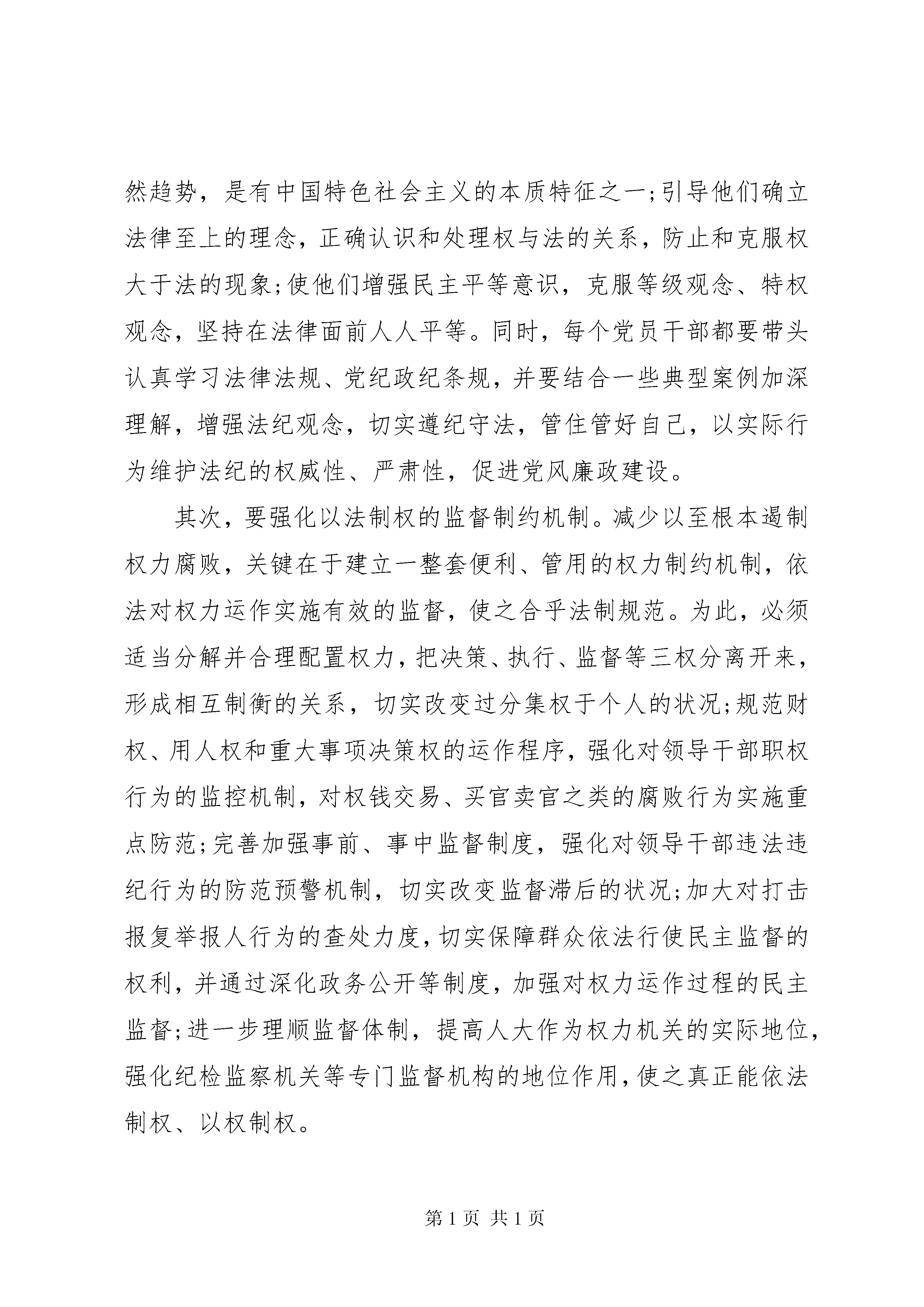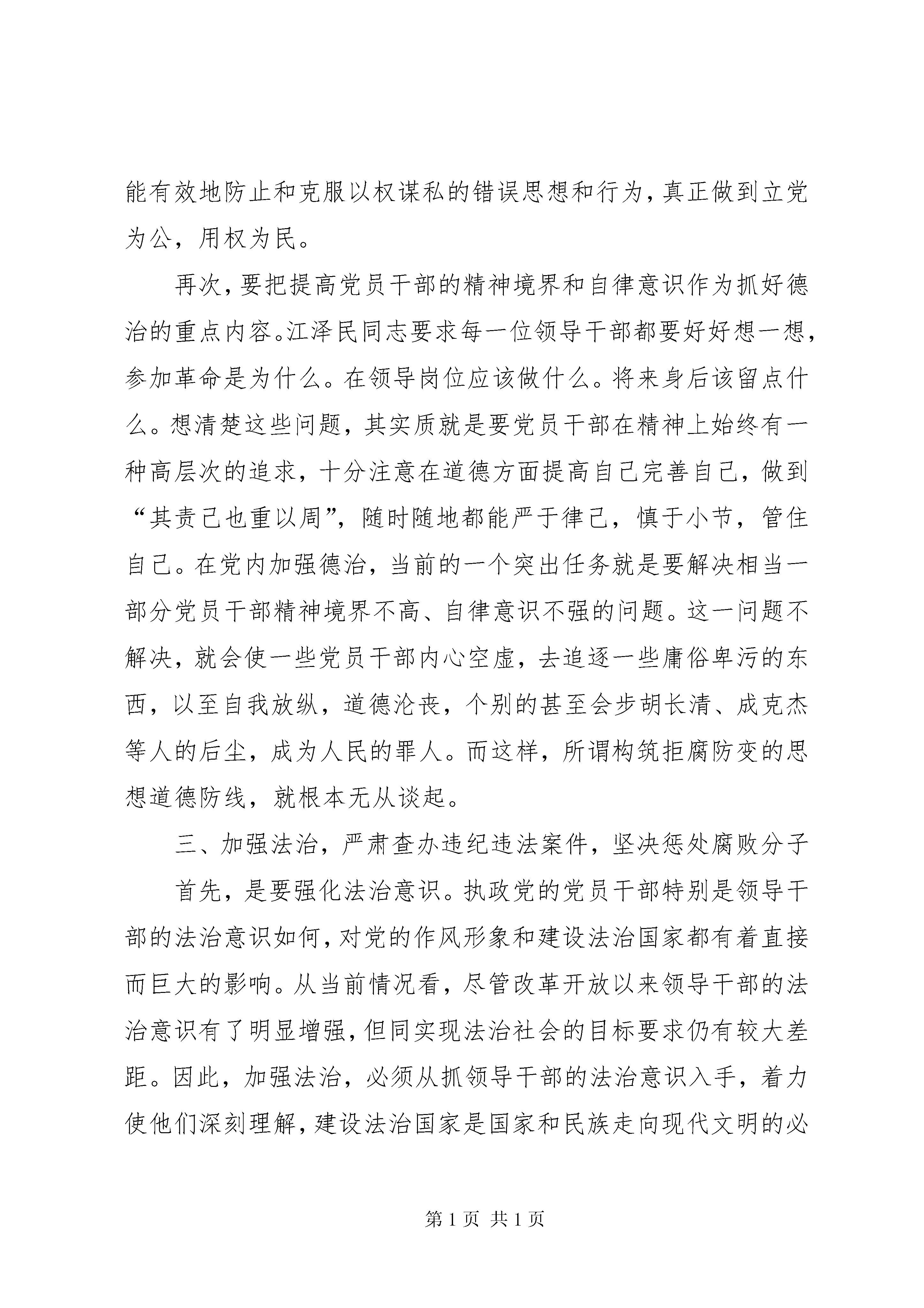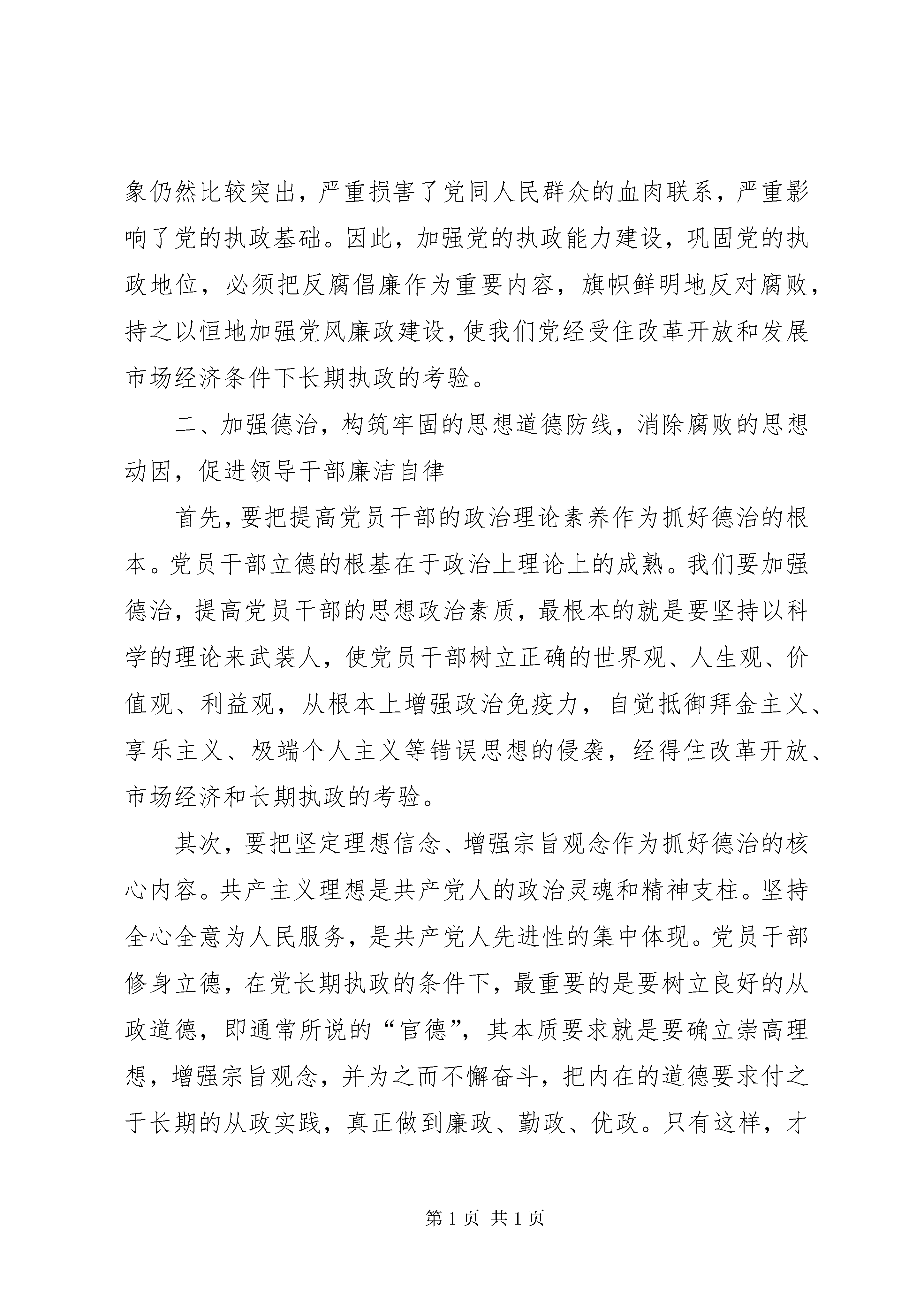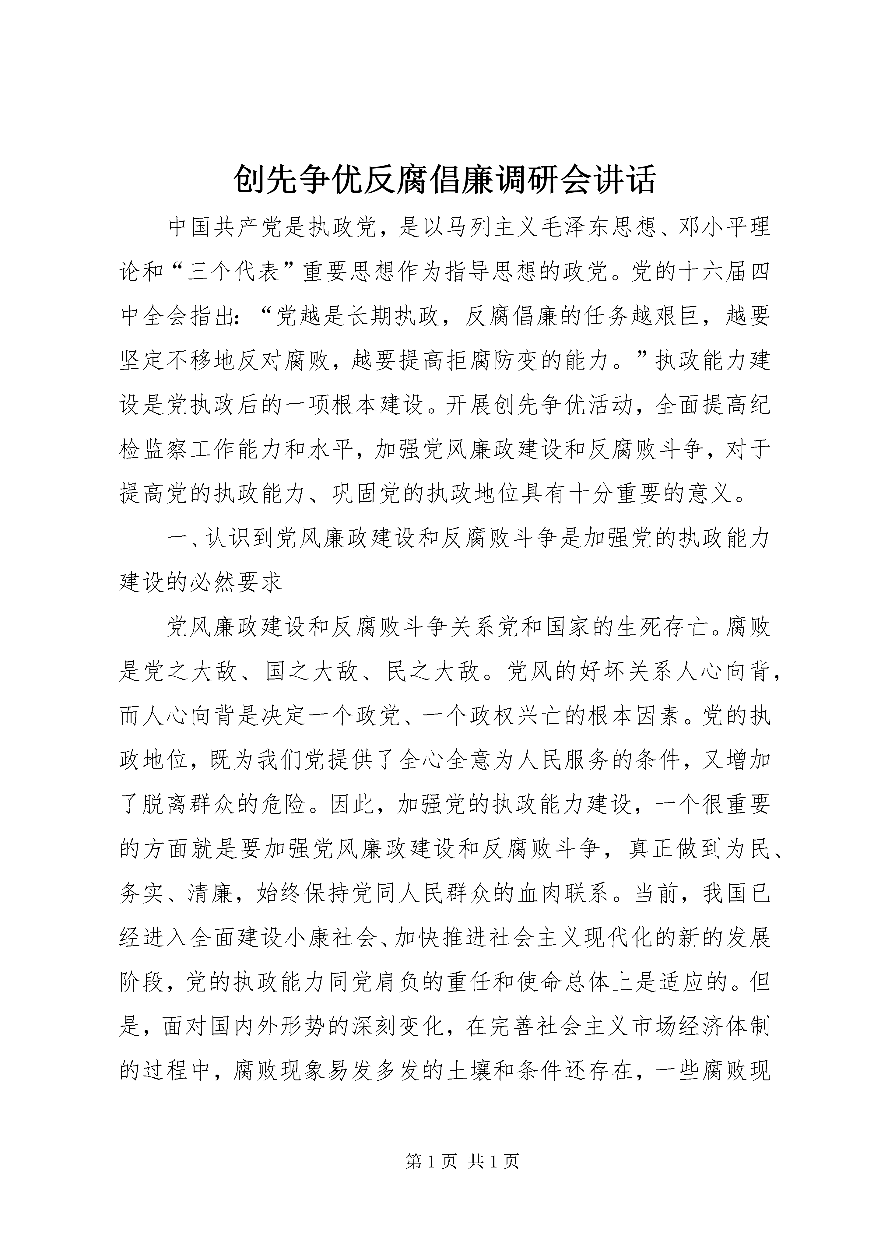 创先争优反腐倡廉调研会讲话中国共产党是执政党,是以马列主义毛泽东思想、邓小平理论和“三个代表”重要思想作为指导思想的政党。党的十六届四中全会指出:“党越是长期执政,反腐倡廉的任务越艰巨,越要坚定不移地反对腐败,越要提高拒腐防变的能力。”执政能力建设是党执政后的一项根本建设。开展创先争优活动,全面提高纪检监察工作能力和水平,加强党风廉政建设和反腐败斗争,对于提高党的执政能力、巩固党的执政地位具有十分重要的意义。一、认识到党风廉政建设和反腐败斗争是加强党的执政能力建设的必然要求党风廉政建设和反腐败斗争关系党和国家的生死存亡。腐败是党之大敌、国之大敌、民之大敌。党风的好坏关系人心向背,而人心向背是决定一个政党、一个政权兴亡的根本因素。党的执政地位,既为我们党提供了全心全意为人民服务的条件,又增加了脱离群众的危险。因此,加强党的执政能力建设,一个很重要的方面就是要加强党风廉政建设和反腐败斗争,真正做到为民、务实、清廉,始终保持党同人民群众的血肉联系。当前,我国已经进入全面建设小康社会、加快推进社会主义现代化的新的发展阶段,党的执政能力同党肩负的重任和使命总体上是适应的。但是,面对国内外形势的深刻变化,在完善社会主义市场经济体制的过程中,腐败现象易发多发的土壤和条件还存在,一些腐败现象仍然比较突出,严重损害了党同人民群众的血肉联系,严重影响了党的执政基础。因此,加强党的执政能力建设,巩固党的执政地位,必须把反腐倡廉作为重要内容,旗帜鲜明地反对腐败,持之以恒地加强党风廉政建设,使我们党经受住改革开放和发展市场经济条件下长期执政的考验。二、加强德治,构筑牢固的思想道德防线,消除腐败的思想动因,促进领导干部廉洁自律首先,要把提高党员干部的政治理论素养作为抓好德治的根本。党员干部立德的根基在于政治上理论上的成熟。我们要加强德治,提高党员干部的思想政治素质,最根本的就是要坚持以科学的理论来武装人,使党员干部树立正确的世界观、人生观、价值观、利益观,从根本上增强政治免疫力,自觉抵御拜金主义、享乐主义、极端个人主义等错误思想的侵袭,经得住改革开放、市场经济和长期执政的考验。其次,要把坚定理想信念、增强宗旨观念作为抓好德治的核心内容。共产主义理想是共产党人的政治灵魂和精神支柱。坚持全心全意为人民服务,是共产党人先进性的集中体现。党员干部修身立德,在党长期执政的条件下,最重要的是要树立良好的从政道德,即通常所说的“官德”,其本质要求就是要确立崇高理想,增强宗旨观念,并为之而不懈奋斗,把内在的道德要求付之于长期的从政实践,真正做到廉政、勤政、优政。只有这样,才能有效地防止和克服以权谋私的错误思想和行为,真正做到立党为公,用权为民。再次,要把提高党员干部的精神境界和自律意识作为抓好德治的重点内容。江泽民同志要求每一位领导干部都要好好想一想,参加革命是为什么。在领导岗位应该做什么。将来身后该留点什么。想清楚这些问题,其实质就是要党员干部在精神上始终有一种高层次的追求,十分注意在道德方面提高自己完善自己,做到“其责己也重以周”,随时随地都能严于律己,慎于小节,管住自己。在党内加强德治,当前的一个突出任务就是要解决相当一部分党员干部精神境界不高、自律意识不强的问题。这一问题不解决,就会使一些党员干部内心空虚,去追逐一些庸俗卑污的东西,以至自我放纵,道德沦丧,个别的甚至会步胡长清、成克杰等人的后尘,成为人民的罪人。而这样,所谓构筑拒腐防变的思想道德防线,就根本无从谈起。三、加强法治,严肃查办违纪违法案件,坚决惩处腐败分子首先,是要强化法治意识。执政党的党员干部特别是领导干部的法治意识如何,对党的作风形象和建设法治国家都有着直接而巨大的影响。从当前情况看,尽管改革开放以来领导干部的法治意识有了明显增强,但同实现法治社会的目标要求仍有较大差距。因此,加强法治,必须从抓领导干部的法治意识入手,着力使他们深刻理解,建设法治国家是国家和民族走向现代文明的必然趋势,是有中国特色社会主义的本质特征之一;引导他们确立法律至上的理念,正确认识和处理权与法的关系,防止和克服权大于法的现象;使他们增强民主平等意识,克服等级观念、特权观念,坚持在法律面前人人平等。同时,每个党员干部都要带头认真学习法律法规、党纪政纪条规,并要结合一些典型案例加深理解,增强法纪观念,切实遵纪守法,管住管好自己,以实际行为维护法纪的权威性、严肃性,促进党风廉政建设。其次,要强化以法制权的监督制约机制。减少以至根本遏制权力腐败,关键在于建立一整套便利、管用的权力制约机制,依法对权力运作实施有效的监督,使之合乎法制规范。为此,必须适当分解并合理配置权力,把决策、执行、监督等三权分离开来,形成相互制衡的关系,切实改变过分集权于个人的状况;规范财权、用人权和重大事项决策权的运作程序,强化对领导
