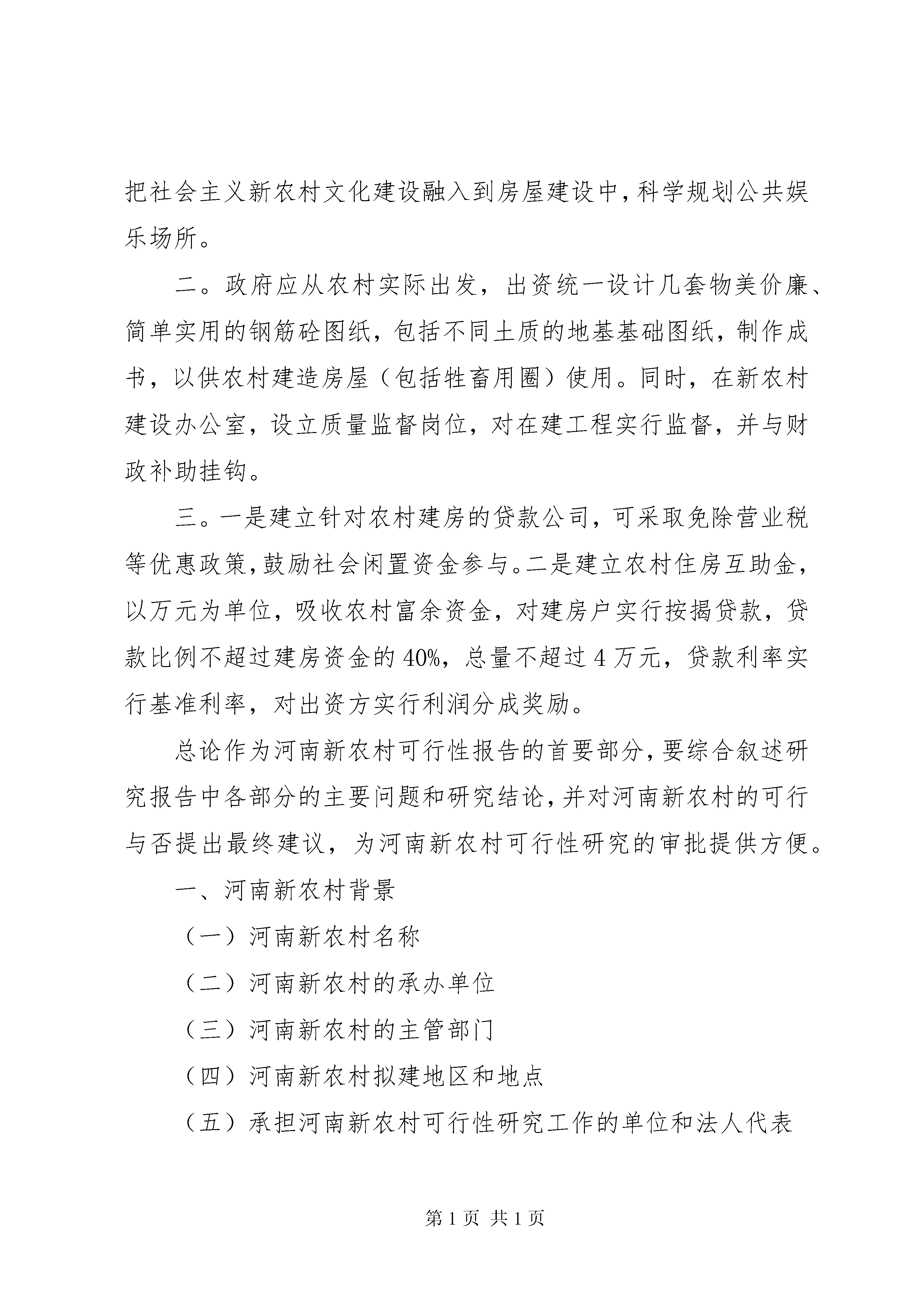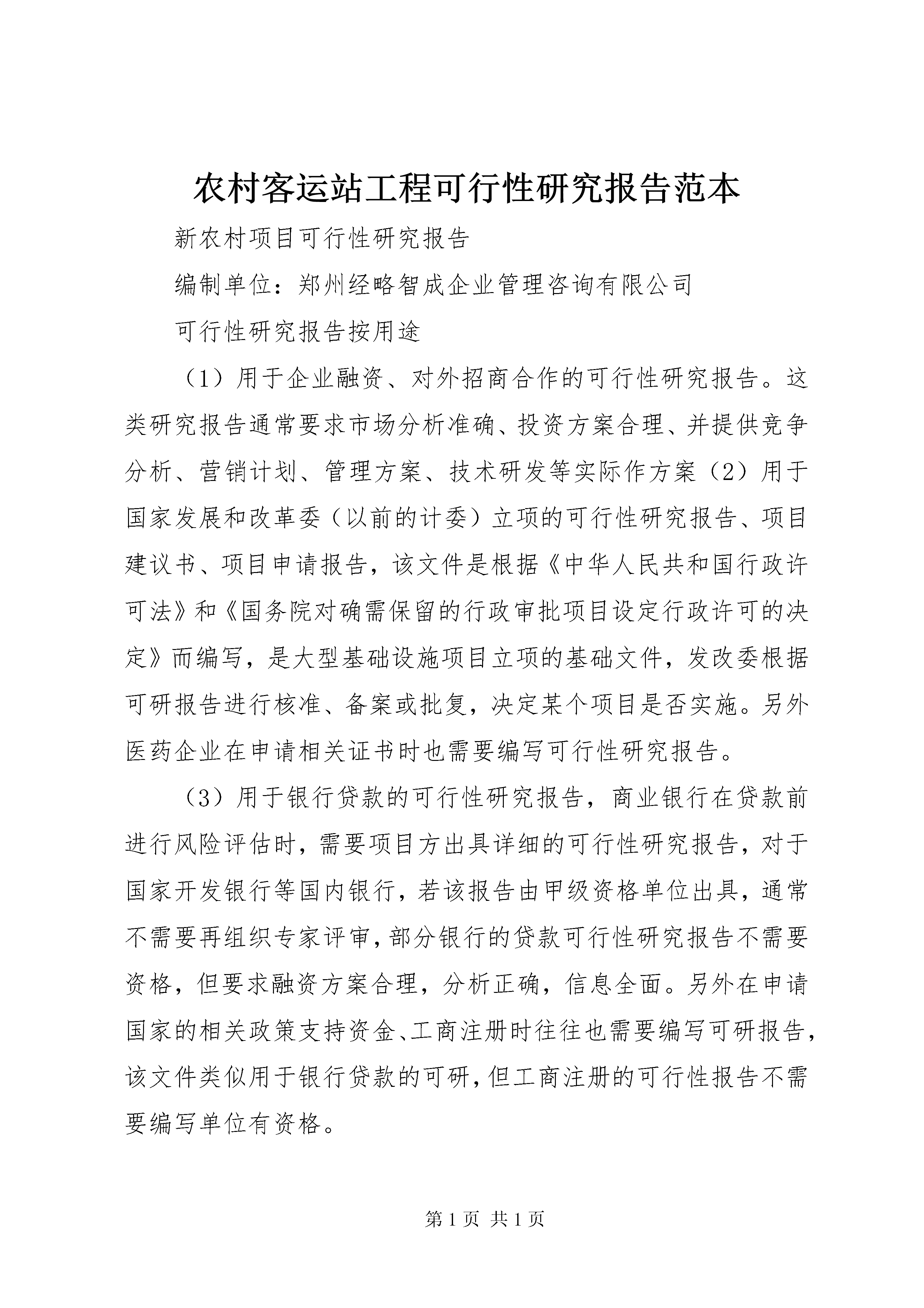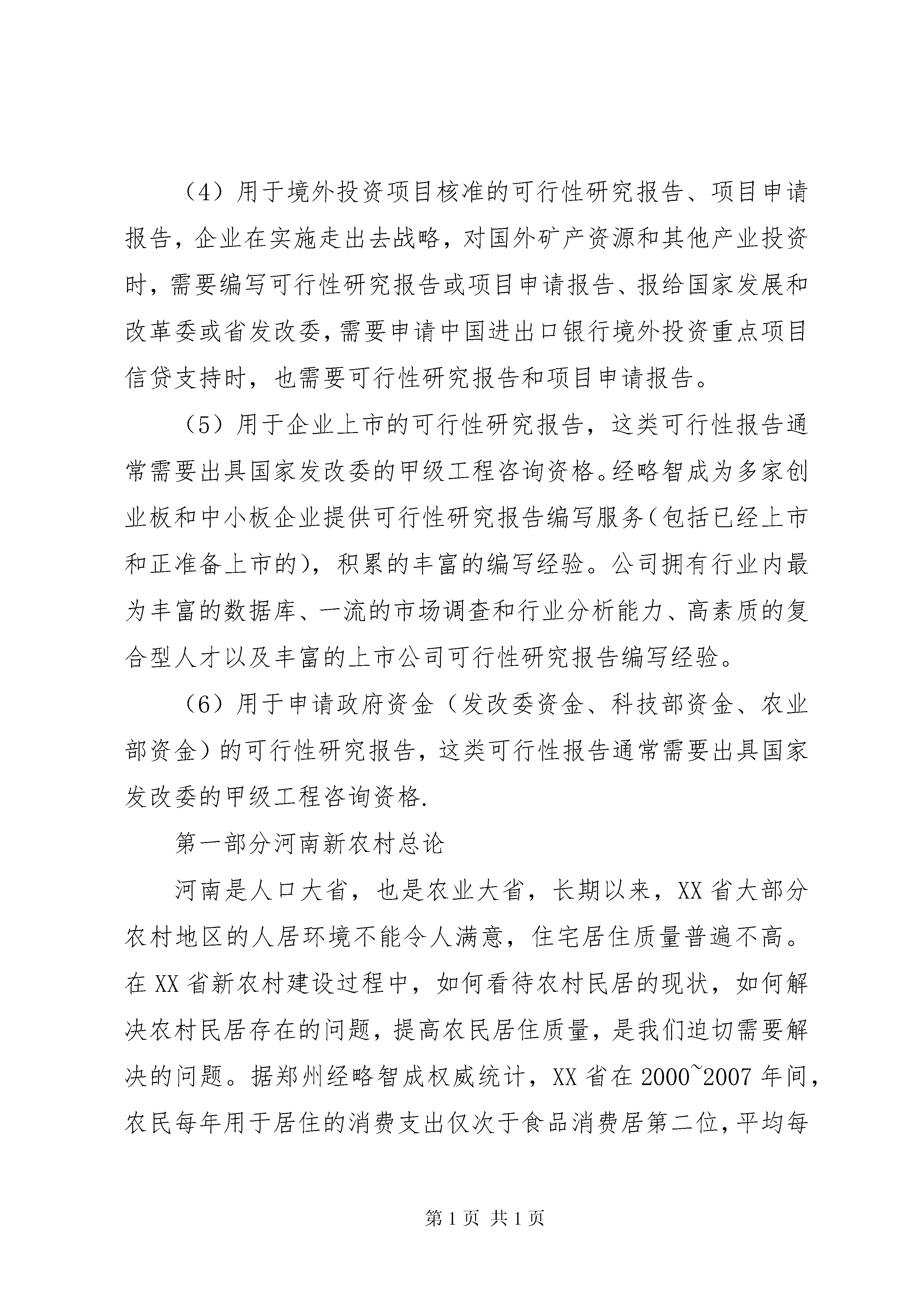 农村客运站工程可行性研究报告范本新农村项目可行性研究报告编制单位:郑州经略智成企业管理咨询有限公司可行性研究报告按用途(1)用于企业融资、对外招商合作的可行性研究报告。这类研究报告通常要求市场分析准确、投资方案合理、并提供竞争分析、营销计划、管理方案、技术研发等实际作方案(2)用于国家发展和改革委(以前的计委)立项的可行性研究报告、项目建议书、项目申请报告,该文件是根据《中华人民共和国行政许可法》和《国务院对确需保留的行政审批项目设定行政许可的决定》而编写,是大型基础设施项目立项的基础文件,发改委根据可研报告进行核准、备案或批复,决定某个项目是否实施。另外医药企业在申请相关证书时也需要编写可行性研究报告。(3)用于银行贷款的可行性研究报告,商业银行在贷款前进行风险评估时,需要项目方出具详细的可行性研究报告,对于国家开发银行等国内银行,若该报告由甲级资格单位出具,通常不需要再组织专家评审,部分银行的贷款可行性研究报告不需要资格,但要求融资方案合理,分析正确,信息全面。另外在申请国家的相关政策支持资金、工商注册时往往也需要编写可研报告,该文件类似用于银行贷款的可研,但工商注册的可行性报告不需要编写单位有资格。(4)用于境外投资项目核准的可行性研究报告、项目申请报告,企业在实施走出去战略,对国外矿产资源和其他产业投资时,需要编写可行性研究报告或项目申请报告、报给国家发展和改革委或省发改委,需要申请中国进出口银行境外投资重点项目信贷支持时,也需要可行性研究报告和项目申请报告。(5)用于企业上市的可行性研究报告,这类可行性报告通常需要出具国家发改委的甲级工程咨询资格。经略智成为多家创业板和中小板企业提供可行性研究报告编写服务(包括已经上市和正准备上市的),积累的丰富的编写经验。公司拥有行业内最为丰富的数据库、一流的市场调查和行业分析能力、高素质的复合型人才以及丰富的上市公司可行性研究报告编写经验。(6)用于申请政府资金(发改委资金、科技部资金、农业部资金)的可行性研究报告,这类可行性报告通常需要出具国家发改委的甲级工程咨询资格.第一部分河南新农村总论河南是人口大省,也是农业大省,长期以来,XX省大部分农村地区的人居环境不能令人满意,住宅居住质量普遍不高。在XX省新农村建设过程中,如何看待农村民居的现状,如何解决农村民居存在的问题,提高农民居住质量,是我们迫切需要解决的问题。据郑州经略智成权威统计,XX省在2000~2007年间,农民每年用于居住的消费支出仅次于食品消费居第二位,平均每人年内新建(购)住房面积从0.9m2增加到2.0m2。仅2007年,全省村庄住宅施工13333万m2,竣工11866万m2,均远远超过全省城镇住房建设总量。2007年新建住宅中,新建楼房占93%。2007年底,农村人均住房面积达30.2m2。【问题分析】(一)农村建设无规划。“村村通”工程后,农村基本实现“路通车,管通水,线通电,电视摩托进万家”的新面貌。但是,在村户布局、公共场所、文化建设等方面,缺乏科学论证和整体规划,许多村、社都没有公共娱乐场所,已经建成的公共场所也存在不合理成分,甚至面临拆除重建的重复投资危险。(二)房屋建设无图纸。目前,农村住房样式多样,根据实力可分为土木、砖木和砖混三种结构。土木和砖木结构主要以木架结构为骨架,其式样较传统,变化不大,建造阶段多以木匠师傅的“墨线”为依据,无需图纸。(三)住房贷款无着落。在农村,因为无有效抵押,住房贷款是很困难的,绝大多数靠亲朋好友支持。几乎在所有的村镇,都能看见半拉子工程,不是农民不想一口气把房子建好,而是农民真的无法筹到建房资金。【发展策略】一。政府成立农村建设规划部门,针对不同村落所处的地理位置和气候特点,规划出房屋布局和界线,合理处置空房、空地,把社会主义新农村文化建设融入到房屋建设中,科学规划公共娱乐场所。二。政府应从农村实际出发,出资统一设计几套物美价廉、简单实用的钢筋砼图纸,包括不同土质的地基基础图纸,制作成书,以供农村建造房屋(包括牲畜用圈)使用。同时,在新农村建设办公室,设立质量监督岗位,对在建工程实行监督,并与财政补助挂钩。三。一是建立针对农村建房的贷款公司,可采取免除营业税等优惠政策,鼓励社会闲置资金参与。二是建立农村住房互助金,以万元为单位,吸收农村富余资金,对建房户实行按揭贷款,贷款比例不超过建房资金的40%,总量不超过4万元,贷款利率实行基准利率,对出资方实行利润分成奖励。总论作为河南新农村可行性报告的首要部分,要综合叙述研究报告中各部分的主要问题和研究结论,并对河南新农村的可行与否提出最终建议,为河南新农村可行性研究的审批提供方便。一、河南新农村背景(一)河南新农村名称(二)河南新农村的承办单位(三)河南新农村的主管部门(四)河南新农村拟建地区
