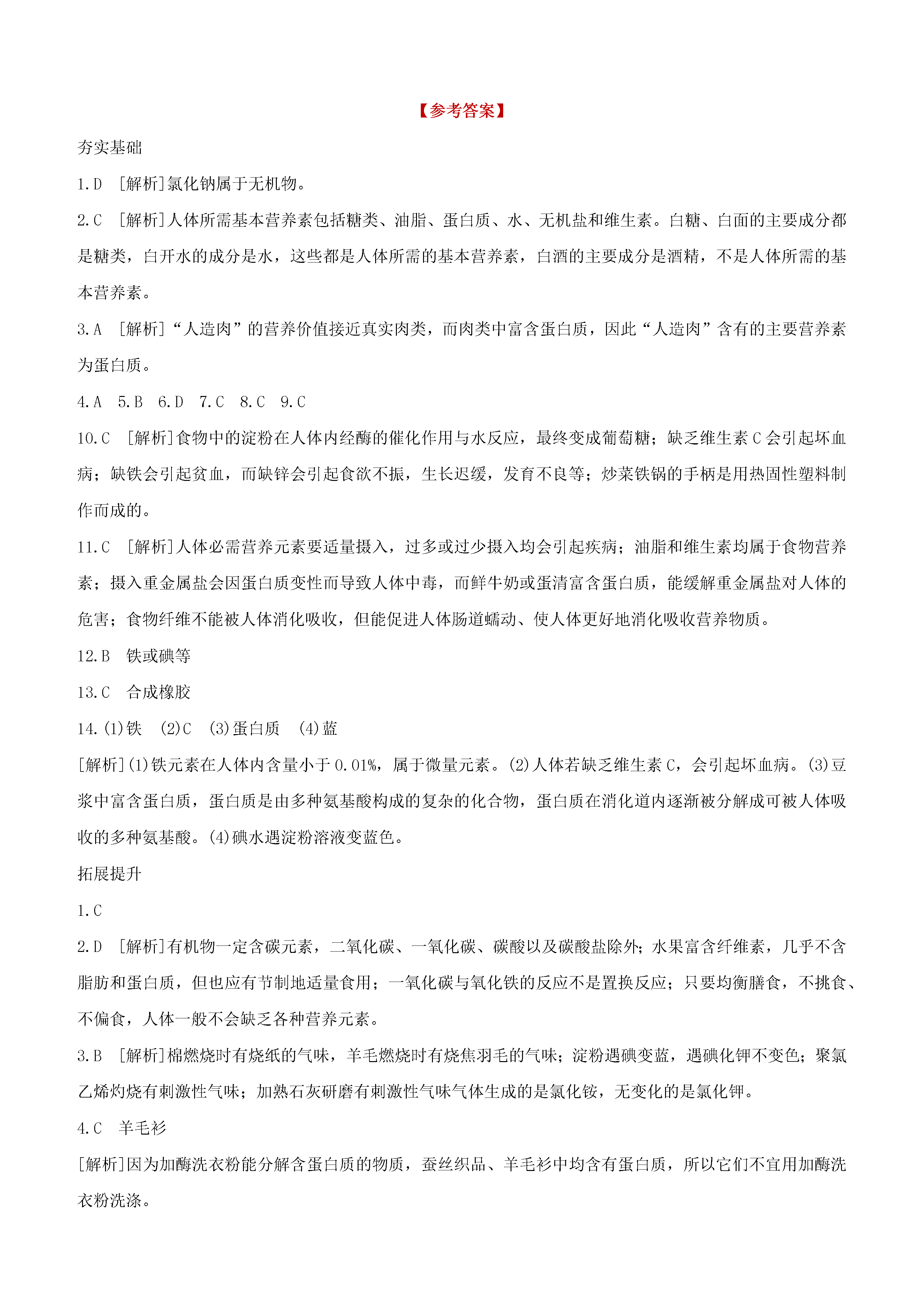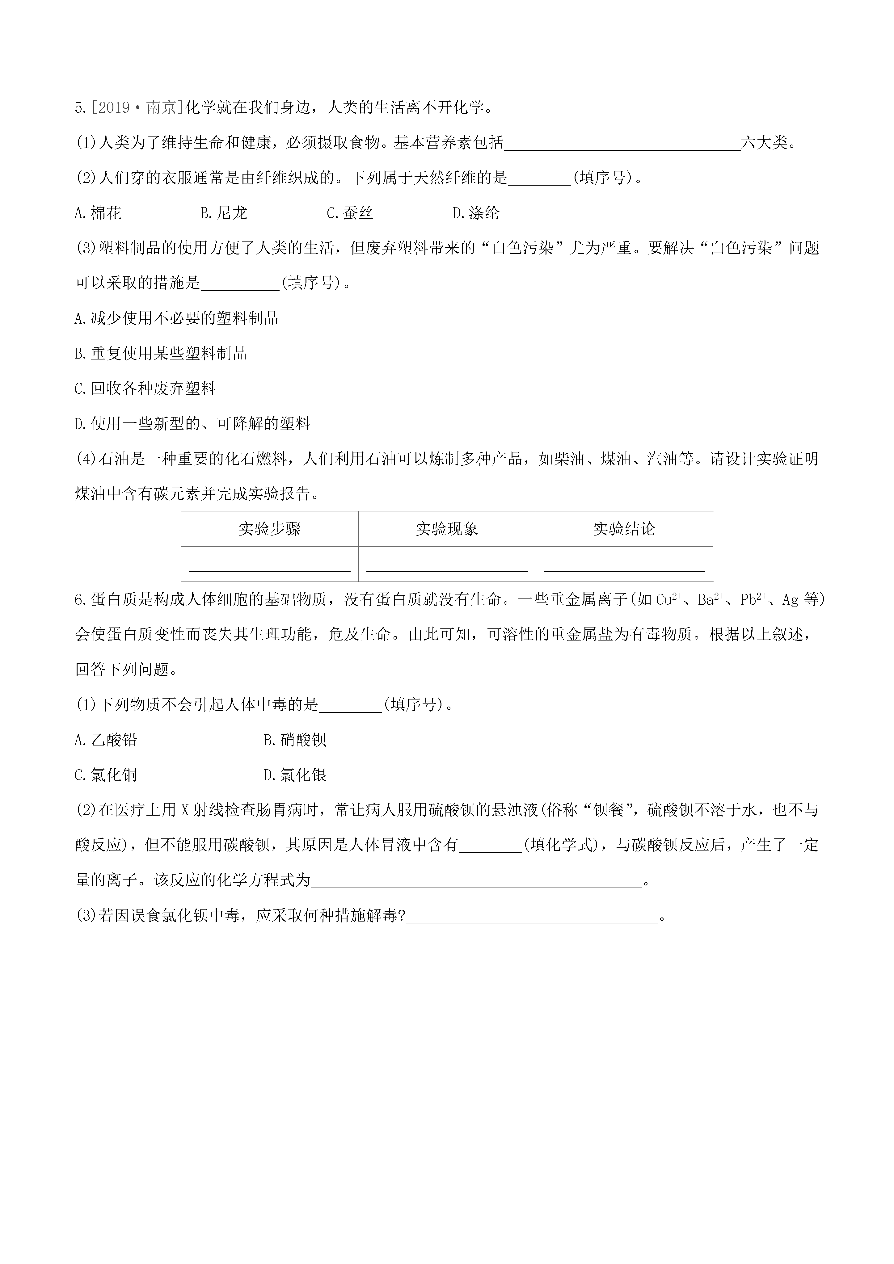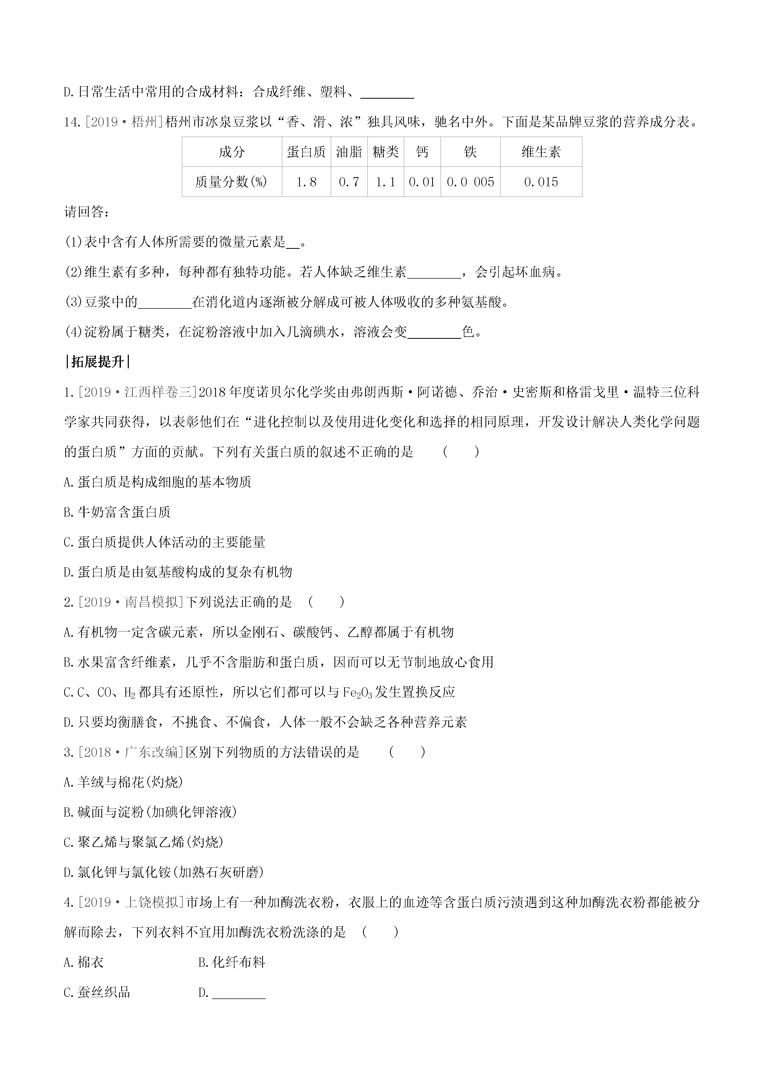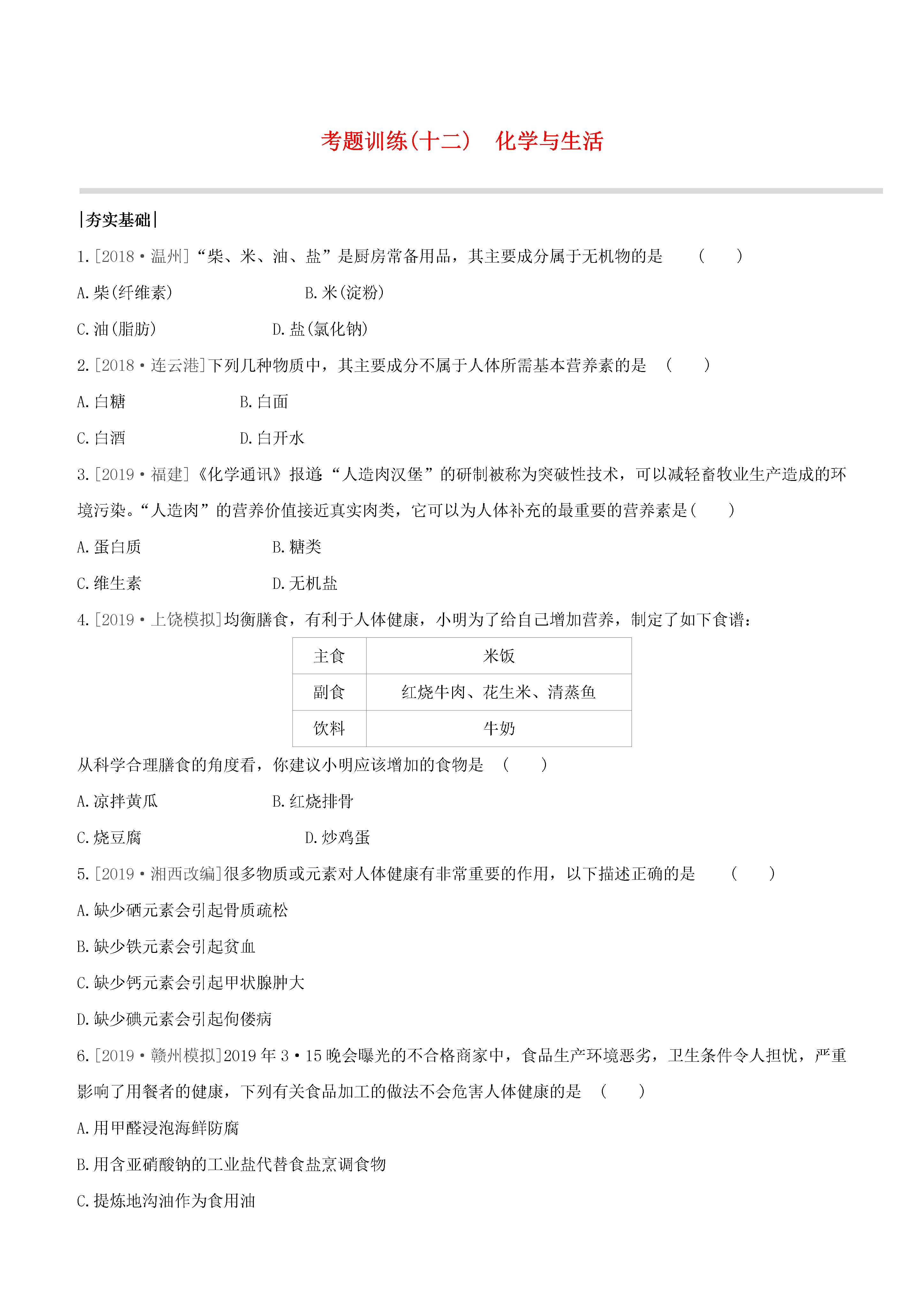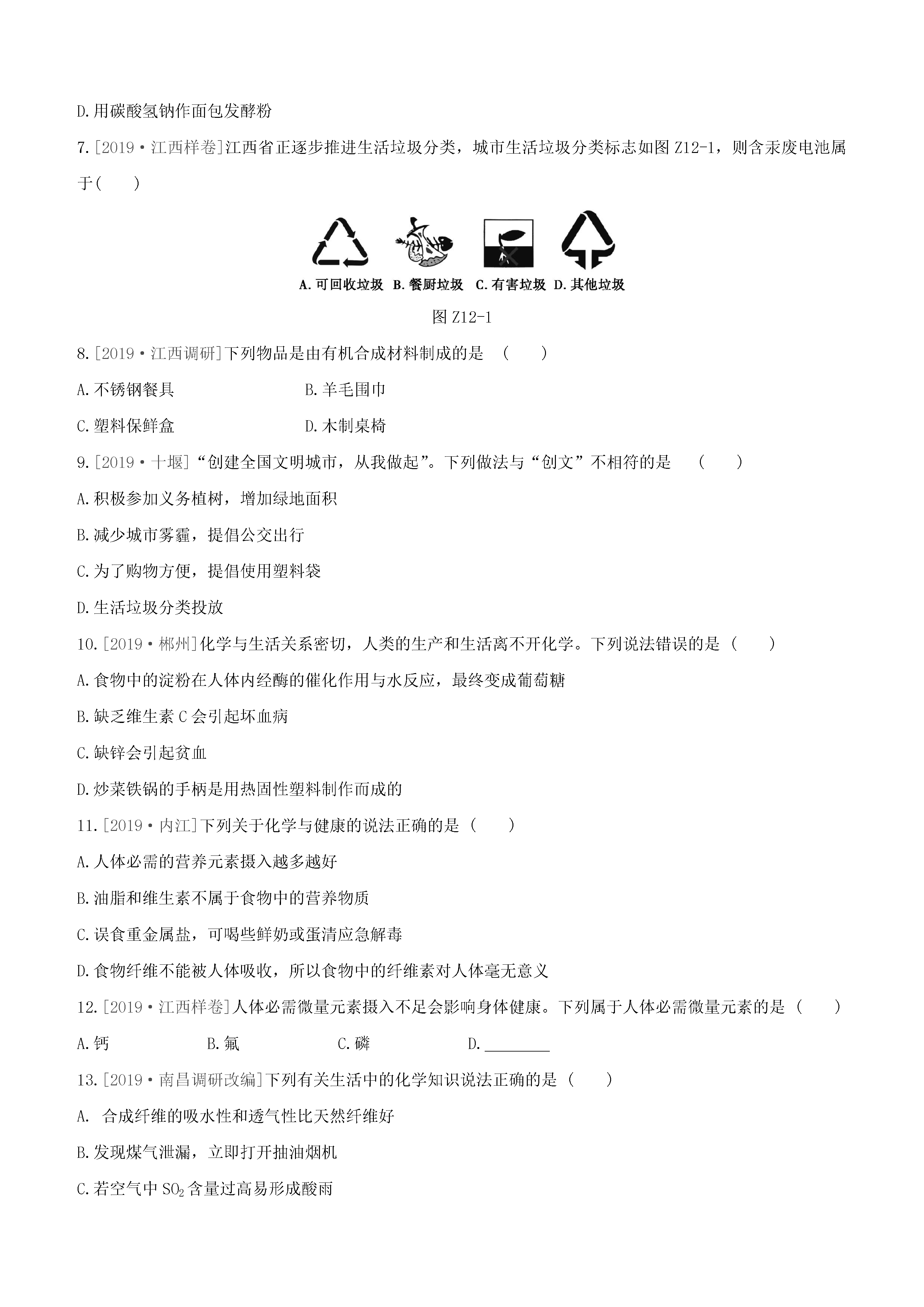 考题训练(十二)化学与生活|夯实基础|1.[2018·温州]“柴、米、油、盐”是厨房常备用品,其主要成分属于无机物的是()A.柴(纤维素)B.米(淀粉)C.油(脂肪)D.盐(氯化钠)2.[2018·连云港]下列几种物质中,其主要成分不属于人体所需基本营养素的是()A.白糖B.白面C.白酒D.白开水3.[2019·福建]《化学通讯》报道:“人造肉汉堡”的研制被称为突破性技术,可以减轻畜牧业生产造成的环境污染。“人造肉”的营养价值接近真实肉类,它可以为人体补充的最重要的营养素是()A.蛋白质B.糖类C.维生素D.无机盐4.[2019·上饶模拟]均衡膳食,有利于人体健康,小明为了给自己增加营养,制定了如下食谱:主食米饭副食红烧牛肉、花生米、清蒸鱼饮料牛奶从科学合理膳食的角度看,你建议小明应该增加的食物是()A.凉拌黄瓜B.红烧排骨C.烧豆腐D.炒鸡蛋5.[2019·湘西改编]很多物质或元素对人体健康有非常重要的作用,以下描述正确的是()A.缺少硒元素会引起骨质疏松B.缺少铁元素会引起贫血C.缺少钙元素会引起甲状腺肿大D.缺少碘元素会引起佝偻病6.[2019·赣州模拟]2019年3·15晚会曝光的不合格商家中,食品生产环境恶劣,卫生条件令人担忧,严重影响了用餐者的健康,下列有关食品加工的做法不会危害人体健康的是()A.用甲醛浸泡海鲜防腐B.用含亚硝酸钠的工业盐代替食盐烹调食物C.提炼地沟油作为食用油D.用碳酸氢钠作面包发酵粉7.[2019·江西样卷]江西省正逐步推进生活垃圾分类,城市生活垃圾分类标志如图Z12-1,则含汞废电池属于()图Z12-18.[2019·江西调研]下列物品是由有机合成材料制成的是()A.不锈钢餐具B.羊毛围巾C.塑料保鲜盒D.木制桌椅9.[2019·十堰]“创建全国文明城市,从我做起”。下列做法与“创文”不相符的是()A.积极参加义务植树,增加绿地面积B.减少城市雾霾,提倡公交出行C.为了购物方便,提倡使用塑料袋D.生活垃圾分类投放10.[2019·郴州]化学与生活关系密切,人类的生产和生活离不开化学。下列说法错误的是()A.食物中的淀粉在人体内经酶的催化作用与水反应,最终变成葡萄糖B.缺乏维生素C会引起坏血病C.缺锌会引起贫血D.炒菜铁锅的手柄是用热固性塑料制作而成的11.[2019·内江]下列关于化学与健康的说法正确的是()A.人体必需的营养元素摄入越多越好B.油脂和维生素不属于食物中的营养物质C.误食重金属盐,可喝些鲜奶或蛋清应急解毒D.食物纤维不能被人体吸收,所以食物中的纤维素对人体毫无意义12.[2019·江西样卷]人体必需微量元素摄入不足会影响身体健康。下列属于人体必需微量元素的是()A.钙B.氟C.磷D.13.[2019·南昌调研改编]下列有关生活中的化学知识说法正确的是()A.合成纤维的吸水性和透气性比天然纤维好B.发现煤气泄漏,立即打开抽油烟机C.若空气中SO2含量过高易形成酸雨D.日常生活中常用的合成材料:合成纤维、塑料、14.[2019·梧州]梧州市冰泉豆浆以“香、滑、浓”独具风味,驰名中外。下面是某品牌豆浆的营养成分表。成分蛋白质油脂糖类钙铁维生素质量分数(%)1.80.71.10.010.00050.015请回答:(1)表中含有人体所需要的微量元素是。(2)维生素有多种,每种都有独特功能。若人体缺乏维生素,会引起坏血病。(3)豆浆中的在消化道内逐渐被分解成可被人体吸收的多种氨基酸。(4)淀粉属于糖类,在淀粉溶液中加入几滴碘水,溶液会变色。|拓展提升|1.[2019·江西样卷三]2018年度诺贝尔化学奖由弗朗西斯·阿诺德、乔治·史密斯和格雷戈里·温特三位科学家共同获得,以表彰他们在“进化控制以及使用进化变化和选择的相同原理,开发设计解决人类化学问题的蛋白质”方面的贡献。下列有关蛋白质的叙述不正确的是()A.蛋白质是构成细胞的基本物质B.牛奶富含蛋白质C.蛋白质提供人体活动的主要能量D.蛋白质是由氨基酸构成的复杂有机物2.[2019·南昌模拟]下列说法正确的是()A.有机物一定含碳元素,所以金刚石、碳酸钙、乙醇都属于有机物B.水果富含纤维素,几乎不含脂肪和蛋白质,因而可以无节制地放心食用C.C、CO、H2都具有还原性,所以它们都可以与Fe2O3发生置换反应D.只要均衡膳食,不挑食、不偏食,人体一般不会缺乏各种营养元素3.[2018·广东改编]区别下列物质的方法错误的是()A.羊绒与棉花(灼烧)B.碱面与淀粉(加碘化钾溶液)C.聚乙烯与聚氯乙烯(灼烧)D.氯化钾与氯化铵(加熟石灰研磨)4.[2019·上饶模拟]市场上有一种加酶