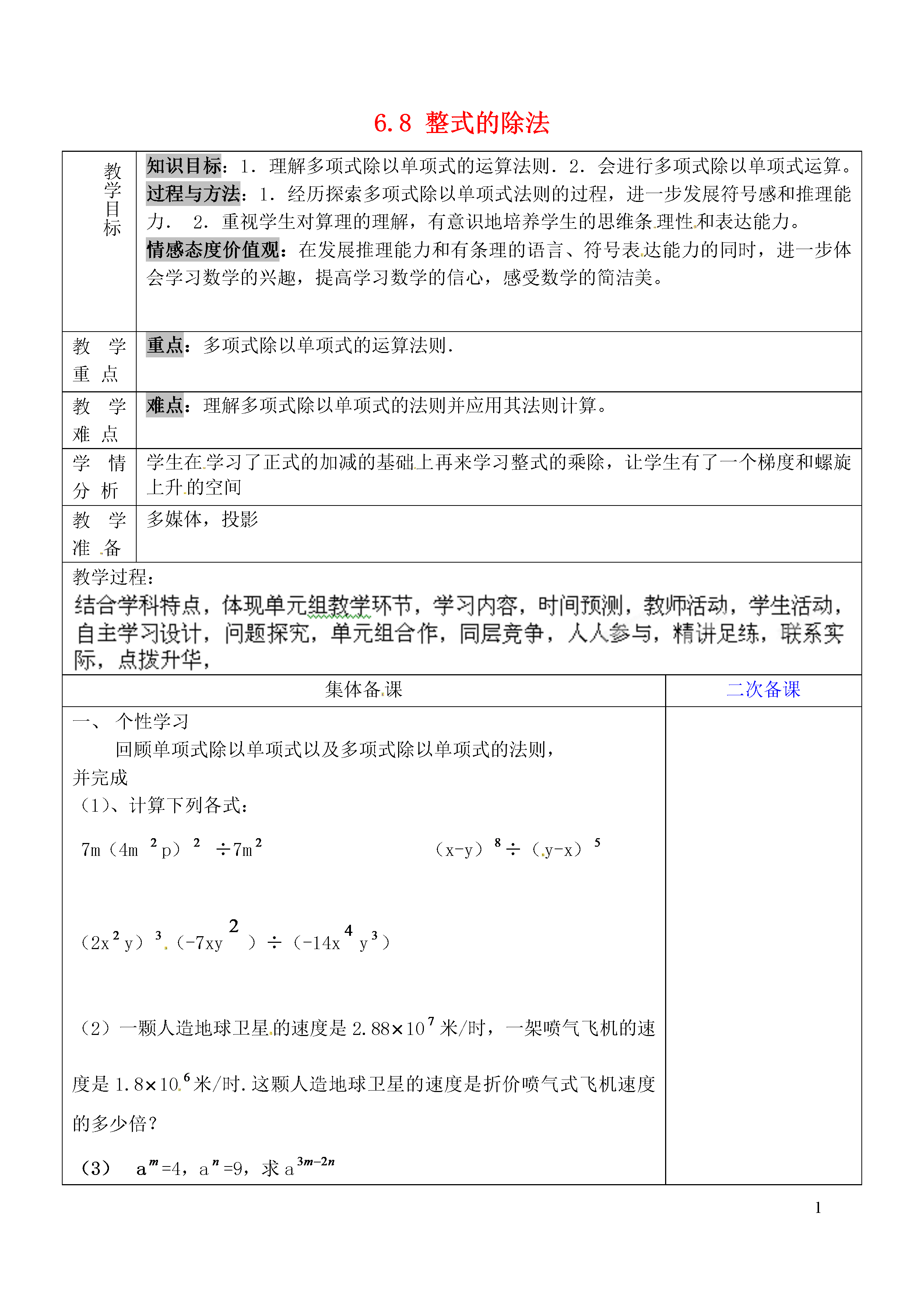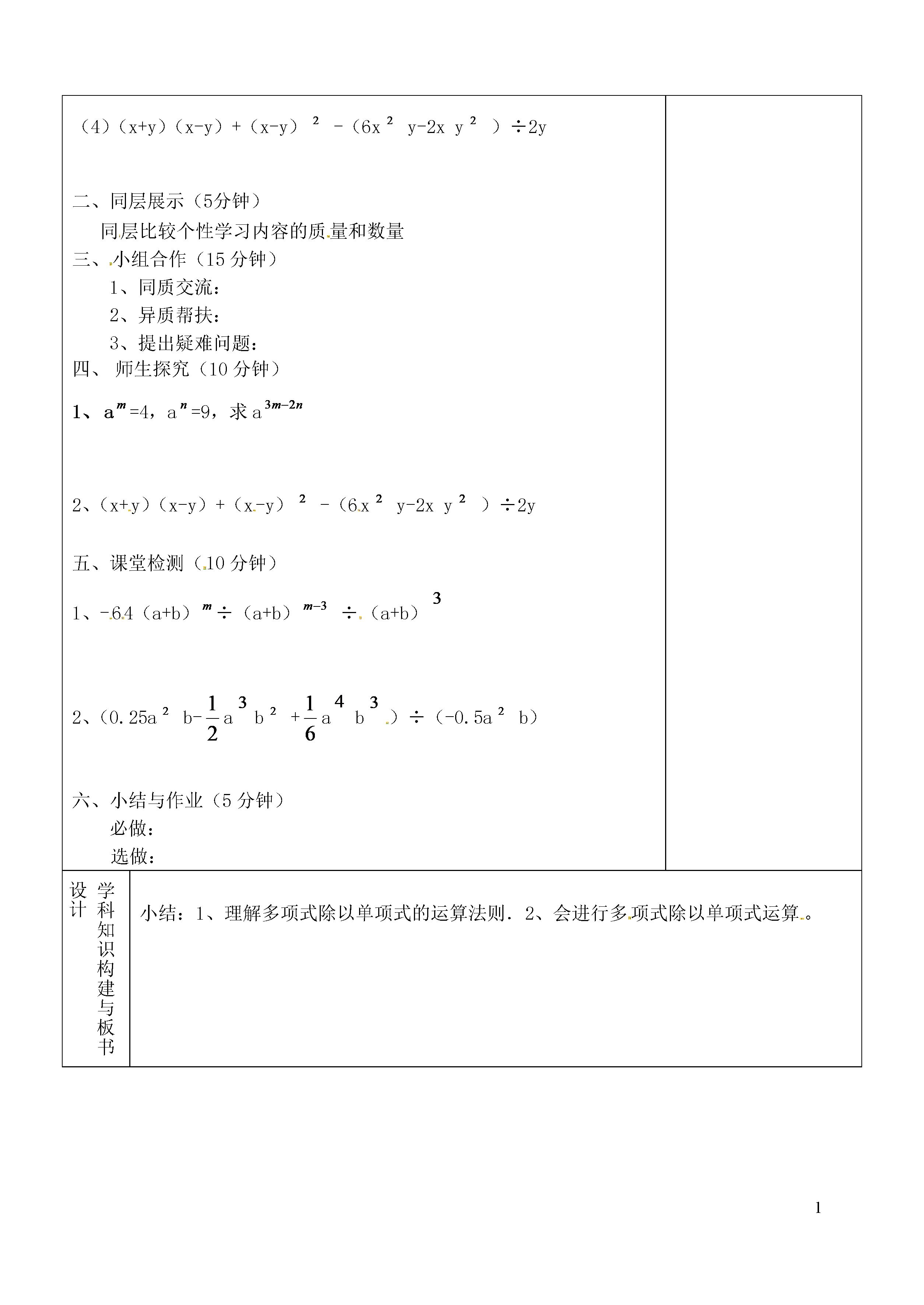 16.8整式的除法教学目标知识目标:1.理解多项式除以单项式的运算法则.2.会进行多项式除以单项式运算。过程与方法:1.经历探索多项式除以单项式法则的过程,进一步发展符号感和推理能力.2.重视学生对算理的理解,有意识地培养学生的思维条理性和表达能力。情感态度价值观:在发展推理能力和有条理的语言、符号表达能力的同时,进一步体会学习数学的兴趣,提高学习数学的信心,感受数学的简洁美。教学重点重点:多项式除以单项式的运算法则.教学难点难点:理解多项式除以单项式的法则并应用其法则计算。学情分析学生在学习了正式的加减的基础上再来学习整式的乘除,让学生有了一个梯度和螺旋上升的空间教学准备多媒体,投影教学过程:集体备课二次备课个性学习回顾单项式除以单项式以及多项式除以单项式的法则,并完成(1)、计算下列各式:7m(4mp)÷7m(x-y)÷(y-x)(2xy)(-7xy)÷(-14xy)(2)一颗人造地球卫星的速度是2.8810米/时,一架喷气飞机的速度是1.810米/时.这颗人造地球卫星的速度是折价喷气式飞机速度的多少倍?a=4,a=9,求a(4)(x+y)(x-y)+(x-y)-(6xy-2xy)÷2y二、同层展示(5分钟)同层比较个性学习内容的质量和数量三、小组合作(15分钟)1、同质交流:2、异质帮扶:3、提出疑难问题:师生探究(10分钟)a=4,a=9,求a2、(x+y)(x-y)+(x-y)-(6xy-2xy)÷2y五、课堂检测(10分钟)1、-64(a+b)÷(a+b)÷(a+b)2、(0.25ab-ab+ab)÷(-0.5ab)六、小结与作业(5分钟)必做:选做:学科知识构建与板书设计小结:1、理解多项式除以单项式的运算法则.2、会进行多项式除以单项式运算。反思与重建