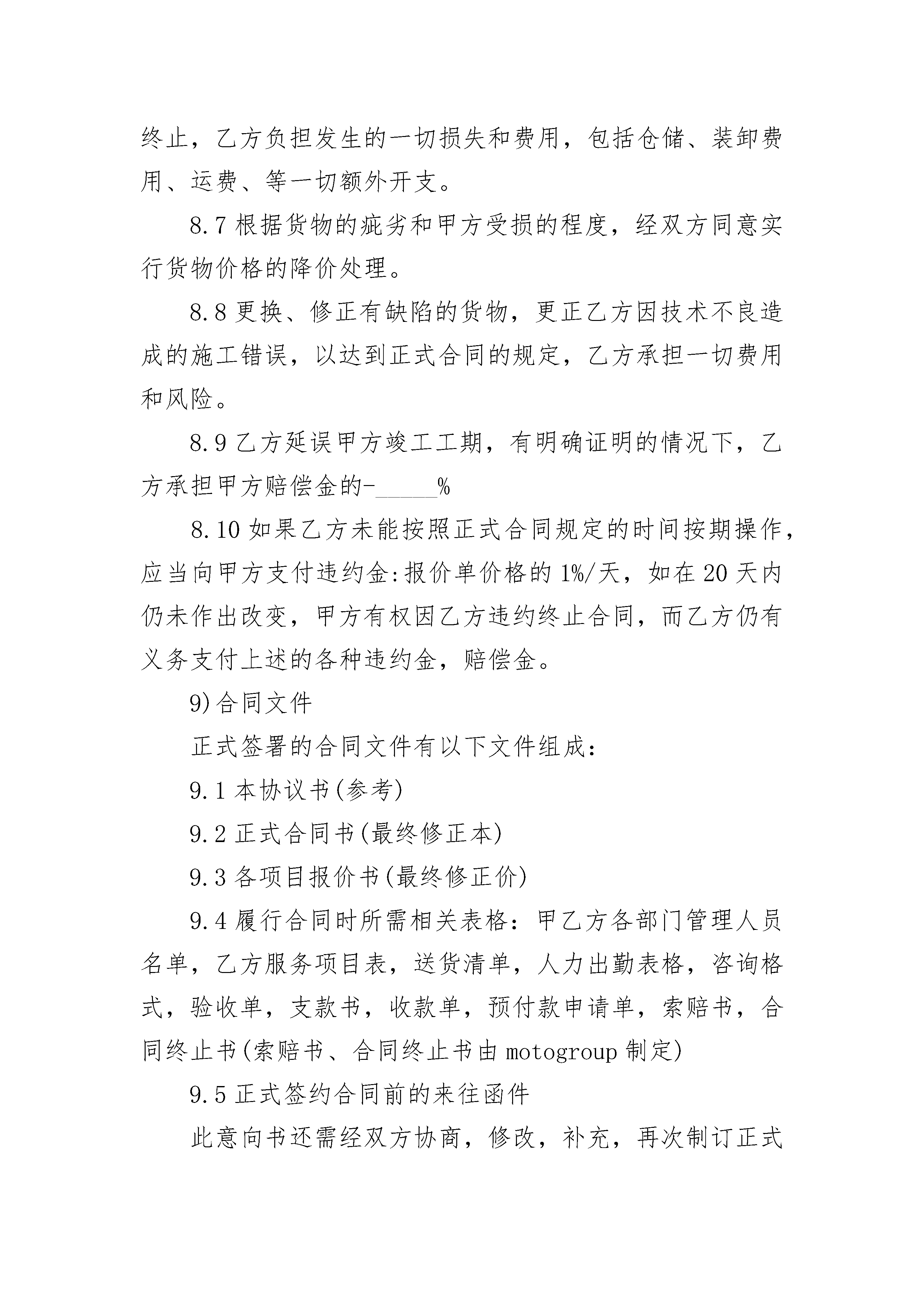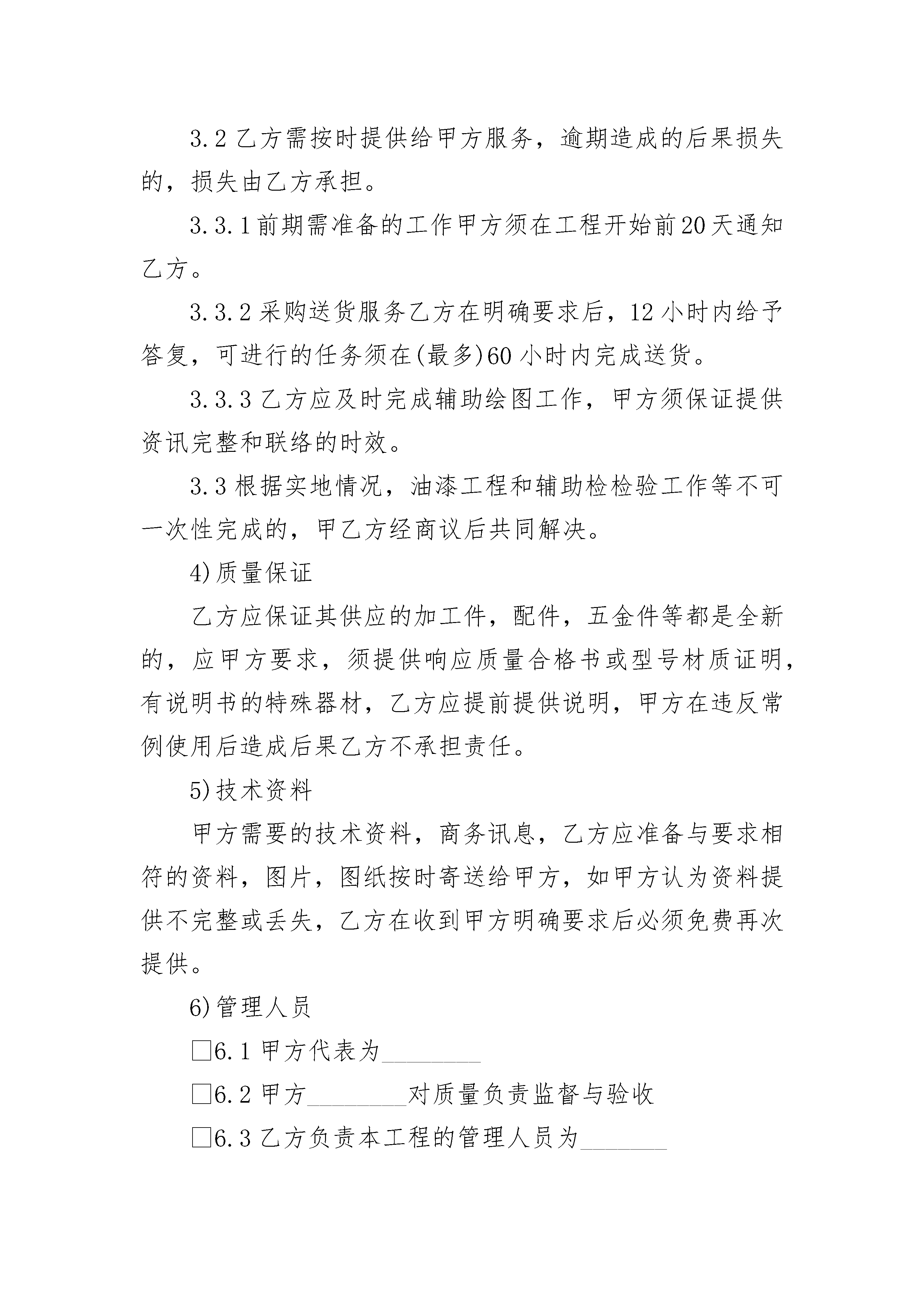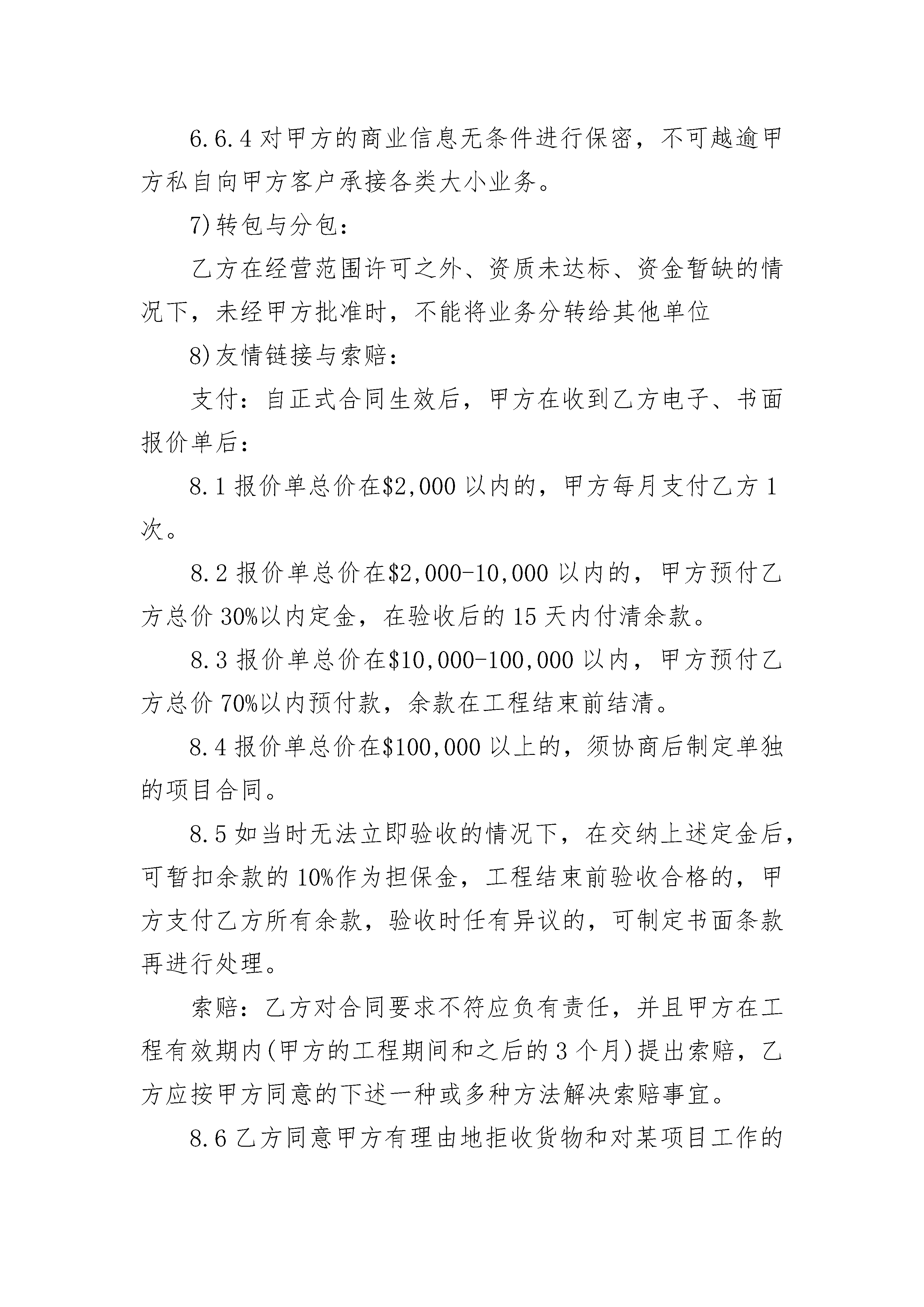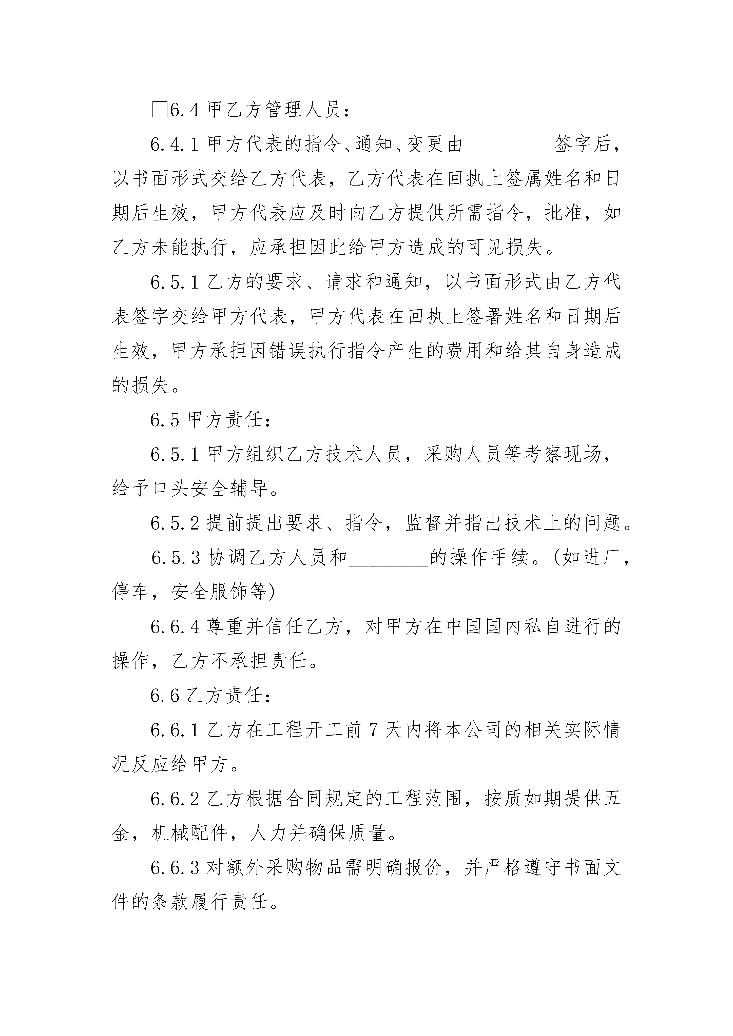 合作者投资机械协议合作者投资机械协议(精选3篇)合作者投资机械协议篇1甲方:乙方:根据《中华人民共和国民法典》和其他有关规定,结合双方公司合作的具体情况,现初步拟订合作条款如下:合同标的乙方执行及完成甲方的规定和要求,在经营范围许可内配合甲方完成在中国国内的工程。合同总价_________$本合同价为一次性包定价,包括内容:2.1厂房设备安装前的准备工作,咨询,代理联络,前期采购,辅助绘图工作。2.2设备所需的机械(或钣金)加工件,五金件配送,劳动用品和一系列的辅助材料。2.3工程中所需的人力辅助,工具辅助。2.4配合甲方派遣的工作人员的对饮食起居的安排,不包括苏州市外的服务。2.5安装设备工程后的维护工程:油漆,清理现场,无技术含量较高的检验配合(包括夜间值班),工具保管等。3)合同工期:3.1乙方必须无条件配合,满足甲方和甲方客户单位的施工进度计划要求。3.2乙方需按时提供给甲方服务,逾期造成的后果损失的,损失由乙方承担。3.3.1前期需准备的工作甲方须在工程开始前20天通知乙方。3.3.2采购送货服务乙方在明确要求后,12小时内给予答复,可进行的任务须在(最多)60小时内完成送货。3.3.3乙方应及时完成辅助绘图工作,甲方须保证提供资讯完整和联络的时效。3.3根据实地情况,油漆工程和辅助检检验工作等不可一次性完成的,甲乙方经商议后共同解决。4)质量保证乙方应保证其供应的加工件,配件,五金件等都是全新的,应甲方要求,须提供响应质量合格书或型号材质证明,有说明书的特殊器材,乙方应提前提供说明,甲方在违反常例使用后造成后果乙方不承担责任。5)技术资料甲方需要的技术资料,商务讯息,乙方应准备与要求相符的资料,图片,图纸按时寄送给甲方,如甲方认为资料提供不完整或丢失,乙方在收到甲方明确要求后必须免费再次提供。6)管理人员6.1甲方代表为________6.2甲方________对质量负责监督与验收6.3乙方负责本工程的管理人员为_______6.4甲乙方管理人员:6.4.1甲方代表的指令、通知、变更由_________签字后,以书面形式交给乙方代表,乙方代表在回执上签属姓名和日期后生效,甲方代表应及时向乙方提供所需指令,批准,如乙方未能执行,应承担因此给甲方造成的可见损失。6.5.1乙方的要求、请求和通知,以书面形式由乙方代表签字交给甲方代表,甲方代表在回执上签署姓名和日期后生效,甲方承担因错误执行指令产生的费用和给其自身造成的损失。6.5甲方责任:6.5.1甲方组织乙方技术人员,采购人员等考察现场,给予口头安全辅导。6.5.2提前提出要求、指令,监督并指出技术上的问题。6.5.3协调乙方人员和________的操作手续。(如进厂,停车,安全服饰等)6.6.4尊重并信任乙方,对甲方在中国国内私自进行的操作,乙方不承担责任。6.6乙方责任:6.6.1乙方在工程开工前7天内将本公司的相关实际情况反应给甲方。6.6.2乙方根据合同规定的工程范围,按质如期提供五金,机械配件,人力并确保质量。6.6.3对额外采购物品需明确报价,并严格遵守书面文件的条款履行责任。6.6.4对甲方的商业信息无条件进行保密,不可越逾甲方私自向甲方客户承接各类大小业务。7)转包与分包:乙方在经营范围许可之外、资质未达标、资金暂缺的情况下,未经甲方批准时,不能将业务分转给其他单位8)友情链接与索赔:支付:自正式合同生效后,甲方在收到乙方电子、书面报价单后:8.1报价单总价在$2,000以内的,甲方每月支付乙方1次。8.2报价单总价在$2,000-10,000以内的,甲方预付乙方总价30%以内定金,在验收后的15天内付清余款。8.3报价单总价在$10,000-100,000以内,甲方预付乙方总价70%以内预付款,余款在工程结束前结清。8.4报价单总价在$100,000以上的,须协商后制定单独的项目合同。8.5如当时无法立即验收的情况下,在交纳上述定金后,可暂扣余款的10%作为担保金,工程结束前验收合格的,甲方支付乙方所有余款,验收时任有异议的,可制定书面条款再进行处理。索赔:乙方对合同要求不符应负有责任,并且甲方在工程有效期内(甲方的工程期间和之后的3个月)提出索赔,乙方应按甲方同意的下述一种或多种方法解决索赔事宜。8.6乙方同意甲方有理由地拒收货物和对某项目工作的终止,乙方负担发生的一切损失和费用,包括仓储、装卸费用、运费、等一切额外开支。8.7根据货物的疵劣和甲方受损的程度,经双方同意实行货物价格的降价处理。8.8更换、修正有缺陷的货物,更正乙方因技术不良造成的施工错误,以达到正式合同的规定,乙方承担一切费用和风险。8.9乙方延误甲方竣工工期,有明确证明的情况下,乙方承担甲方赔偿金的-_____%8.10如果乙方未能按照正式合同规定的时间按期