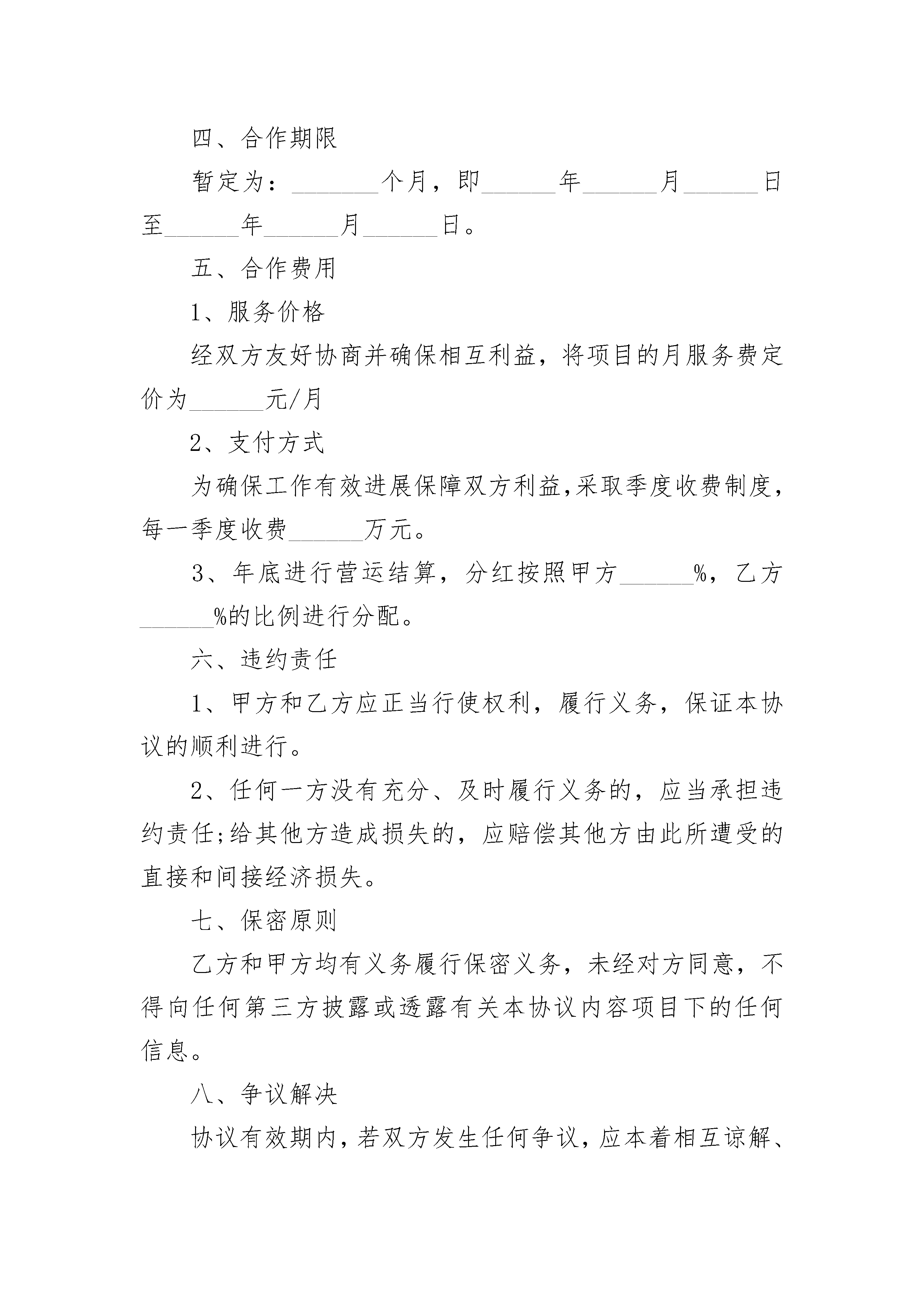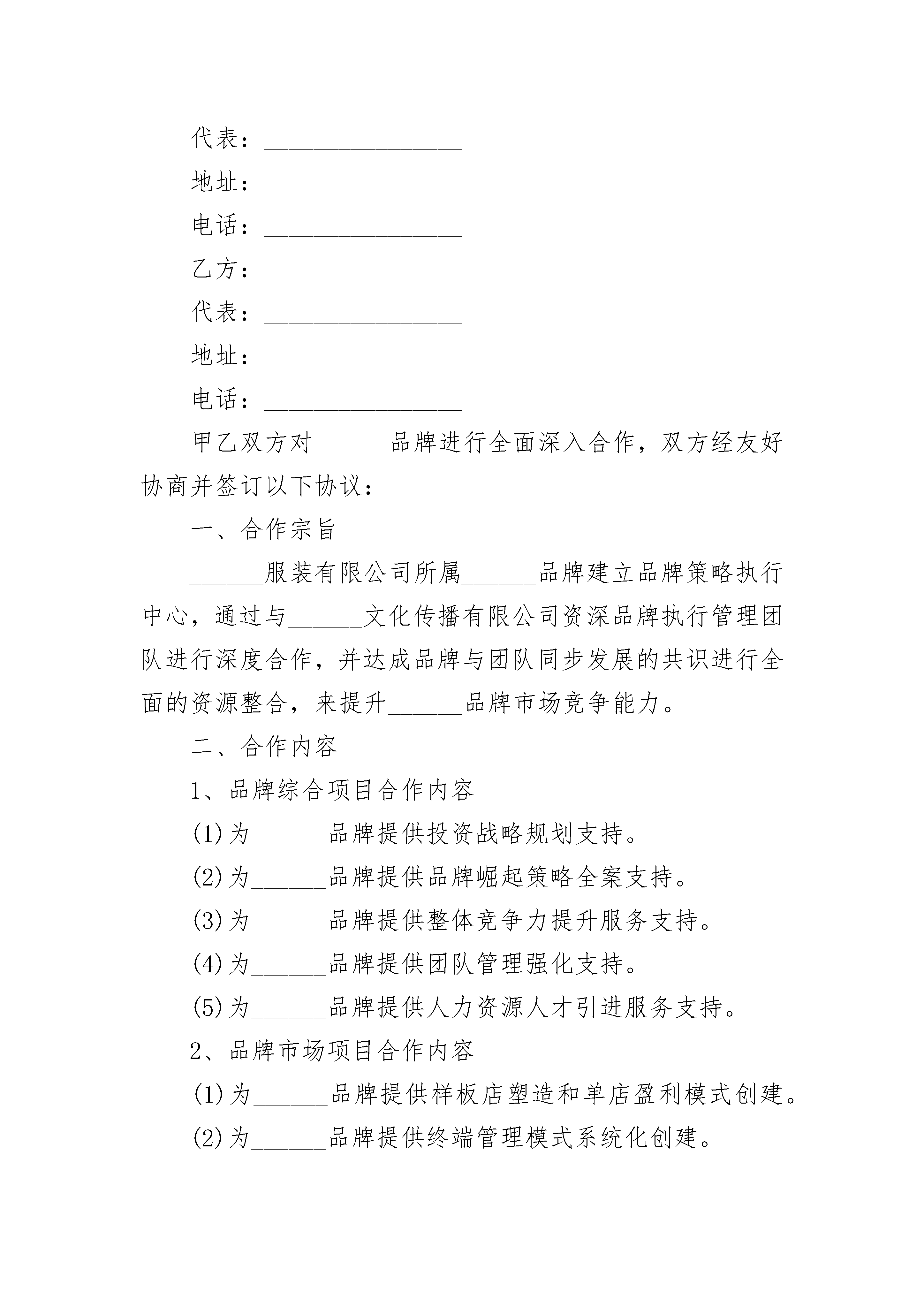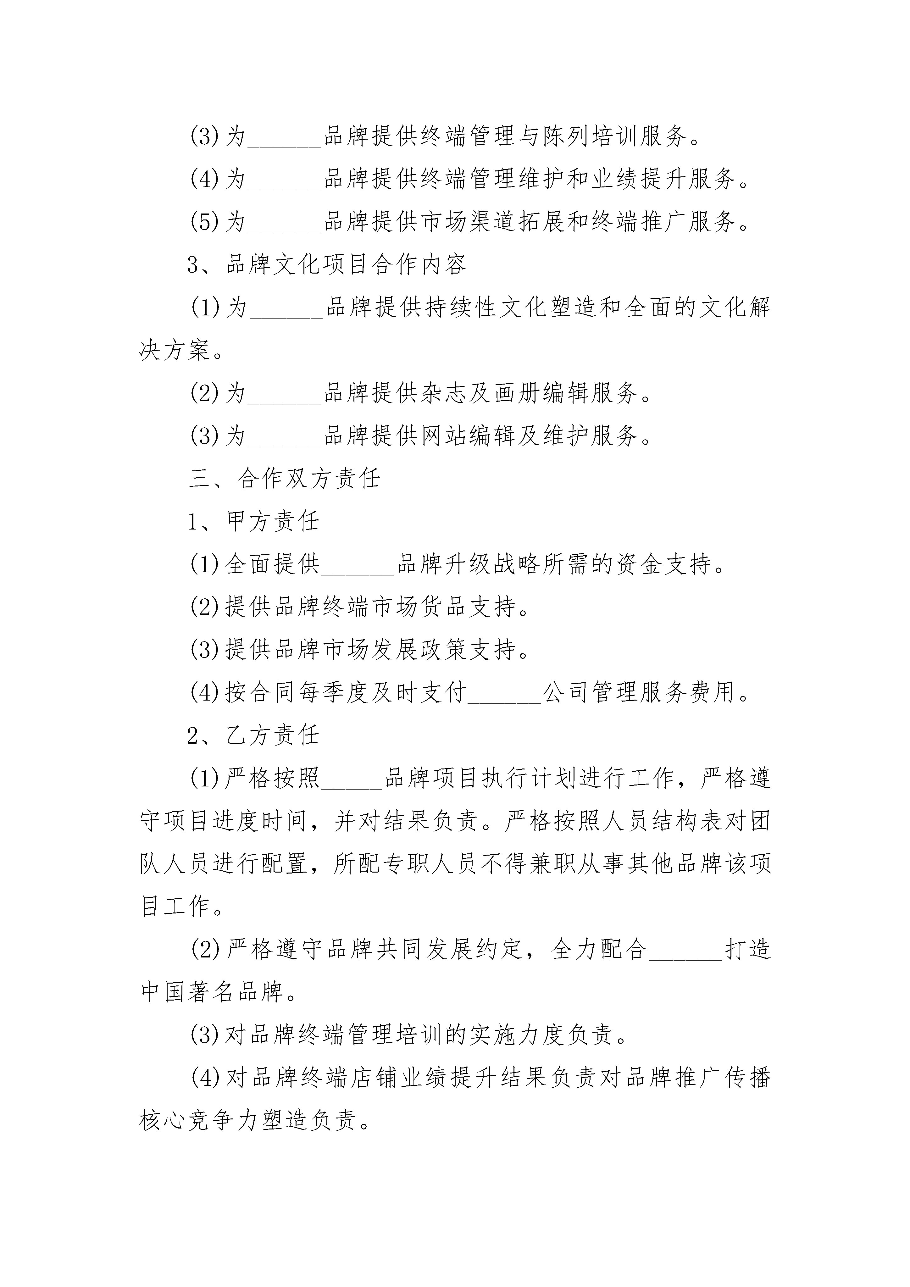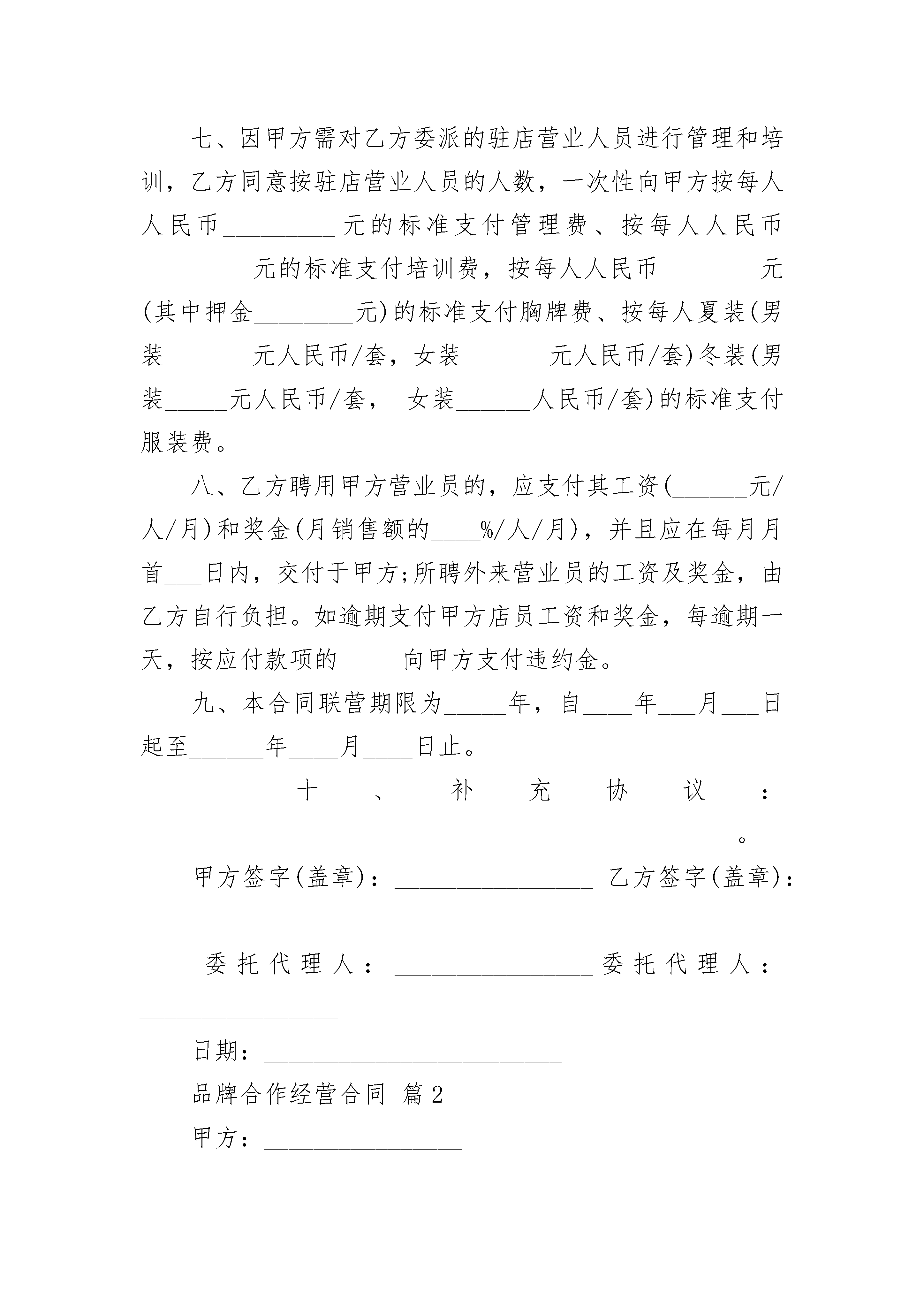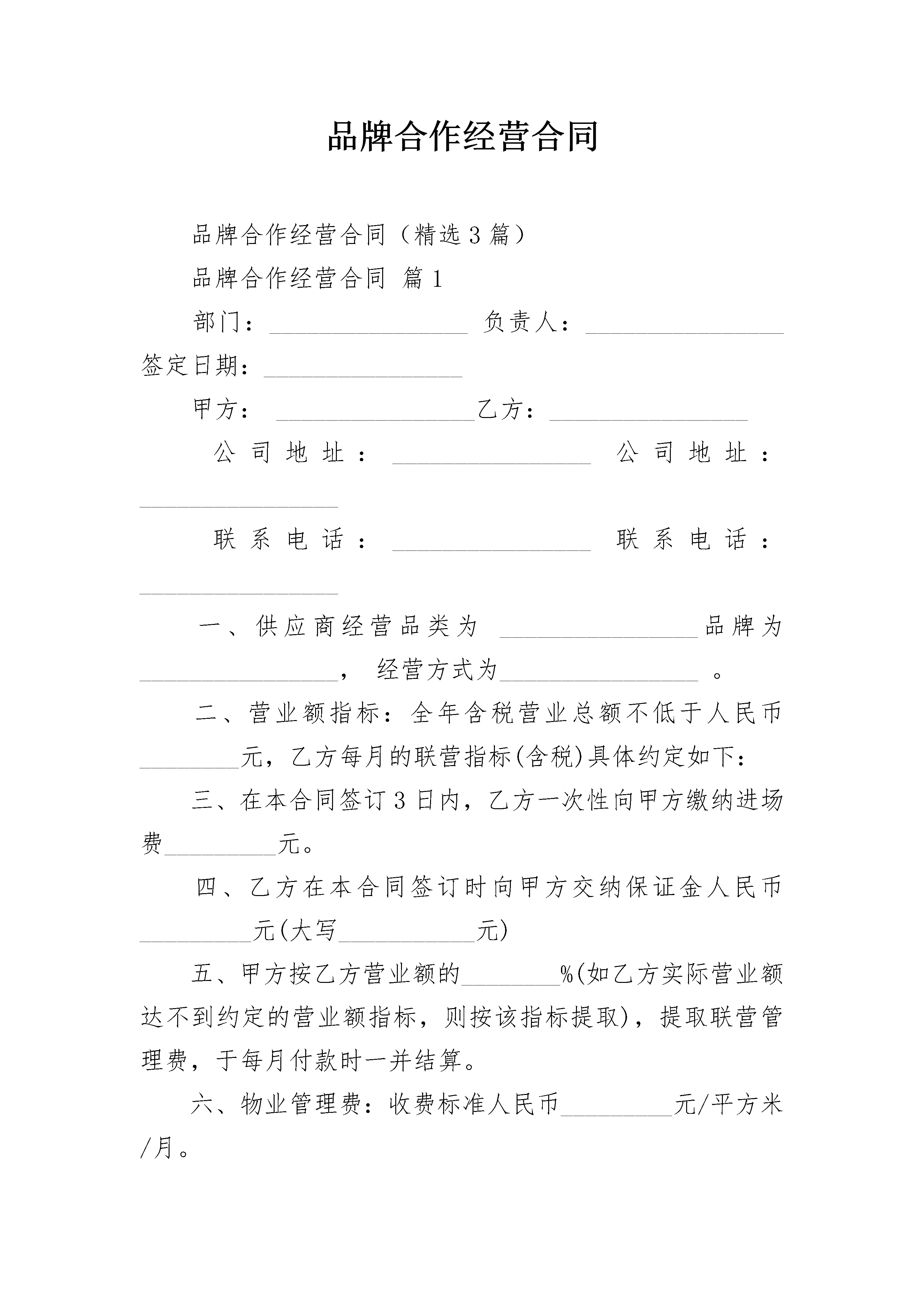 品牌合作经营合同品牌合作经营合同(精选3篇)品牌合作经营合同篇1部门:________________负责人:________________签定日期:________________甲方:________________乙方:________________公司地址:________________公司地址:________________联系电话:________________联系电话:________________一、供应商经营品类为________________品牌为________________,经营方式为________________。二、营业额指标:全年含税营业总额不低于人民币________元,乙方每月的联营指标(含税)具体约定如下:三、在本合同签订3日内,乙方一次性向甲方缴纳进场费_________元。四、乙方在本合同签订时向甲方交纳保证金人民币_________元(大写___________元)五、甲方按乙方营业额的________%(如乙方实际营业额达不到约定的营业额指标,则按该指标提取),提取联营管理费,于每月付款时一并结算。六、物业管理费:收费标准人民币_________元/平方米/月。七、因甲方需对乙方委派的驻店营业人员进行管理和培训,乙方同意按驻店营业人员的人数,一次性向甲方按每人人民币_________元的标准支付管理费、按每人人民币_________元的标准支付培训费,按每人人民币________元(其中押金________元)的标准支付胸牌费、按每人夏装(男装______元人民币/套,女装_______元人民币/套)冬装(男装_____元人民币/套,女装______人民币/套)的标准支付服装费。八、乙方聘用甲方营业员的,应支付其工资(______元/人/月)和奖金(月销售额的____%/人/月),并且应在每月月首___日内,交付于甲方;所聘外来营业员的工资及奖金,由乙方自行负担。如逾期支付甲方店员工资和奖金,每逾期一天,按应付款项的_____向甲方支付违约金。九、本合同联营期限为_____年,自____年___月___日起至______年____月____日止。十、补充协议:________________________________________________。甲方签字(盖章):________________乙方签字(盖章):________________委托代理人:________________委托代理人:________________日期:________________________品牌合作经营合同篇2甲方:________________代表:________________地址:________________电话:________________乙方:________________代表:________________地址:________________电话:________________甲乙双方对______品牌进行全面深入合作,双方经友好协商并签订以下协议:一、合作宗旨______服装有限公司所属______品牌建立品牌策略执行中心,通过与______文化传播有限公司资深品牌执行管理团队进行深度合作,并达成品牌与团队同步发展的共识进行全面的资源整合,来提升______品牌市场竞争能力。二、合作内容1、品牌综合项目合作内容(1)为______品牌提供投资战略规划支持。(2)为______品牌提供品牌崛起策略全案支持。(3)为______品牌提供整体竞争力提升服务支持。(4)为______品牌提供团队管理强化支持。(5)为______品牌提供人力资源人才引进服务支持。2、品牌市场项目合作内容(1)为______品牌提供样板店塑造和单店盈利模式创建。(2)为______品牌提供终端管理模式系统化创建。(3)为______品牌提供终端管理与陈列培训服务。(4)为______品牌提供终端管理维护和业绩提升服务。(5)为______品牌提供市场渠道拓展和终端推广服务。3、品牌文化项目合作内容(1)为______品牌提供持续性文化塑造和全面的文化解决方案。(2)为______品牌提供杂志及画册编辑服务。(3)为______品牌提供网站编辑及维护服务。三、合作双方责任1、甲方责任(1)全面提供______品牌升级战略所需的资金支持。(2)提供品牌终端市场货品支持。(3)提供品牌市场发展政策支持。(4)按合同每季度及时支付______公司管理服务费用。2、乙方责任(1)严格按照_____品牌项目执行计划进行工作,严格遵守项目进度时间,并对结果负责。严格按照人员结构表对团队人员进行配置,所配专职人员不得兼职从事其他品牌该项目工作。(2)严格遵守品牌共同发展