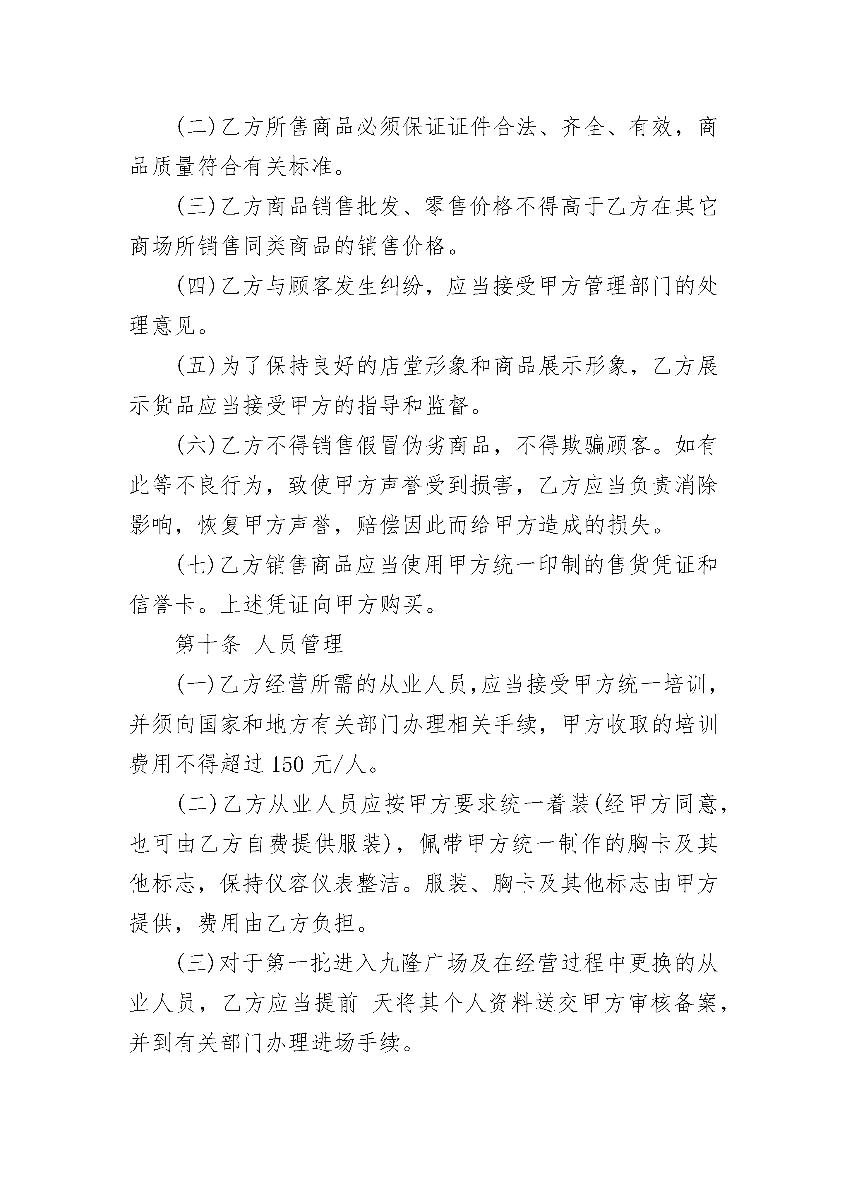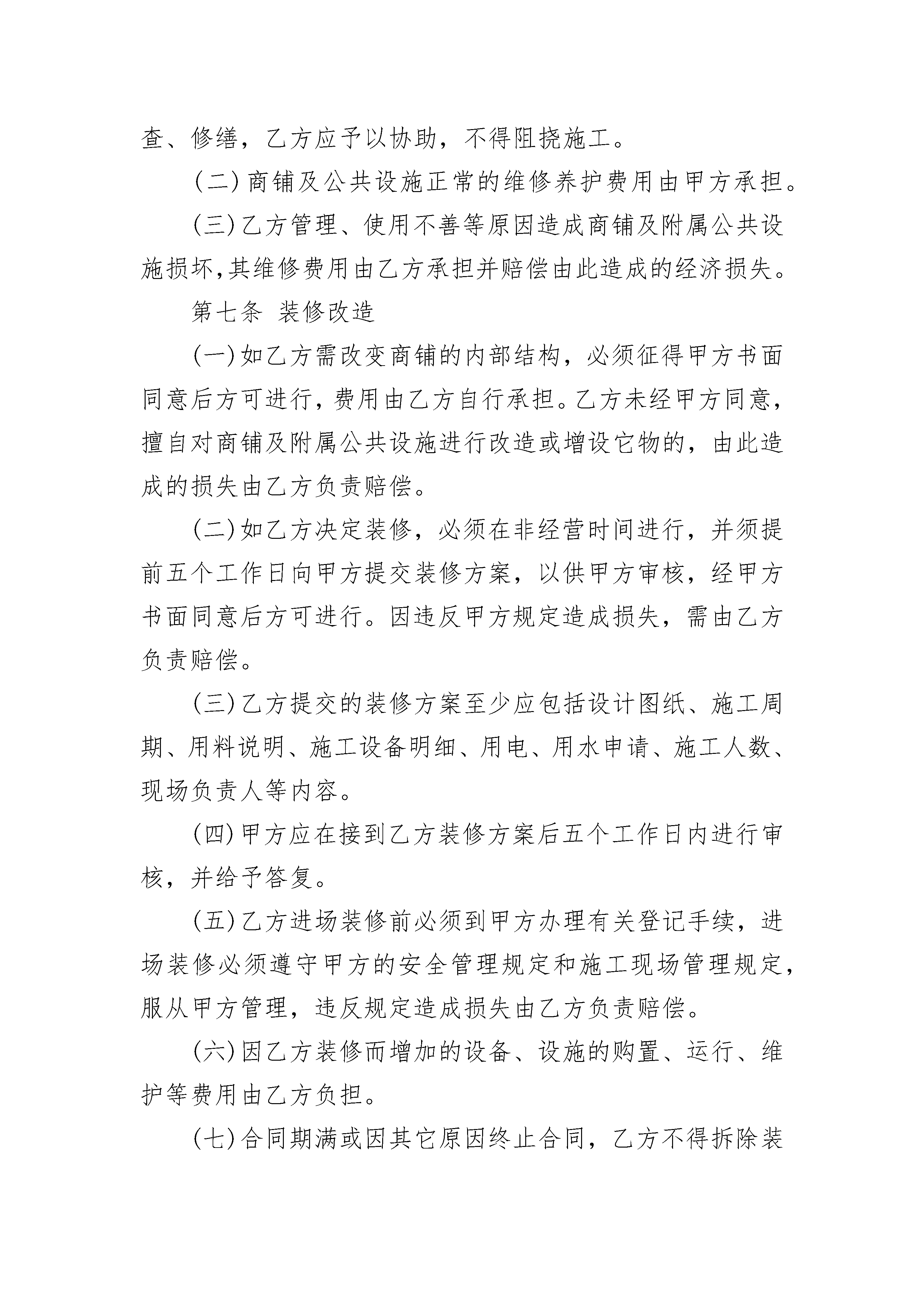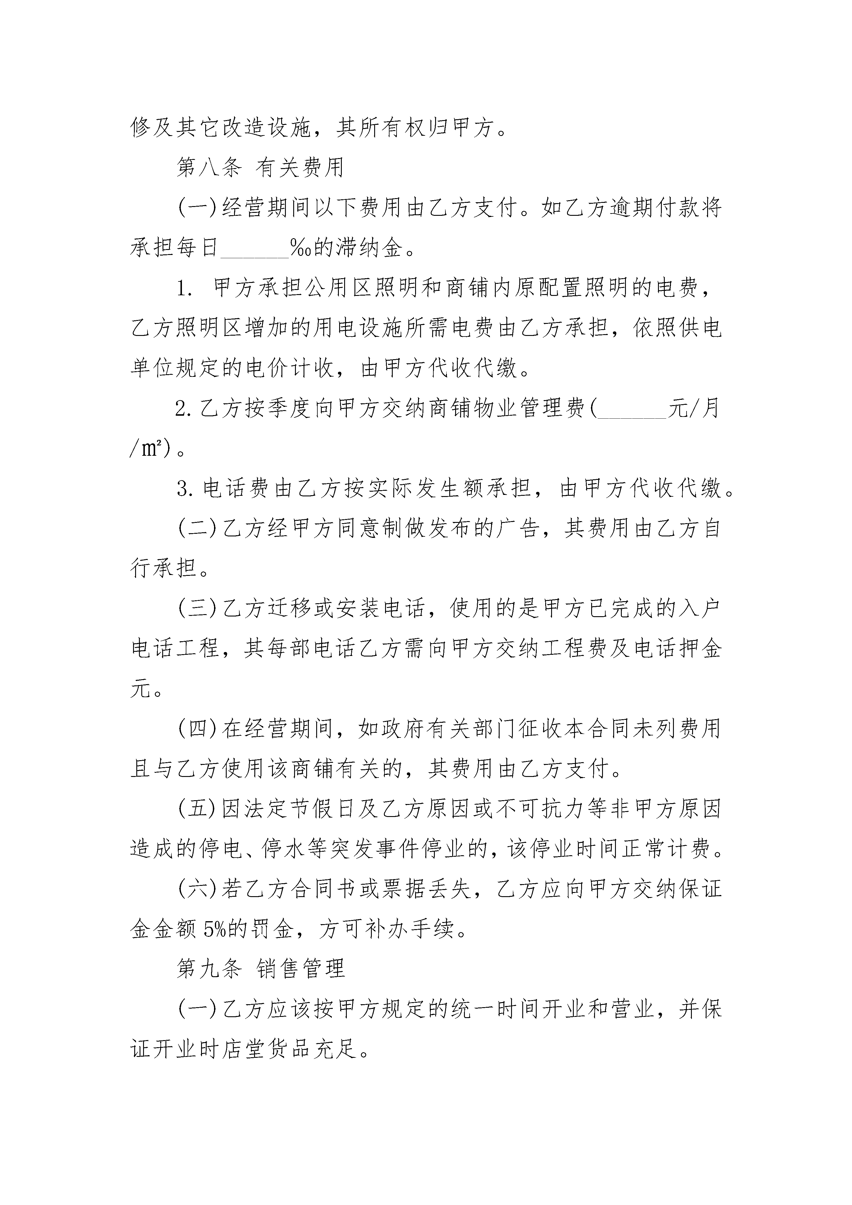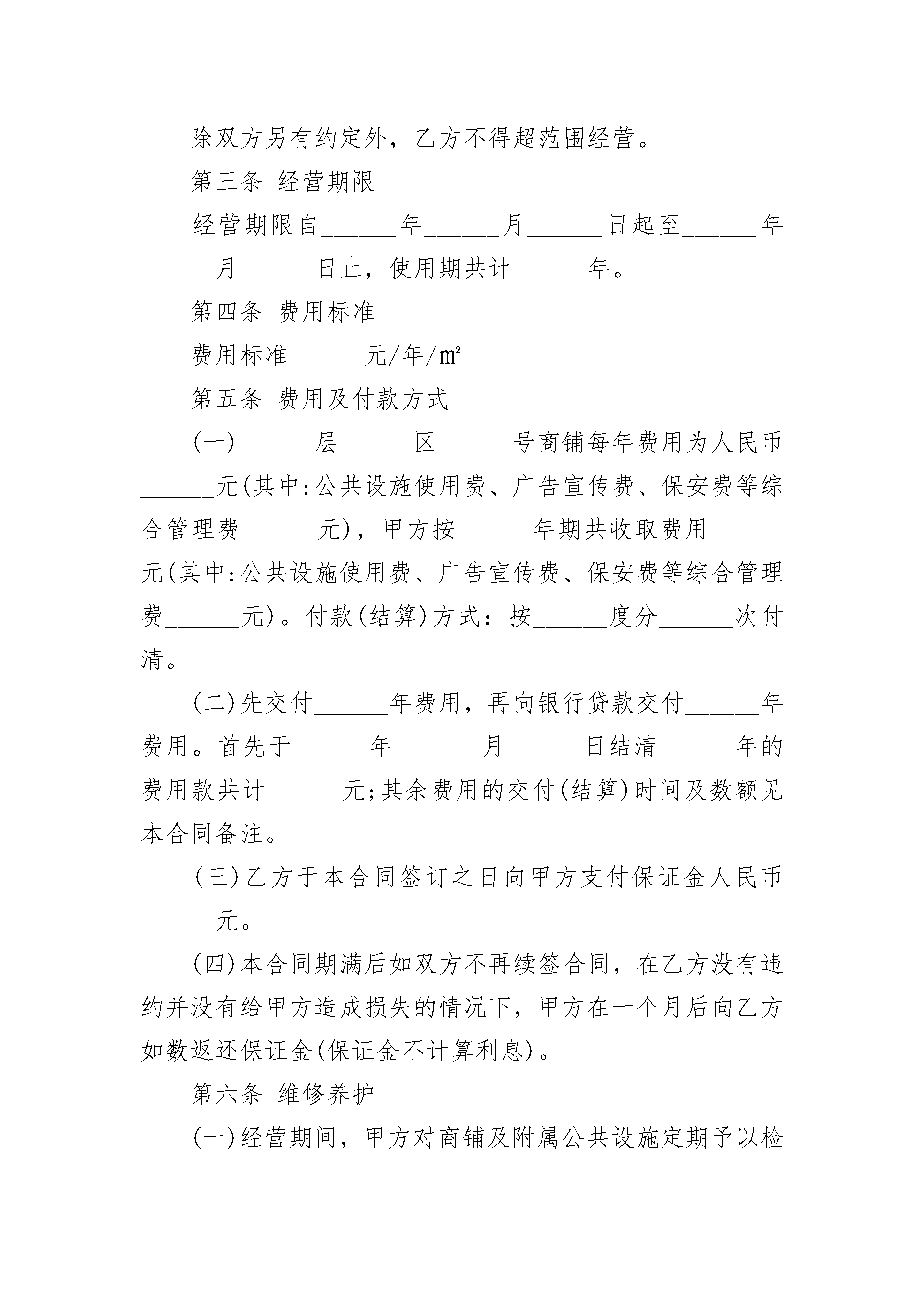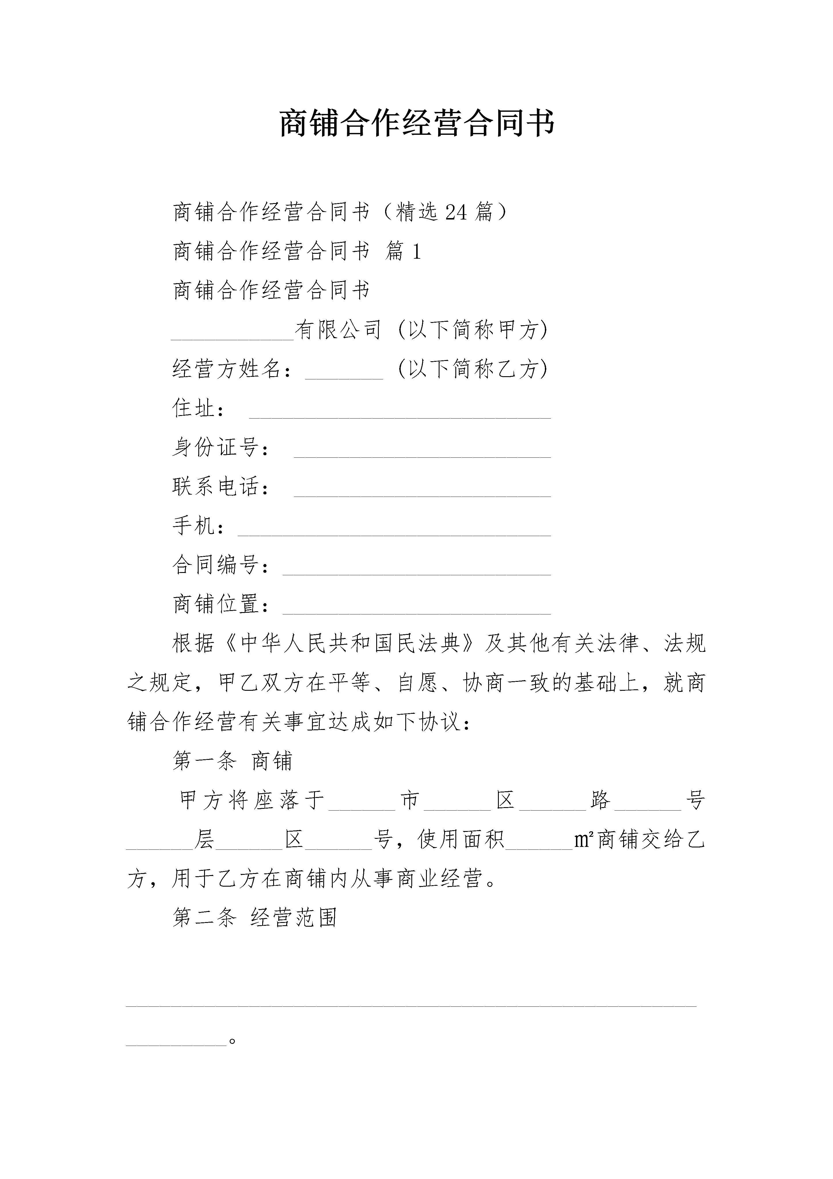 商铺合作经营合同书商铺合作经营合同书(精选24篇)商铺合作经营合同书篇1商铺合作经营合同书___________有限公司(以下简称甲方)经营方姓名:_______(以下简称乙方)住址:___________________________身份证号:_______________________联系电话:_______________________手机:____________________________合同编号:________________________商铺位置:________________________根据《中华人民共和国民法典》及其他有关法律、法规之规定,甲乙双方在平等、自愿、协商一致的基础上,就商铺合作经营有关事宜达成如下协议:第一条商铺甲方将座落于______市______区______路______号______层______区______号,使用面积______㎡商铺交给乙方,用于乙方在商铺内从事商业经营。第二条经营范围____________________________________________________________。除双方另有约定外,乙方不得超范围经营。第三条经营期限经营期限自______年______月______日起至______年______月______日止,使用期共计______年。第四条费用标准费用标准______元/年/㎡第五条费用及付款方式(一)______层______区______号商铺每年费用为人民币______元(其中:公共设施使用费、广告宣传费、保安费等综合管理费______元),甲方按______年期共收取费用______元(其中:公共设施使用费、广告宣传费、保安费等综合管理费______元)。付款(结算)方式:按______度分______次付清。(二)先交付______年费用,再向银行贷款交付______年费用。首先于______年_______月______日结清______年的费用款共计______元;其余费用的交付(结算)时间及数额见本合同备注。(三)乙方于本合同签订之日向甲方支付保证金人民币______元。(四)本合同期满后如双方不再续签合同,在乙方没有违约并没有给甲方造成损失的情况下,甲方在一个月后向乙方如数返还保证金(保证金不计算利息)。第六条维修养护(一)经营期间,甲方对商铺及附属公共设施定期予以检查、修缮,乙方应予以协助,不得阻挠施工。(二)商铺及公共设施正常的维修养护费用由甲方承担。(三)乙方管理、使用不善等原因造成商铺及附属公共设施损坏,其维修费用由乙方承担并赔偿由此造成的经济损失。第七条装修改造(一)如乙方需改变商铺的内部结构,必须征得甲方书面同意后方可进行,费用由乙方自行承担。乙方未经甲方同意,擅自对商铺及附属公共设施进行改造或增设它物的,由此造成的损失由乙方负责赔偿。(二)如乙方决定装修,必须在非经营时间进行,并须提前五个工作日向甲方提交装修方案,以供甲方审核,经甲方书面同意后方可进行。因违反甲方规定造成损失,需由乙方负责赔偿。(三)乙方提交的装修方案至少应包括设计图纸、施工周期、用料说明、施工设备明细、用电、用水申请、施工人数、现场负责人等内容。(四)甲方应在接到乙方装修方案后五个工作日内进行审核,并给予答复。(五)乙方进场装修前必须到甲方办理有关登记手续,进场装修必须遵守甲方的安全管理规定和施工现场管理规定,服从甲方管理,违反规定造成损失由乙方负责赔偿。(六)因乙方装修而增加的设备、设施的购置、运行、维护等费用由乙方负担。(七)合同期满或因其它原因终止合同,乙方不得拆除装修及其它改造设施,其所有权归甲方。第八条有关费用(一)经营期间以下费用由乙方支付。如乙方逾期付款将承担每日______‰的滞纳金。1.甲方承担公用区照明和商铺内原配置照明的电费,乙方照明区增加的用电设施所需电费由乙方承担,依照供电单位规定的电价计收,由甲方代收代缴。2.乙方按季度向甲方交纳商铺物业管理费(______元/月/㎡)。3.电话费由乙方按实际发生额承担,由甲方代收代缴。(二)乙方经甲方同意制做发布的广告,其费用由乙方自行承担。(三)乙方迁移或安装电话,使用的是甲方已完成的入户电话工程,其每部电话乙方需向甲方交纳工程费及电话押金元。(四)在经营期间,如政府有关部门征收本合同未列费用且与乙方使用该商铺有关的,其费用由乙方支付。(五)因法定节假日及乙方原因或不可抗力等非甲方原因造成的停电、停水等突发事件停业的,该停业时间正常计费。(六)若乙方合同书或票据丢失,乙方应向甲方交纳保证金金额5%的罚金,方可补办手续。第九条销售管理(一)乙方应该按甲方规定的统一时间开业和营业,并保证开业时店堂货品充足。(二)乙方所售商品必须保证证件合法、齐全、有