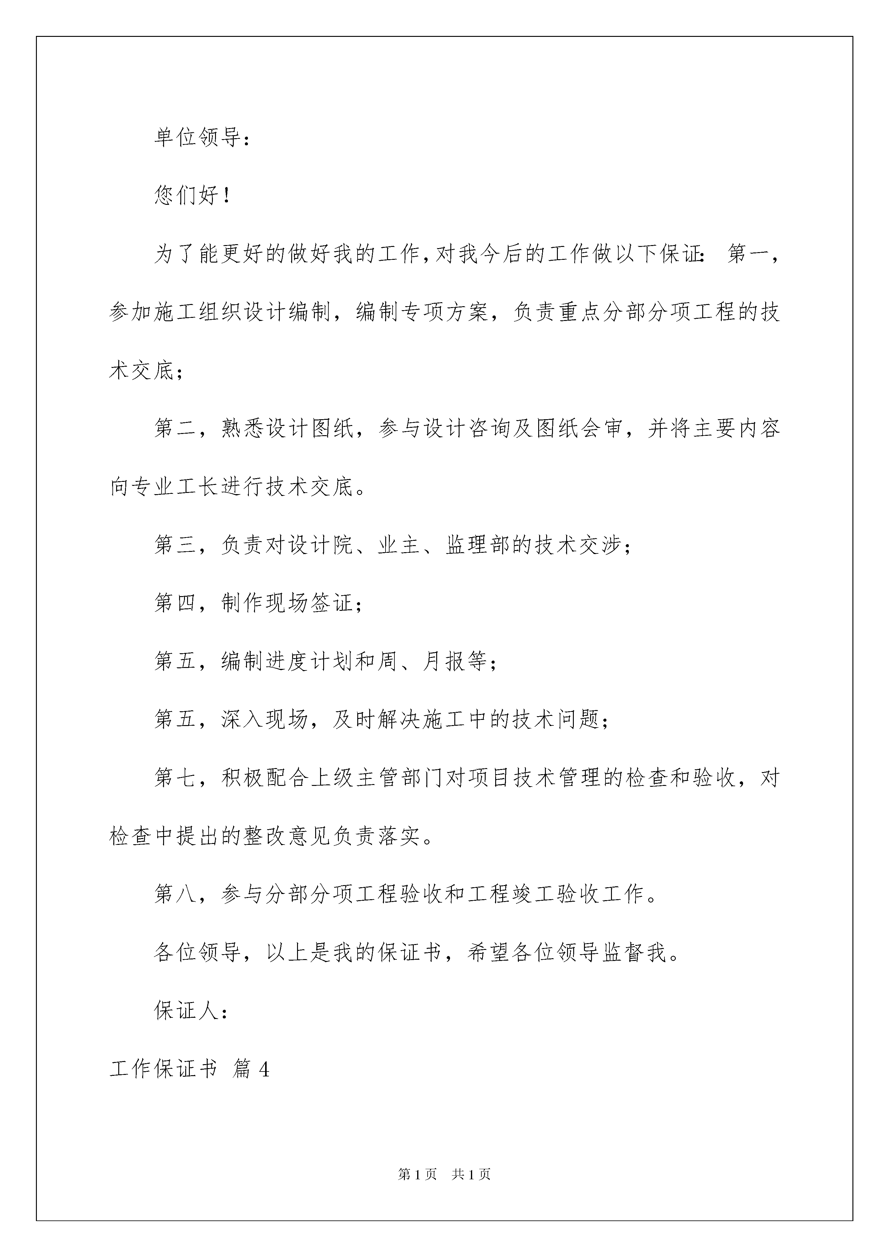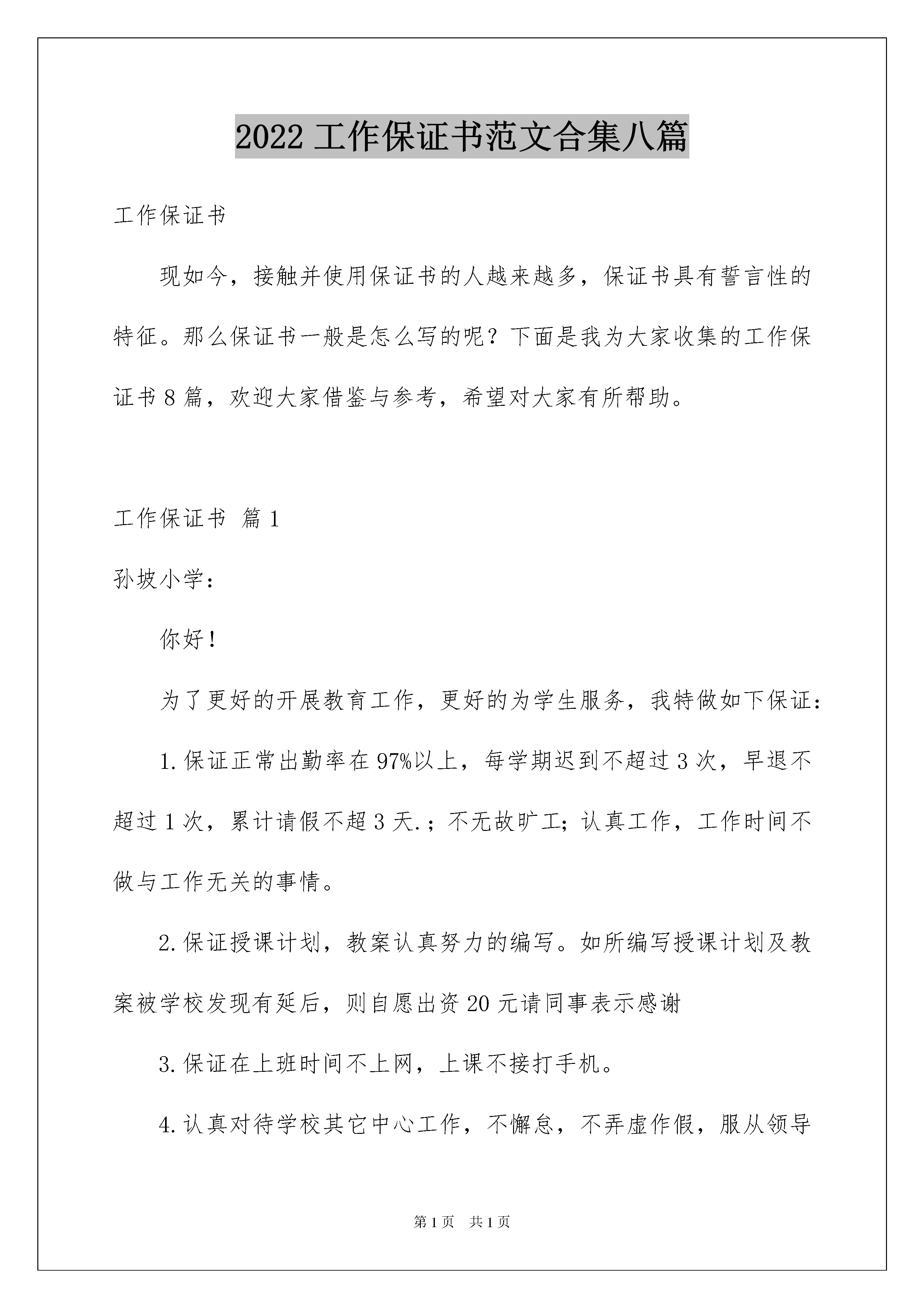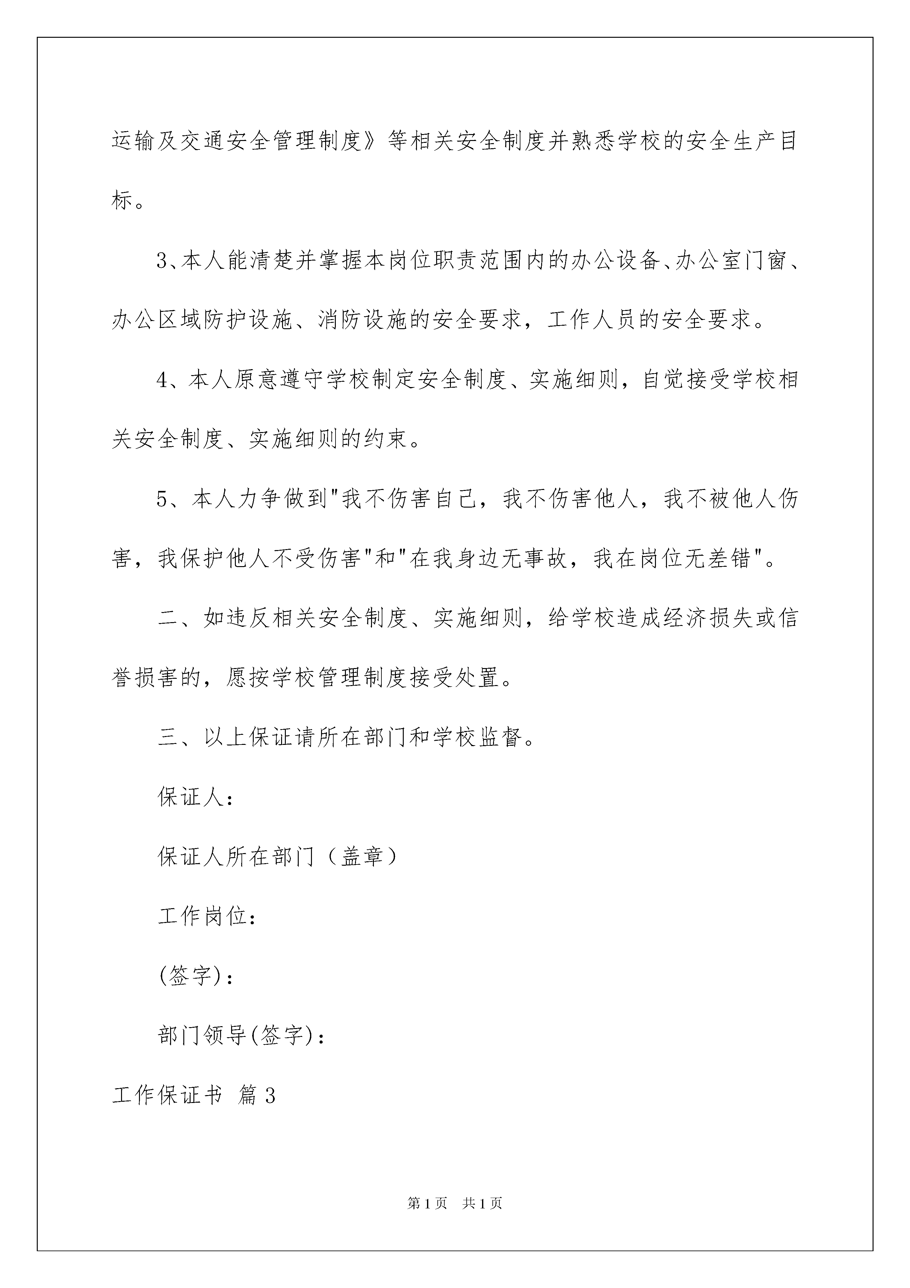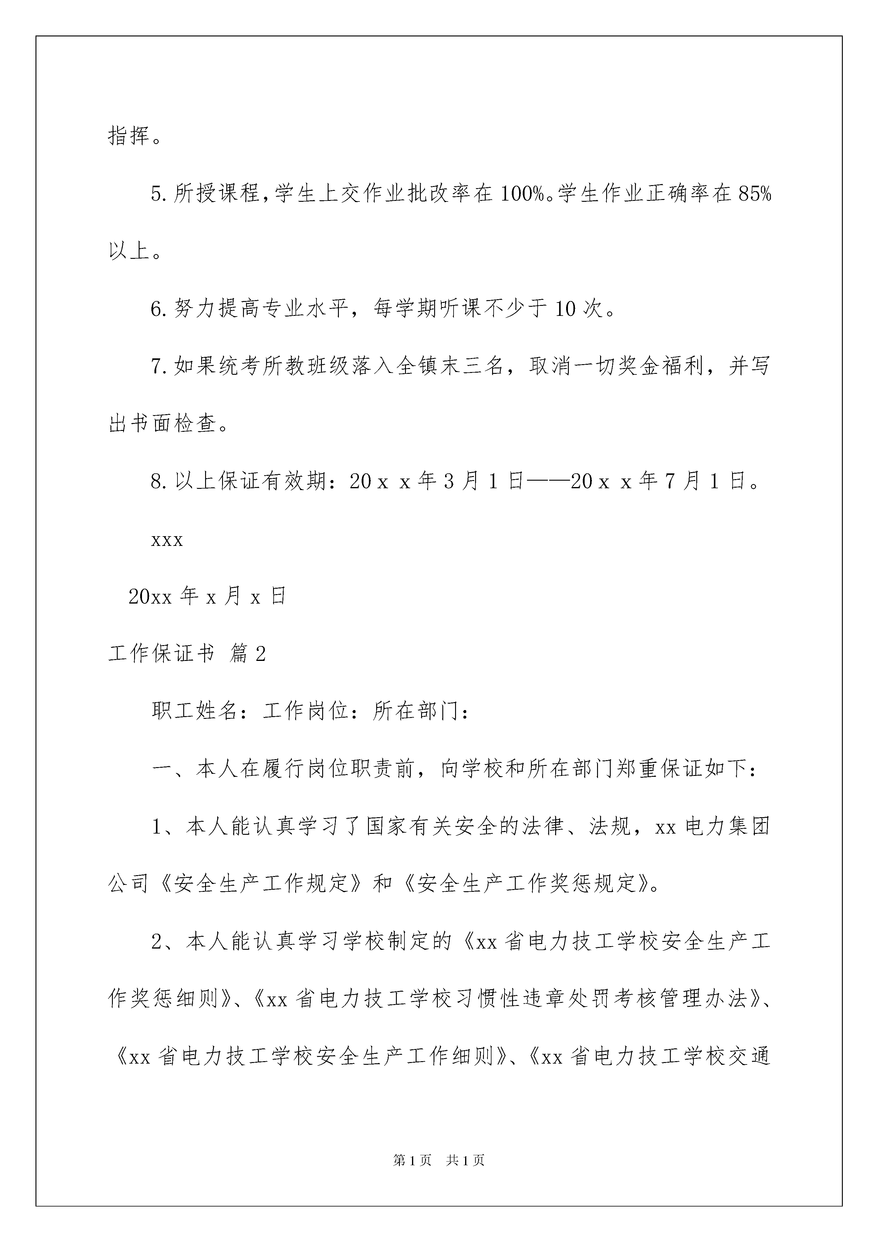 2022工作保证书范文合集八篇工作保证书现如今,接触并使用保证书的人越来越多,保证书具有誓言性的特征。那么保证书一般是怎么写的呢?下面是我为大家收集的工作保证书8篇,欢迎大家借鉴与参考,希望对大家有所帮助。工作保证书篇1孙坡小学:你好!为了更好的开展教育工作,更好的为学生服务,我特做如下保证:1.保证正常出勤率在97%以上,每学期迟到不超过3次,早退不超过1次,累计请假不超3天.;不无故旷工;认真工作,工作时间不做与工作无关的事情。2.保证授课计划,教案认真努力的编写。如所编写授课计划及教案被学校发现有延后,则自愿出资20元请同事表示感谢3.保证在上班时间不上网,上课不接打手机。4.认真对待学校其它中心工作,不懈怠,不弄虚作假,服从领导指挥。5.所授课程,学生上交作业批改率在100%。学生作业正确率在85%以上。6.努力提高专业水平,每学期听课不少于10次。7.如果统考所教班级落入全镇末三名,取消一切奖金福利,并写出书面检查。8.以上保证有效期:20xx年3月1日——20xx年7月1日。xxx20xx年x月x日工作保证书篇2职工姓名:工作岗位:所在部门:一、本人在履行岗位职责前,向学校和所在部门郑重保证如下:1、本人能认真学习了国家有关安全的法律、法规,xx电力集团公司《安全生产工作规定》和《安全生产工作奖惩规定》。2、本人能认真学习学校制定的《xx省电力技工学校安全生产工作奖惩细则》、《xx省电力技工学校习惯性违章处罚考核管理办法》、《xx省电力技工学校安全生产工作细则》、《xx省电力技工学校交通运输及交通安全管理制度》等相关安全制度并熟悉学校的安全生产目标。3、本人能清楚并掌握本岗位职责范围内的办公设备、办公室门窗、办公区域防护设施、消防设施的安全要求,工作人员的安全要求。4、本人原意遵守学校制定安全制度、实施细则,自觉接受学校相关安全制度、实施细则的约束。5、本人力争做到"我不伤害自己,我不伤害他人,我不被他人伤害,我保护他人不受伤害"和"在我身边无事故,我在岗位无差错"。二、如违反相关安全制度、实施细则,给学校造成经济损失或信誉损害的,愿按学校管理制度接受处置。三、以上保证请所在部门和学校监督。保证人:保证人所在部门(盖章)工作岗位:(签字):部门领导(签字):工作保证书篇3单位领导:您们好!为了能更好的做好我的工作,对我今后的工作做以下保证:第一,参加施工组织设计编制,编制专项方案,负责重点分部分项工程的技术交底;第二,熟悉设计图纸,参与设计咨询及图纸会审,并将主要内容向专业工长进行技术交底。第三,负责对设计院、业主、监理部的技术交涉;第四,制作现场签证;第五,编制进度计划和周、月报等;第五,深入现场,及时解决施工中的技术问题;第七,积极配合上级主管部门对项目技术管理的检查和验收,对检查中提出的整改意见负责落实。第八,参与分部分项工程验收和工程竣工验收工作。各位领导,以上是我的保证书,希望各位领导监督我。保证人:工作保证书篇4尊敬的领导:今天由于我犯得错误,所以只得在这里写这份上班迟到检讨书。其实,我也一直认为上班迟到是一个很大的问题。通过这件事,我感到这虽然是一件偶然发生的事情,但同时也是长期以来对自己放松要求,工作做风涣散的必然结果,这种不良思潮的最直接表现就是自由散漫!在这件事中,我还感到,自己在工作责任心上仍就非常欠缺。在自己的思想中,仍就存在得过且过,混日子的应付思想。现在,我深深感到,这是一个非常危险的倾向!如果放任自己继续放纵和发展,那么,后果是极其严重的,甚至都无法想象会发生怎样的工作失误。我对我个人迟到所犯下的这个严重错误感到痛心疾首,感到无比遗憾,感到非常可耻,感到无以复加的后悔与悲痛。虽然,今天迟到的确是个意外,但是我不需解释什么,因为从中我看到了自己的不足之处,那就是好习惯要坚持,好风气要发扬。前段时间我做的工作得到了大家的`一致认可,我很欣慰,同时干劲也更足。怎么能让这一次小小的意外影响到我的积极性呢。通过这一次迟到,我会认真反省,深刻思考。我会以此次的检讨书作为一面镜子,时时检点自己,批评和教育自己,自觉接受监督。要知羞而警醒,知羞而奋进,亡羊补牢、化羞耻为动力,努力做到决不迟到,决不违反公司规章制度,决不做让领导失望的事,同时我也要通过这次事件,提高我的思想认识,强化我的时间观念。最后,我想说,我怀着愧疚和懊悔给写下这份上班迟到检讨书,表示我对迟到的不良行为,已经有了深刻认识改正错误的决心!在写这份检讨书的同时,我真正意识到这件事情的严重性和错误,我感到非常愧疚!请组织考验我。保证人:日期:XX年XX月XX日工作保证书篇5我公司坚决