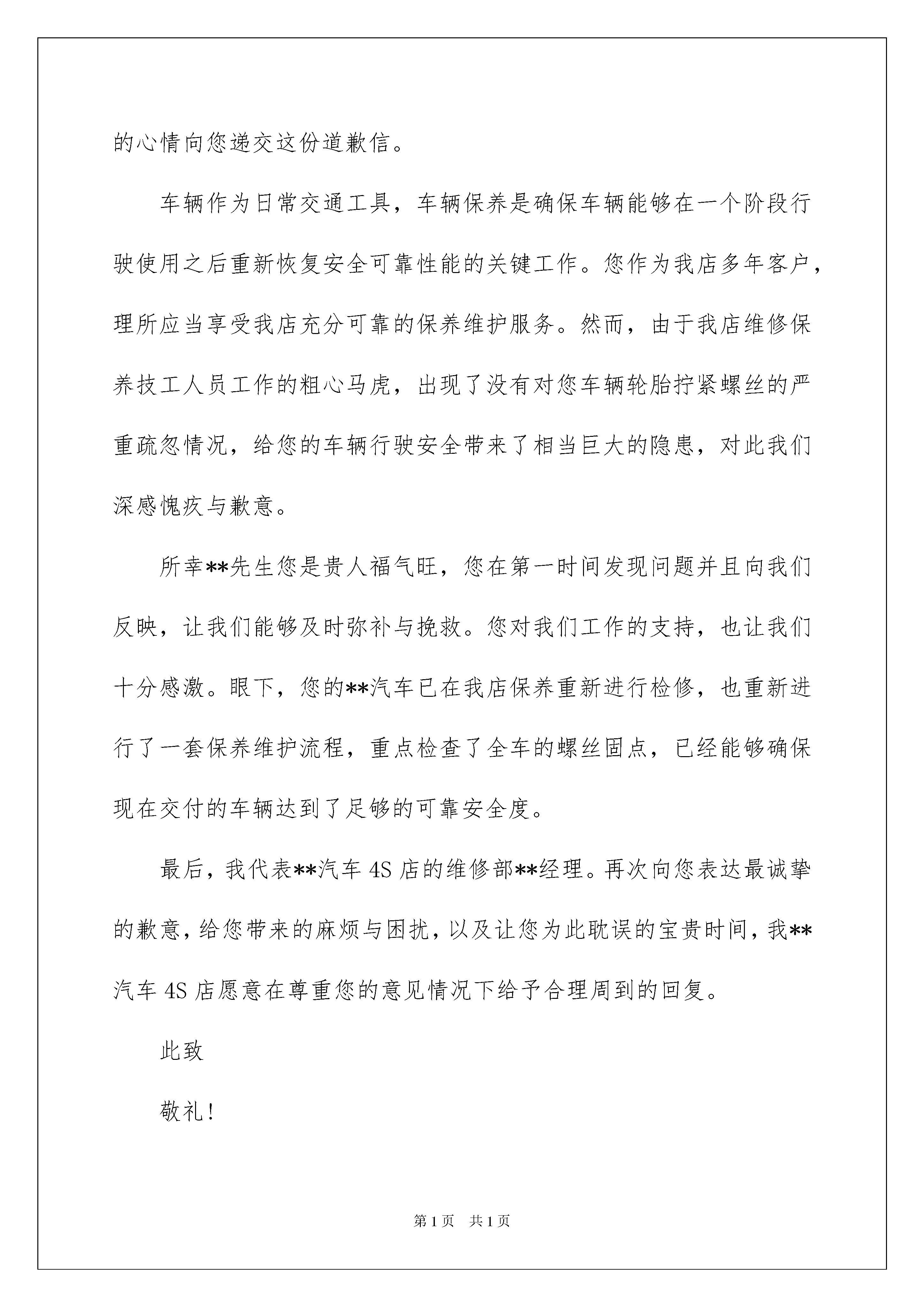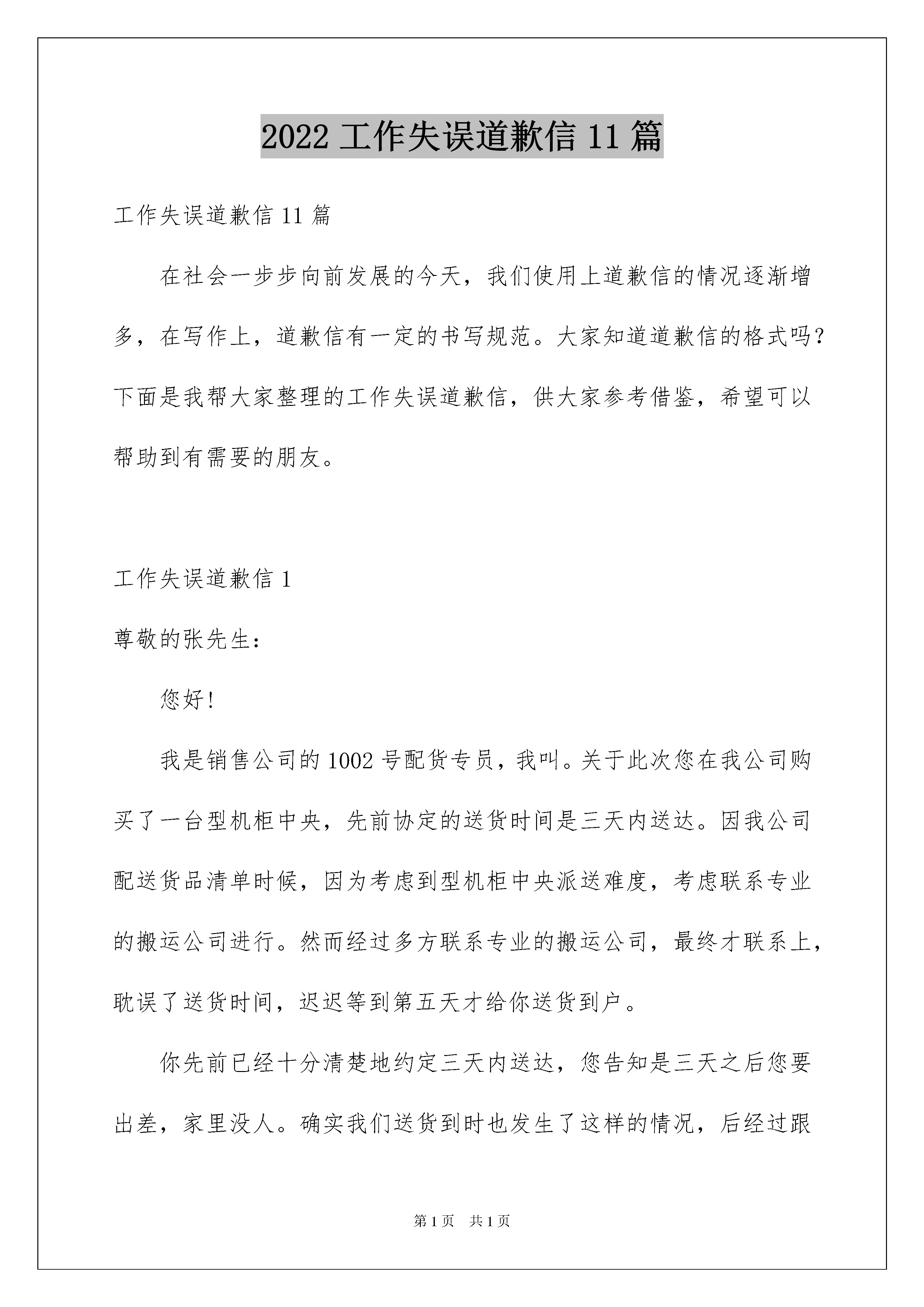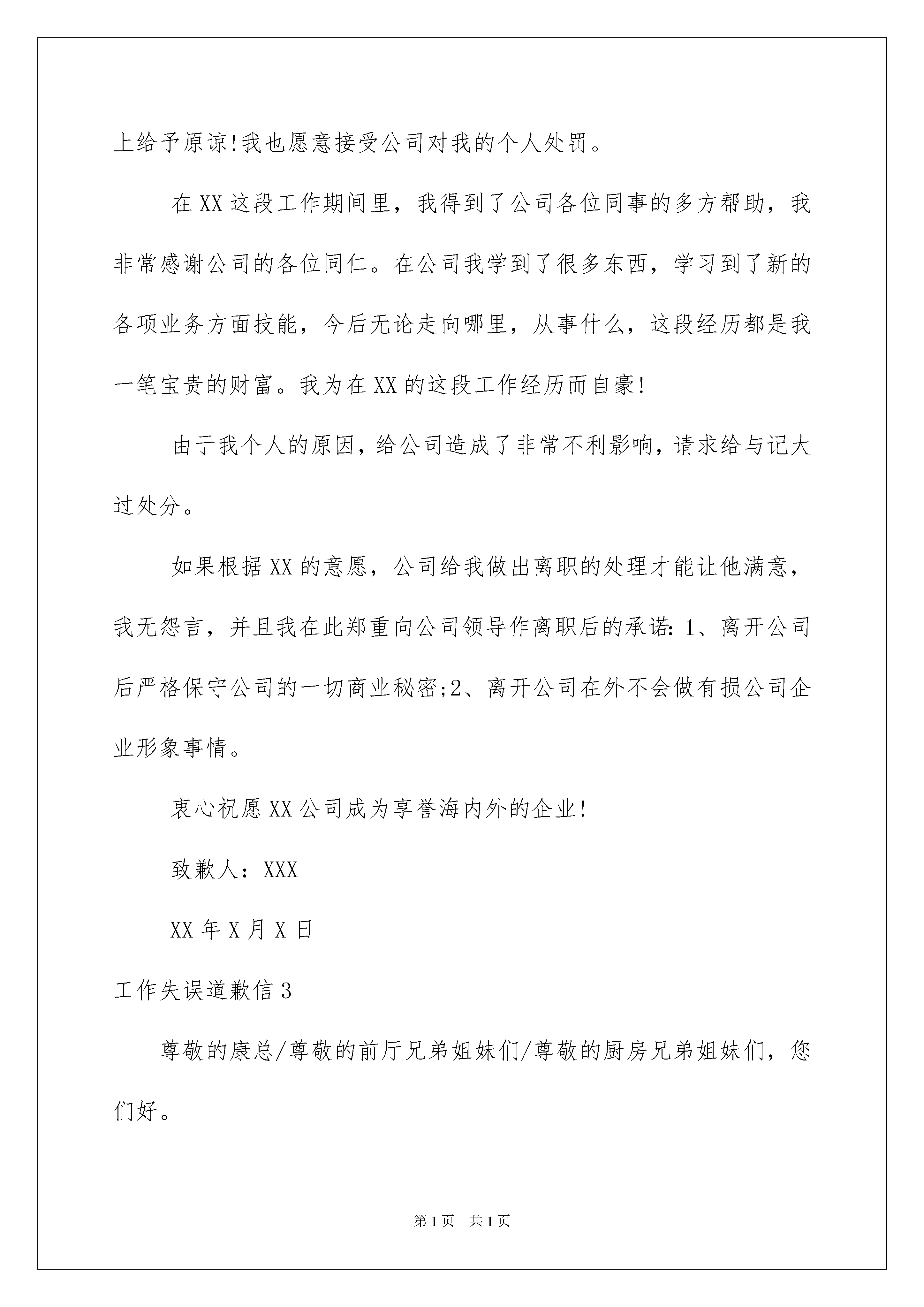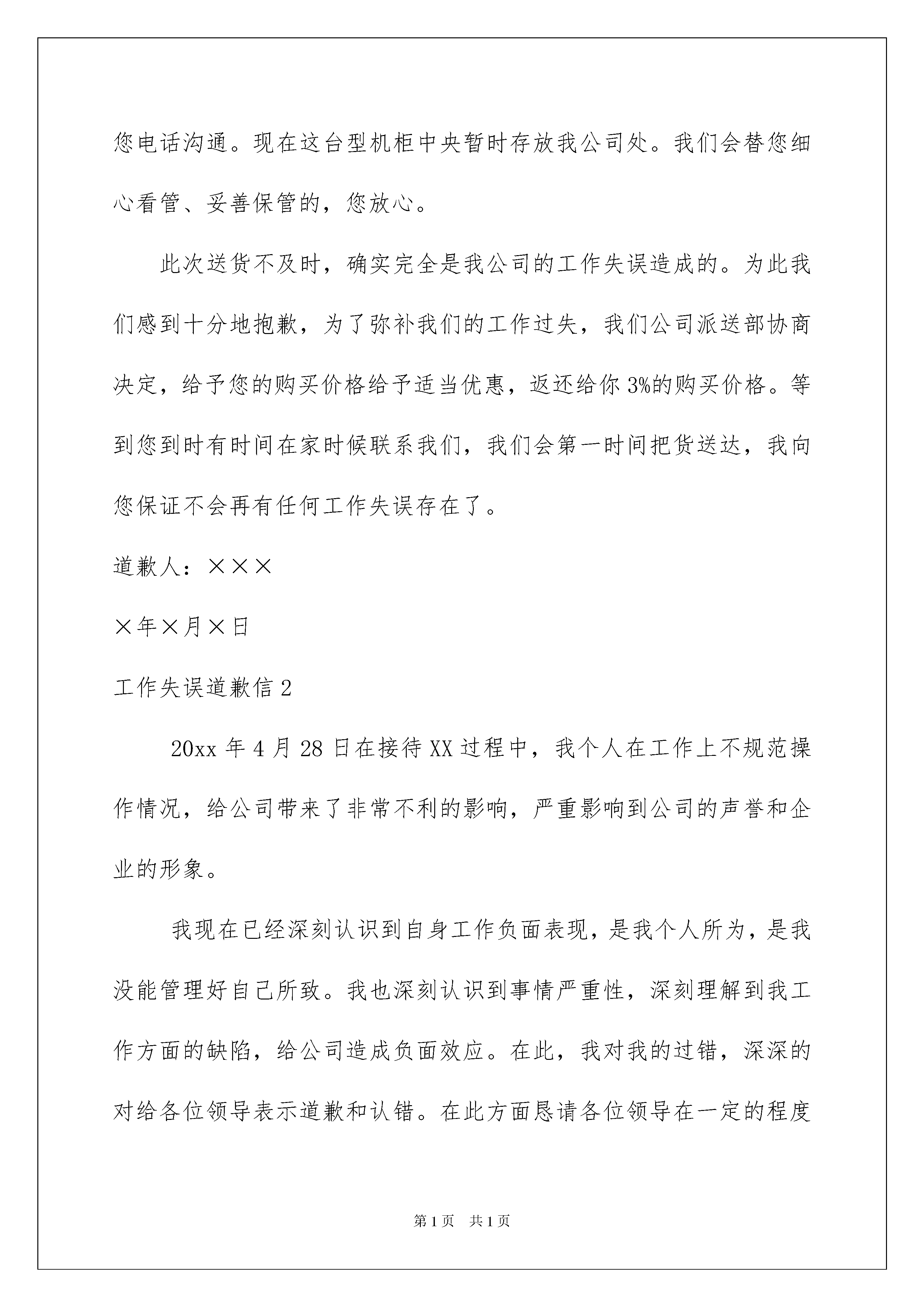 2022工作失误道歉信11篇工作失误道歉信11篇在社会一步步向前发展的今天,我们使用上道歉信的情况逐渐增多,在写作上,道歉信有一定的书写规范。大家知道道歉信的格式吗?下面是我帮大家整理的工作失误道歉信,供大家参考借鉴,希望可以帮助到有需要的朋友。工作失误道歉信1尊敬的张先生:您好!我是销售公司的1002号配货专员,我叫。关于此次您在我公司购买了一台型机柜中央,先前协定的送货时间是三天内送达。因我公司配送货品清单时候,因为考虑到型机柜中央派送难度,考虑联系专业的搬运公司进行。然而经过多方联系专业的搬运公司,最终才联系上,耽误了送货时间,迟迟等到第五天才给你送货到户。你先前已经十分清楚地约定三天内送达,您告知是三天之后您要出差,家里没人。确实我们送货到时也发生了这样的情况,后经过跟您电话沟通。现在这台型机柜中央暂时存放我公司处。我们会替您细心看管、妥善保管的,您放心。此次送货不及时,确实完全是我公司的工作失误造成的。为此我们感到十分地抱歉,为了弥补我们的工作过失,我们公司派送部协商决定,给予您的购买价格给予适当优惠,返还给你3%的购买价格。等到您到时有时间在家时候联系我们,我们会第一时间把货送达,我向您保证不会再有任何工作失误存在了。道歉人:××××年×月×日工作失误道歉信220xx年4月28日在接待XX过程中,我个人在工作上不规范操作情况,给公司带来了非常不利的影响,严重影响到公司的声誉和企业的形象。我现在已经深刻认识到自身工作负面表现,是我个人所为,是我没能管理好自己所致。我也深刻认识到事情严重性,深刻理解到我工作方面的缺陷,给公司造成负面效应。在此,我对我的过错,深深的对给各位领导表示道歉和认错。在此方面恳请各位领导在一定的程度上给予原谅!我也愿意接受公司对我的个人处罚。在XX这段工作期间里,我得到了公司各位同事的多方帮助,我非常感谢公司的各位同仁。在公司我学到了很多东西,学习到了新的各项业务方面技能,今后无论走向哪里,从事什么,这段经历都是我一笔宝贵的财富。我为在XX的这段工作经历而自豪!由于我个人的原因,给公司造成了非常不利影响,请求给与记大过处分。如果根据XX的意愿,公司给我做出离职的处理才能让他满意,我无怨言,并且我在此郑重向公司领导作离职后的承诺:1、离开公司后严格保守公司的一切商业秘密;2、离开公司在外不会做有损公司企业形象事情。衷心祝愿XX公司成为享誉海内外的企业!致歉人:XXXXX年X月X日工作失误道歉信3尊敬的康总/尊敬的前厅兄弟姐妹们/尊敬的厨房兄弟姐妹们,您们好。在这里,因为这次冲突事件,我检讨自己对工作的失职、疏于监管不当的愧疚与自责。首先我作为一名经理,我的职责就是贯彻思想教育/维护酒店财产及兄弟姐妹的人生安全。对于我在管理上的监督失职,很大程度上是由于我的主观方面疏忽,没有很好的履行职责所致。我这样的工作错误,给企业以及整个集体的工作形象上抹黑,造成对企业,对团队有不良的影响。总而言之,工作的错误已成事实,我并不想找理由来掩盖我的过错。此次事件的发生,充分地说明我在思想上、安全意识上存在严重欠缺,在监管方面存在严重疏忽,在工作意识上存在严重怠慢。在此,我向领导同事表示深深地歉意。并郑重地向大家说一句:非常抱歉,我错了!工作失误道歉信4尊敬的车主**先生:我是**汽车4S店的维修部**经理,关于你的**车在我店进行日常零部件换装清晰保养过程当中,我们的技工师傅由于粗心马虎漏装零件以及交付车辆前没有仔细检查车轮螺丝拧紧情况,在此我满怀愧疚的心情向您递交这份道歉信。车辆作为日常交通工具,车辆保养是确保车辆能够在一个阶段行驶使用之后重新恢复安全可靠性能的关键工作。您作为我店多年客户,理所应当享受我店充分可靠的保养维护服务。然而,由于我店维修保养技工人员工作的粗心马虎,出现了没有对您车辆轮胎拧紧螺丝的严重疏忽情况,给您的车辆行驶安全带来了相当巨大的隐患,对此我们深感愧疚与歉意。所幸**先生您是贵人福气旺,您在第一时间发现问题并且向我们反映,让我们能够及时弥补与挽救。您对我们工作的支持,也让我们十分感激。眼下,您的**汽车已在我店保养重新进行检修,也重新进行了一套保养维护流程,重点检查了全车的螺丝固点,已经能够确保现在交付的车辆达到了足够的可靠安全度。最后,我代表**汽车4S店的维修部**经理。再次向您表达最诚挚的歉意,给您带来的麻烦与困扰,以及让您为此耽误的宝贵时间,我**汽车4S店愿意在尊重您的意见情况下给予合理周到的回复。此致敬礼!道歉人:年月日工作失误道歉信5尊敬的车主xx先生:我是xx汽车4S店的维修部xx经理,关于你的xx车在我店进行日常零部