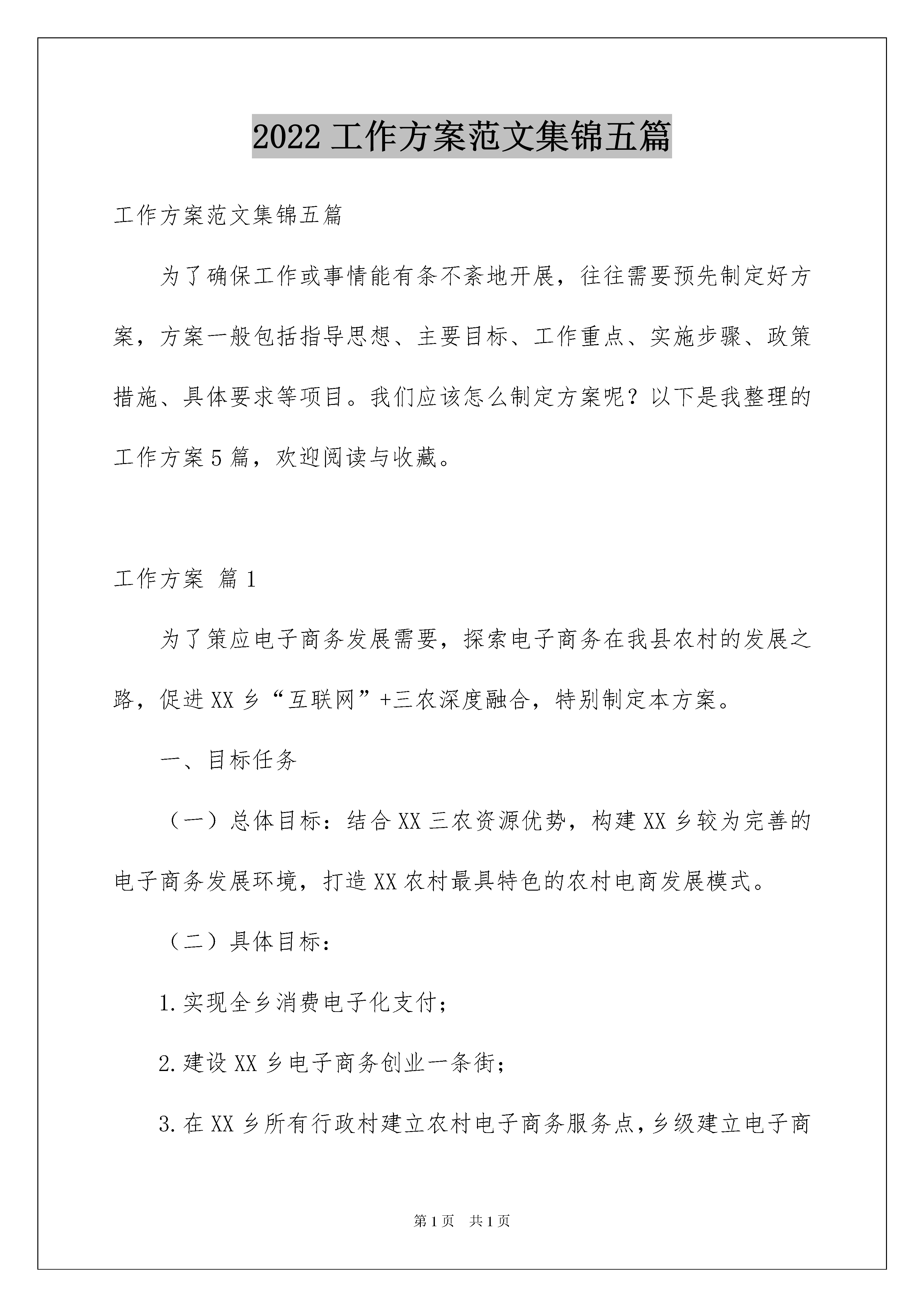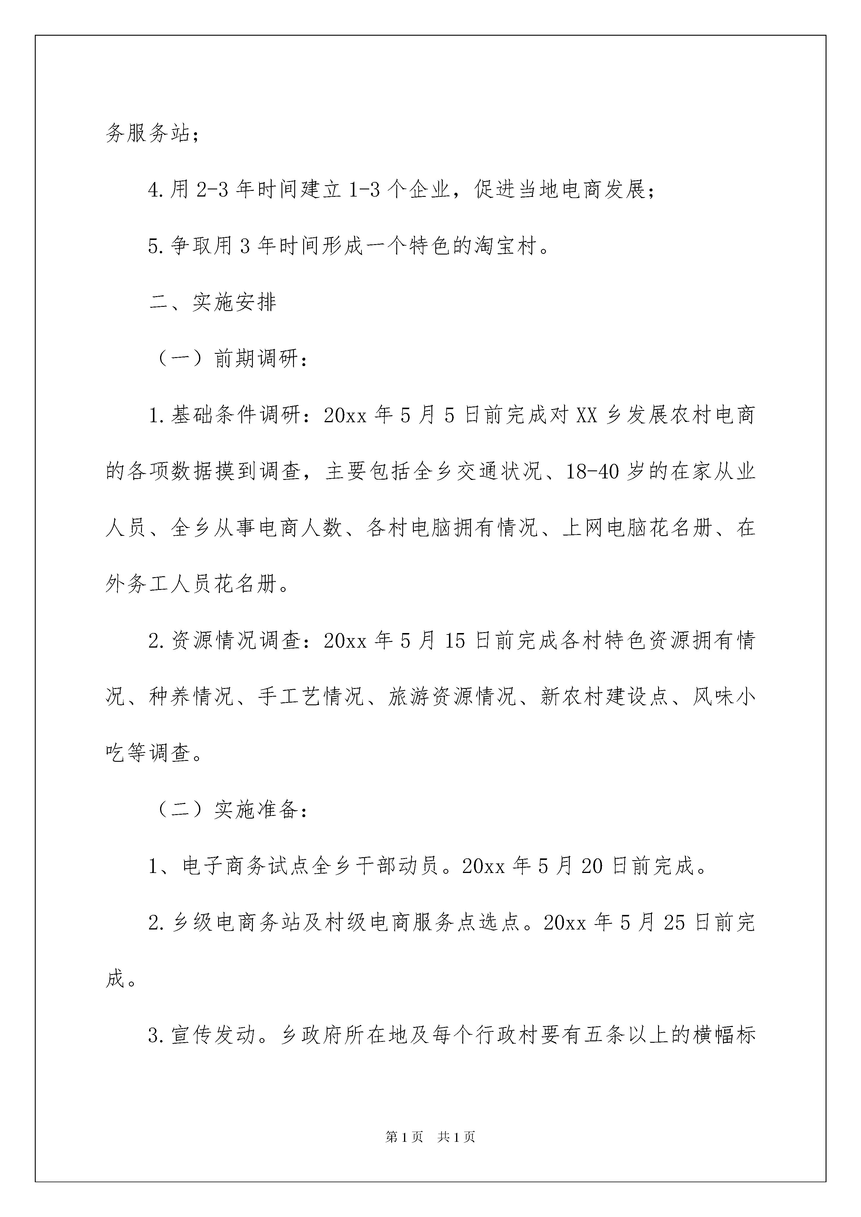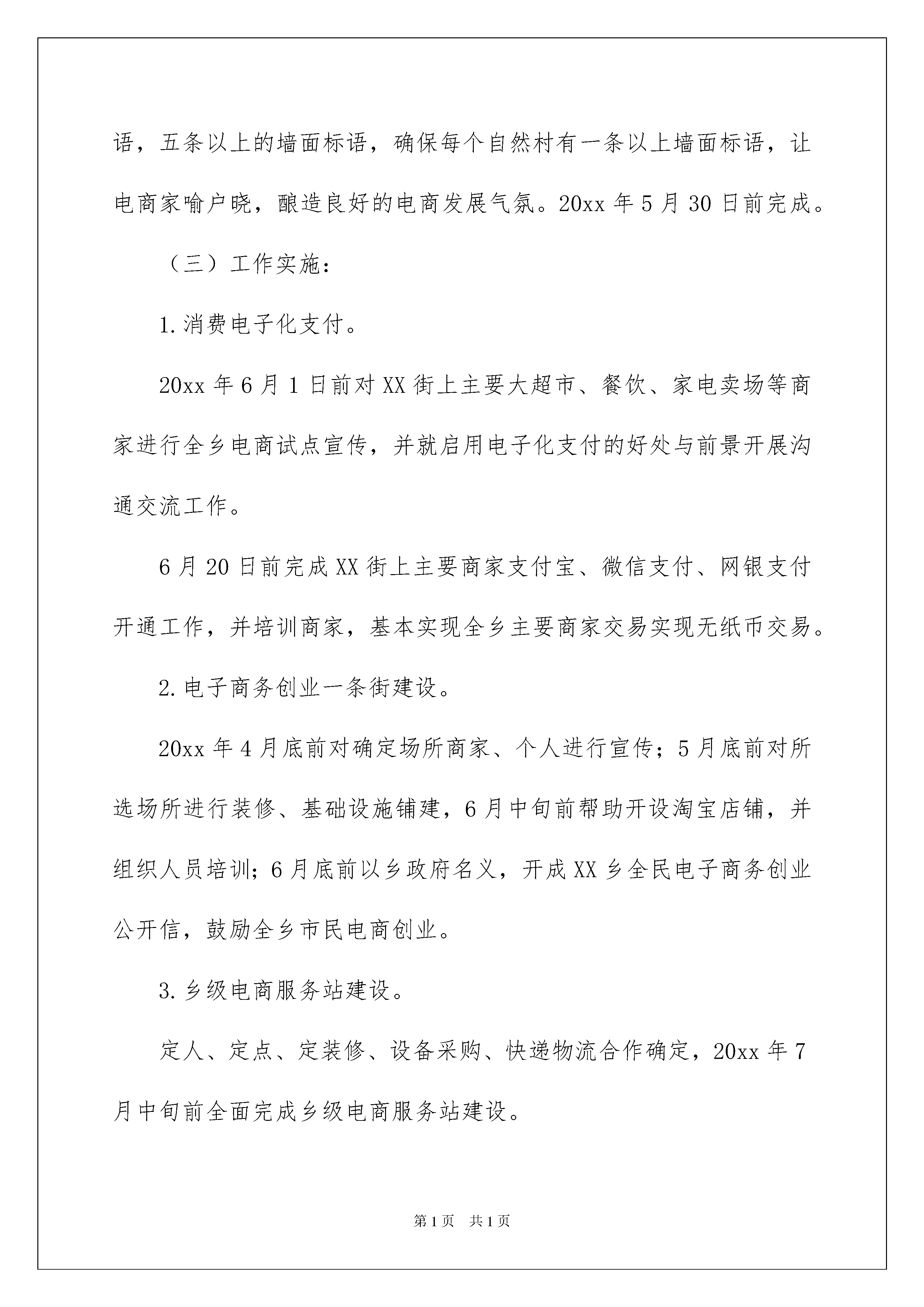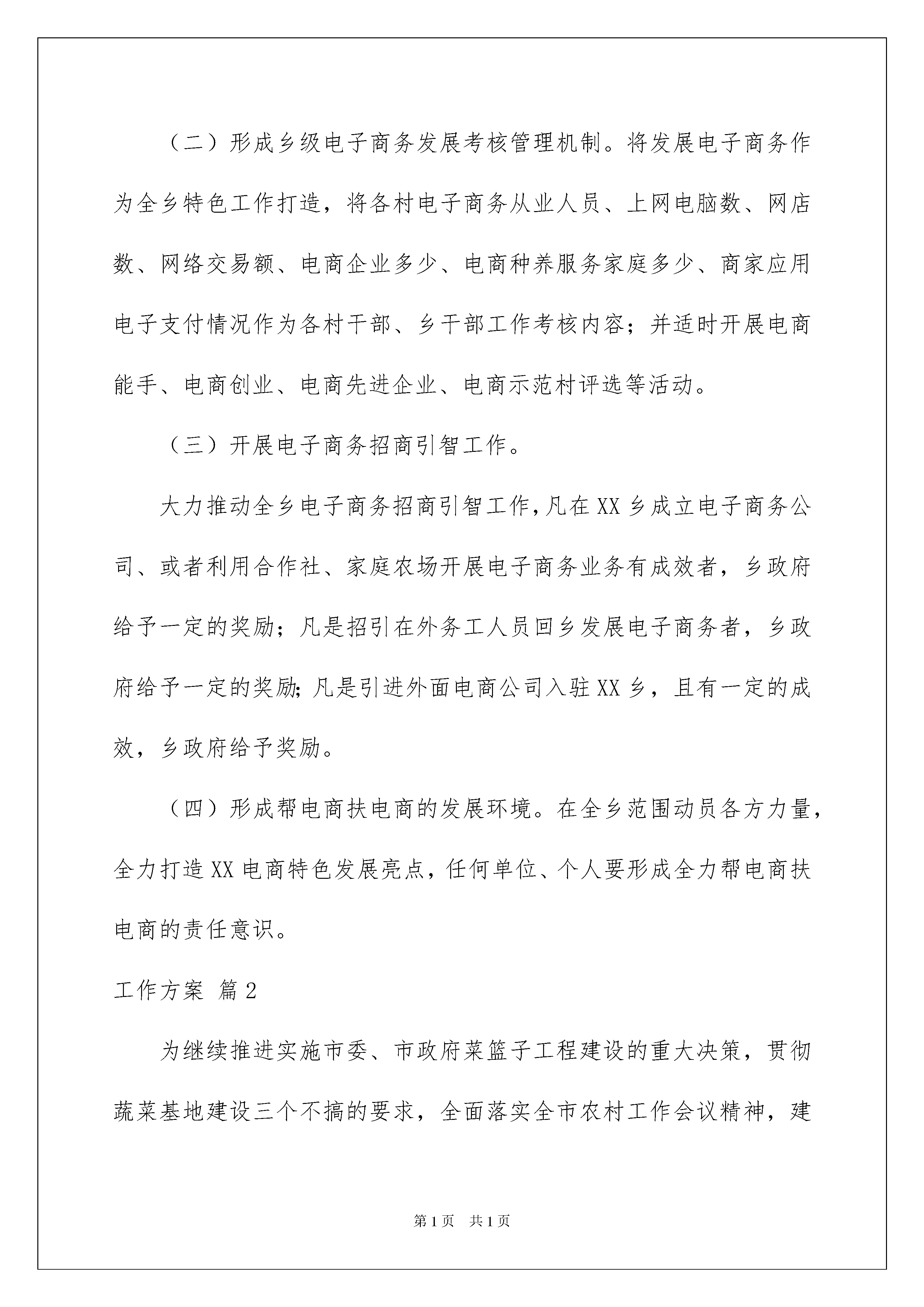 2022工作方案范文集锦五篇工作方案范文集锦五篇为了确保工作或事情能有条不紊地开展,往往需要预先制定好方案,方案一般包括指导思想、主要目标、工作重点、实施步骤、政策措施、具体要求等项目。我们应该怎么制定方案呢?以下是我整理的工作方案5篇,欢迎阅读与收藏。工作方案篇1为了策应电子商务发展需要,探索电子商务在我县农村的发展之路,促进XX乡“互联网”+三农深度融合,特别制定本方案。一、目标任务(一)总体目标:结合XX三农资源优势,构建XX乡较为完善的电子商务发展环境,打造XX农村最具特色的农村电商发展模式。(二)具体目标:1.实现全乡消费电子化支付;2.建设XX乡电子商务创业一条街;3.在XX乡所有行政村建立农村电子商务服务点,乡级建立电子商务服务站;4.用2-3年时间建立1-3个企业,促进当地电商发展;5.争取用3年时间形成一个特色的淘宝村。二、实施安排(一)前期调研:1.基础条件调研:20xx年5月5日前完成对XX乡发展农村电商的各项数据摸到调查,主要包括全乡交通状况、18-40岁的在家从业人员、全乡从事电商人数、各村电脑拥有情况、上网电脑花名册、在外务工人员花名册。2.资源情况调查:20xx年5月15日前完成各村特色资源拥有情况、种养情况、手工艺情况、旅游资源情况、新农村建设点、风味小吃等调查。(二)实施准备:1、电子商务试点全乡干部动员。20xx年5月20日前完成。2.乡级电商务站及村级电商服务点选点。20xx年5月25日前完成。3.宣传发动。乡政府所在地及每个行政村要有五条以上的横幅标语,五条以上的墙面标语,确保每个自然村有一条以上墙面标语,让电商家喻户晓,酿造良好的电商发展气氛。20xx年5月30日前完成。(三)工作实施:1.消费电子化支付。20xx年6月1日前对XX街上主要大超市、餐饮、家电卖场等商家进行全乡电商试点宣传,并就启用电子化支付的好处与前景开展沟通交流工作。6月20日前完成XX街上主要商家支付宝、微信支付、网银支付开通工作,并培训商家,基本实现全乡主要商家交易实现无纸币交易。2.电子商务创业一条街建设。20xx年4月底前对确定场所商家、个人进行宣传;5月底前对所选场所进行装修、基础设施铺建,6月中旬前帮助开设淘宝店铺,并组织人员培训;6月底前以乡政府名义,开成XX乡全民电子商务创业公开信,鼓励全乡市民电商创业。3.乡级电商服务站建设。定人、定点、定装修、设备采购、快递物流合作确定,20xx年7月中旬前全面完成乡级电商服务站建设。4.村级电子商务服务点建设。20xx年5月上旬启动村级服务点选点定人工作;5月底计划服务点人员培训;20xx年6月上旬完成所选点装修、设备安装,20xx年6月中旬各服务点投入使用,能够实现代购、代销、车机票购买、话费充值、快递收发等生活服务功能。5.发展1-3家企业。20xx年12月底前,结合本地电子商务发展情况,争取引导发展1-3个企业,做大做强本地农产品电商、促进本地电子商务快速发展。6.努力打造一个淘宝村。通过政策激励、人员引导,让更多XX青年投身电子商务,争取用三年时间打造出一个有特色、有亮点的淘宝村,让XX乡市民想问题办事情能主动应用电子商务。三、组织管理(一)成立乡级电子商务领导小组。为有效整合全乡资源,形成工作合力,实现电子商务更好更快发展,乡级成立一个电子商务领导小组,由一名主要领导任组长,一名副科级领导任常务副组长,明确工作职责,预算一定的经费,大力推进电子商务发展。(二)形成乡级电子商务发展考核管理机制。将发展电子商务作为全乡特色工作打造,将各村电子商务从业人员、上网电脑数、网店数、网络交易额、电商企业多少、电商种养服务家庭多少、商家应用电子支付情况作为各村干部、乡干部工作考核内容;并适时开展电商能手、电商创业、电商先进企业、电商示范村评选等活动。(三)开展电子商务招商引智工作。大力推动全乡电子商务招商引智工作,凡在XX乡成立电子商务公司、或者利用合作社、家庭农场开展电子商务业务有成效者,乡政府给予一定的奖励;凡是招引在外务工人员回乡发展电子商务者,乡政府给予一定的奖励;凡是引进外面电商公司入驻XX乡,且有一定的成效,乡政府给予奖励。(四)形成帮电商扶电商的发展环境。在全乡范围动员各方力量,全力打造XX电商特色发展亮点,任何单位、个人要形成全力帮电商扶电商的责任意识。工作方案篇2为继续推进实施市委、市政府菜篮子工程建设的重大决策,贯彻蔬菜基地建设三个不搞的要求,全面落实全市农村工作会议精神,建设好规模化的城郊蔬菜基地,增加生产,保障供应,稳定菜价,助农增收,特制定年城郊蔬菜基地建设推进方案。一、明确政策,坚持