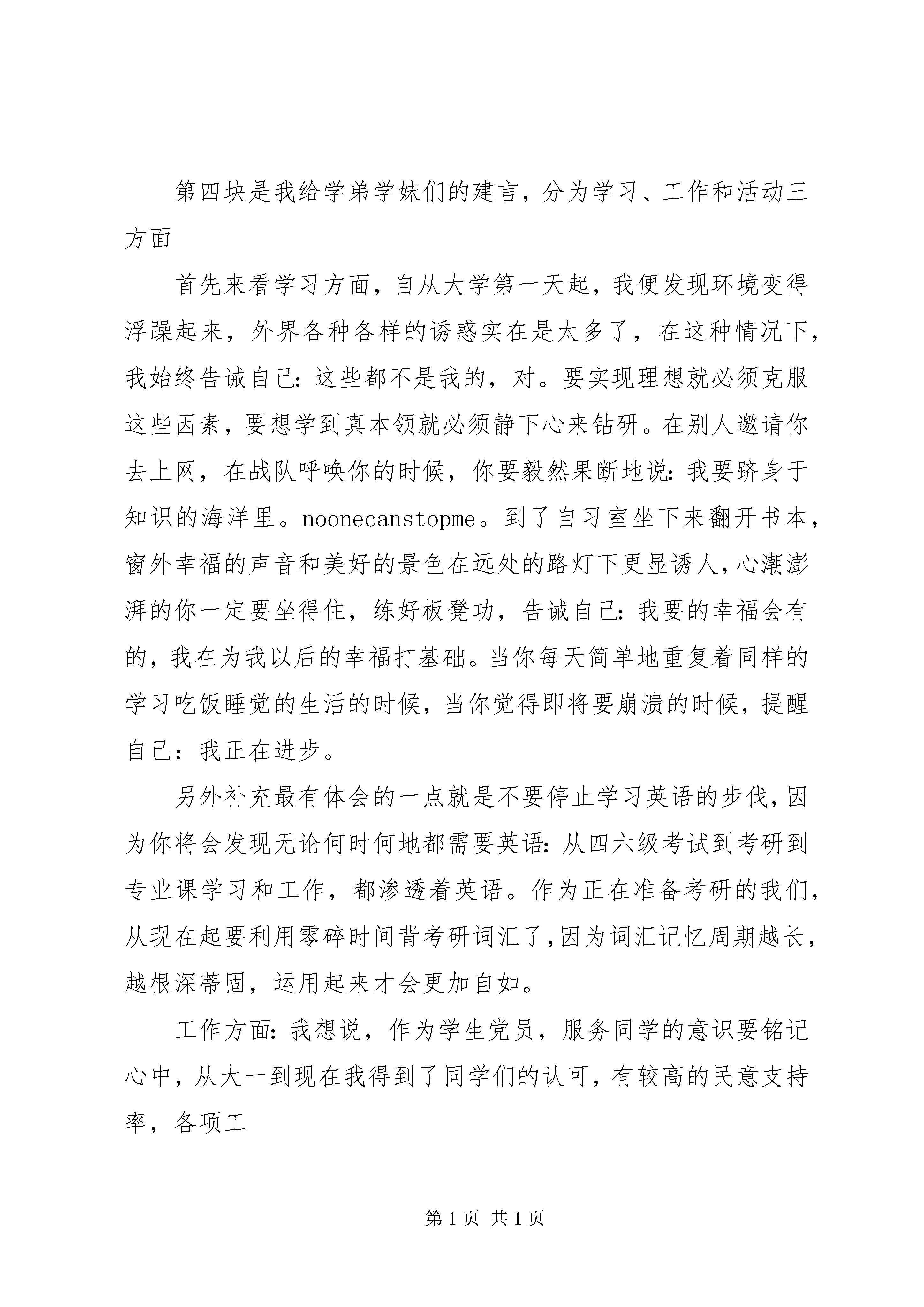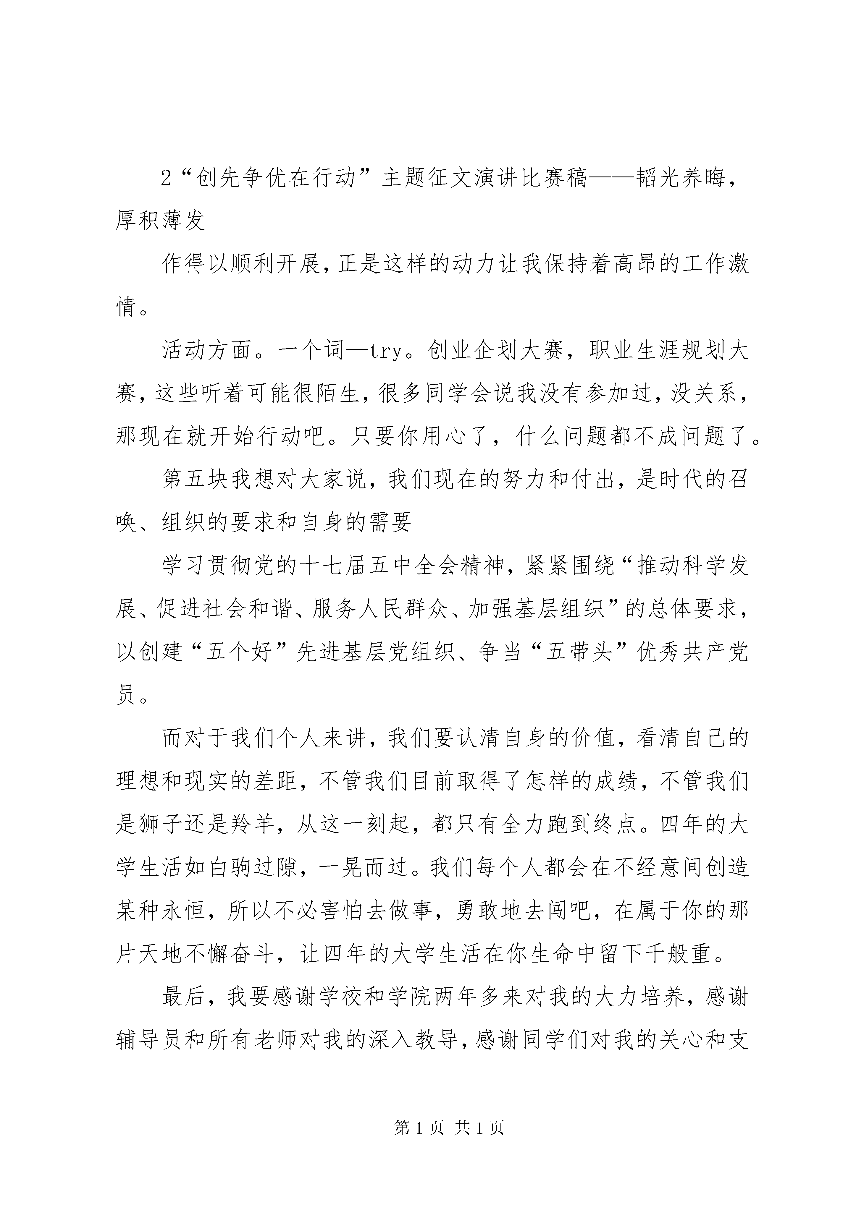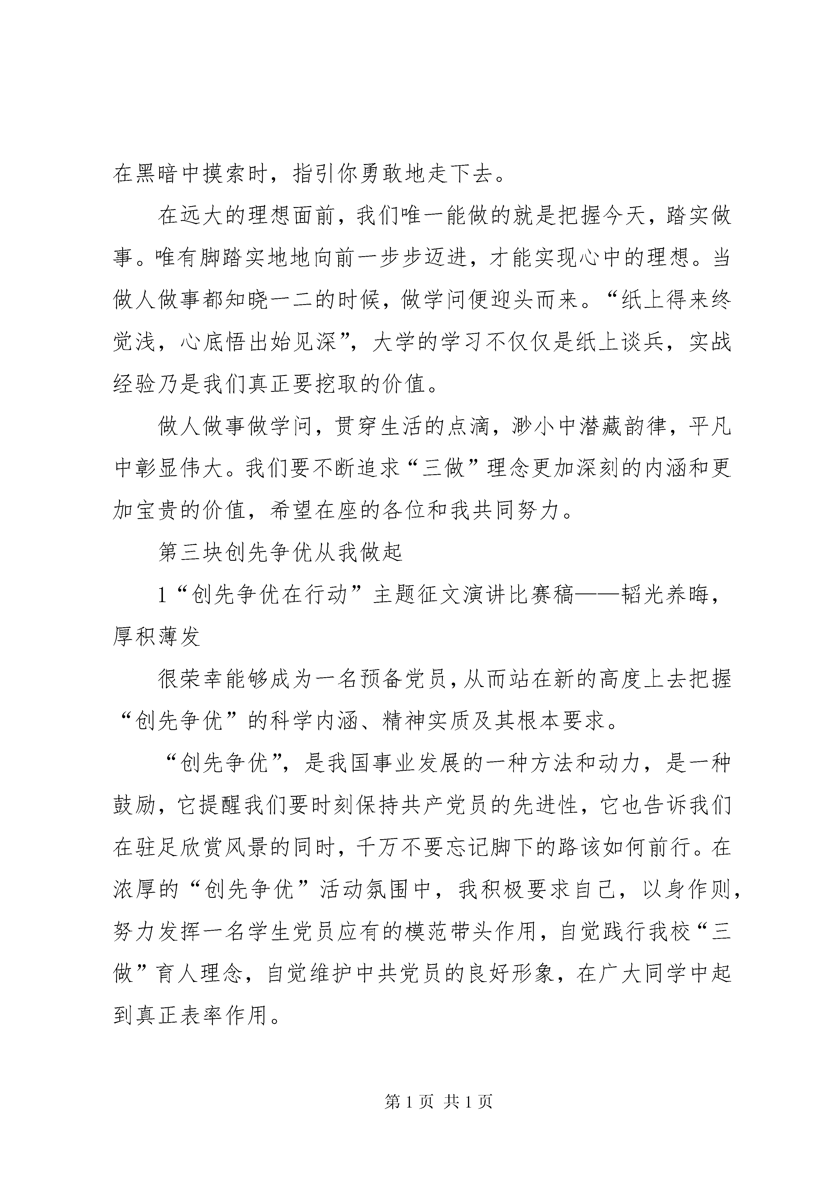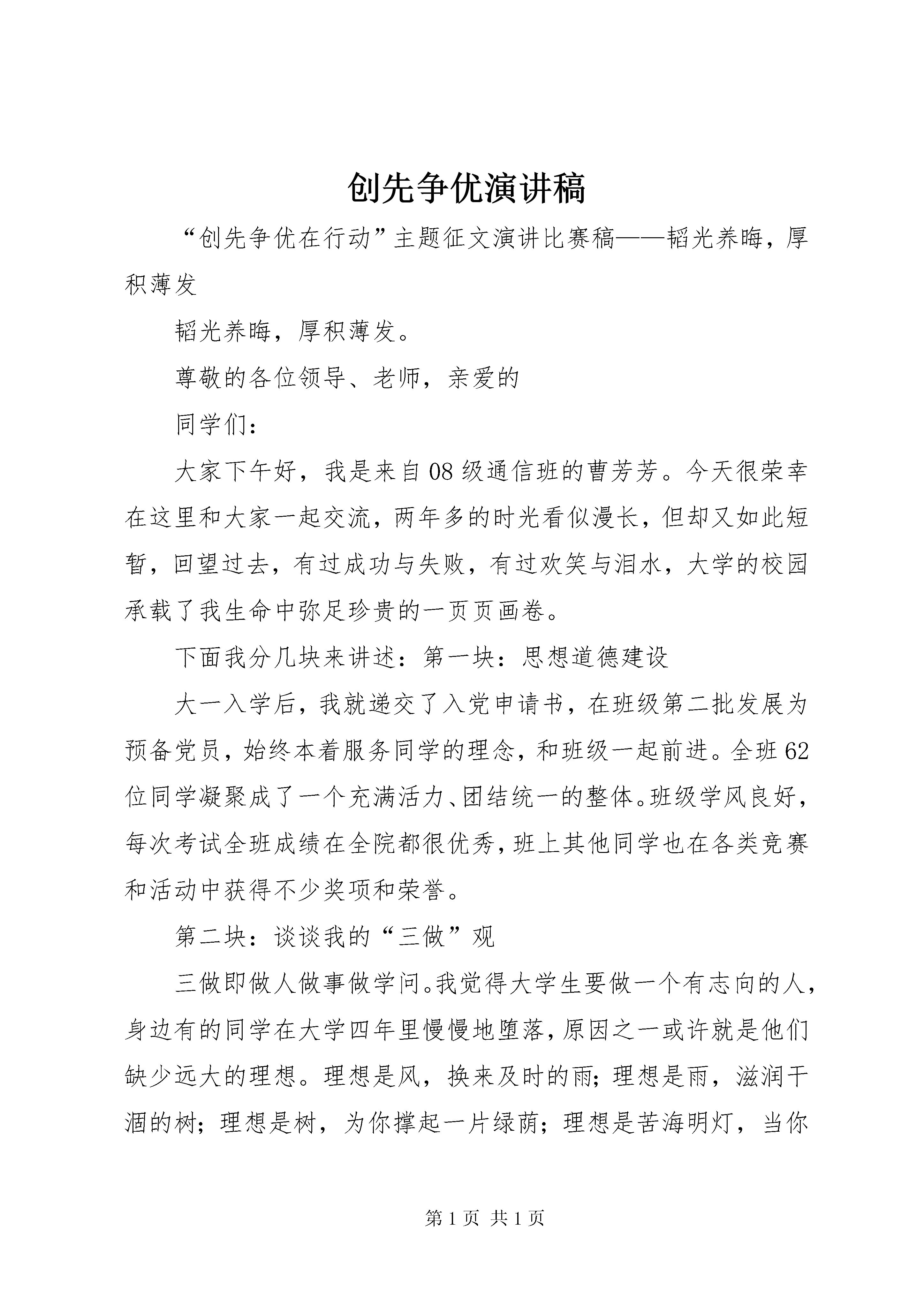 创先争优演讲稿“创先争优在行动”主题征文演讲比赛稿——韬光养晦,厚积薄发韬光养晦,厚积薄发。尊敬的各位领导、老师,亲爱的同学们:大家下午好,我是来自08级通信班的曹芳芳。今天很荣幸在这里和大家一起交流,两年多的时光看似漫长,但却又如此短暂,回望过去,有过成功与失败,有过欢笑与泪水,大学的校园承载了我生命中弥足珍贵的一页页画卷。下面我分几块来讲述:第一块:思想道德建设大一入学后,我就递交了入党申请书,在班级第二批发展为预备党员,始终本着服务同学的理念,和班级一起前进。全班62位同学凝聚成了一个充满活力、团结统一的整体。班级学风良好,每次考试全班成绩在全院都很优秀,班上其他同学也在各类竞赛和活动中获得不少奖项和荣誉。第二块:谈谈我的“三做”观三做即做人做事做学问。我觉得大学生要做一个有志向的人,身边有的同学在大学四年里慢慢地堕落,原因之一或许就是他们缺少远大的理想。理想是风,换来及时的雨;理想是雨,滋润干涸的树;理想是树,为你撑起一片绿荫;理想是苦海明灯,当你在黑暗中摸索时,指引你勇敢地走下去。在远大的理想面前,我们唯一能做的就是把握今天,踏实做事。唯有脚踏实地地向前一步步迈进,才能实现心中的理想。当做人做事都知晓一二的时候,做学问便迎头而来。“纸上得来终觉浅,心底悟出始见深”,大学的学习不仅仅是纸上谈兵,实战经验乃是我们真正要挖取的价值。做人做事做学问,贯穿生活的点滴,渺小中潜藏韵律,平凡中彰显伟大。我们要不断追求“三做”理念更加深刻的内涵和更加宝贵的价值,希望在座的各位和我共同努力。第三块创先争优从我做起1“创先争优在行动”主题征文演讲比赛稿——韬光养晦,厚积薄发很荣幸能够成为一名预备党员,从而站在新的高度上去把握“创先争优”的科学内涵、精神实质及其根本要求。“创先争优”,是我国事业发展的一种方法和动力,是一种鼓励,它提醒我们要时刻保持共产党员的先进性,它也告诉我们在驻足欣赏风景的同时,千万不要忘记脚下的路该如何前行。在浓厚的“创先争优”活动氛围中,我积极要求自己,以身作则,努力发挥一名学生党员应有的模范带头作用,自觉践行我校“三做”育人理念,自觉维护中共党员的良好形象,在广大同学中起到真正表率作用。第四块是我给学弟学妹们的建言,分为学习、工作和活动三方面首先来看学习方面,自从大学第一天起,我便发现环境变得浮躁起来,外界各种各样的诱惑实在是太多了,在这种情况下,我始终告诫自己:这些都不是我的,对。要实现理想就必须克服这些因素,要想学到真本领就必须静下心来钻研。在别人邀请你去上网,在战队呼唤你的时候,你要毅然果断地说:我要跻身于知识的海洋里。noonecanstopme。到了自习室坐下来翻开书本,窗外幸福的声音和美好的景色在远处的路灯下更显诱人,心潮澎湃的你一定要坐得住,练好板凳功,告诫自己:我要的幸福会有的,我在为我以后的幸福打基础。当你每天简单地重复着同样的学习吃饭睡觉的生活的时候,当你觉得即将要崩溃的时候,提醒自己:我正在进步。另外补充最有体会的一点就是不要停止学习英语的步伐,因为你将会发现无论何时何地都需要英语:从四六级考试到考研到专业课学习和工作,都渗透着英语。作为正在准备考研的我们,从现在起要利用零碎时间背考研词汇了,因为词汇记忆周期越长,越根深蒂固,运用起来才会更加自如。工作方面:我想说,作为学生党员,服务同学的意识要铭记心中,从大一到现在我得到了同学们的认可,有较高的民意支持率,各项工2“创先争优在行动”主题征文演讲比赛稿——韬光养晦,厚积薄发作得以顺利开展,正是这样的动力让我保持着高昂的工作激情。活动方面。一个词—try。创业企划大赛,职业生涯规划大赛,这些听着可能很陌生,很多同学会说我没有参加过,没关系,那现在就开始行动吧。只要你用心了,什么问题都不成问题了。第五块我想对大家说,我们现在的努力和付出,是时代的召唤、组织的要求和自身的需要学习贯彻党的十七届五中全会精神,紧紧围绕“推动科学发展、促进社会和谐、服务人民群众、加强基层组织”的总体要求,以创建“五个好”先进基层党组织、争当“五带头”优秀共产党员。而对于我们个人来讲,我们要认清自身的价值,看清自己的理想和现实的差距,不管我们目前取得了怎样的成绩,不管我们是狮子还是羚羊,从这一刻起,都只有全力跑到终点。四年的大学生活如白驹过隙,一晃而过。我们每个人都会在不经意间创造某种永恒,所以不必害怕去做事,勇敢地去闯吧,在属于你的那片天地不懈奋斗,让四年的大学生活在你生命中留下千般重。最后,我要感谢学校和学院两年多来对我的大力培养,感谢辅导员和所有老师对我的深入教导,感谢同学们对我的关心和支持,感谢本次创先争优活动给了我一个展示自我的平台;祝安庆师范学院日后更加灿烂辉煌。谢谢。08级通信工程1班曹芳芳二〇一一年三月十八日