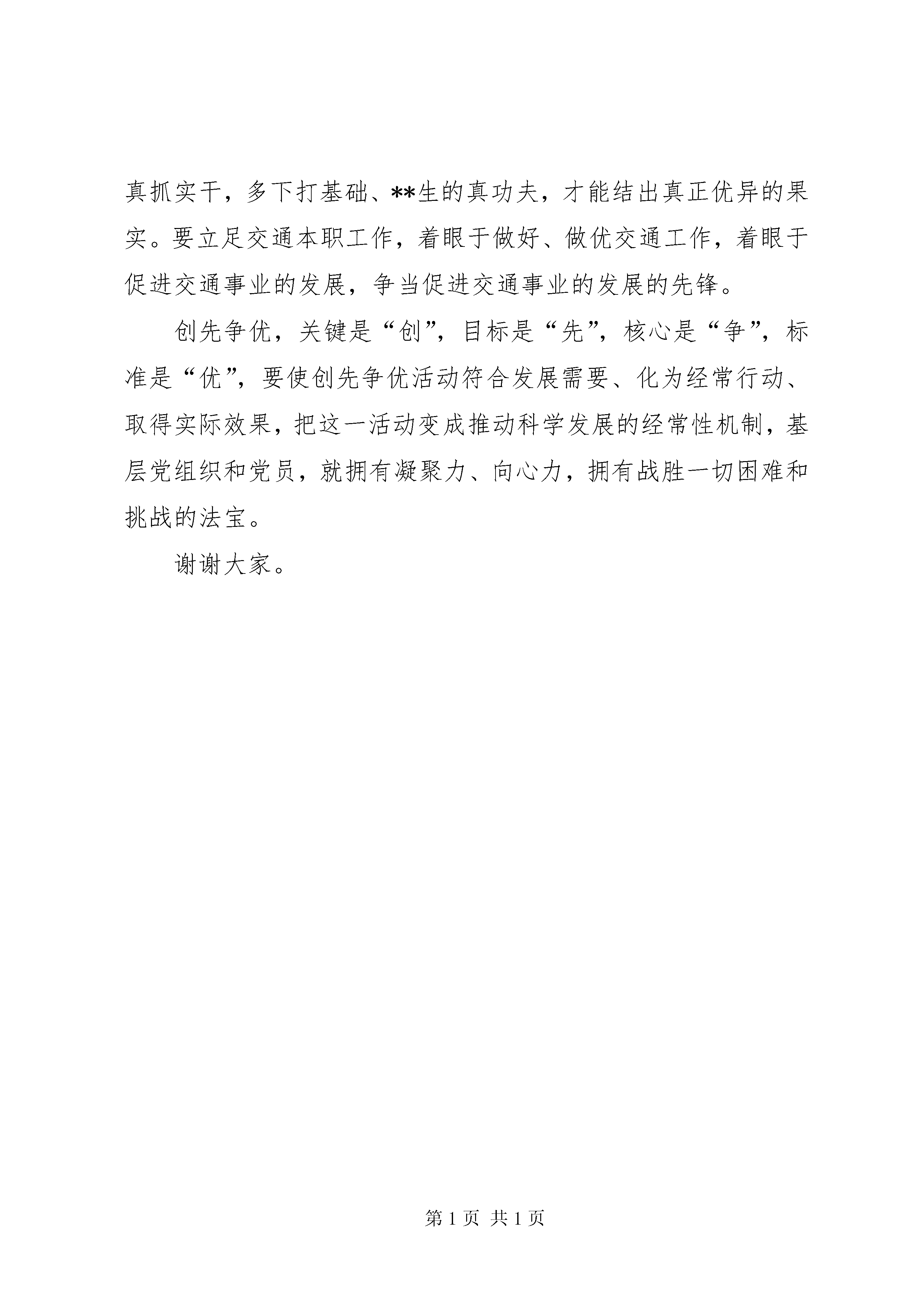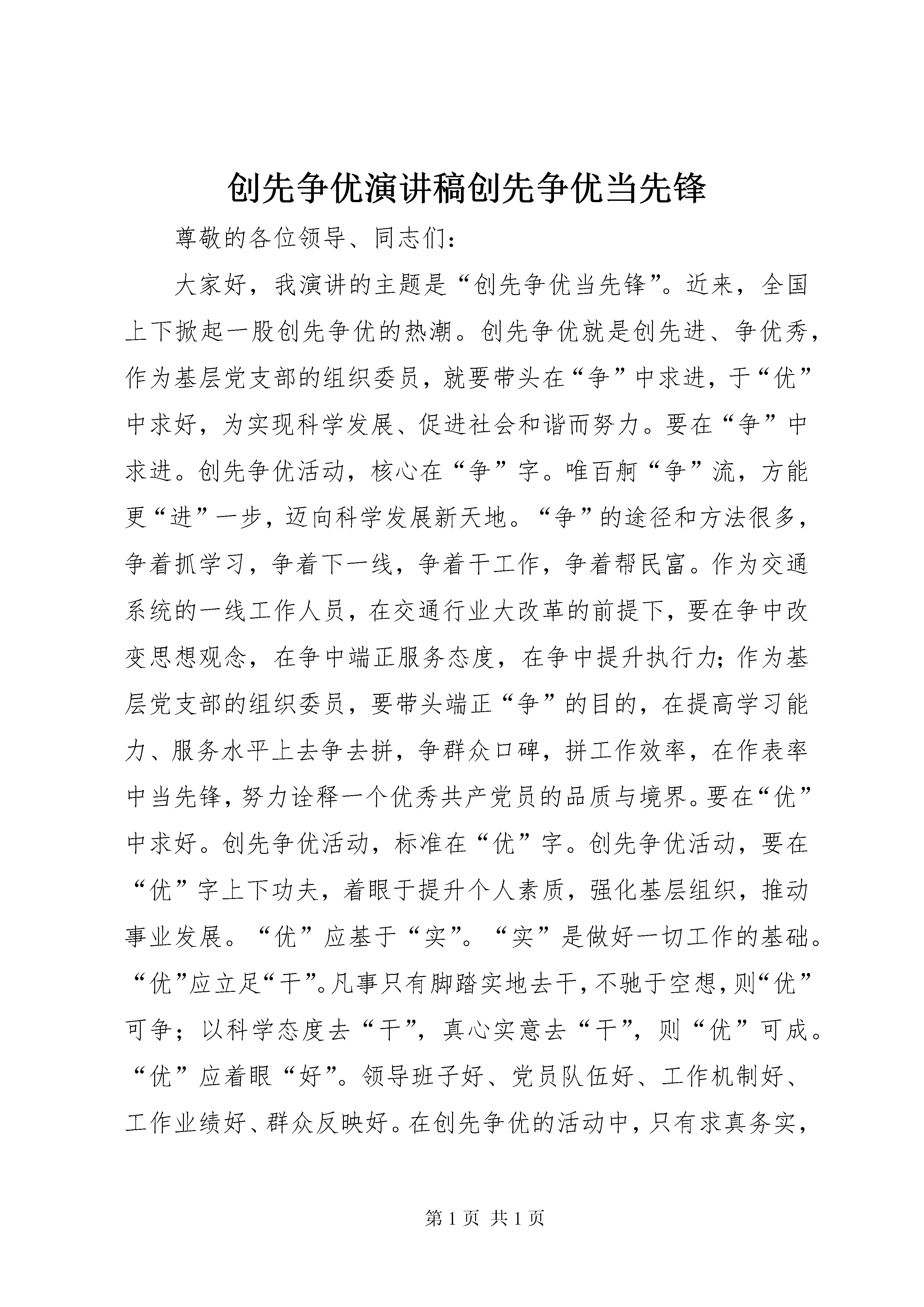 创先争优演讲稿创先争优当先锋尊敬的各位领导、同志们:大家好,我演讲的主题是“创先争优当先锋”。近来,全国上下掀起一股创先争优的热潮。创先争优就是创先进、争优秀,作为基层党支部的组织委员,就要带头在“争”中求进,于“优”中求好,为实现科学发展、促进社会和谐而努力。要在“争”中求进。创先争优活动,核心在“争”字。唯百舸“争”流,方能更“进”一步,迈向科学发展新天地。“争”的途径和方法很多,争着抓学习,争着下一线,争着干工作,争着帮民富。作为交通系统的一线工作人员,在交通行业大改革的前提下,要在争中改变思想观念,在争中端正服务态度,在争中提升执行力;作为基层党支部的组织委员,要带头端正“争”的目的,在提高学习能力、服务水平上去争去拼,争群众口碑,拼工作效率,在作表率中当先锋,努力诠释一个优秀共产党员的品质与境界。要在“优”中求好。创先争优活动,标准在“优”字。创先争优活动,要在“优”字上下功夫,着眼于提升个人素质,强化基层组织,推动事业发展。“优”应基于“实”。“实”是做好一切工作的基础。“优”应立足“干”。凡事只有脚踏实地去干,不驰于空想,则“优”可争;以科学态度去“干”,真心实意去“干”,则“优”可成。“优”应着眼“好”。领导班子好、党员队伍好、工作机制好、工作业绩好、群众反映好。在创先争优的活动中,只有求真务实,真抓实干,多下打基础、**生的真功夫,才能结出真正优异的果实。要立足交通本职工作,着眼于做好、做优交通工作,着眼于促进交通事业的发展,争当促进交通事业的发展的先锋。创先争优,关键是“创”,目标是“先”,核心是“争”,标准是“优”,要使创先争优活动符合发展需要、化为经常行动、取得实际效果,把这一活动变成推动科学发展的经常性机制,基层党组织和党员,就拥有凝聚力、向心力,拥有战胜一切困难和挑战的法宝。谢谢大家。