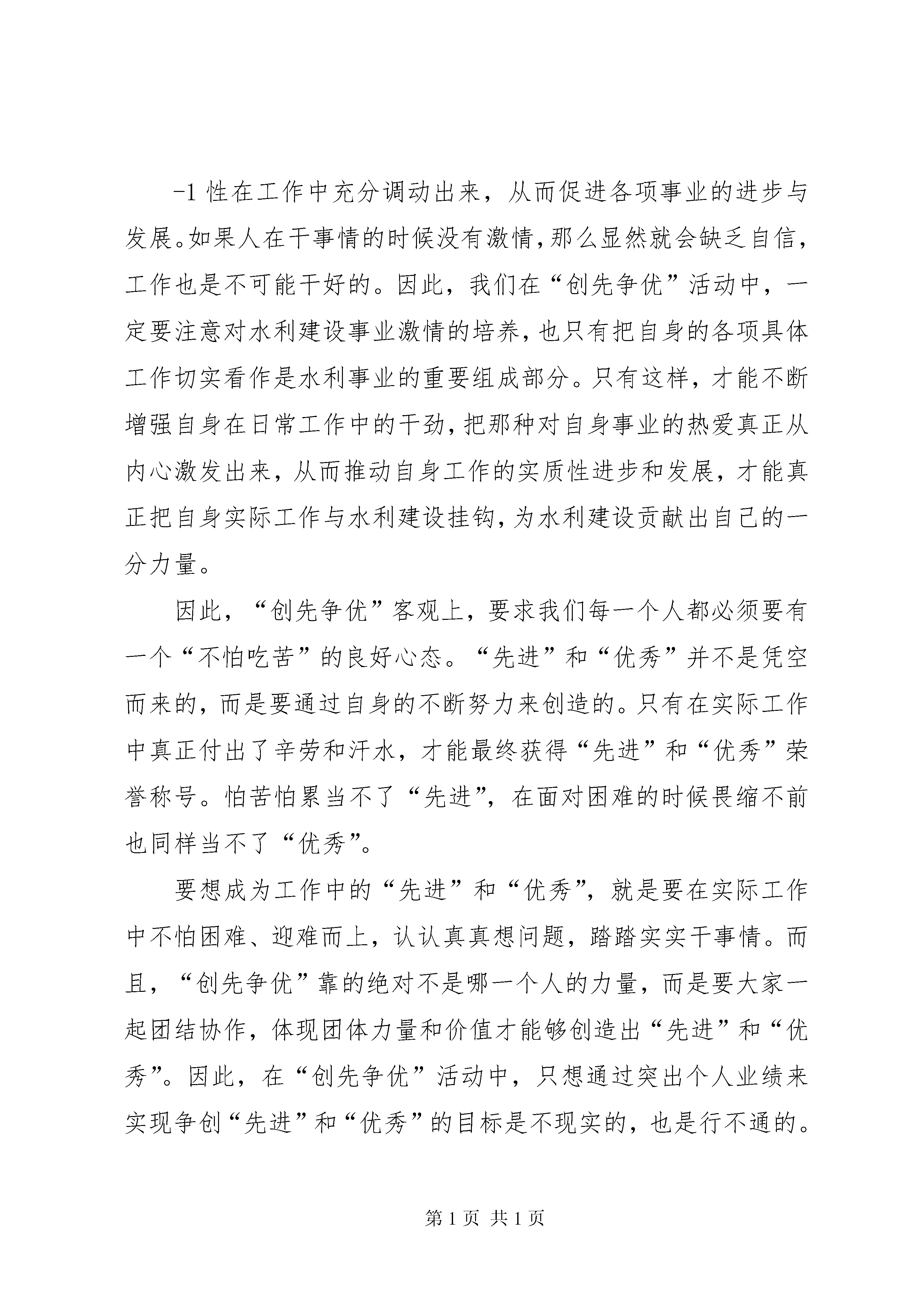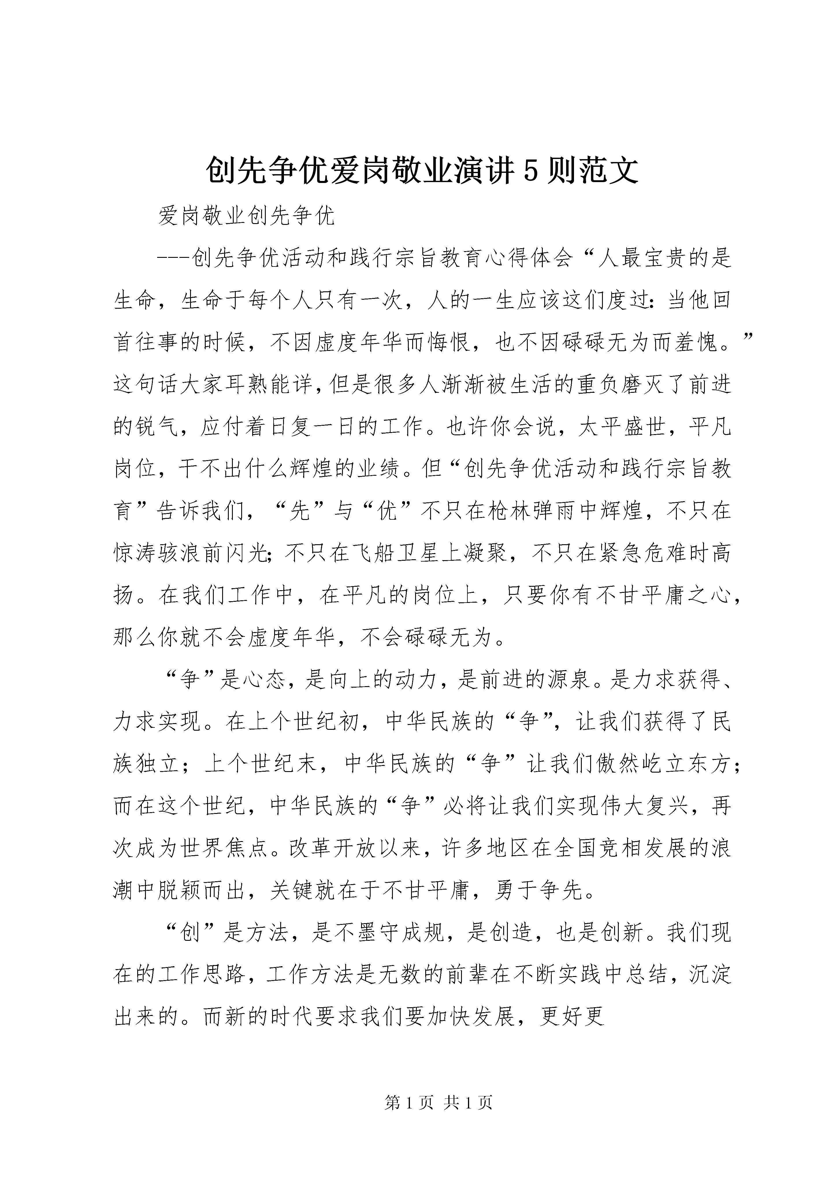 创先争优爱岗敬业演讲5则范文爱岗敬业创先争优---创先争优活动和践行宗旨教育心得体会“人最宝贵的是生命,生命于每个人只有一次,人的一生应该这们度过:当他回首往事的时候,不因虚度年华而悔恨,也不因碌碌无为而羞愧。”这句话大家耳熟能详,但是很多人渐渐被生活的重负磨灭了前进的锐气,应付着日复一日的工作。也许你会说,太平盛世,平凡岗位,干不出什么辉煌的业绩。但“创先争优活动和践行宗旨教育”告诉我们,“先”与“优”不只在枪林弹雨中辉煌,不只在惊涛骇浪前闪光;不只在飞船卫星上凝聚,不只在紧急危难时高扬。在我们工作中,在平凡的岗位上,只要你有不甘平庸之心,那么你就不会虚度年华,不会碌碌无为。“争”是心态,是向上的动力,是前进的源泉。是力求获得、力求实现。在上个世纪初,中华民族的“争”,让我们获得了民族独立;上个世纪末,中华民族的“争”让我们傲然屹立东方;而在这个世纪,中华民族的“争”必将让我们实现伟大复兴,再次成为世界焦点。改革开放以来,许多地区在全国竞相发展的浪潮中脱颖而出,关键就在于不甘平庸,勇于争先。“创”是方法,是不墨守成规,是创造,也是创新。我们现在的工作思路,工作方法是无数的前辈在不断实践中总结,沉淀出来的。而新的时代要求我们要加快发展,更好更-1性在工作中充分调动出来,从而促进各项事业的进步与发展。如果人在干事情的时候没有激情,那么显然就会缺乏自信,工作也是不可能干好的。因此,我们在“创先争优”活动中,一定要注意对水利建设事业激情的培养,也只有把自身的各项具体工作切实看作是水利事业的重要组成部分。只有这样,才能不断增强自身在日常工作中的干劲,把那种对自身事业的热爱真正从内心激发出来,从而推动自身工作的实质性进步和发展,才能真正把自身实际工作与水利建设挂钩,为水利建设贡献出自己的一分力量。因此,“创先争优”客观上,要求我们每一个人都必须要有一个“不怕吃苦”的良好心态。“先进”和“优秀”并不是凭空而来的,而是要通过自身的不断努力来创造的。只有在实际工作中真正付出了辛劳和汗水,才能最终获得“先进”和“优秀”荣誉称号。怕苦怕累当不了“先进”,在面对困难的时候畏缩不前也同样当不了“优秀”。要想成为工作中的“先进”和“优秀”,就是要在实际工作中不怕困难、迎难而上,认认真真想问题,踏踏实实干事情。而且,“创先争优”靠的绝对不是哪一个人的力量,而是要大家一起团结协作,体现团体力量和价值才能够创造出“先进”和“优秀”。因此,在“创先争优”活动中,只想通过突出个人业绩来实现争创“先进”和“优秀”的目标是不现实的,也是行不通的。-34-