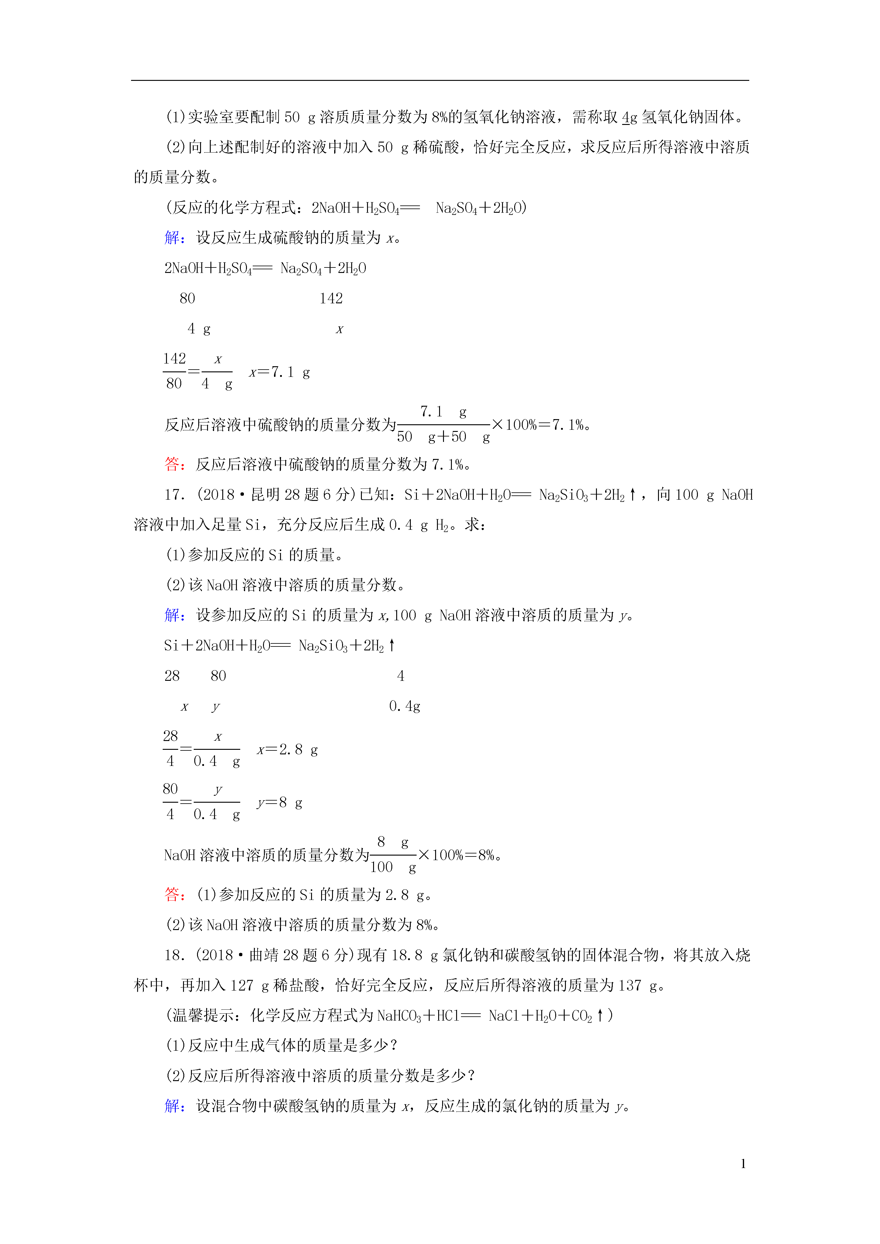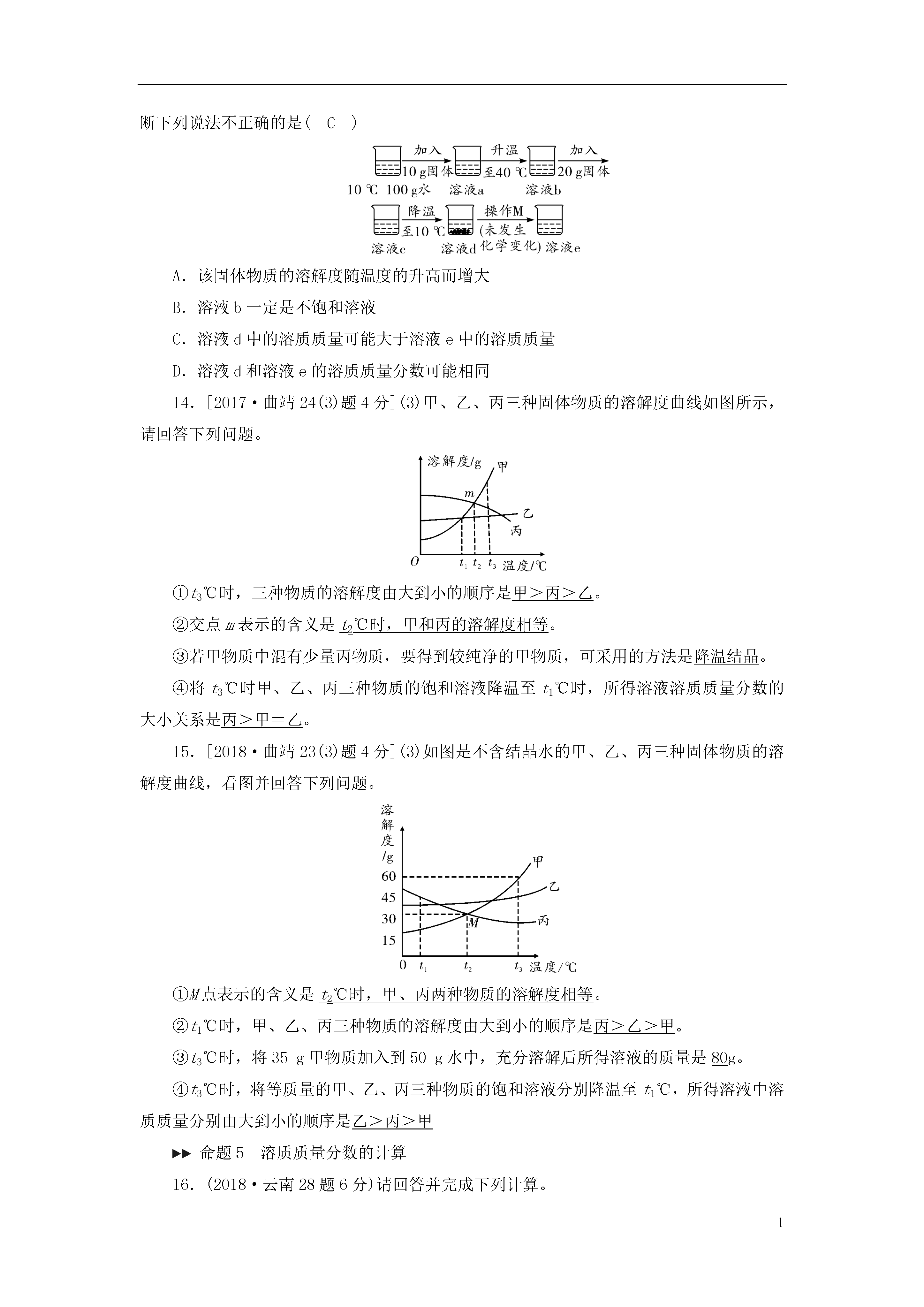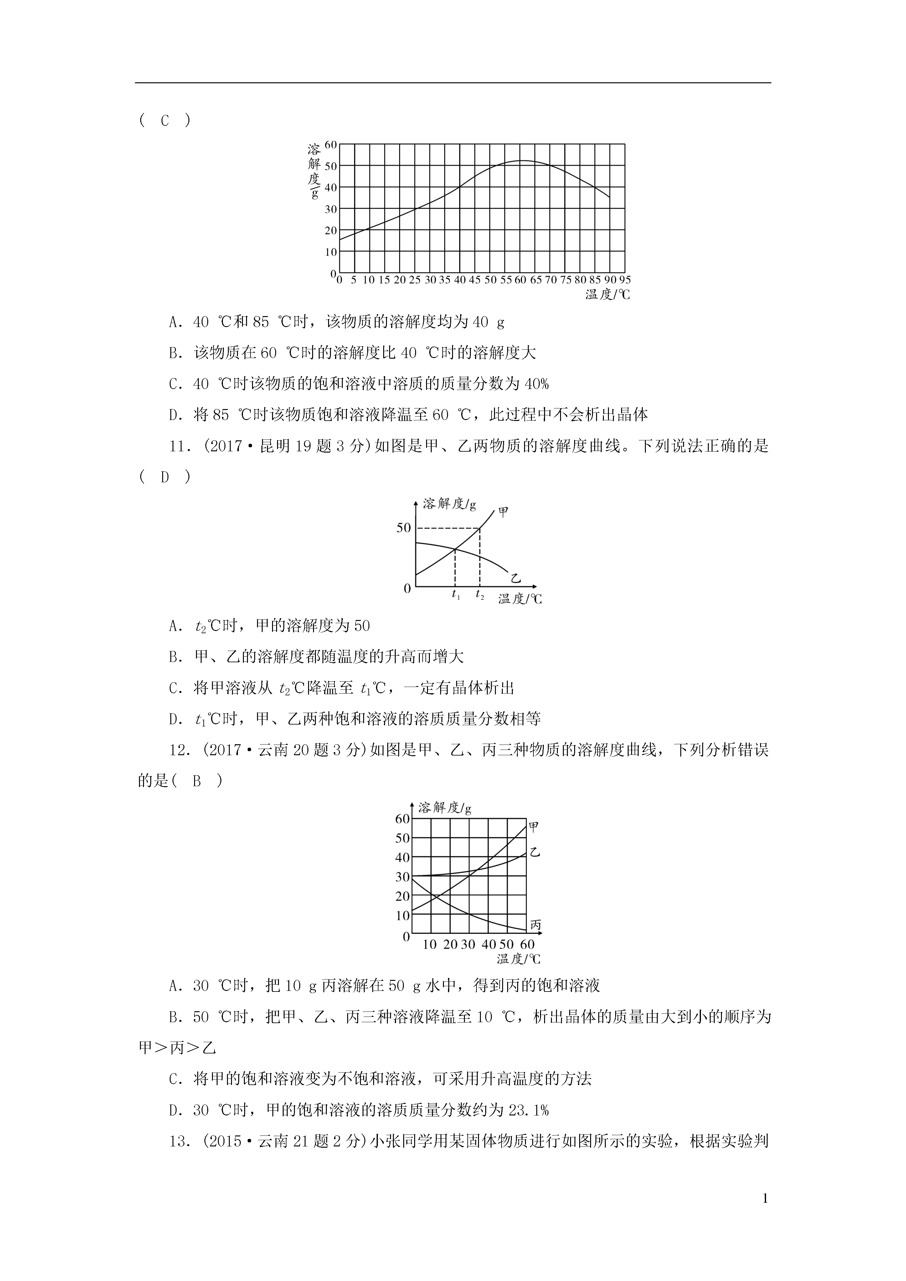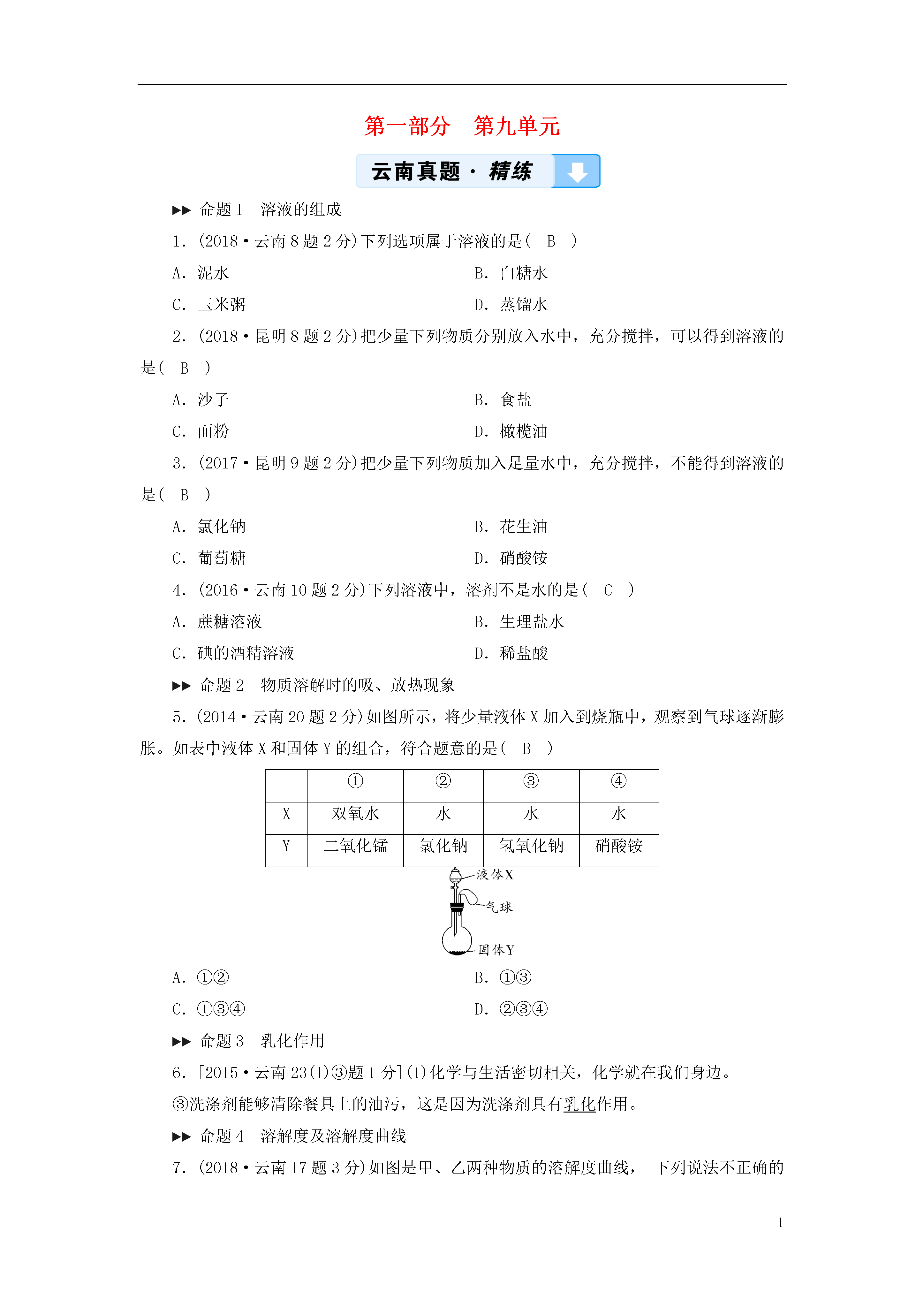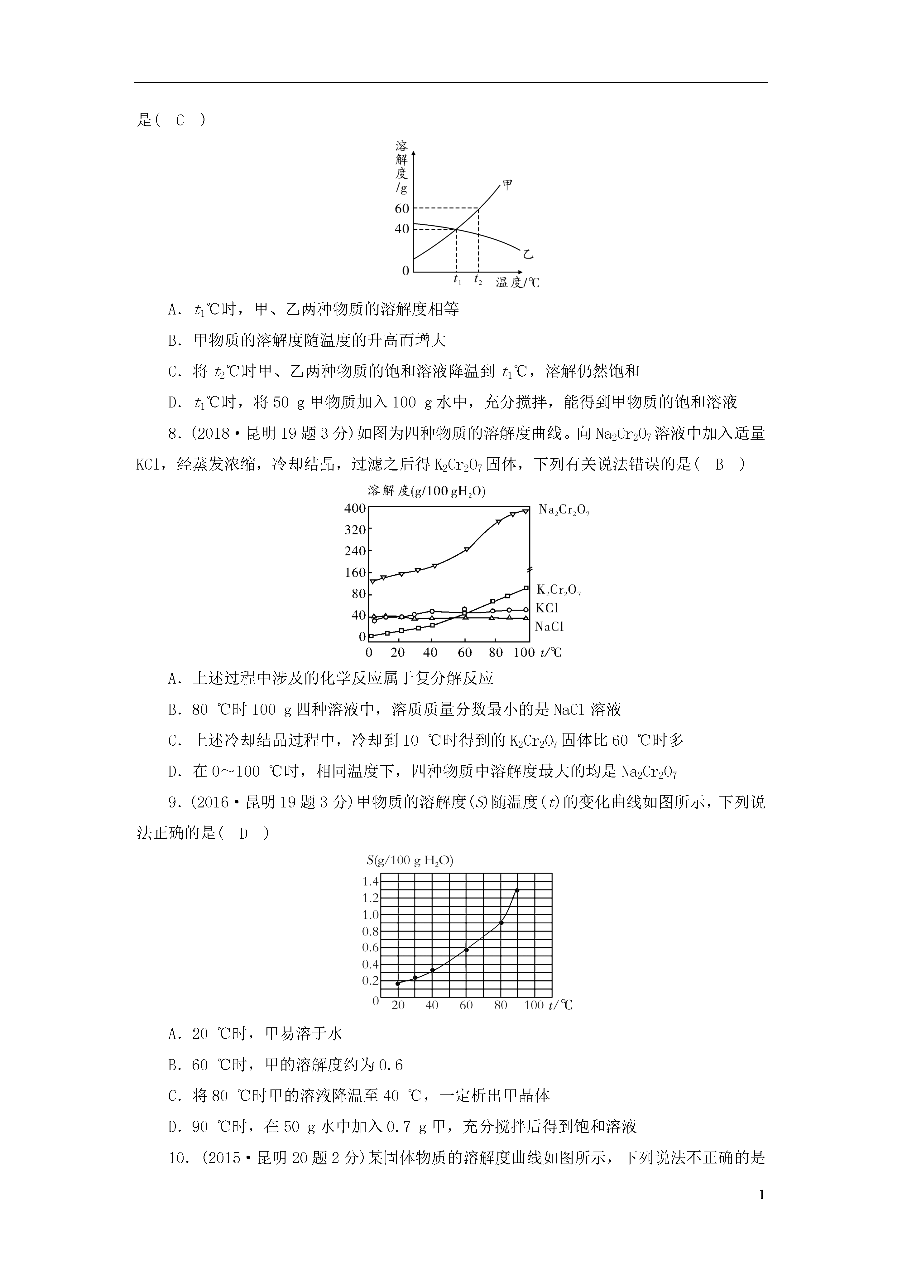 1第一部分第九单元命题1溶液的组成1.(2018·云南8题2分)下列选项属于溶液的是(B)A.泥水B.白糖水C.玉米粥D.蒸馏水2.(2018·昆明8题2分)把少量下列物质分别放入水中,充分搅拌,可以得到溶液的是(B)A.沙子B.食盐C.面粉D.橄榄油3.(2017·昆明9题2分)把少量下列物质加入足量水中,充分搅拌,不能得到溶液的是(B)A.氯化钠B.花生油C.葡萄糖D.硝酸铵4.(2016·云南10题2分)下列溶液中,溶剂不是水的是(C)A.蔗糖溶液B.生理盐水C.碘的酒精溶液D.稀盐酸命题2物质溶解时的吸、放热现象5.(2014·云南20题2分)如图所示,将少量液体X加入到烧瓶中,观察到气球逐渐膨胀。如表中液体X和固体Y的组合,符合题意的是(B)①②③④X双氧水水水水Y二氧化锰氯化钠氢氧化钠硝酸铵A.①②B.①③C.①③④D.②③④命题3乳化作用6.[2015·云南23(1)③题1分](1)化学与生活密切相关,化学就在我们身边。③洗涤剂能够清除餐具上的油污,这是因为洗涤剂具有乳化作用。命题4溶解度及溶解度曲线7.(2018·云南17题3分)如图是甲、乙两种物质的溶解度曲线,下列说法不正确的是(C)A.t1℃时,甲、乙两种物质的溶解度相等B.甲物质的溶解度随温度的升高而增大C.将t2℃时甲、乙两种物质的饱和溶液降温到t1℃,溶解仍然饱和D.t1℃时,将50g甲物质加入100g水中,充分搅拌,能得到甲物质的饱和溶液8.(2018·昆明19题3分)如图为四种物质的溶解度曲线。向Na2Cr2O7溶液中加入适量KCl,经蒸发浓缩,冷却结晶,过滤之后得K2Cr2O7固体,下列有关说法错误的是(B)A.上述过程中涉及的化学反应属于复分解反应B.80℃时100g四种溶液中,溶质质量分数最小的是NaCl溶液C.上述冷却结晶过程中,冷却到10℃时得到的K2Cr2O7固体比60℃时多D.在0~100℃时,相同温度下,四种物质中溶解度最大的均是Na2Cr2O79.(2016·昆明19题3分)甲物质的溶解度(S)随温度(t)的变化曲线如图所示,下列说法正确的是(D)A.20℃时,甲易溶于水B.60℃时,甲的溶解度约为0.6C.将80℃时甲的溶液降温至40℃,一定析出甲晶体D.90℃时,在50g水中加入0.7g甲,充分搅拌后得到饱和溶液10.(2015·昆明20题2分)某固体物质的溶解度曲线如图所示,下列说法不正确的是(C)A.40℃和85℃时,该物质的溶解度均为40gB.该物质在60℃时的溶解度比40℃时的溶解度大C.40℃时该物质的饱和溶液中溶质的质量分数为40%D.将85℃时该物质饱和溶液降温至60℃,此过程中不会析出晶体11.(2017·昆明19题3分)如图是甲、乙两物质的溶解度曲线。下列说法正确的是(D)A.t2℃时,甲的溶解度为50B.甲、乙的溶解度都随温度的升高而增大C.将甲溶液从t2℃降温至t1℃,一定有晶体析出D.t1℃时,甲、乙两种饱和溶液的溶质质量分数相等12.(2017·云南20题3分)如图是甲、乙、丙三种物质的溶解度曲线,下列分析错误的是(B)A.30℃时,把10g丙溶解在50g水中,得到丙的饱和溶液B.50℃时,把甲、乙、丙三种溶液降温至10℃,析出晶体的质量由大到小的顺序为甲>丙>乙C.将甲的饱和溶液变为不饱和溶液,可采用升高温度的方法D.30℃时,甲的饱和溶液的溶质质量分数约为23.1%13.(2015·云南21题2分)小张同学用某固体物质进行如图所示的实验,根据实验判断下列说法不正确的是(C)A.该固体物质的溶解度随温度的升高而增大B.溶液b一定是不饱和溶液C.溶液d中的溶质质量可能大于溶液e中的溶质质量D.溶液d和溶液e的溶质质量分数可能相同14.[2017·曲靖24(3)题4分](3)甲、乙、丙三种固体物质的溶解度曲线如图所示,请回答下列问题。①t3℃时,三种物质的溶解度由大到小的顺序是甲>丙>乙。②交点m表示的含义是t2℃时,甲和丙的溶解度相等。③若甲物质中混有少量丙物质,要得到较纯净的甲物质,可采用的方法是降温结晶。④将t3℃时甲、乙、丙三种物质的饱和溶液降温至t1℃时,所得溶液溶质质量分数的大小关系是丙>甲=乙。15.[2018·曲靖23(3)题4分](3)如图是不含结晶水的甲、乙、丙三种固体物质的溶解度曲线,看图并回答下列问题。①M点表示的含义是t2℃时,甲、丙两种物质的溶解度相等。②t1℃时,甲、乙、丙三种物质的溶解度由大到小的顺序是丙>乙>甲。③t3℃时,将35g甲物质加入到50g水中,充分溶解后所得溶液的质量是80g。④t3℃时,