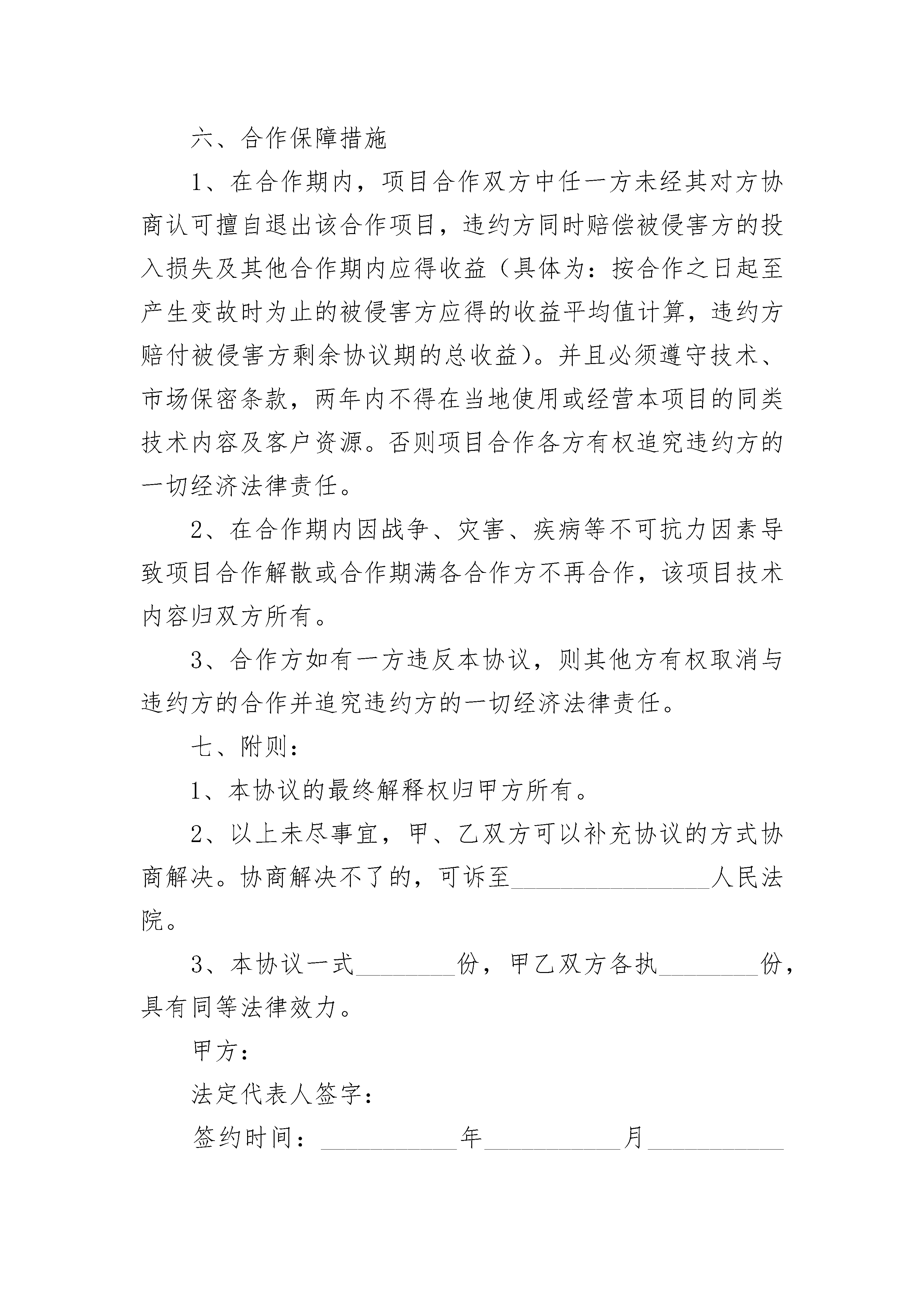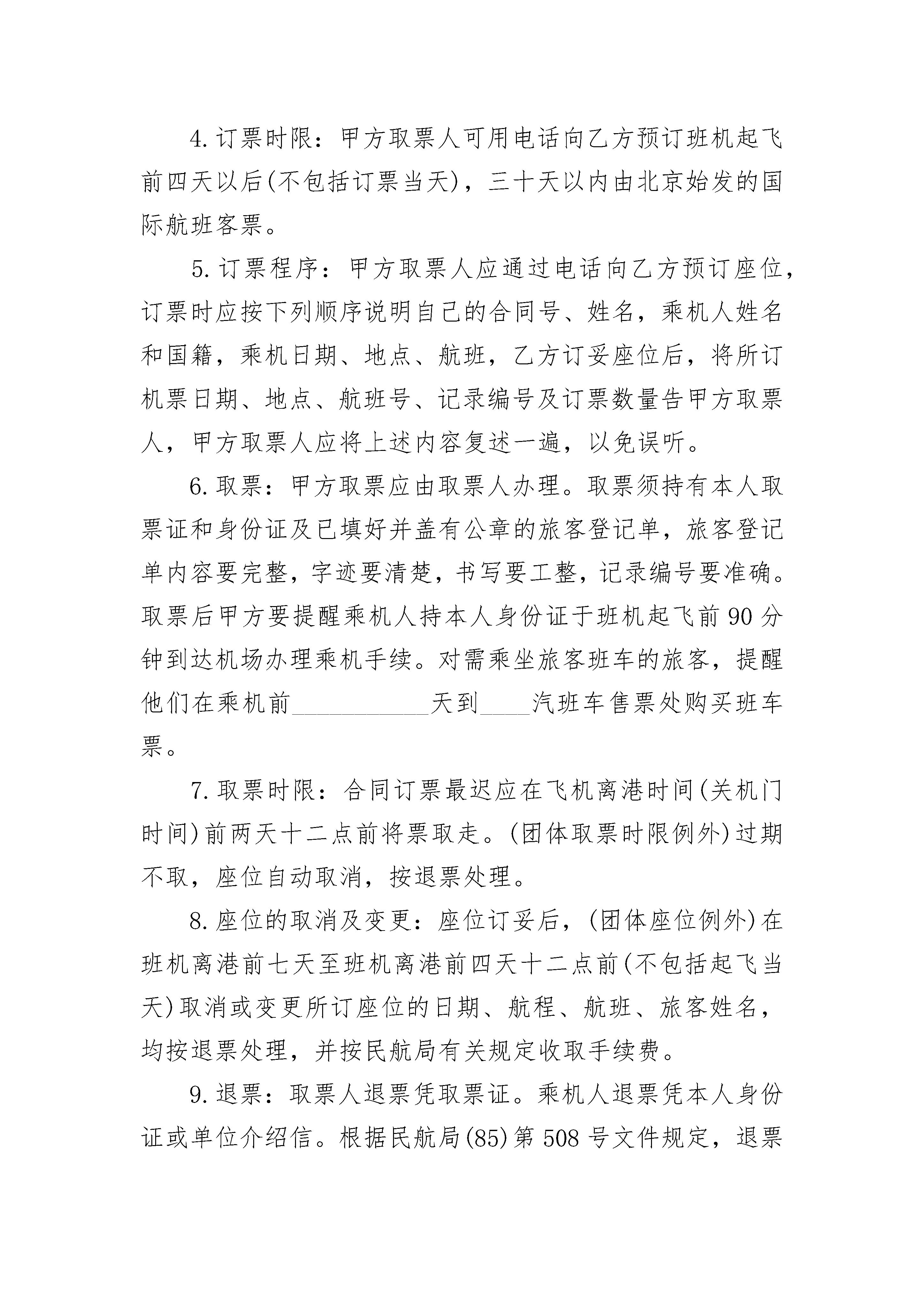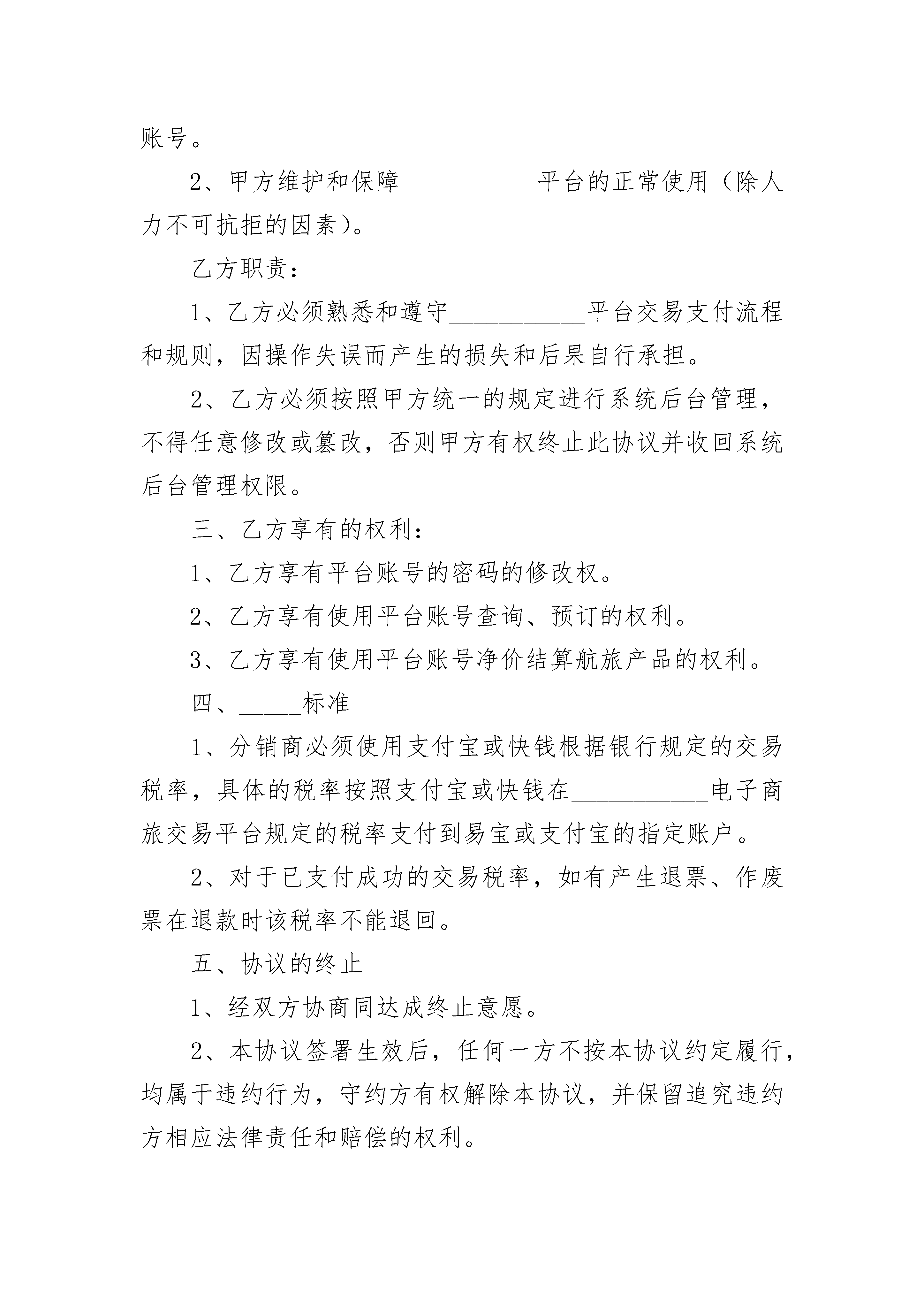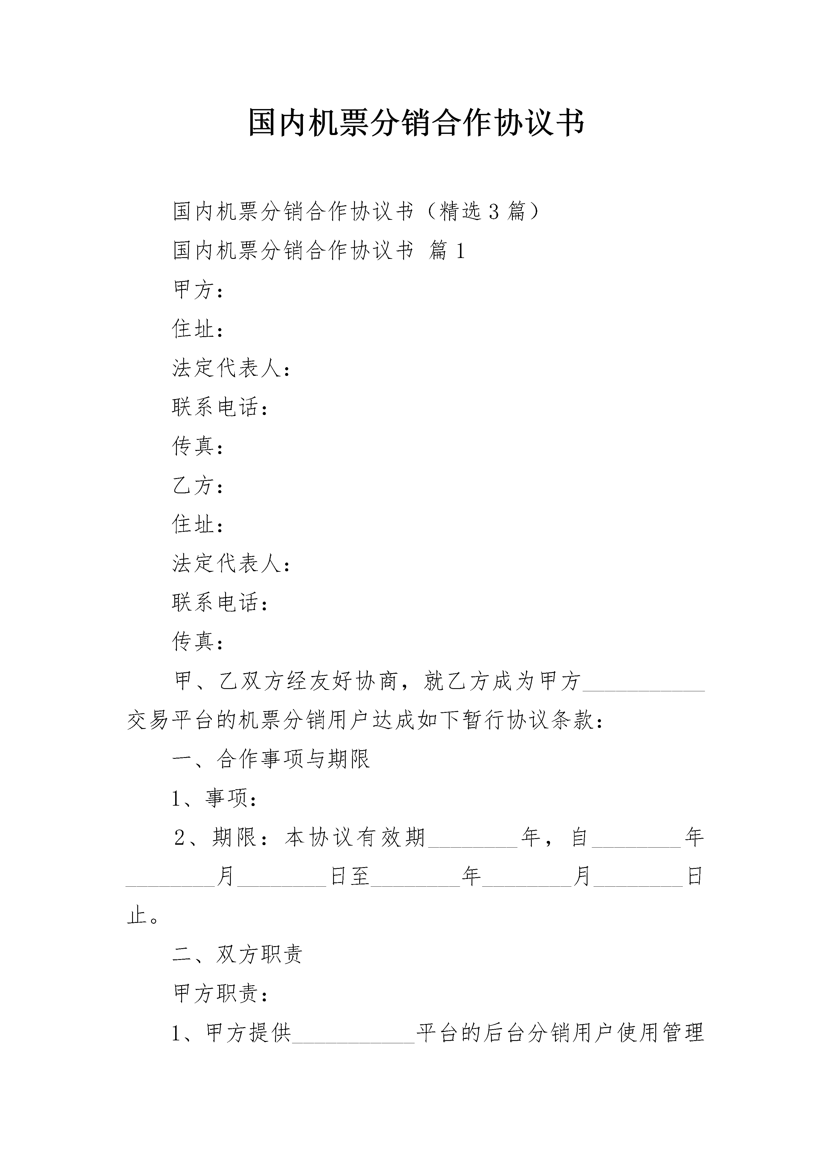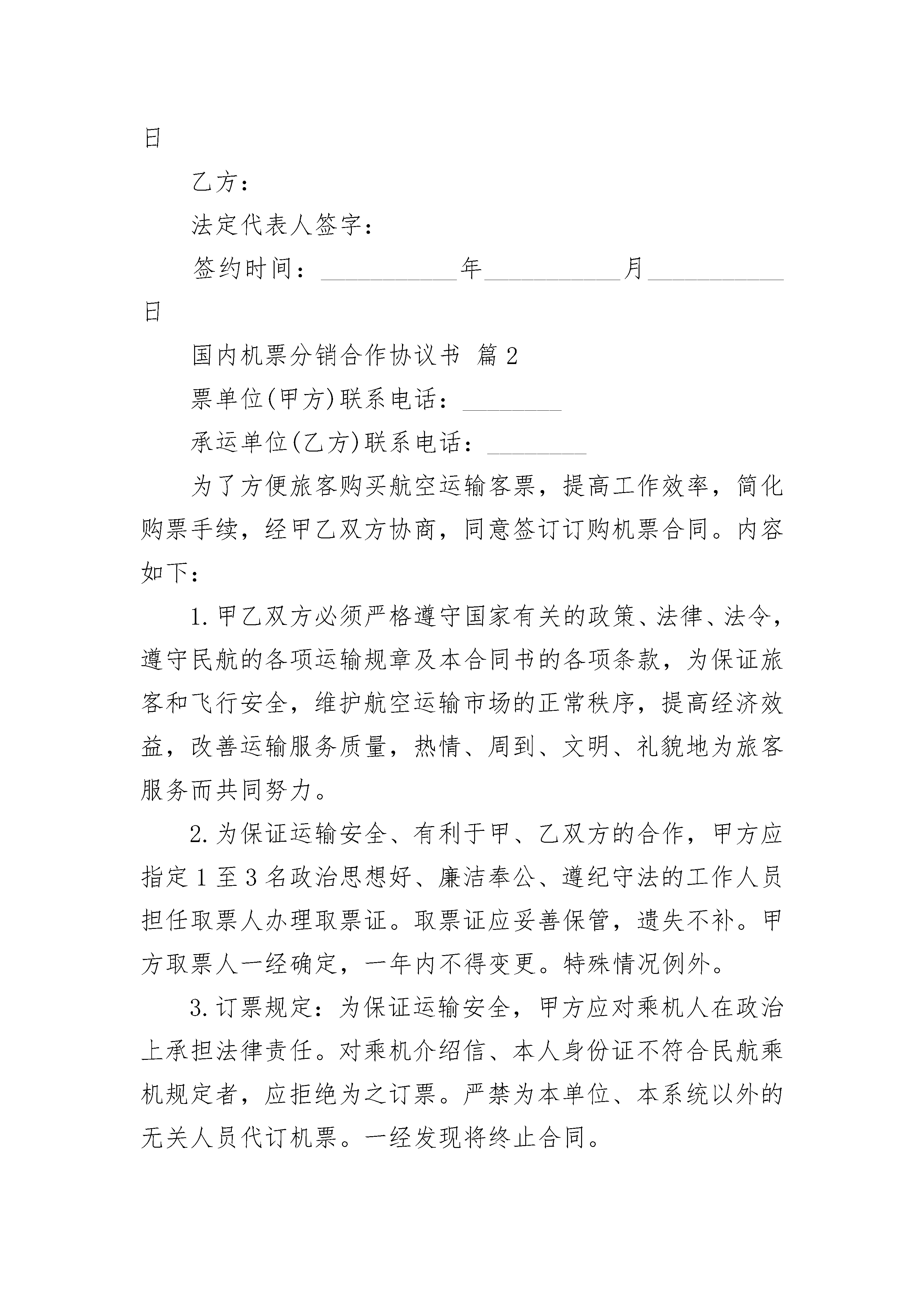 国内机票分销合作协议书国内机票分销合作协议书(精选3篇)国内机票分销合作协议书篇1甲方:住址:法定代表人:联系电话:传真:乙方:住址:法定代表人:联系电话:传真:甲、乙双方经友好协商,就乙方成为甲方___________交易平台的机票分销用户达成如下暂行协议条款:一、合作事项与期限1、事项:2、期限:本协议有效期________年,自________年________月________日至________年________月________日止。二、双方职责甲方职责:1、甲方提供___________平台的后台分销用户使用管理账号。2、甲方维护和保障___________平台的正常使用(除人力不可抗拒的因素)。乙方职责:1、乙方必须熟悉和遵守___________平台交易支付流程和规则,因操作失误而产生的损失和后果自行承担。2、乙方必须按照甲方统一的规定进行系统后台管理,不得任意修改或篡改,否则甲方有权终止此协议并收回系统后台管理权限。三、乙方享有的权利:1、乙方享有平台账号的密码的修改权。2、乙方享有使用平台账号查询、预订的权利。3、乙方享有使用平台账号净价结算航旅产品的权利。四、_____标准1、分销商必须使用支付宝或快钱根据银行规定的交易税率,具体的税率按照支付宝或快钱在___________电子商旅交易平台规定的税率支付到易宝或支付宝的指定账户。2、对于已支付成功的交易税率,如有产生退票、作废票在退款时该税率不能退回。五、协议的终止1、经双方协商同达成终止意愿。2、本协议签署生效后,任何一方不按本协议约定履行,均属于违约行为,守约方有权解除本协议,并保留追究违约方相应法律责任和赔偿的权利。六、合作保障措施1、在合作期内,项目合作双方中任一方未经其对方协商认可擅自退出该合作项目,违约方同时赔偿被侵害方的投入损失及其他合作期内应得收益(具体为:按合作之日起至产生变故时为止的被侵害方应得的收益平均值计算,违约方赔付被侵害方剩余协议期的总收益)。并且必须遵守技术、市场保密条款,两年内不得在当地使用或经营本项目的同类技术内容及客户资源。否则项目合作各方有权追究违约方的一切经济法律责任。2、在合作期内因战争、灾害、疾病等不可抗力因素导致项目合作解散或合作期满各合作方不再合作,该项目技术内容归双方所有。3、合作方如有一方违反本协议,则其他方有权取消与违约方的合作并追究违约方的一切经济法律责任。七、附则:1、本协议的最终解释权归甲方所有。2、以上未尽事宜,甲、乙双方可以补充协议的方式协商解决。协商解决不了的,可诉至________________人民法院。3、本协议一式________份,甲乙双方各执________份,具有同等法律效力。甲方:法定代表人签字:签约时间:___________年___________月___________日乙方:法定代表人签字:签约时间:___________年___________月___________日国内机票分销合作协议书篇2票单位(甲方)联系电话:________承运单位(乙方)联系电话:________为了方便旅客购买航空运输客票,提高工作效率,简化购票手续,经甲乙双方协商,同意签订订购机票合同。内容如下:1.甲乙双方必须严格遵守国家有关的政策、法律、法令,遵守民航的各项运输规章及本合同书的各项条款,为保证旅客和飞行安全,维护航空运输市场的正常秩序,提高经济效益,改善运输服务质量,热情、周到、文明、礼貌地为旅客服务而共同努力。2.为保证运输安全、有利于甲、乙双方的合作,甲方应指定1至3名政治思想好、廉洁奉公、遵纪守法的工作人员担任取票人办理取票证。取票证应妥善保管,遗失不补。甲方取票人一经确定,一年内不得变更。特殊情况例外。3.订票规定:为保证运输安全,甲方应对乘机人在政治上承担法律责任。对乘机介绍信、本人身份证不符合民航乘机规定者,应拒绝为之订票。严禁为本单位、本系统以外的无关人员代订机票。一经发现将终止合同。4.订票时限:甲方取票人可用电话向乙方预订班机起飞前四天以后(不包括订票当天),三十天以内由北京始发的国际航班客票。5.订票程序:甲方取票人应通过电话向乙方预订座位,订票时应按下列顺序说明自己的合同号、姓名,乘机人姓名和国籍,乘机日期、地点、航班,乙方订妥座位后,将所订机票日期、地点、航班号、记录编号及订票数量告甲方取票人,甲方取票人应将上述内容复述一遍,以免误听。6.取票:甲方取票应由取票人办理。取票须持有本人取票证和身份证及已填好并盖有公章的旅客登记单,旅客登记单内容要完整,字迹要清楚,书写要工整,记录编号要准确。取票后甲方要提醒乘机人持本人身份证于班机起飞前90分钟到达机场办理乘机手续。对需乘坐旅客班车的旅客,提醒他们在乘机前___________天到____汽班车售票处
